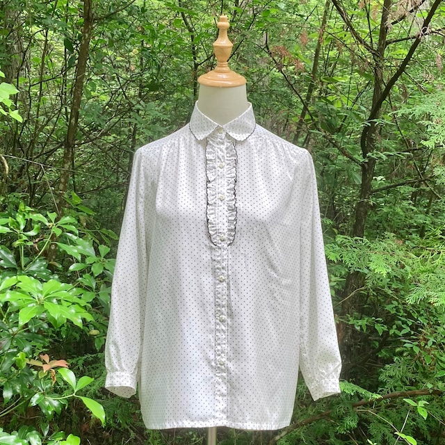 ※ご注文後(お支払い済)、翌日〜翌々日に発送を予定しております。 衿付きブラウス 白地に黒い水玉模様の透け感あるテキスタイル 衿にスカラップ刺繍の縁取りフロントに小さなフリルあるデザインのクラシカルなブラウス size(cm) 着丈:61 肩幅:37 身幅:52 ウエスト: 袖丈:48 袖口:16 首回り:36.5 素材:ポリエステル 100% 裏地:無し ※トルソーサイズ(ヌードサイズ) バスト:84 ウエスト:60.5 ヒップ:79