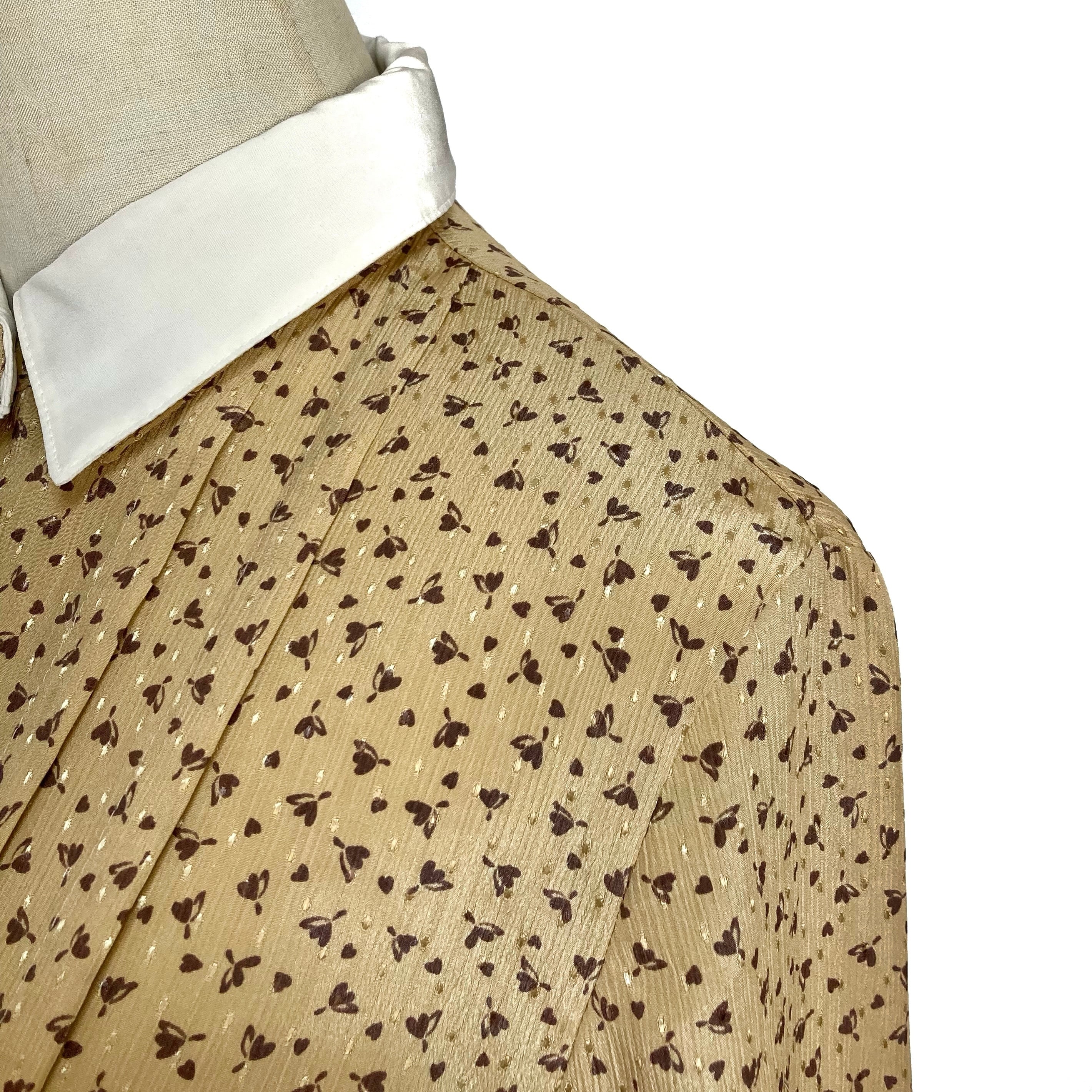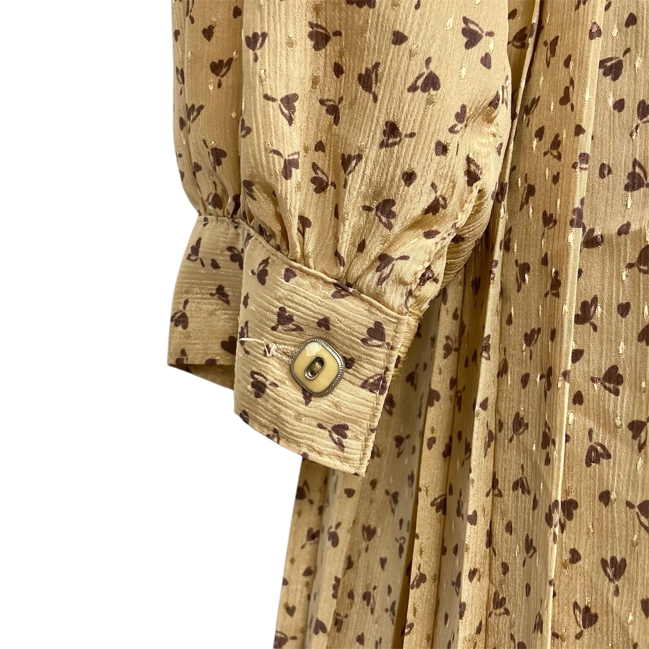 ベージュ地にブラウンの花柄、光の加減で見え隠れする小さな粒柄の楊柳クレープのテキスタイル