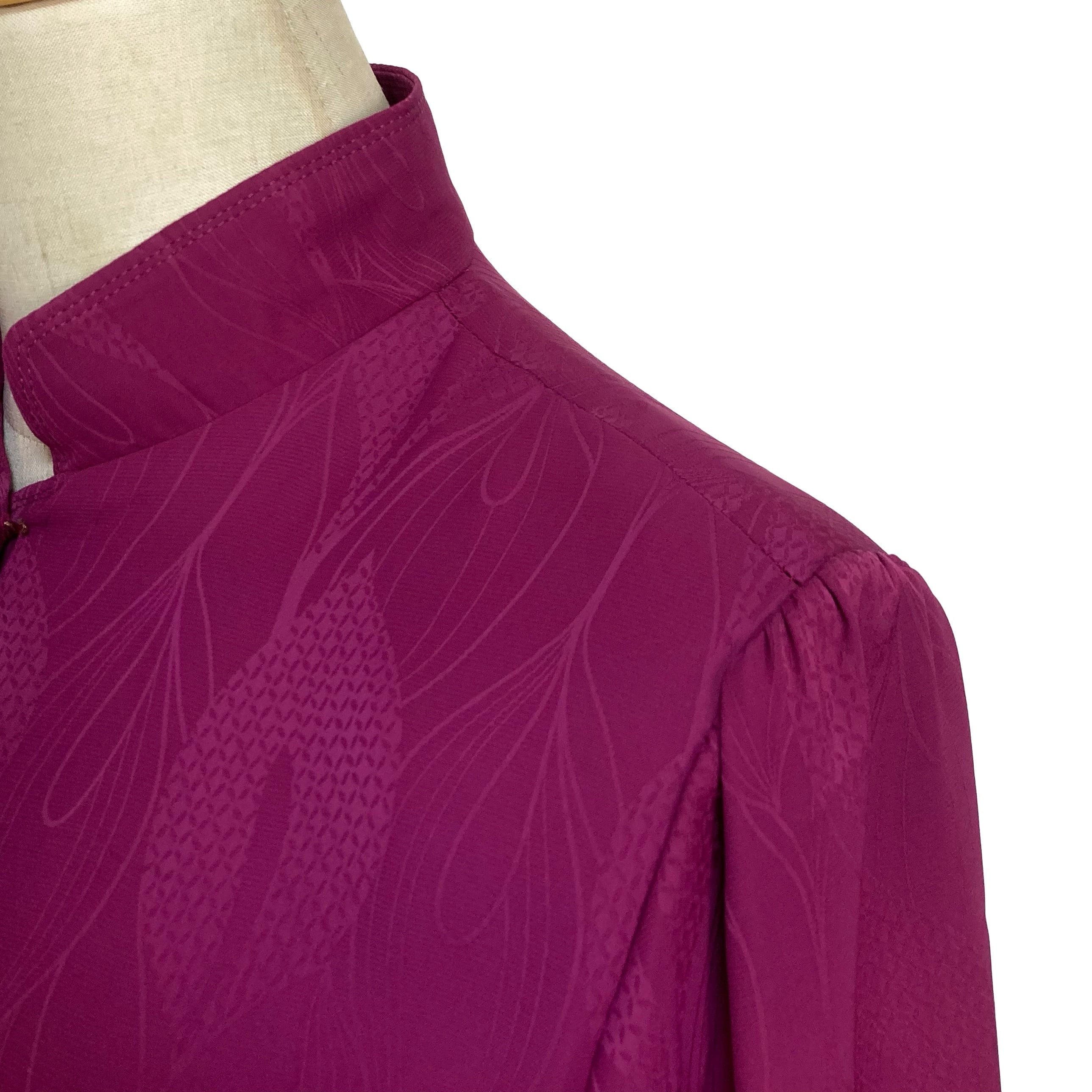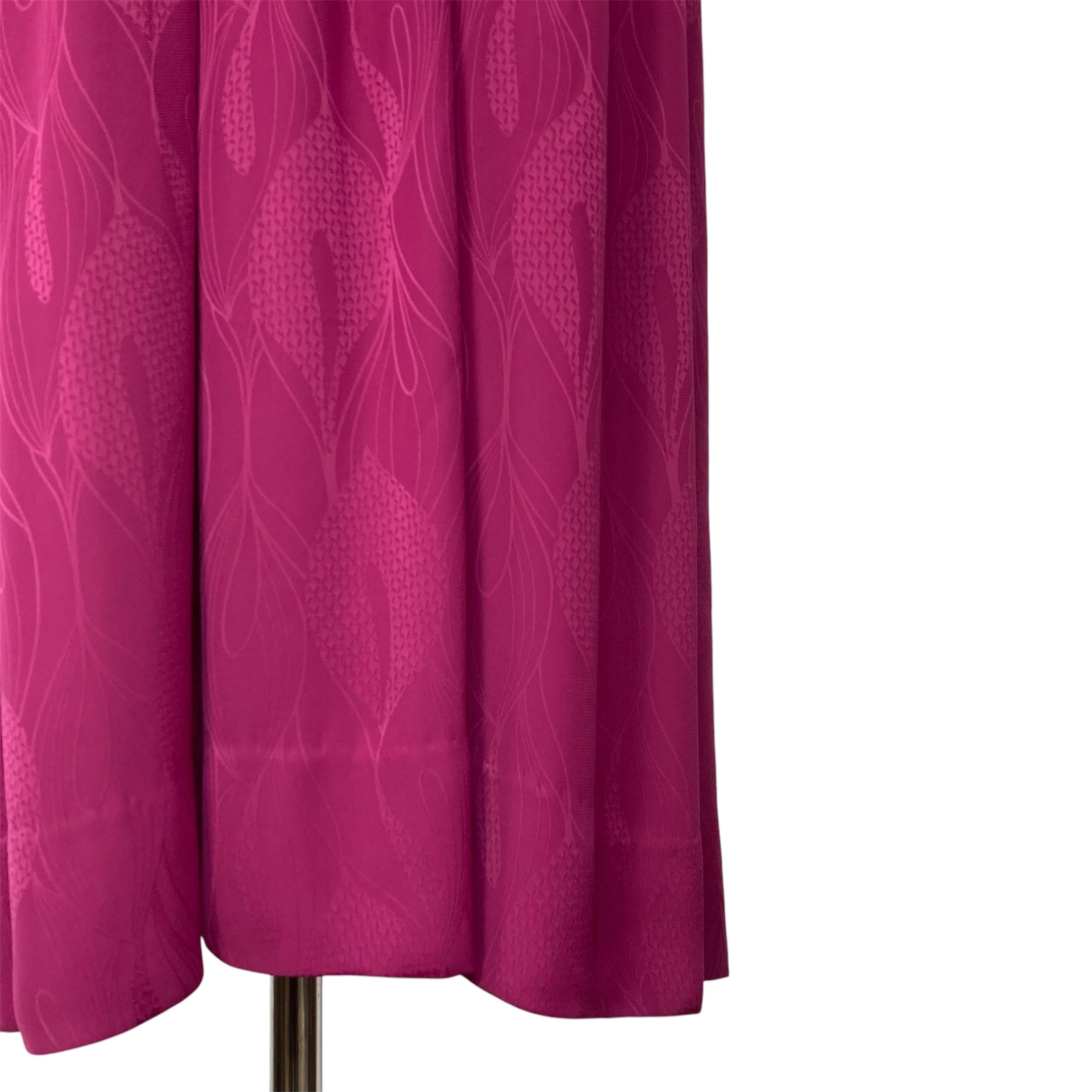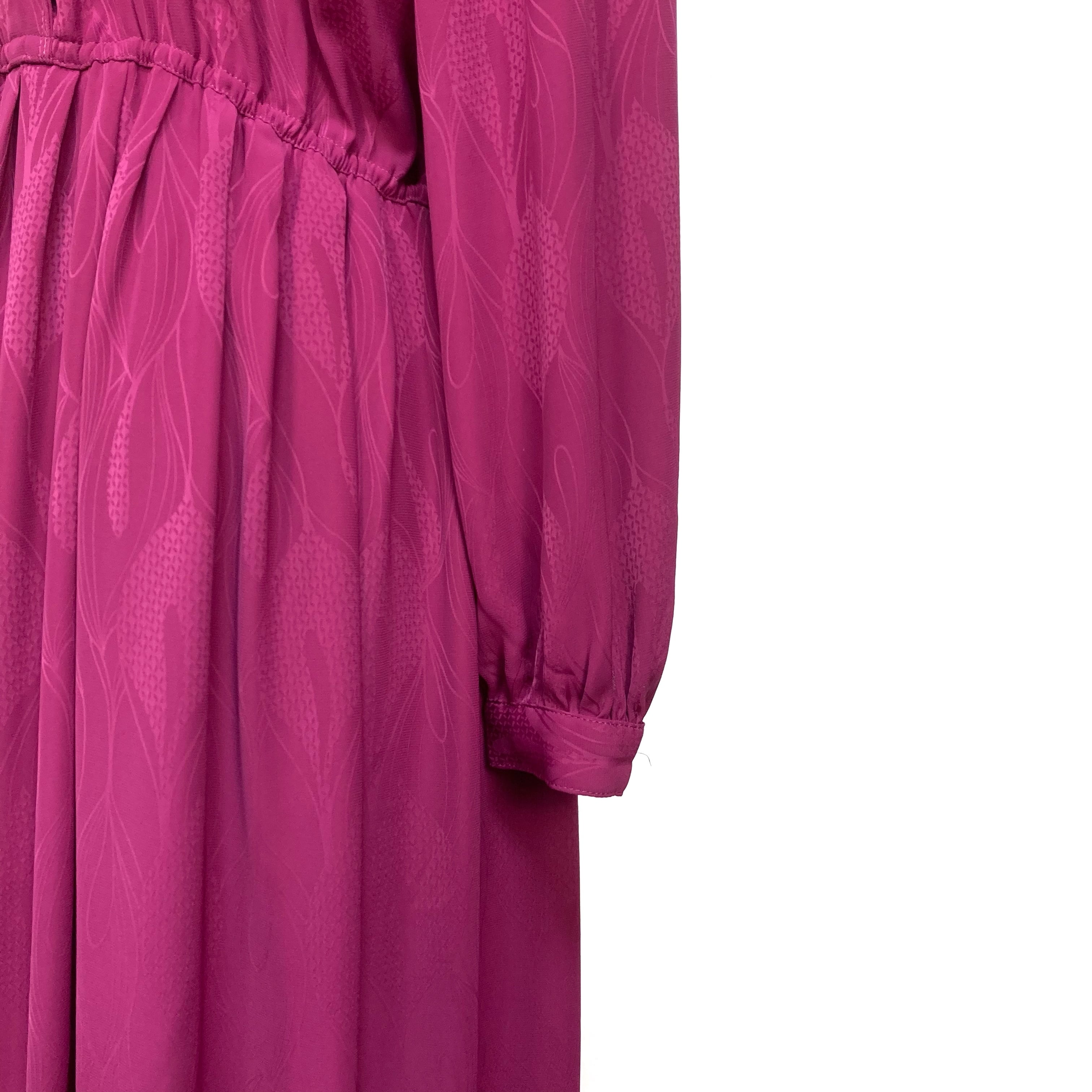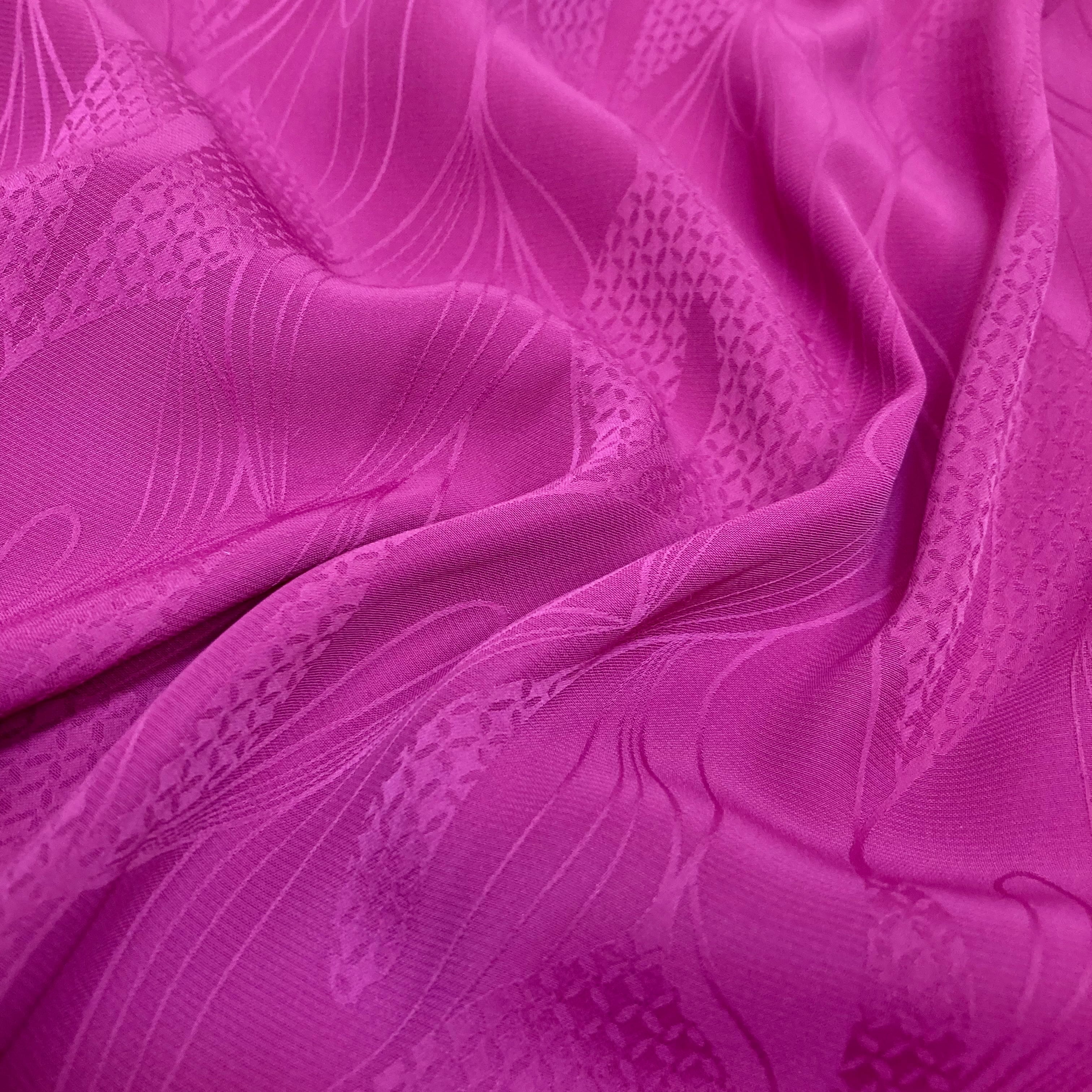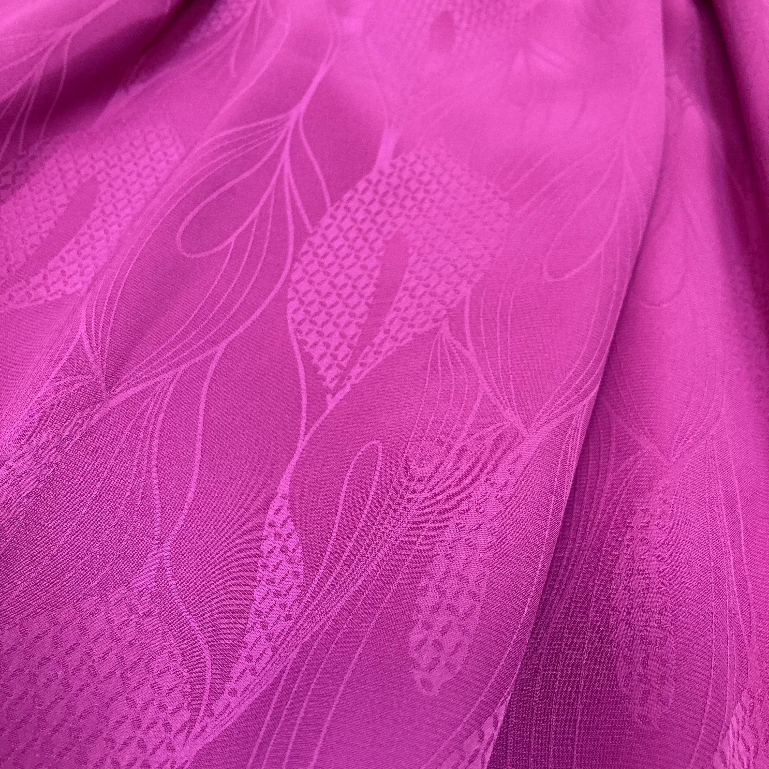 赤紫色地に光の加減で見え隠れする孔雀の羽根柄の透け感あるテキスタイル