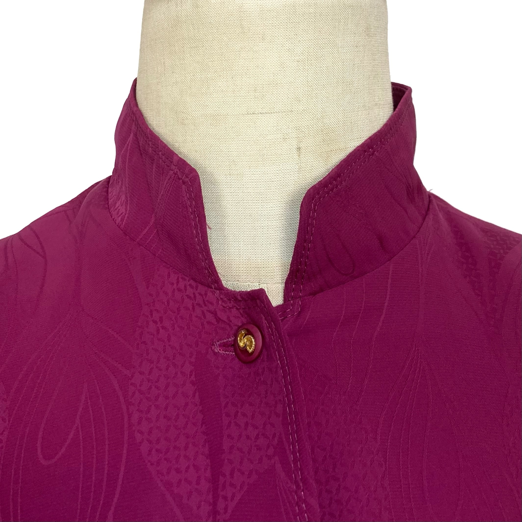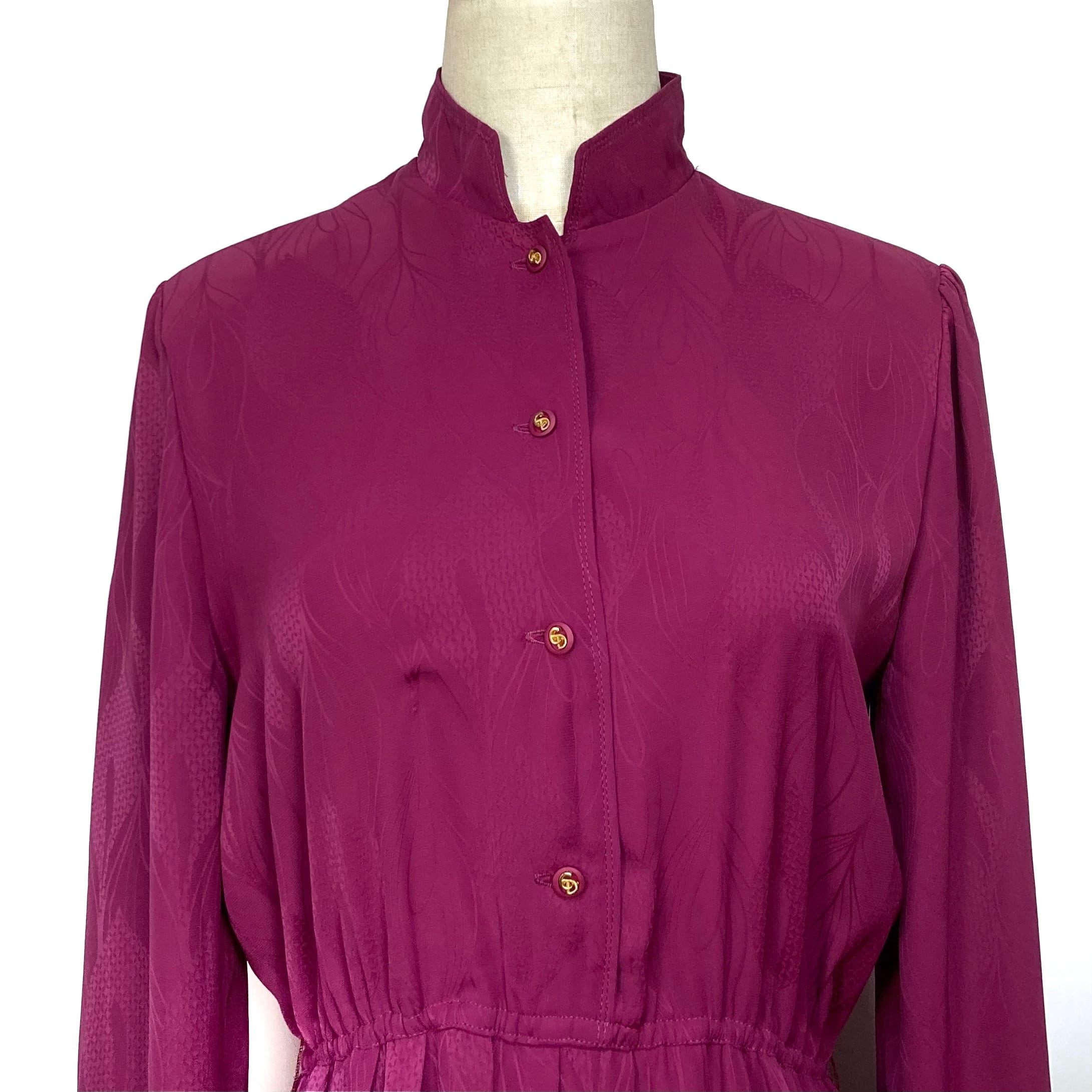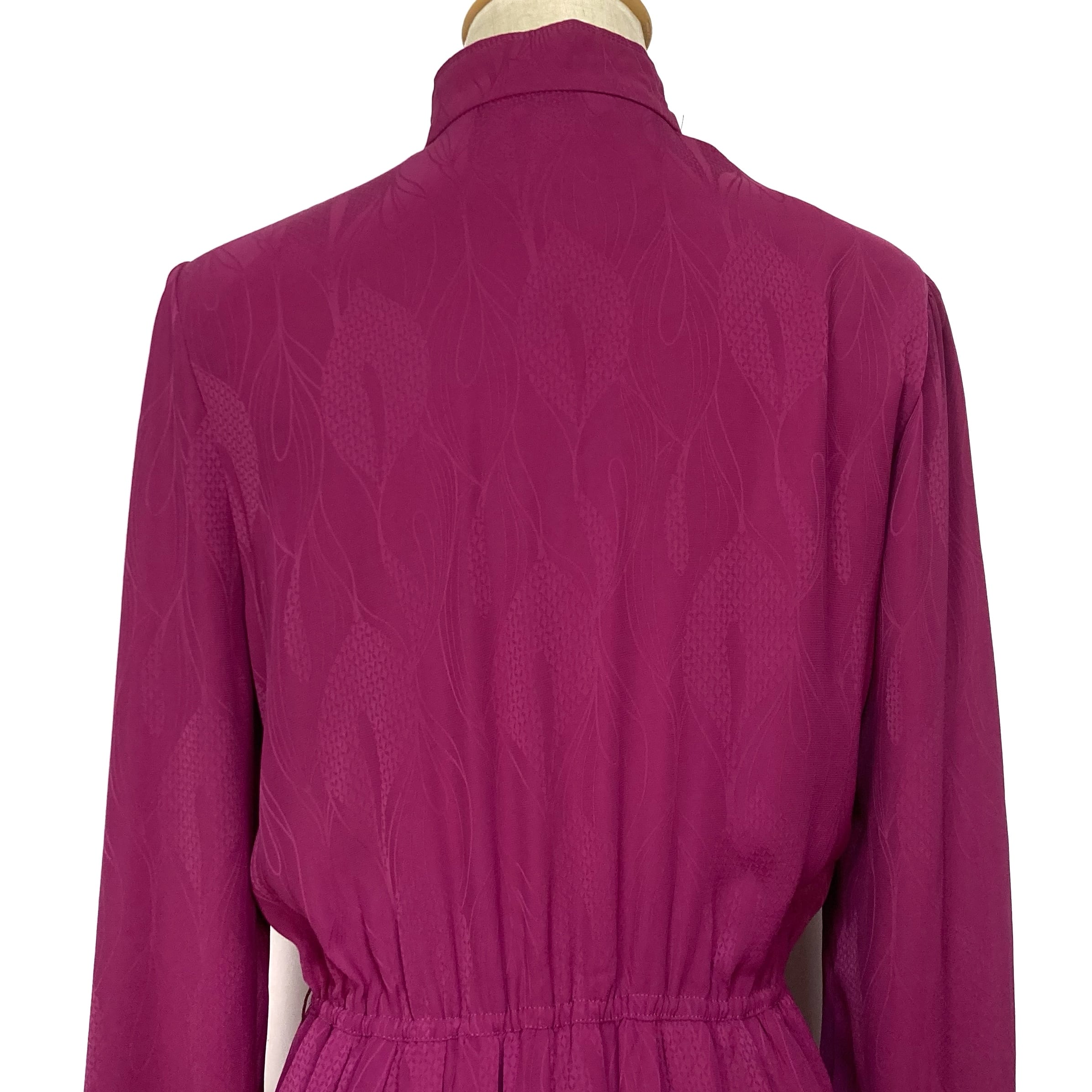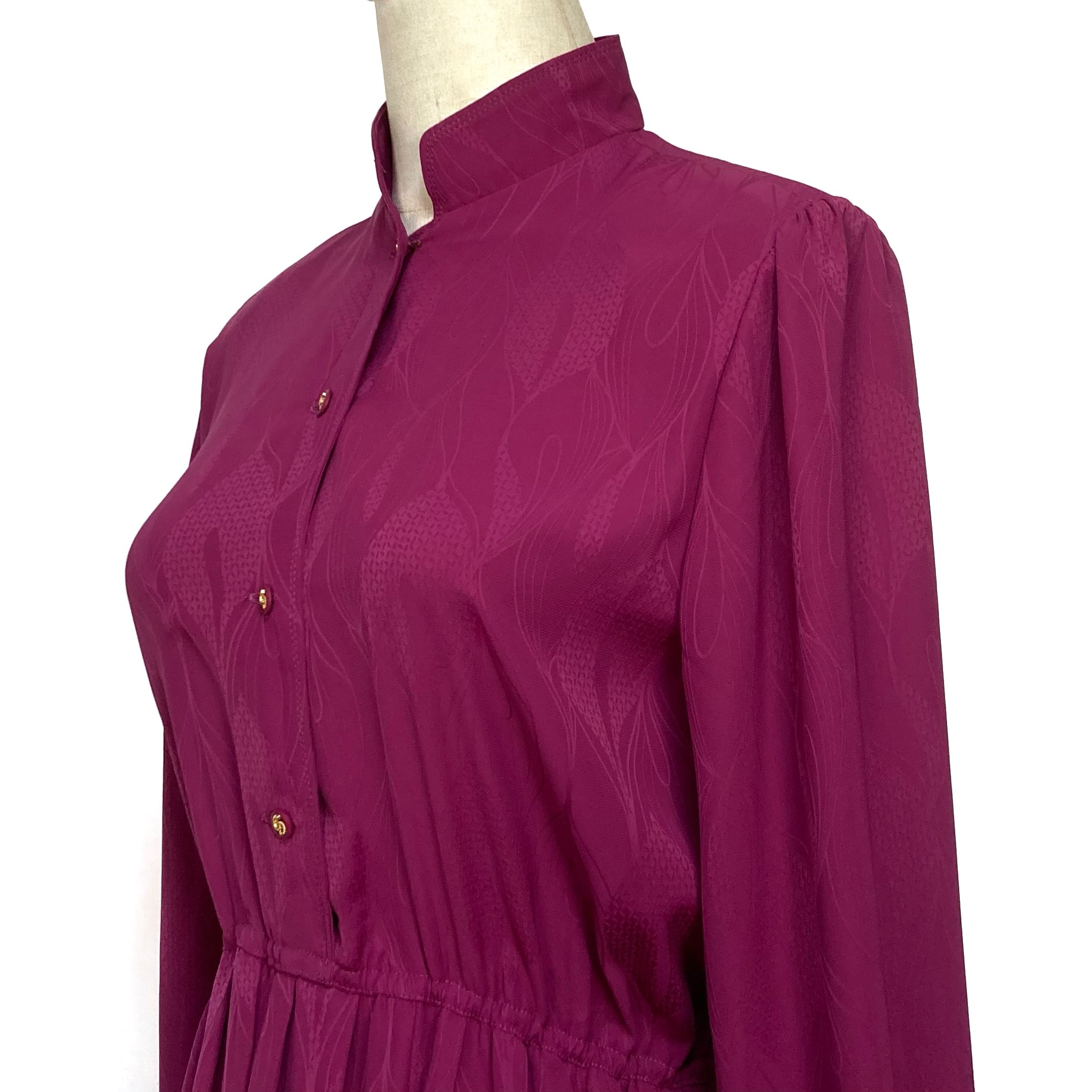 赤紫色地に光の加減で見え隠れする孔雀の羽根柄の透け感あるテキスタイル