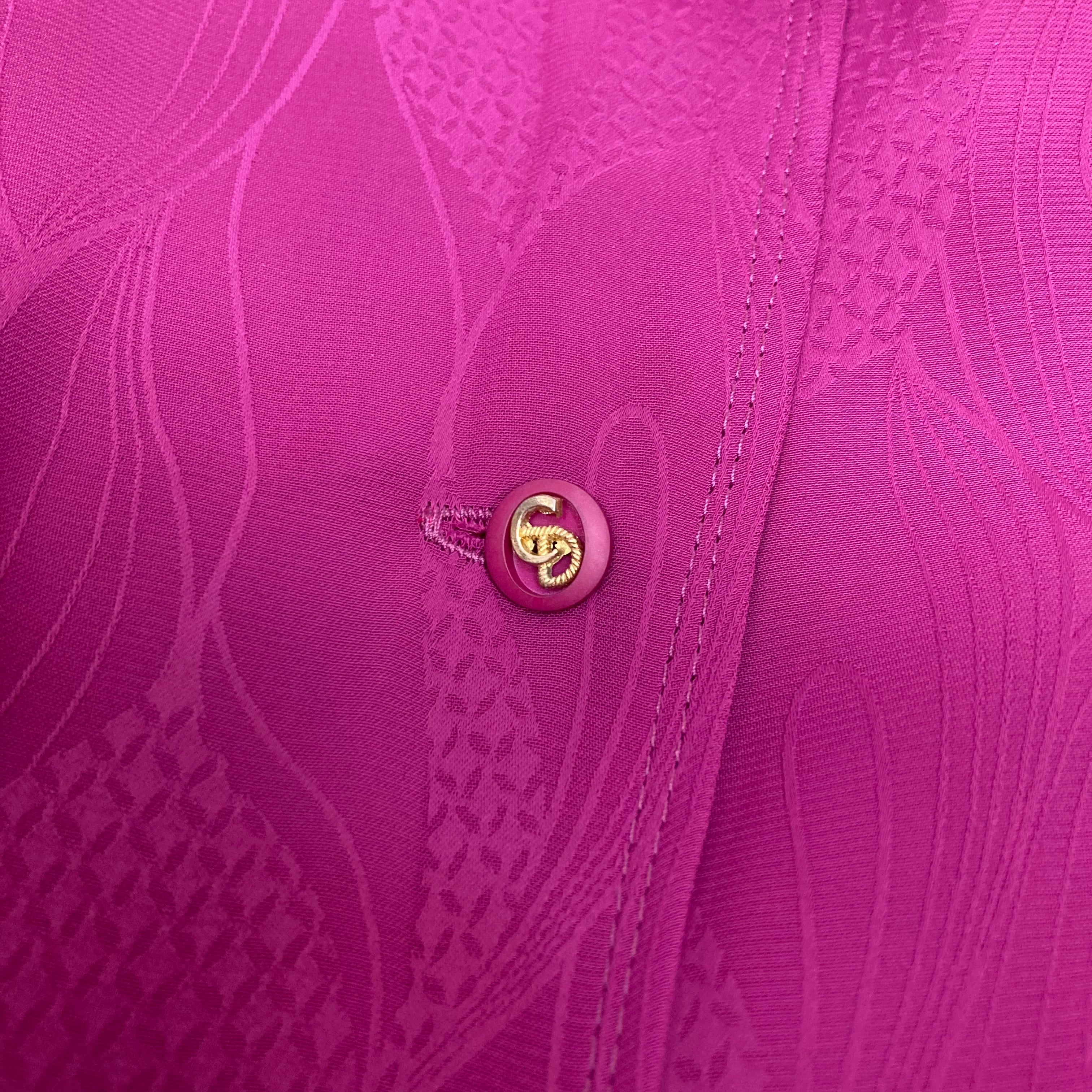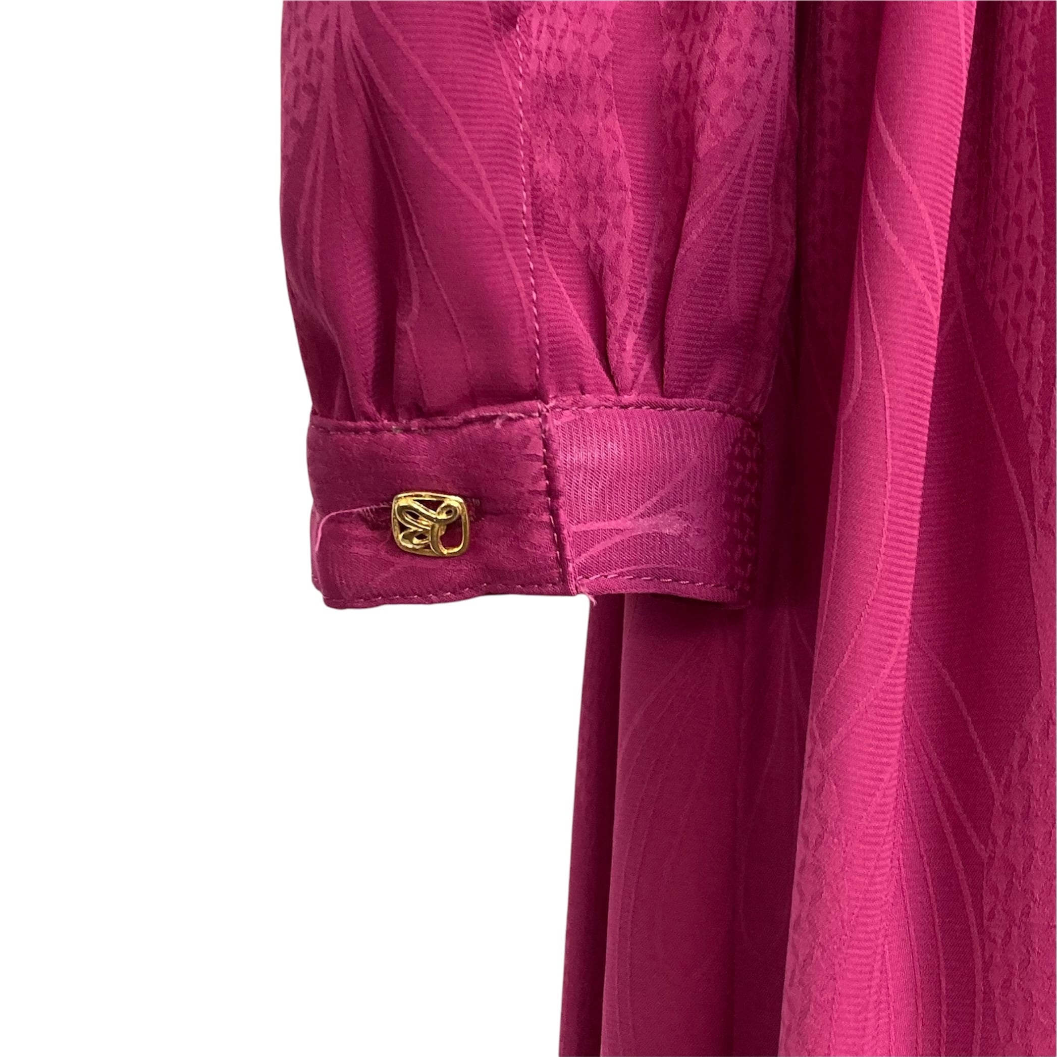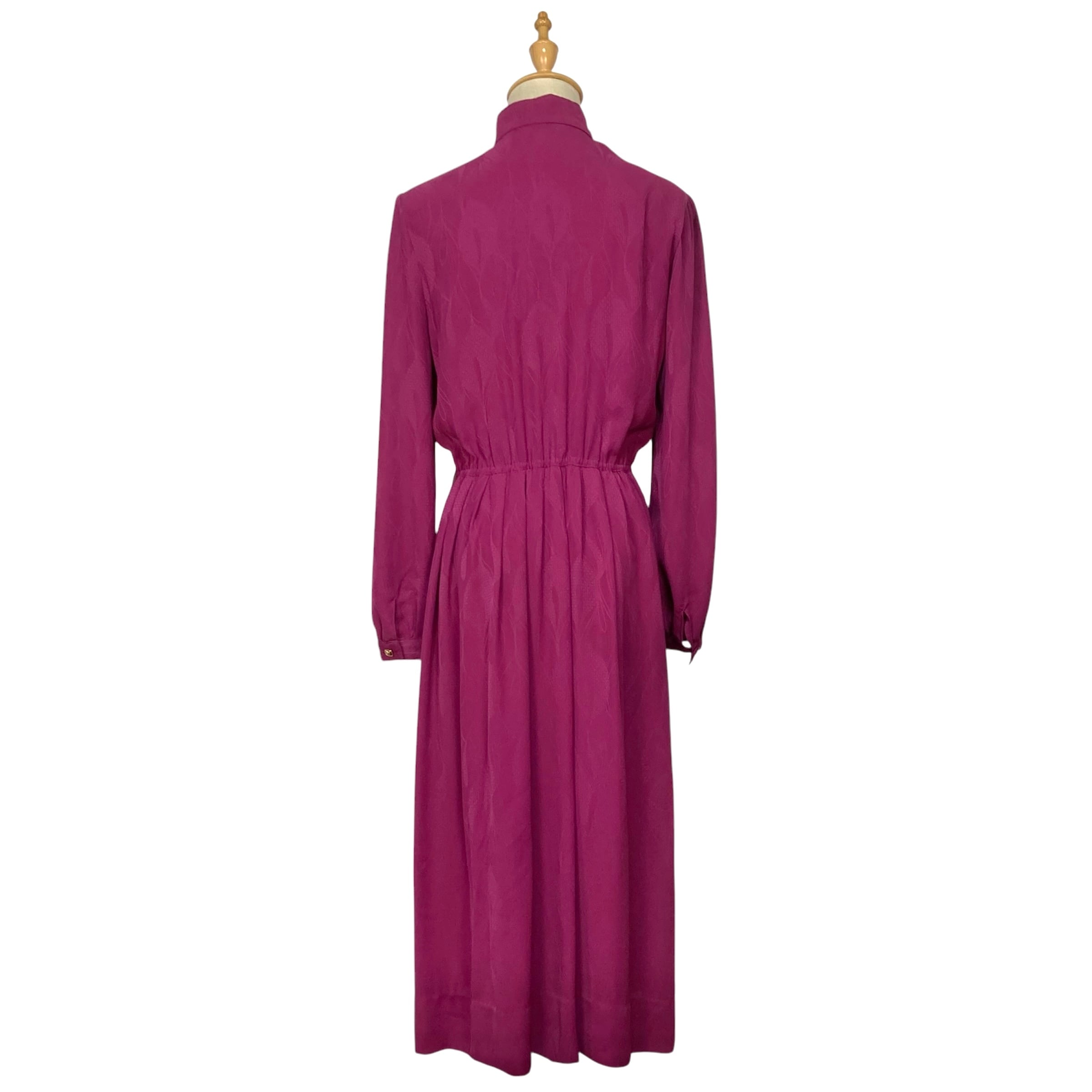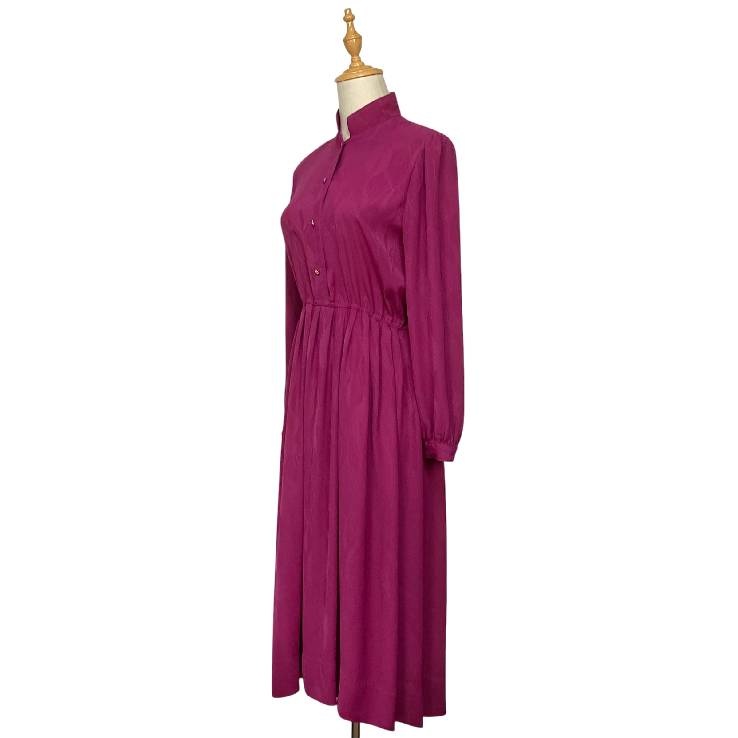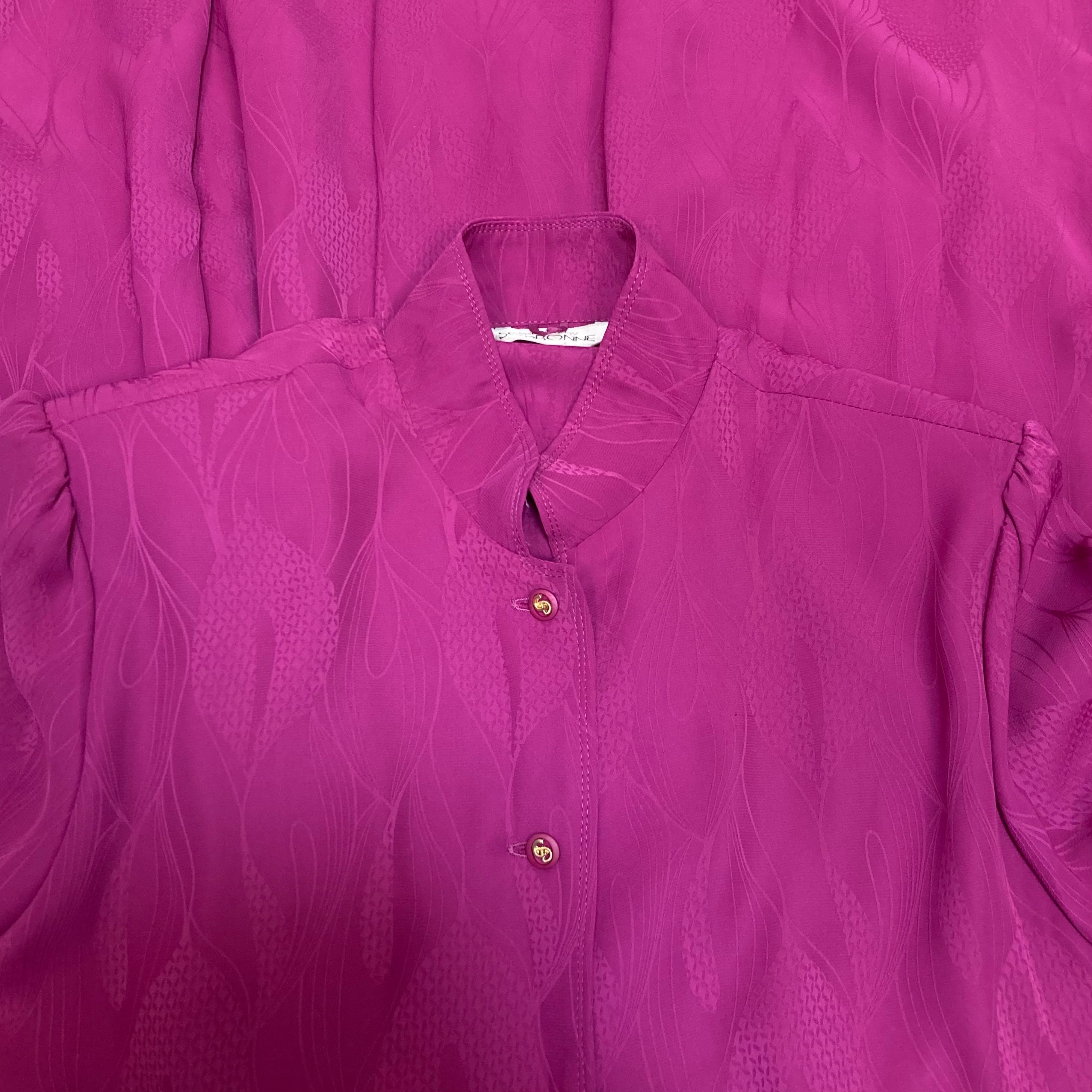 赤紫色地に光の加減で見え隠れする孔雀の羽根柄の透け感あるテキスタイル
