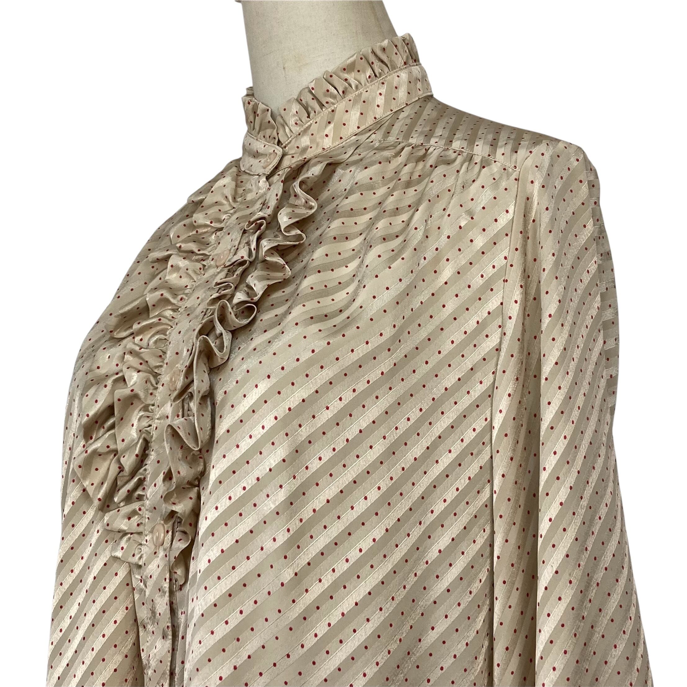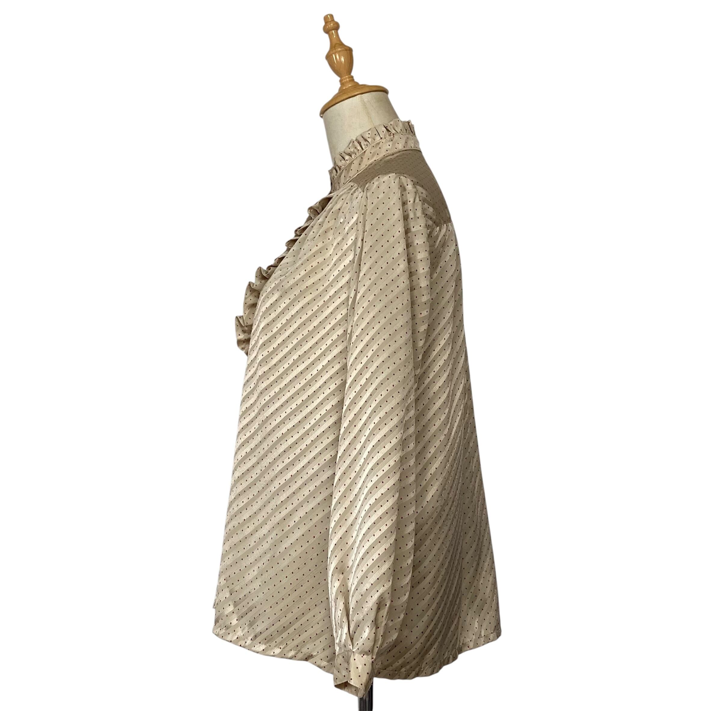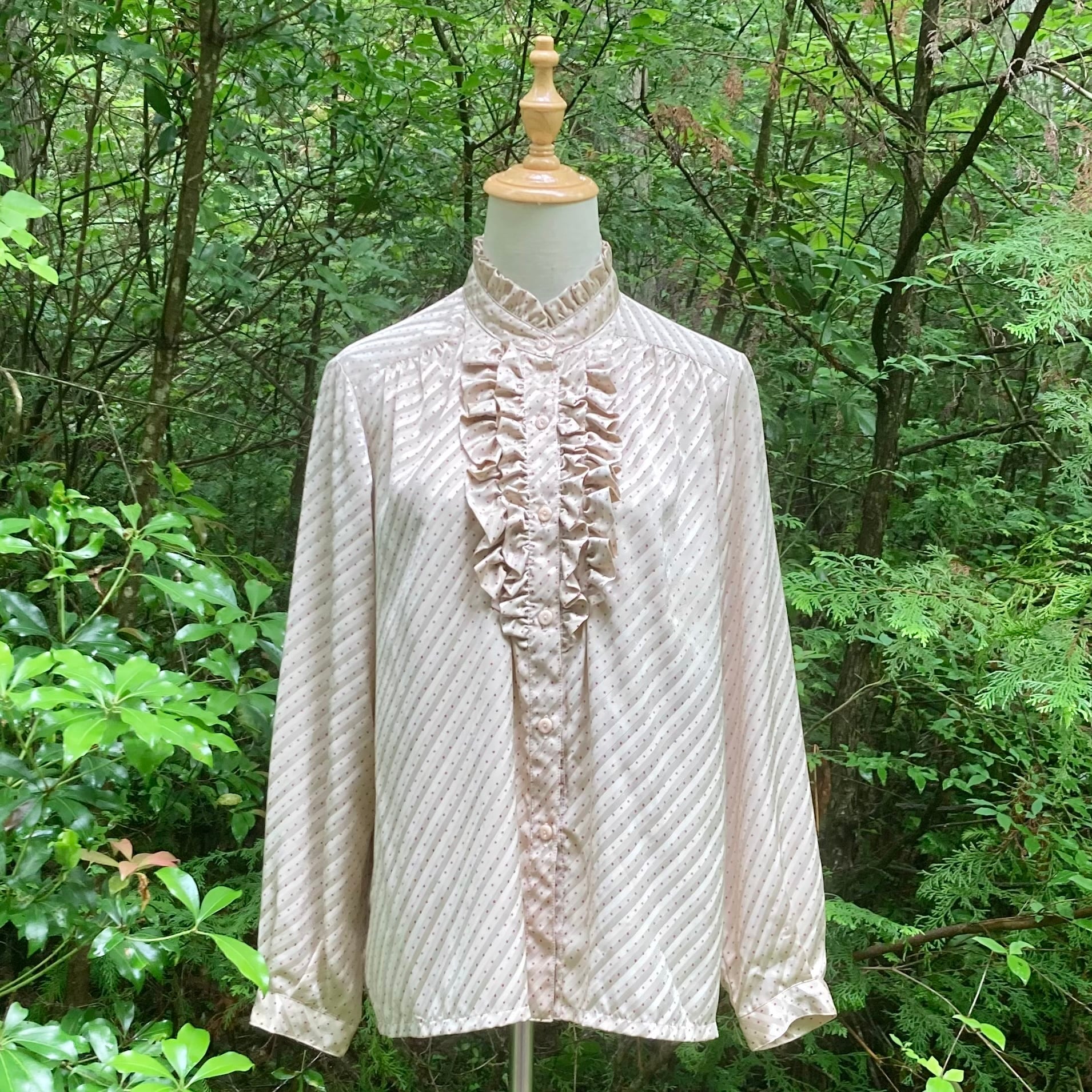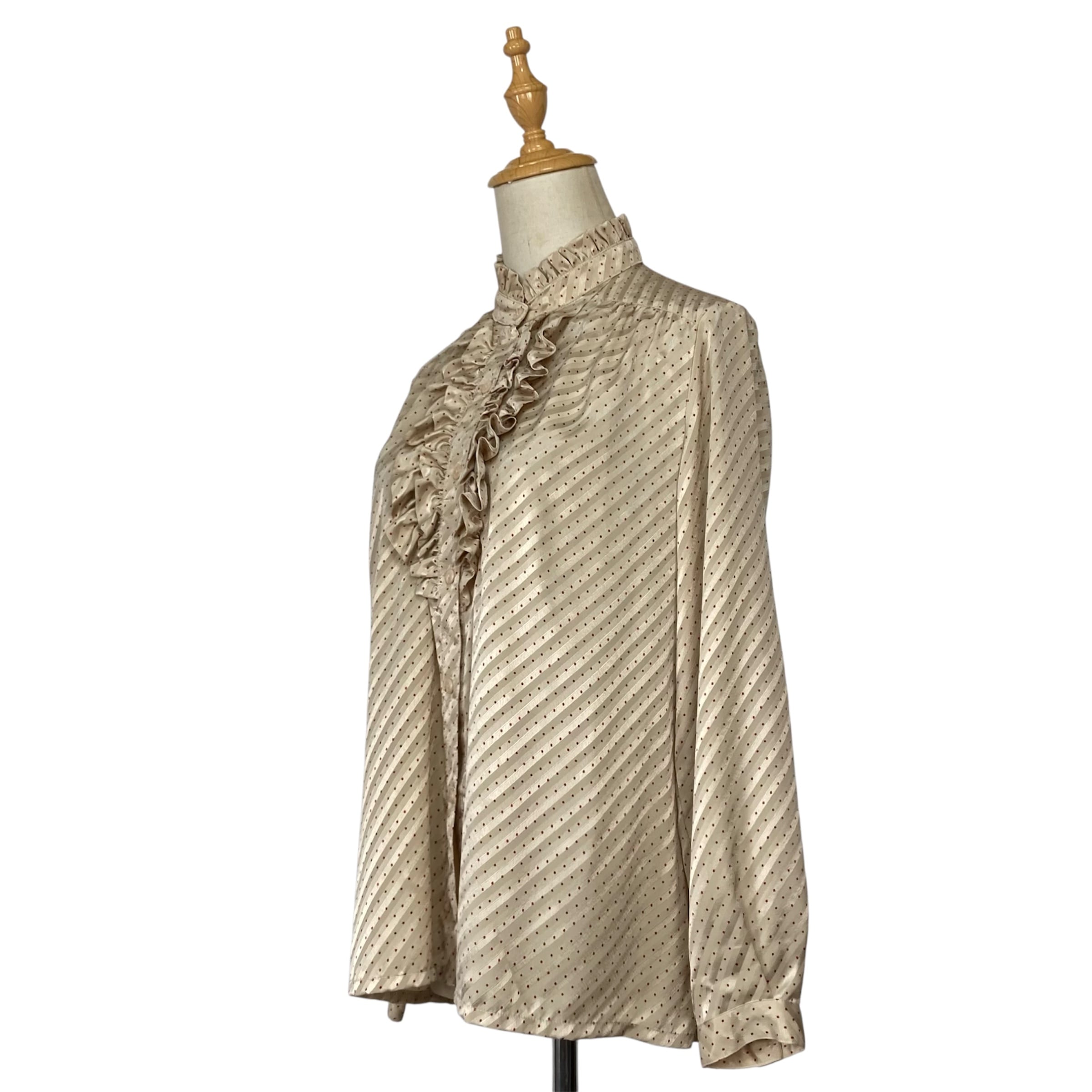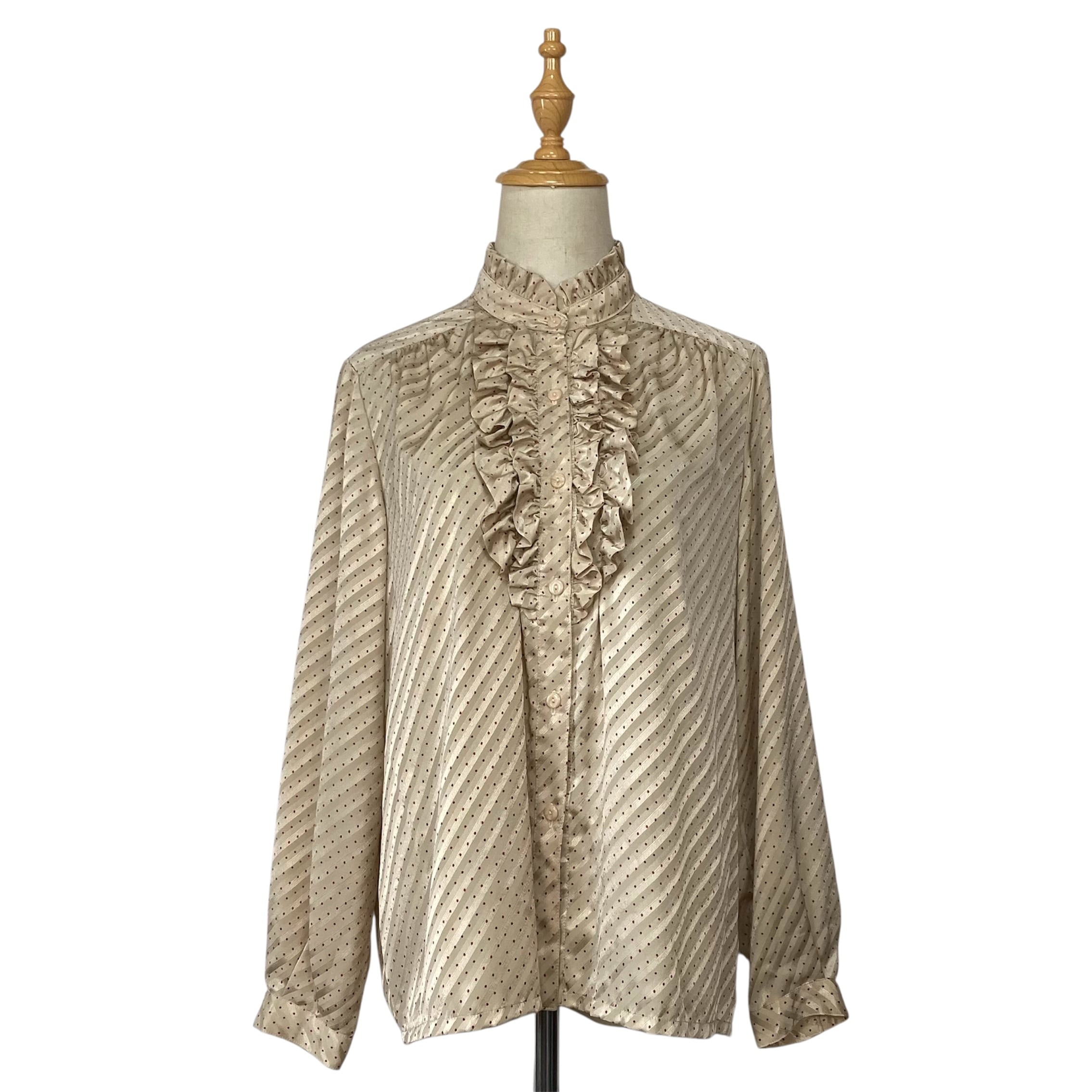プリーツのスタンドカラー、フロントにフリルあるデザインのクラシカルなブラウス