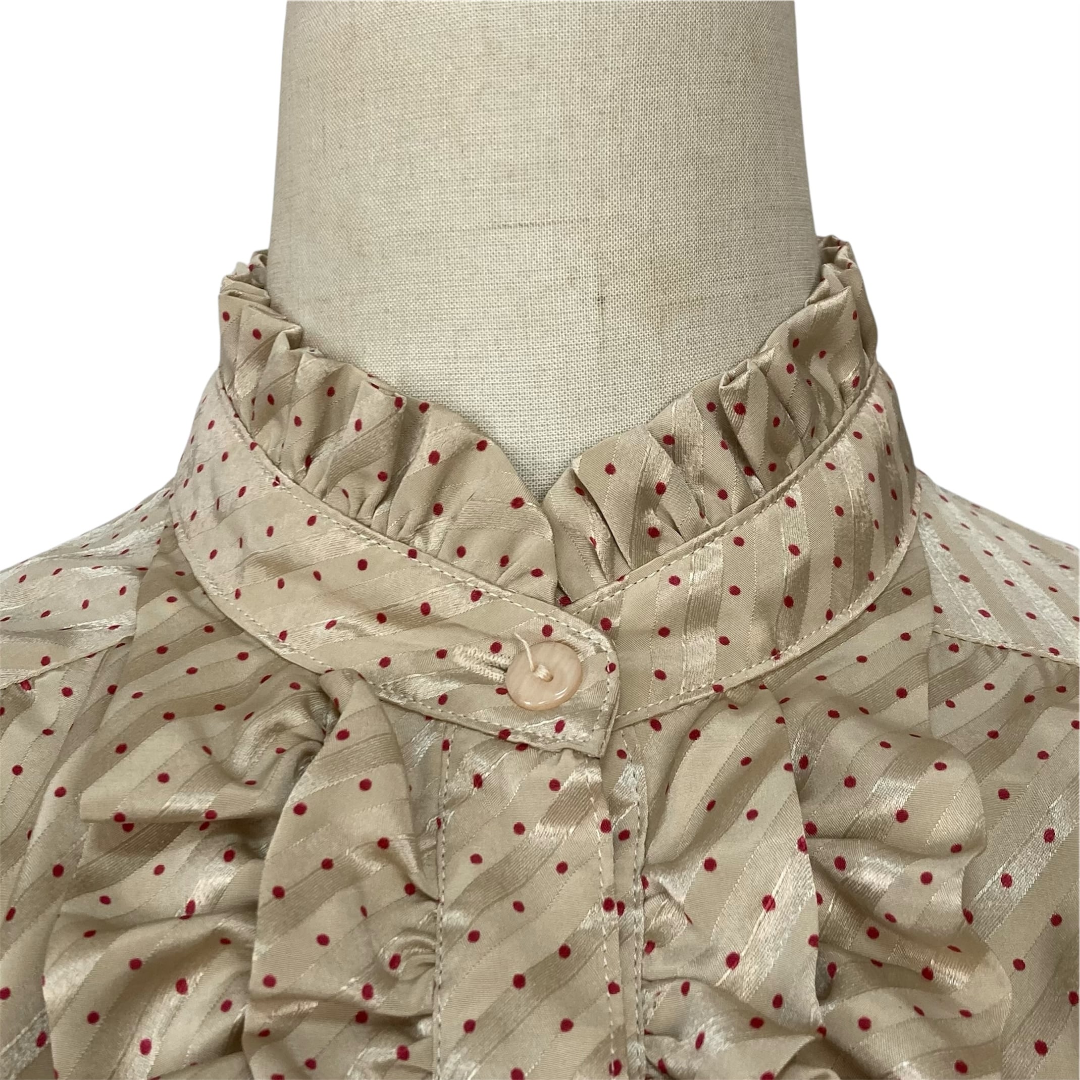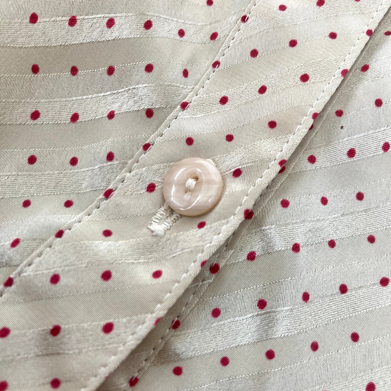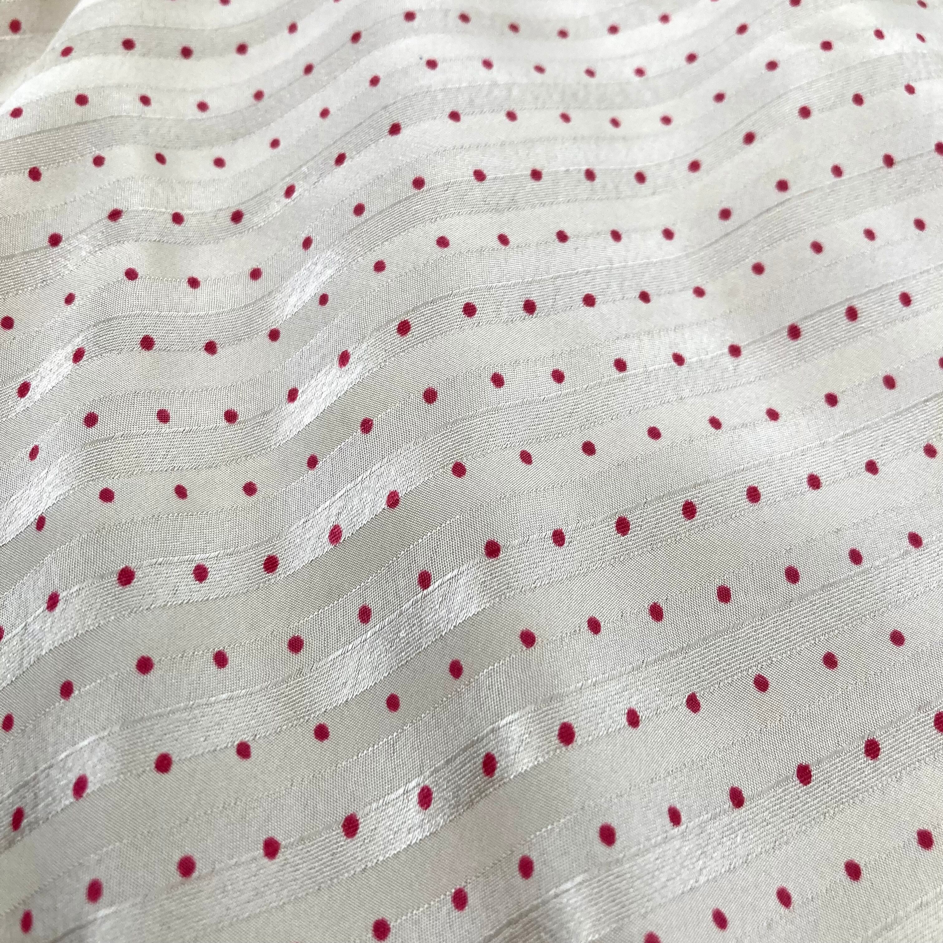 斜めセルフストライプのベージュ地に赤い水玉模様のツヤ感とやや透け感あるテキスタイル