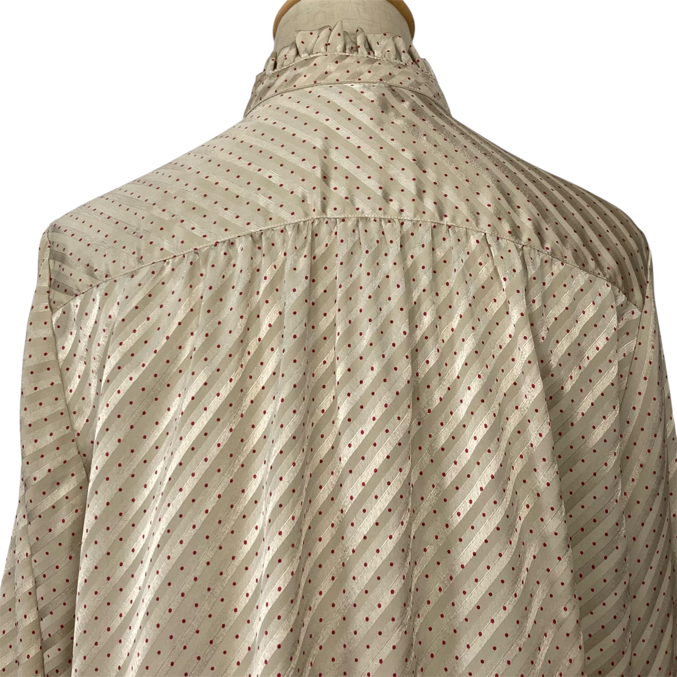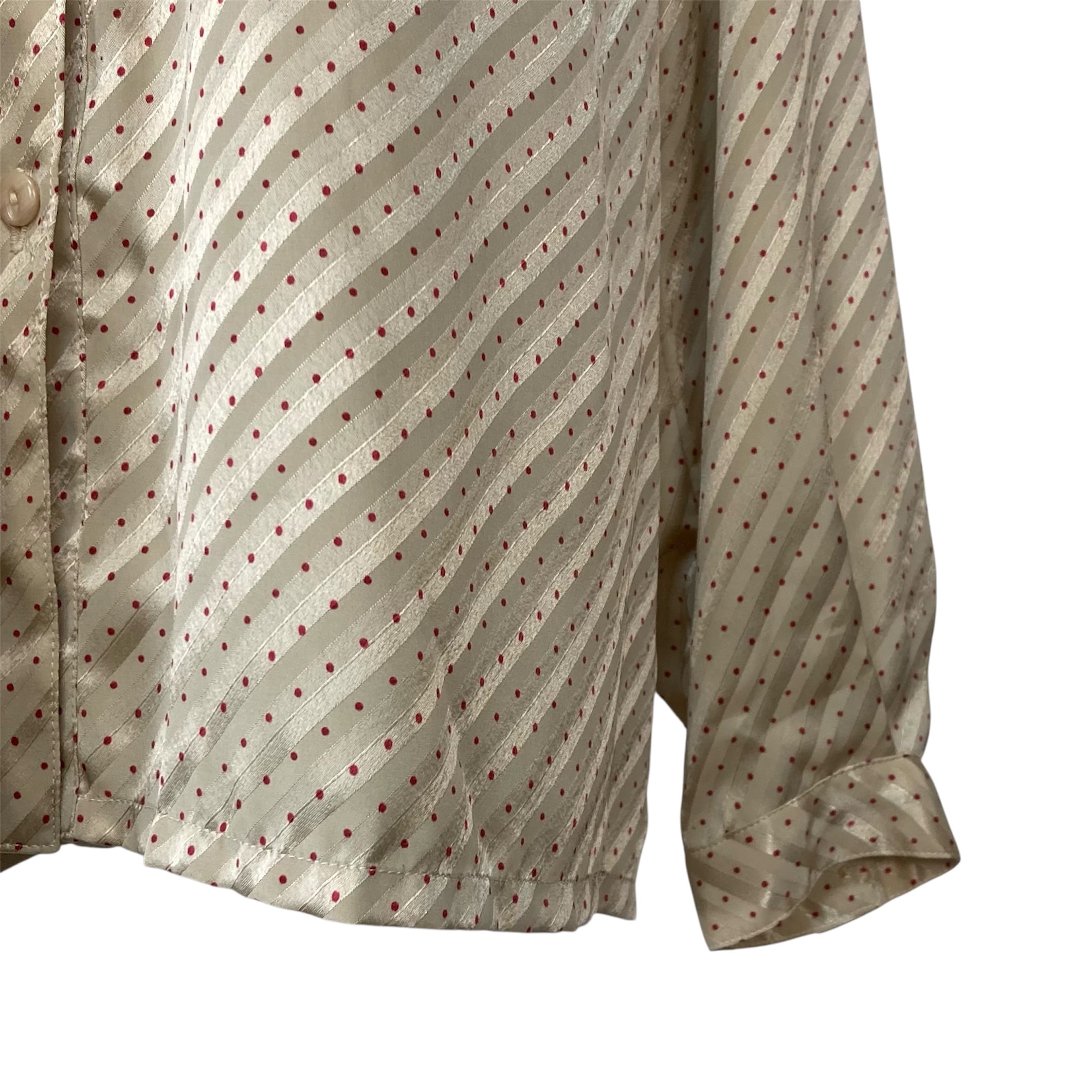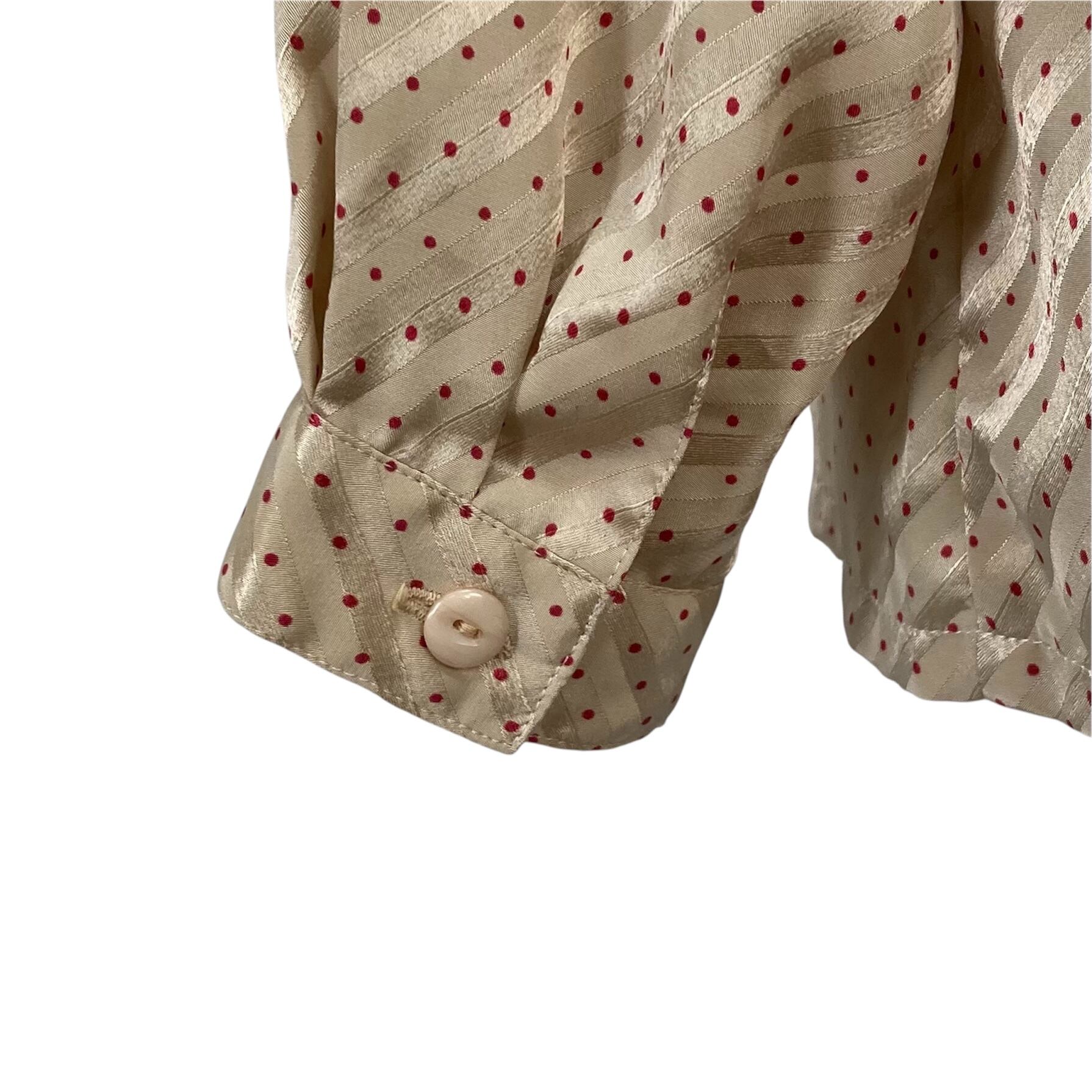 斜めセルフストライプのベージュ地に赤い水玉模様のツヤ感とやや透け感あるテキスタイル