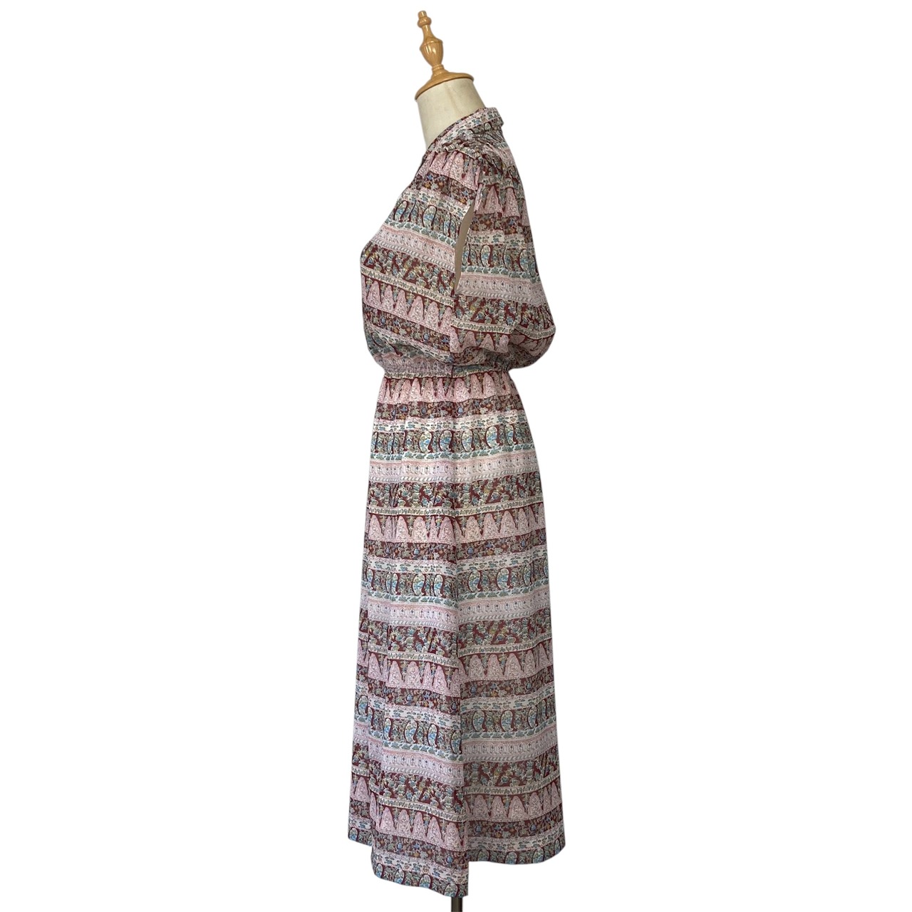 肩にタックを寄せたデザインの総柄フレンチスリーブワンピース