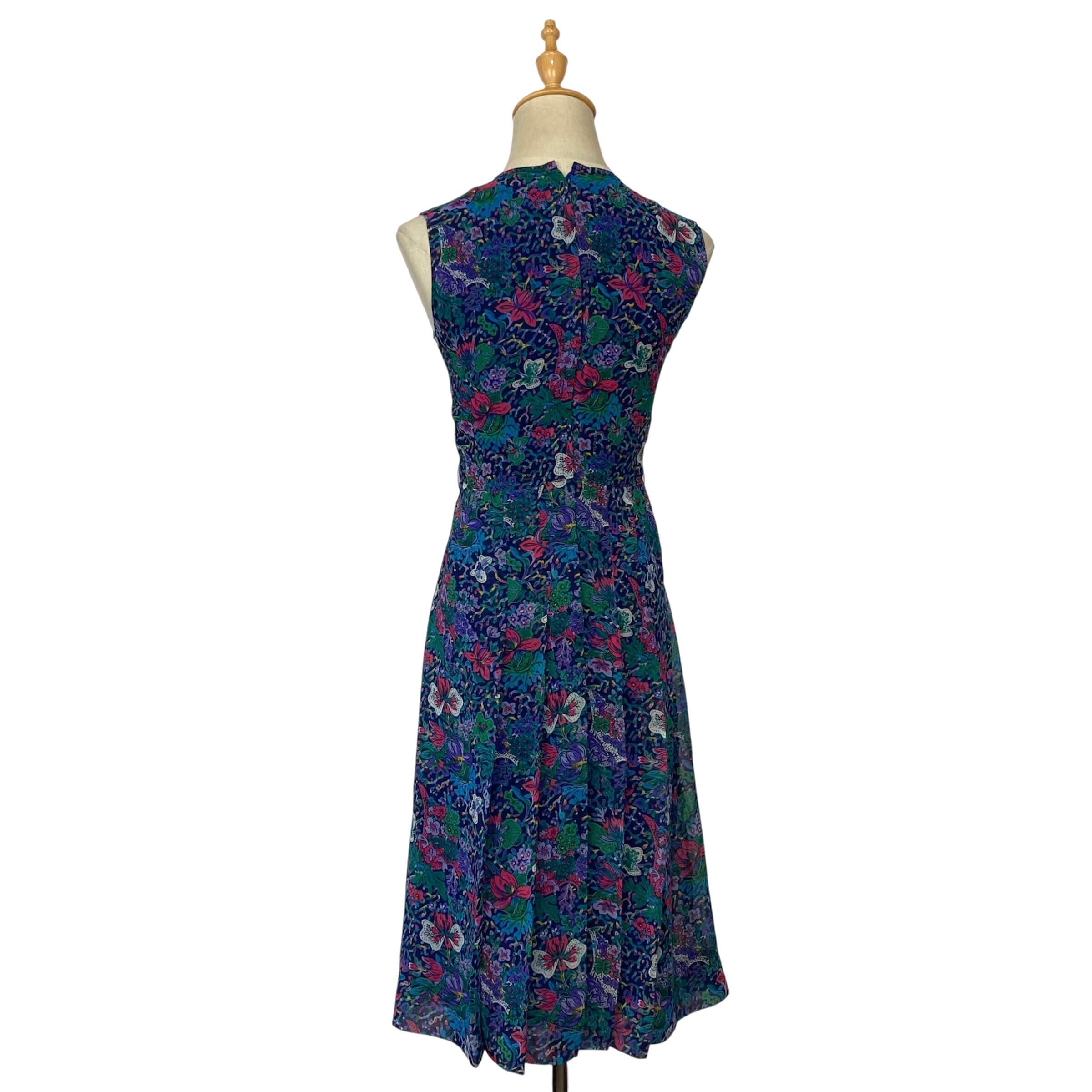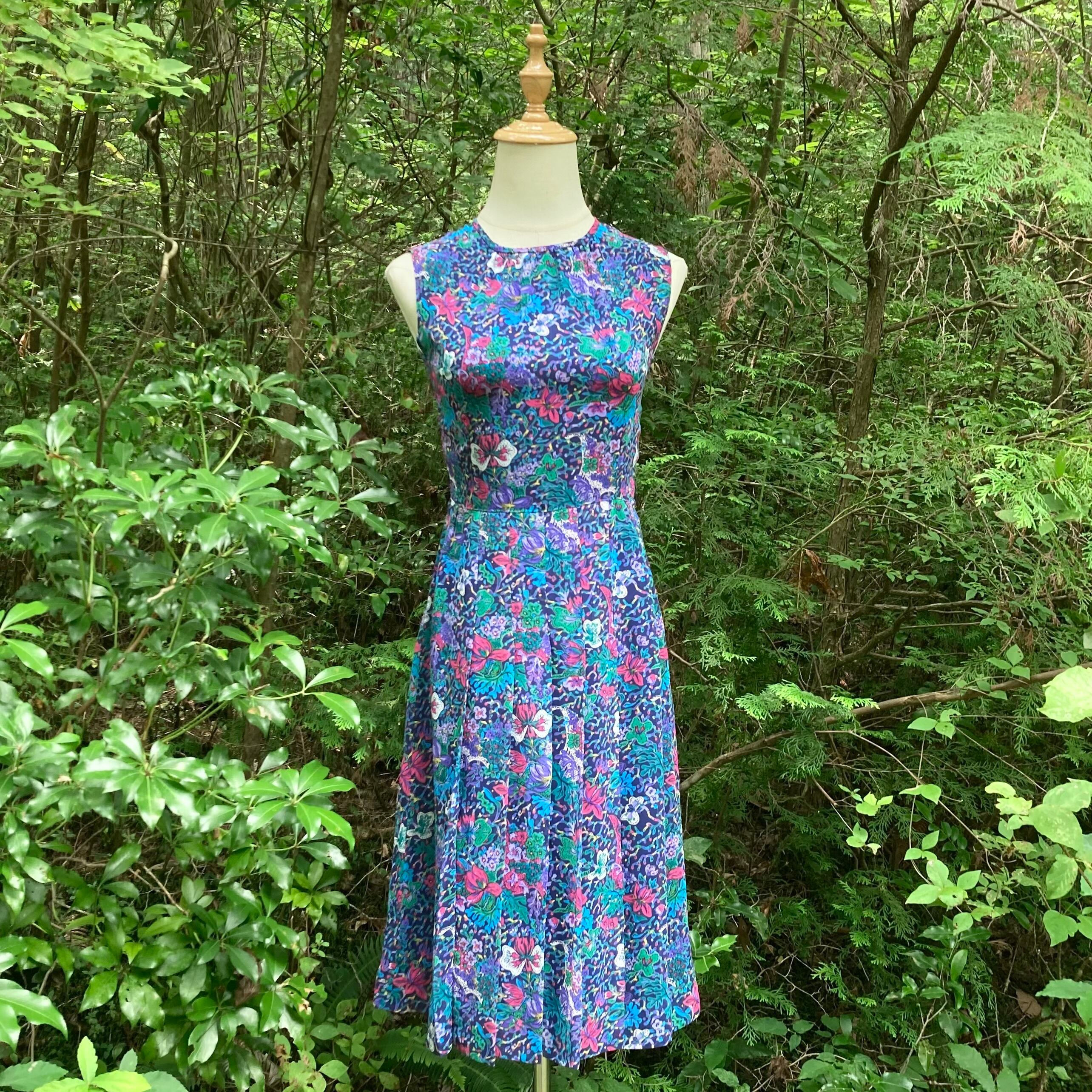 首元にギャザー、ウエスト切り替え、プリーツスカートのシンプルシルエットに特徴的な色柄のどんな柄なのか見ていたくなる総柄ワンピース