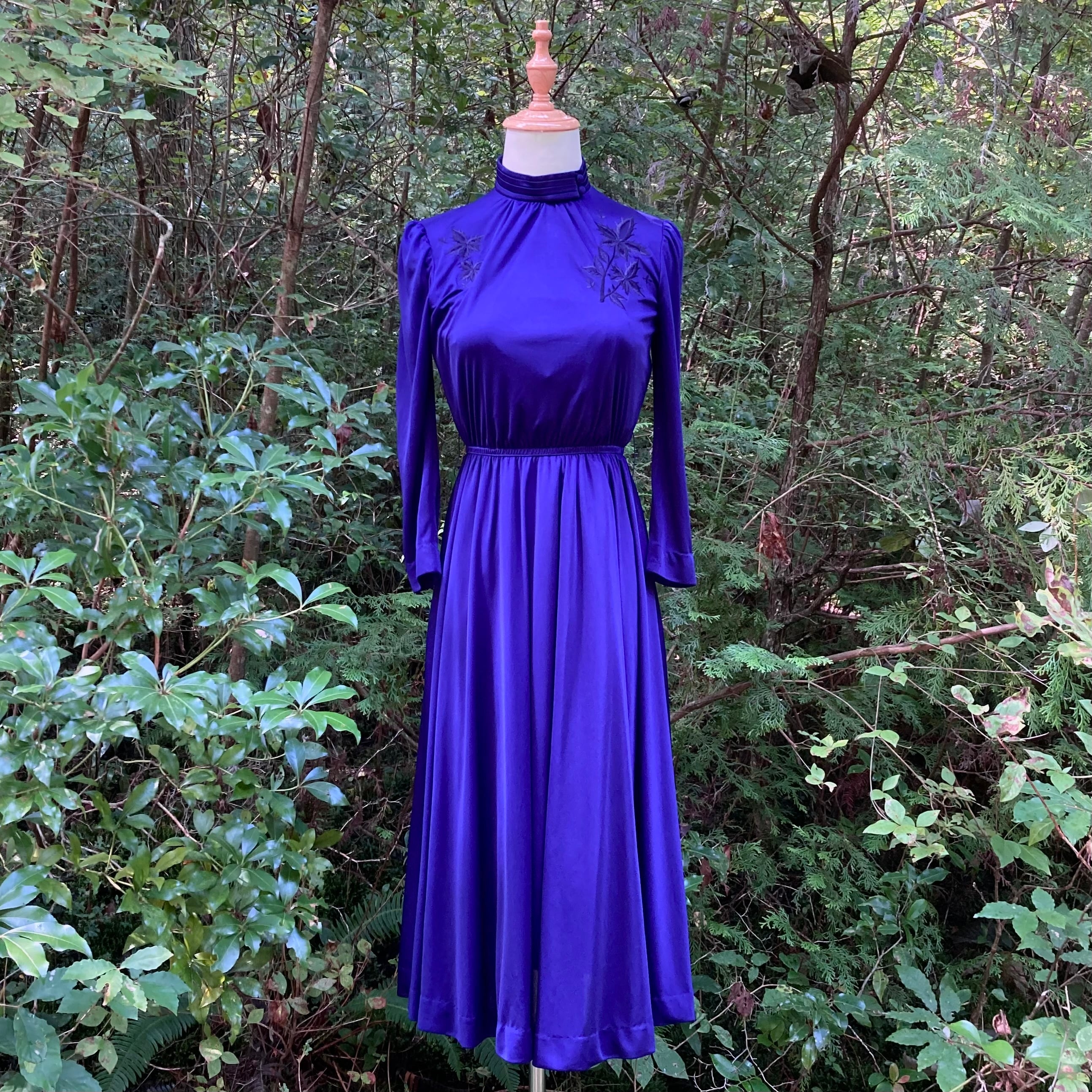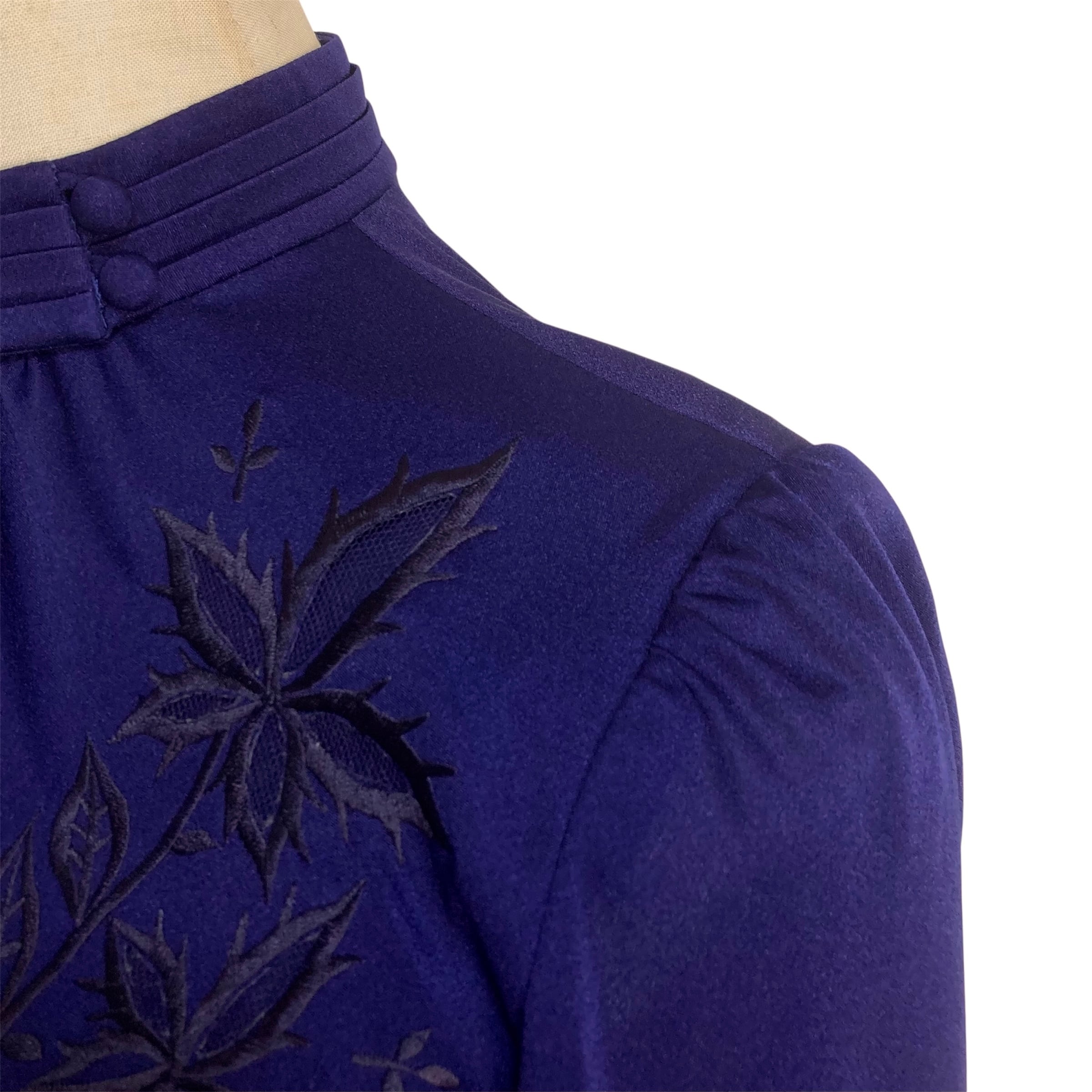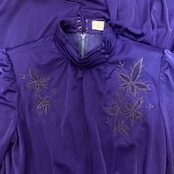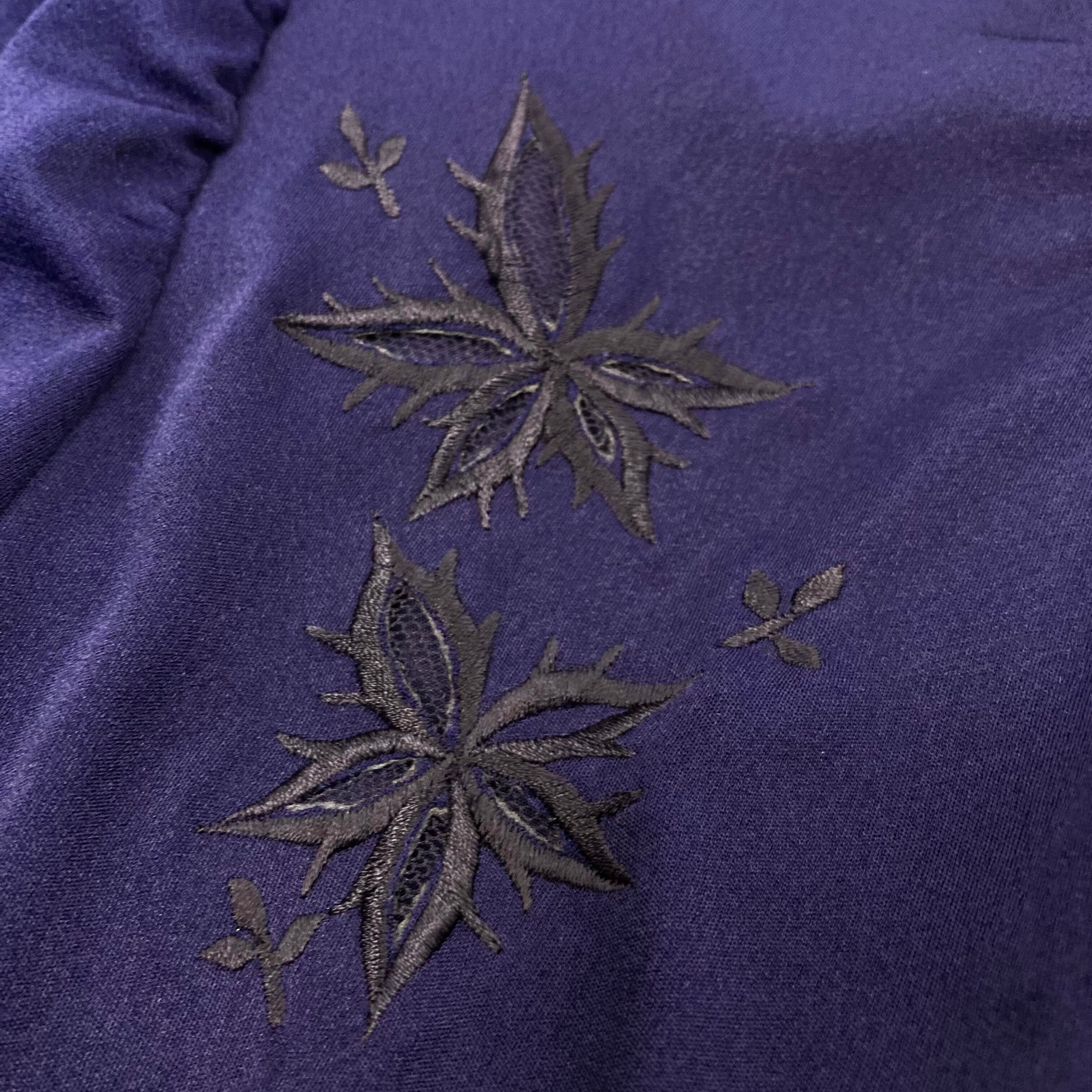 濃い紫色地の胸元に黒い花刺繍のテキスタイル