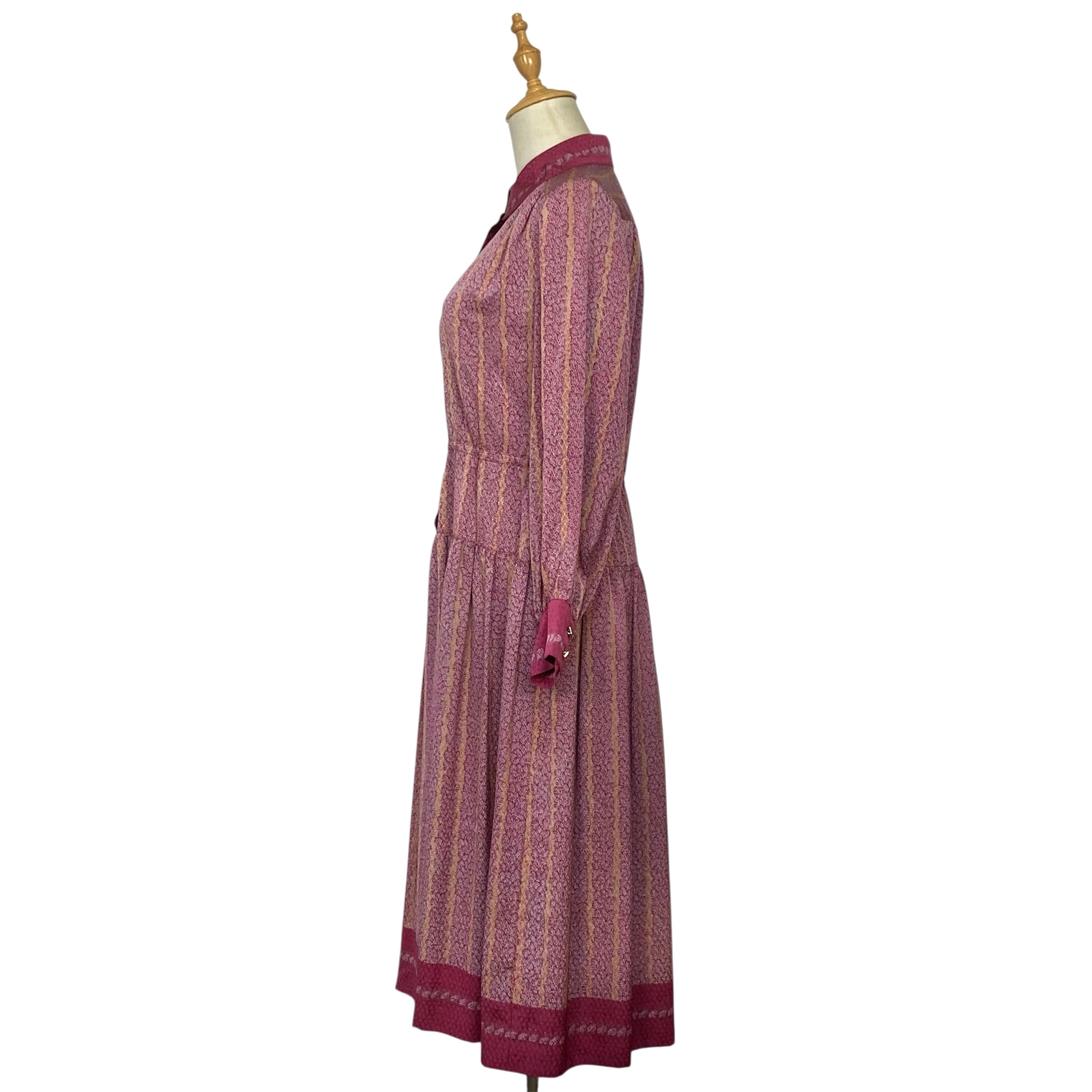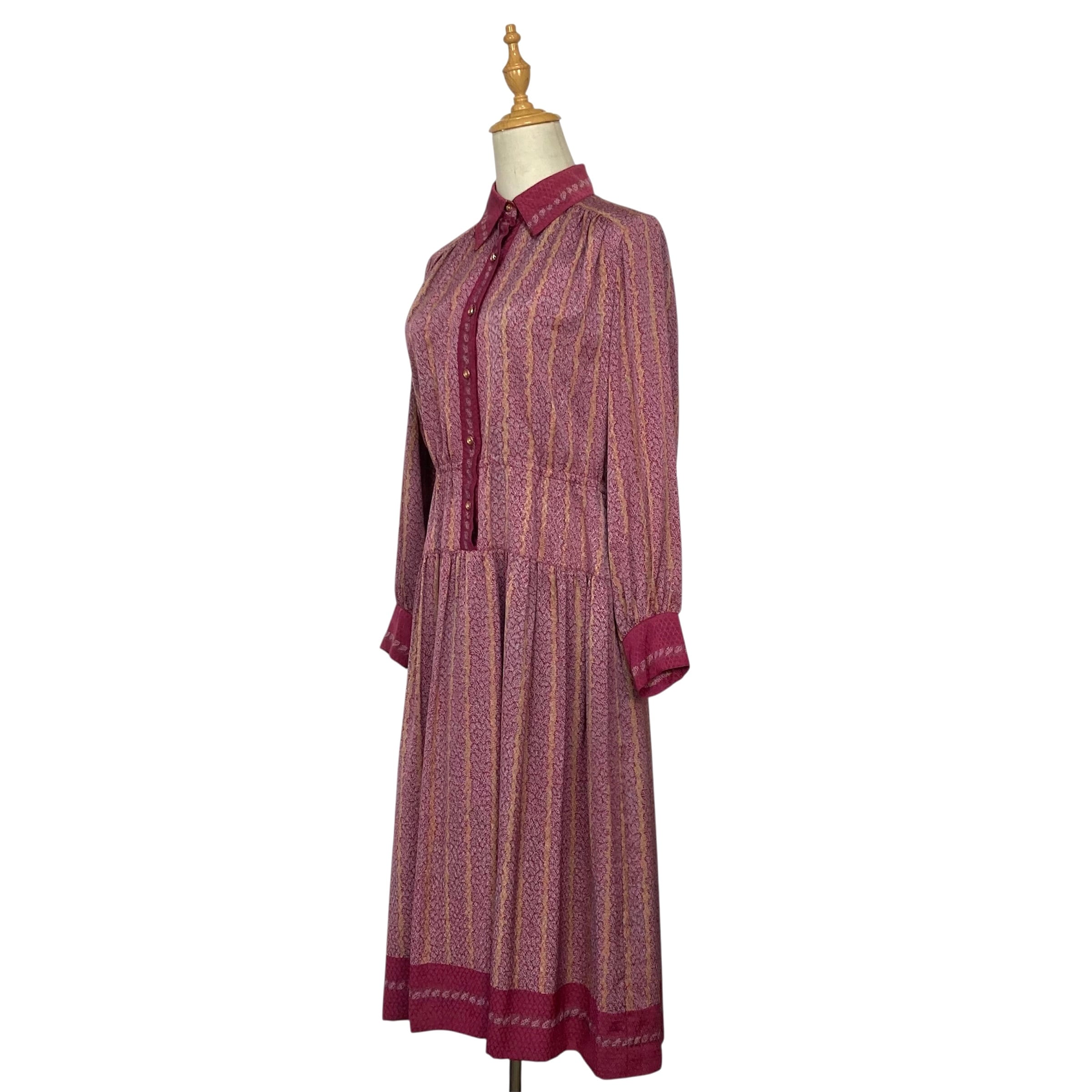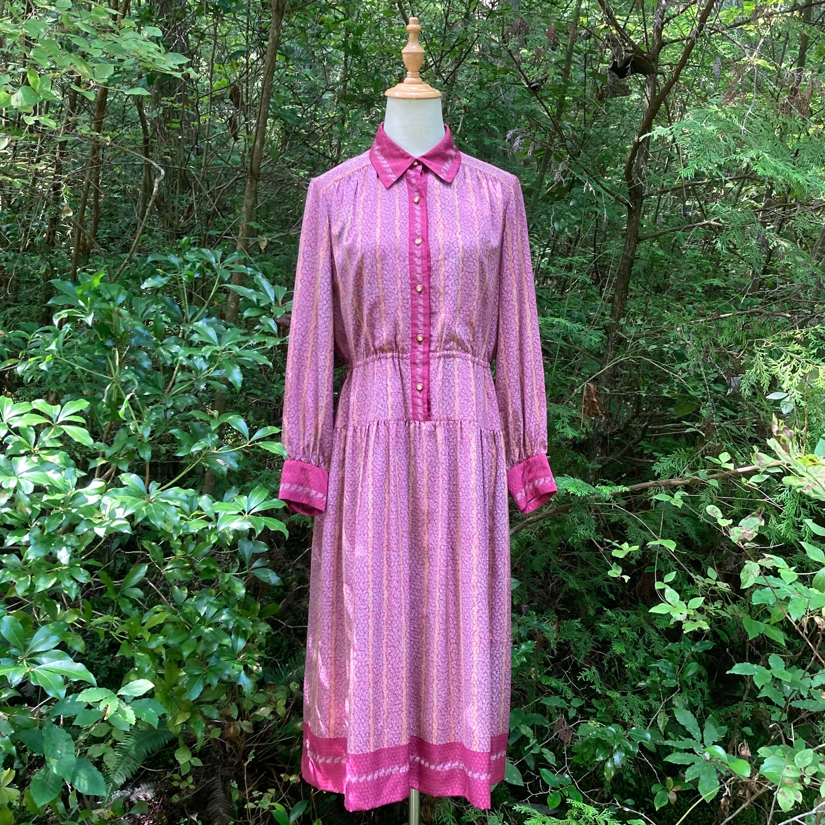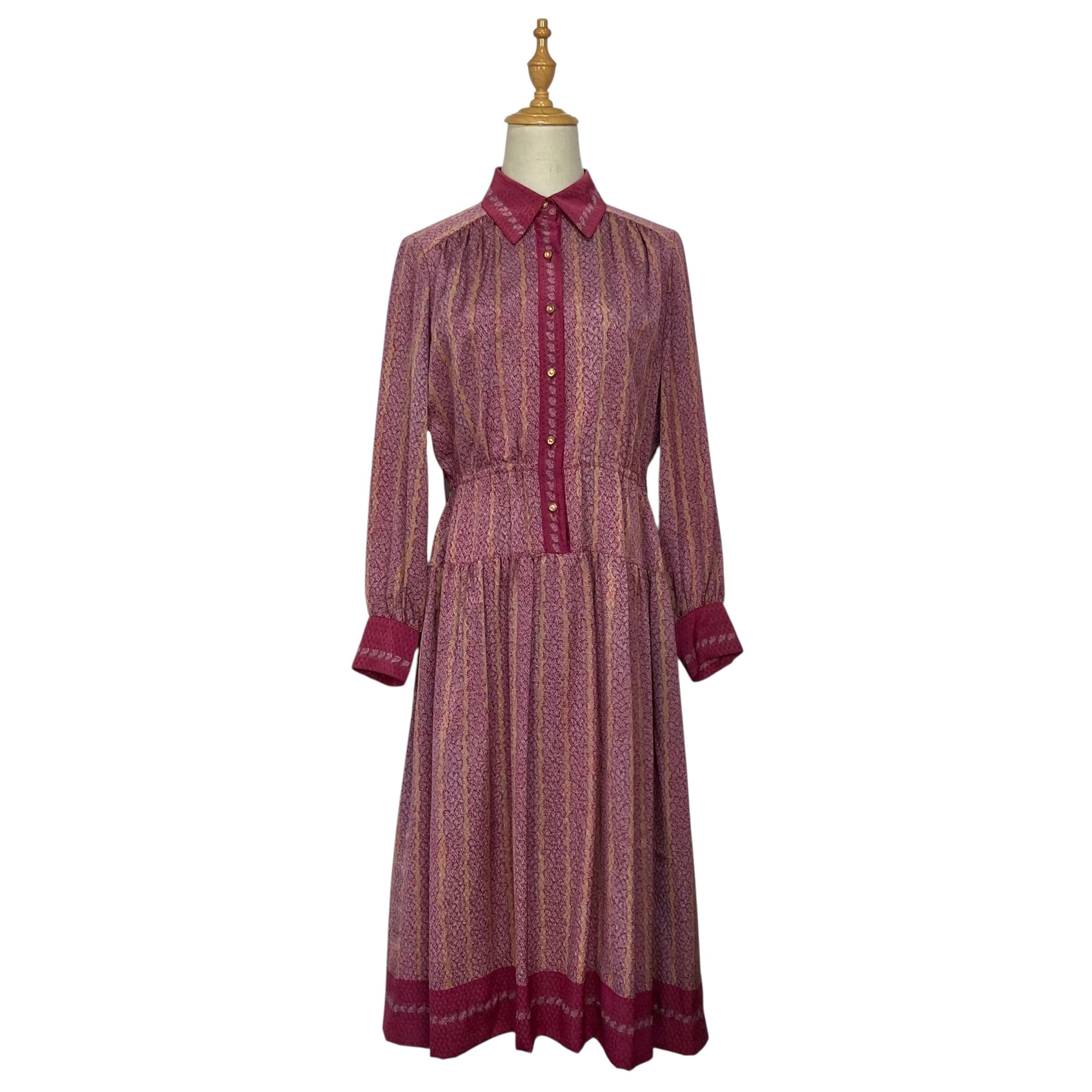全体的に赤紫色のやや大きな衿の総柄ワンピース