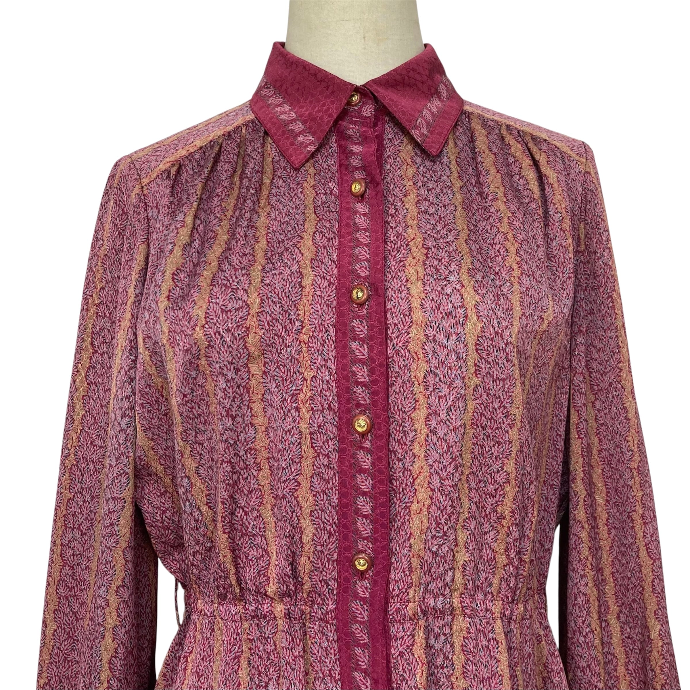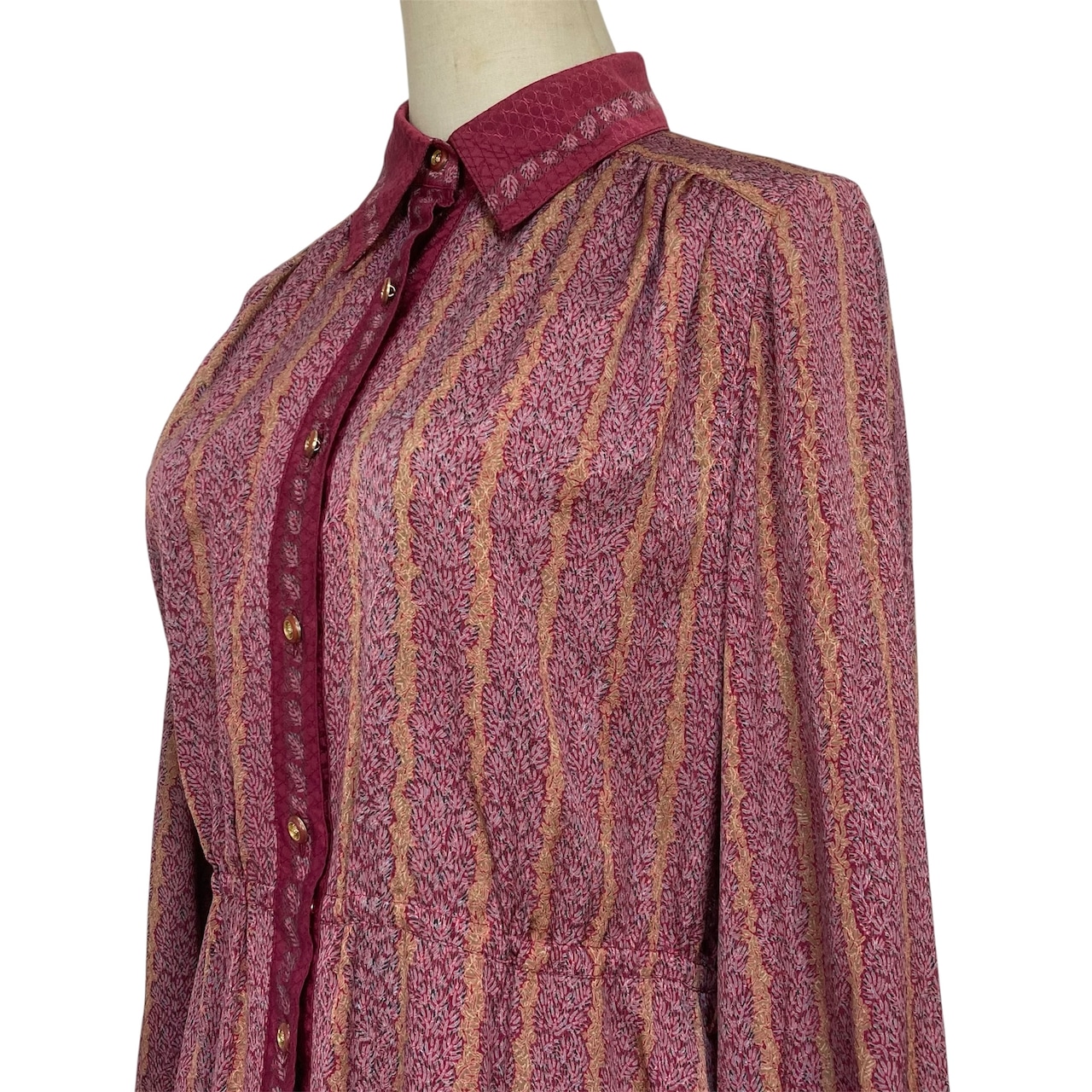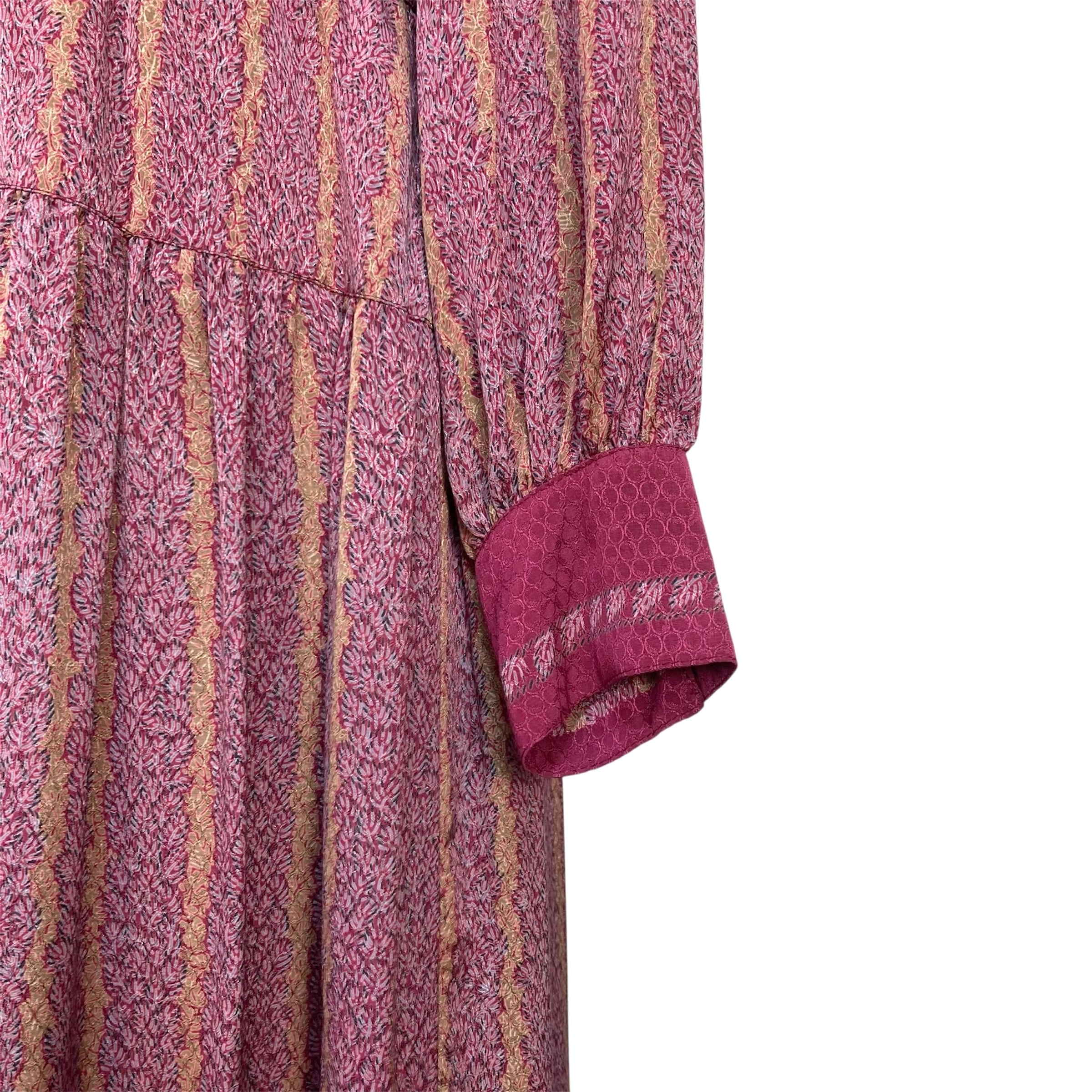 全体的に赤紫色のやや大きな衿の総柄ワンピース