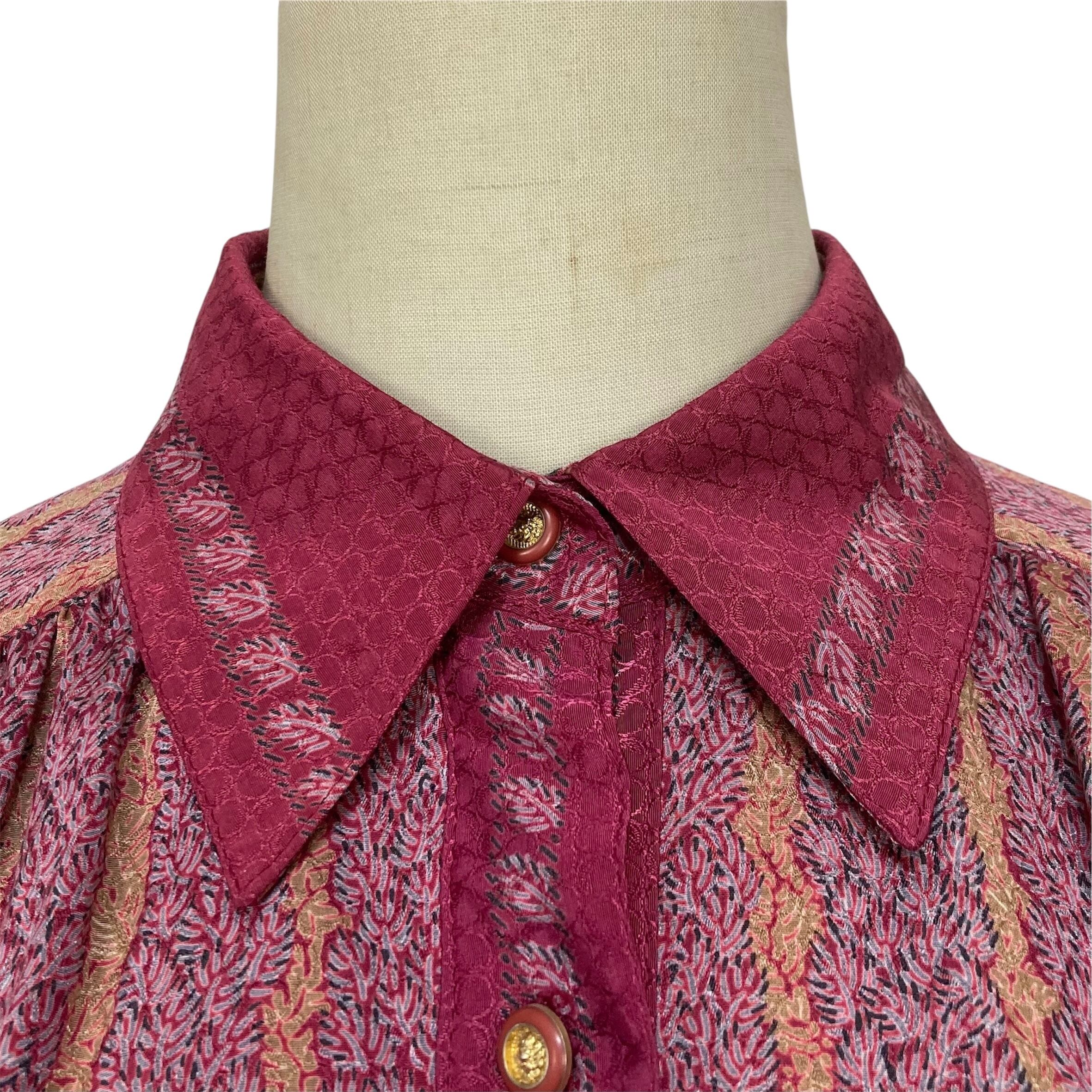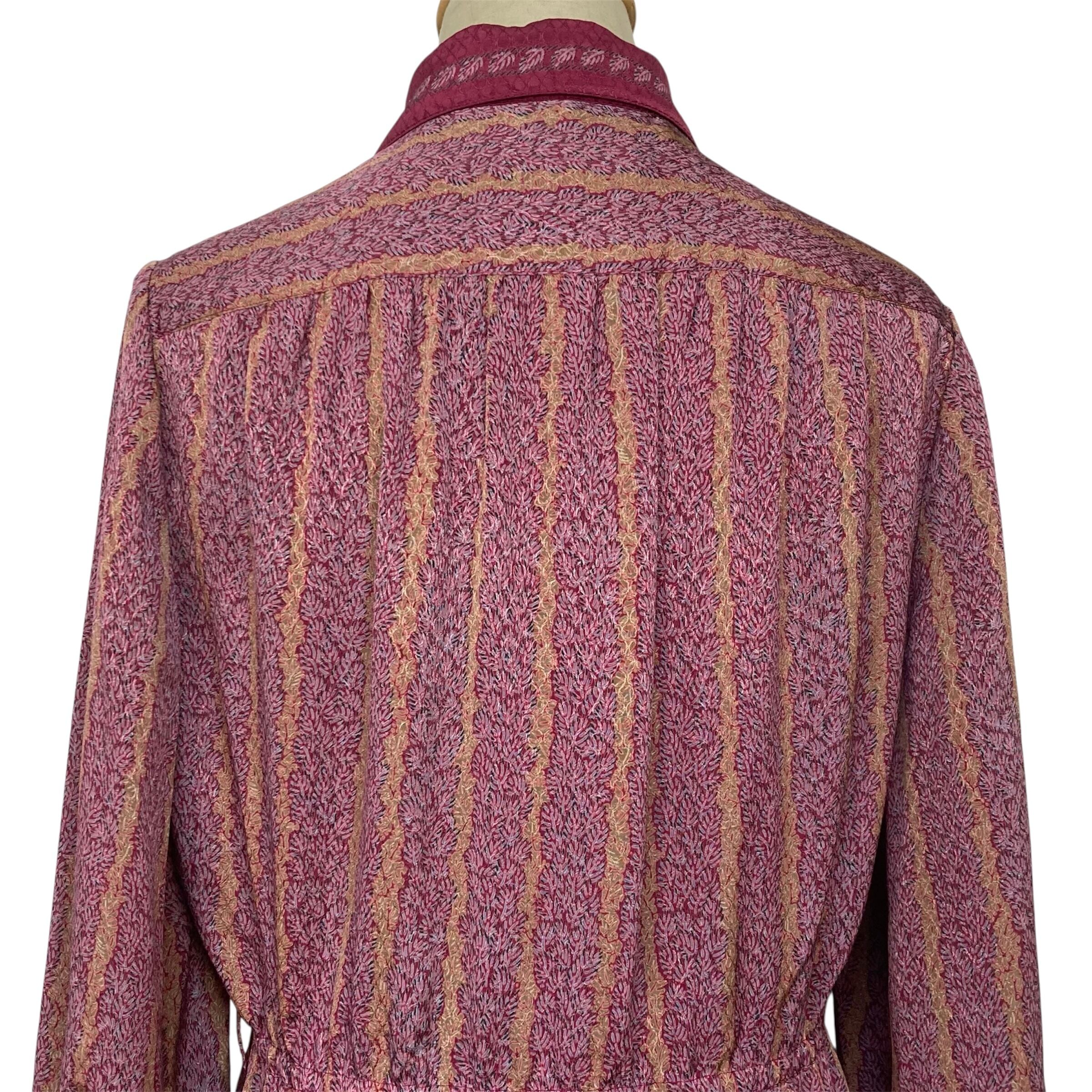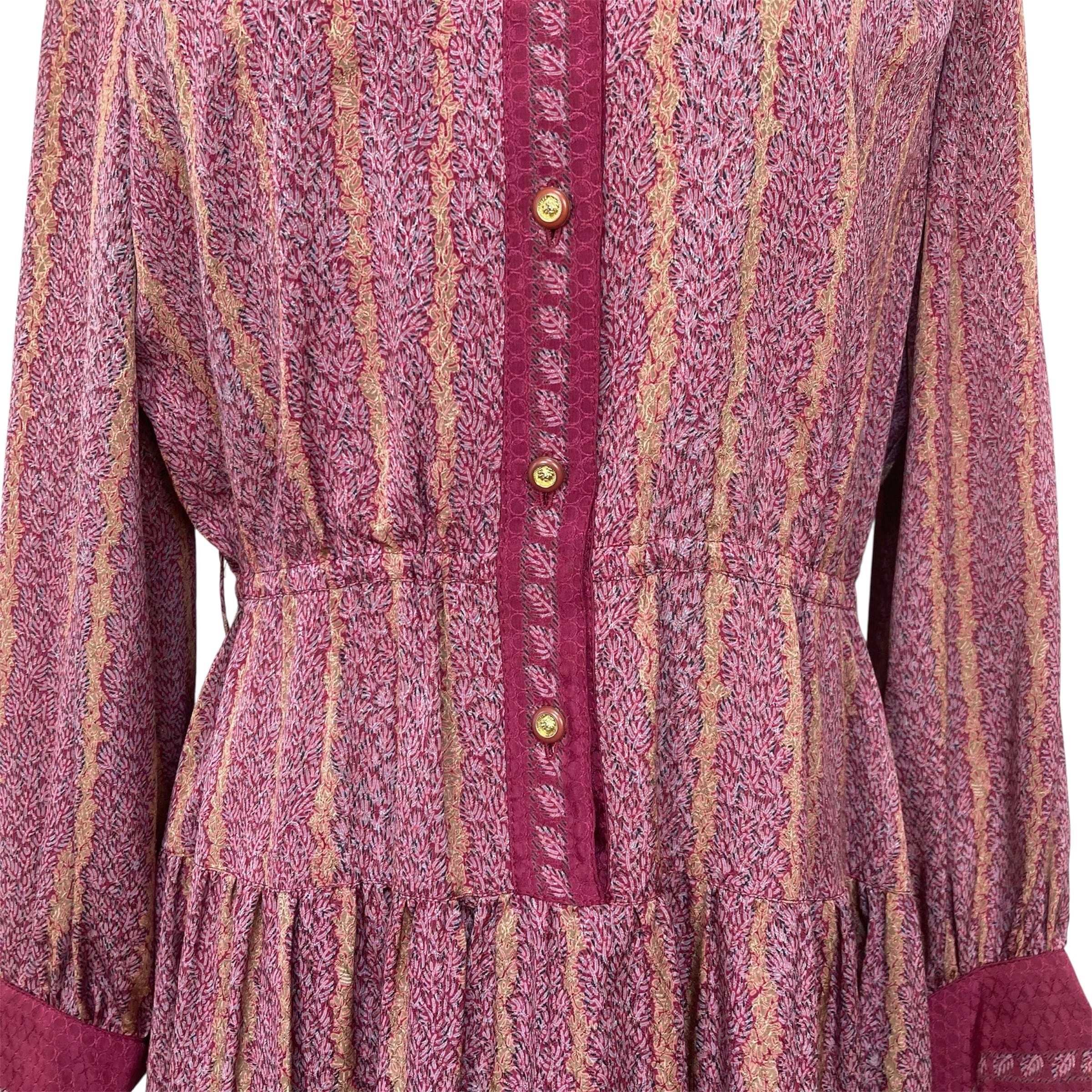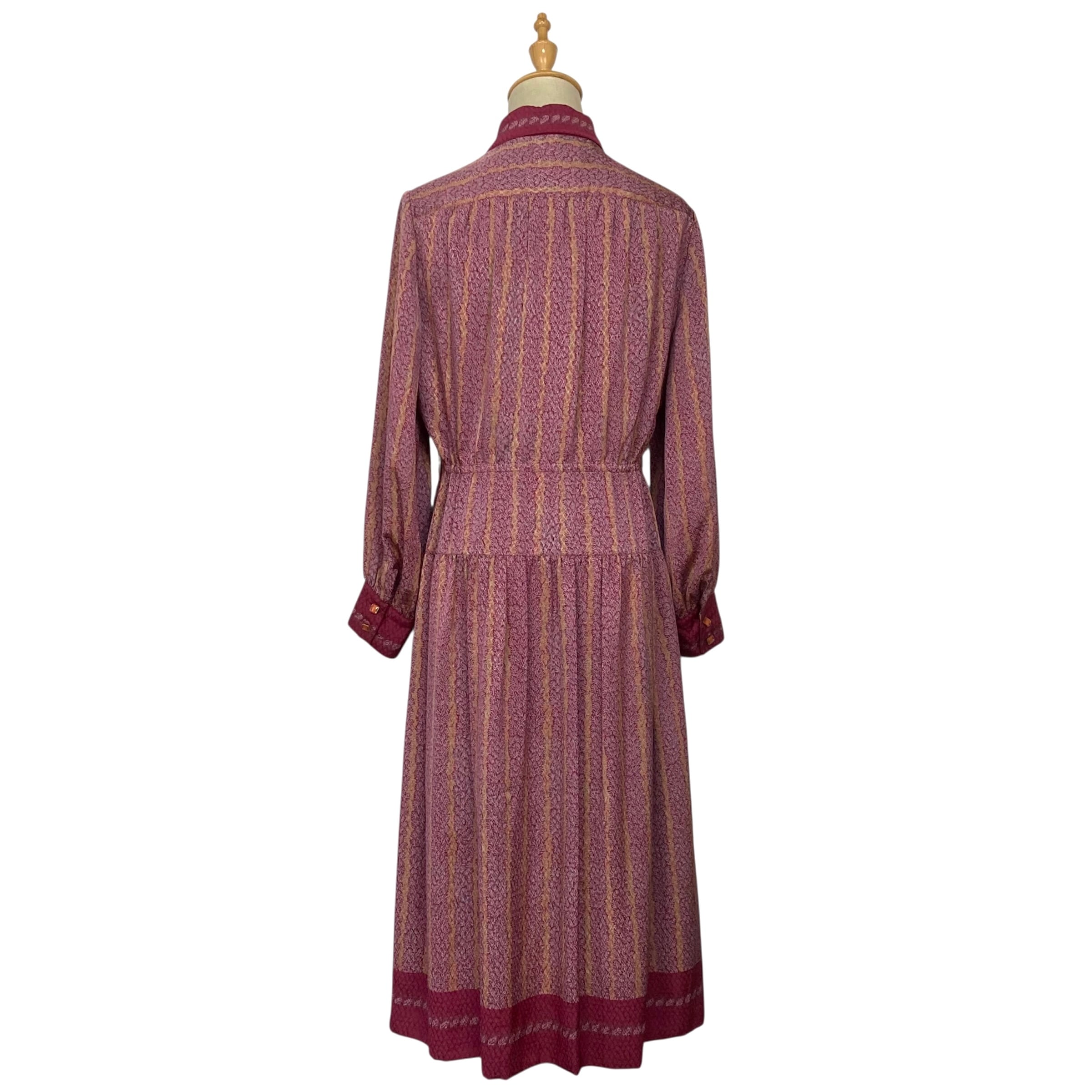 全体的に赤紫色のやや大きな衿の総柄ワンピース