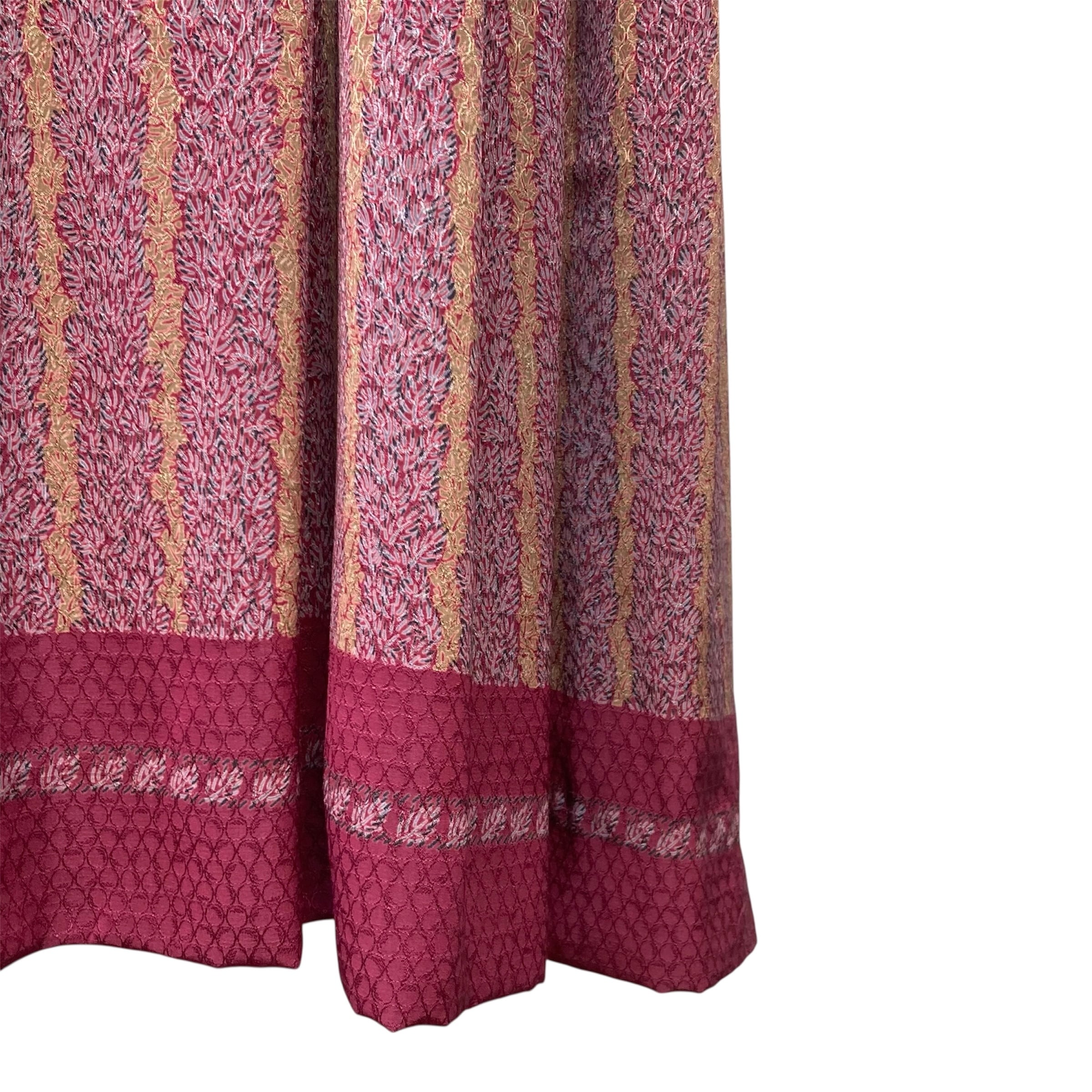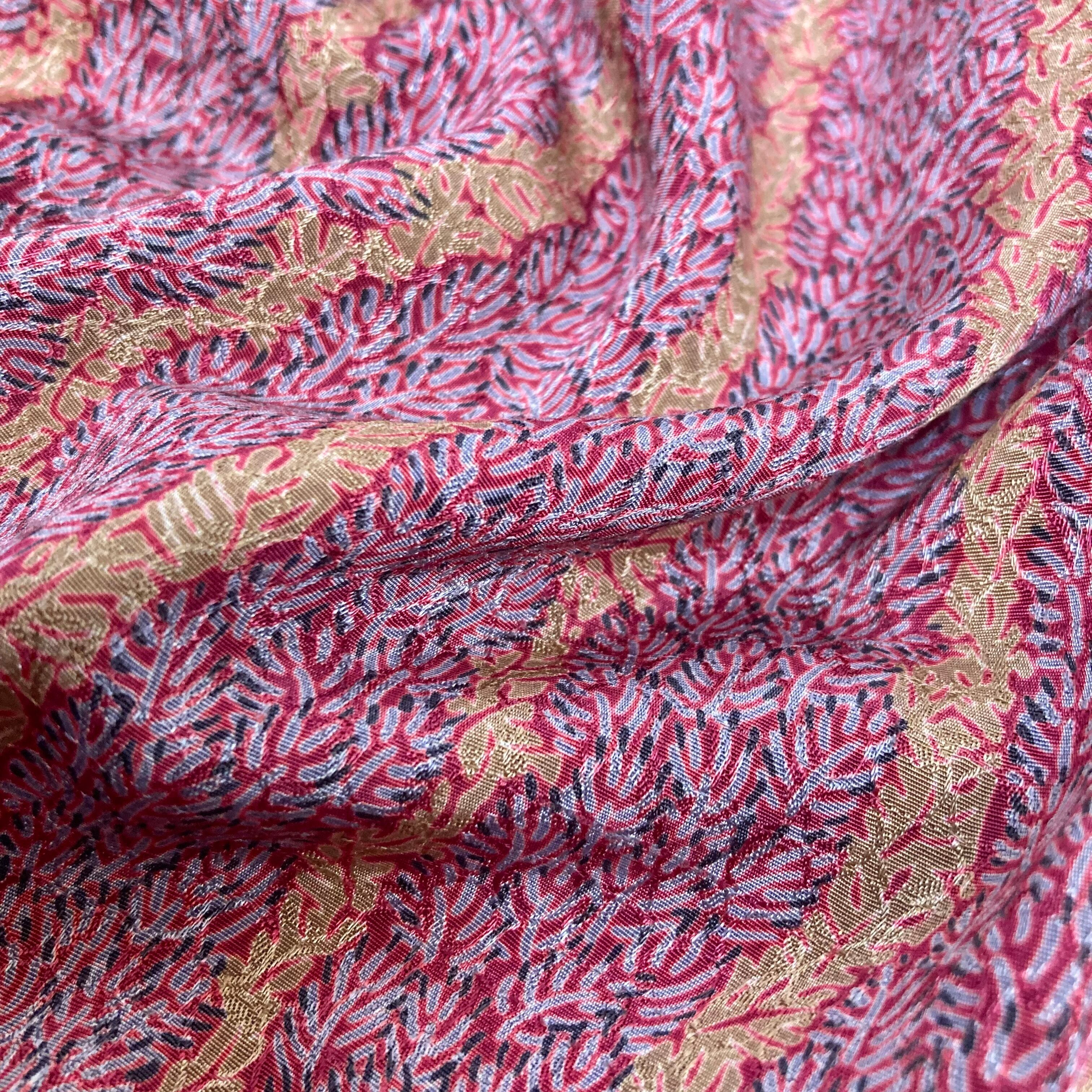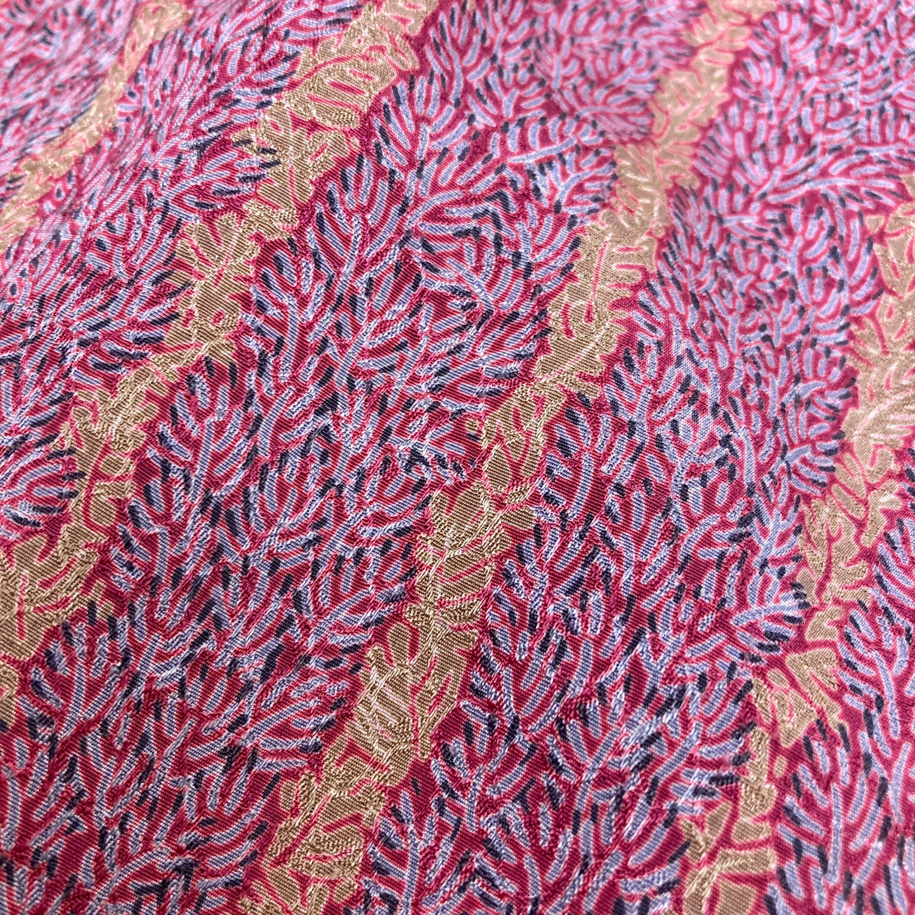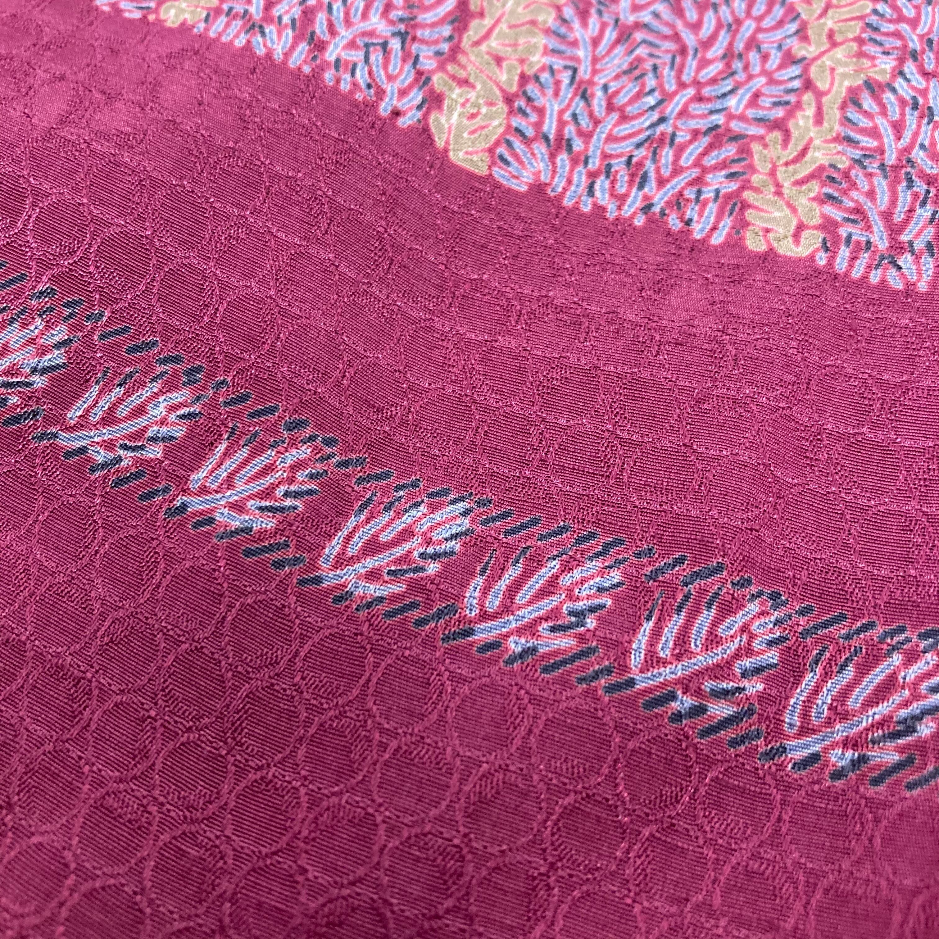 光の加減で見え隠れする菱形の中の円形に小さな枝葉模様がストライプ状にプリントされたテキスタイル