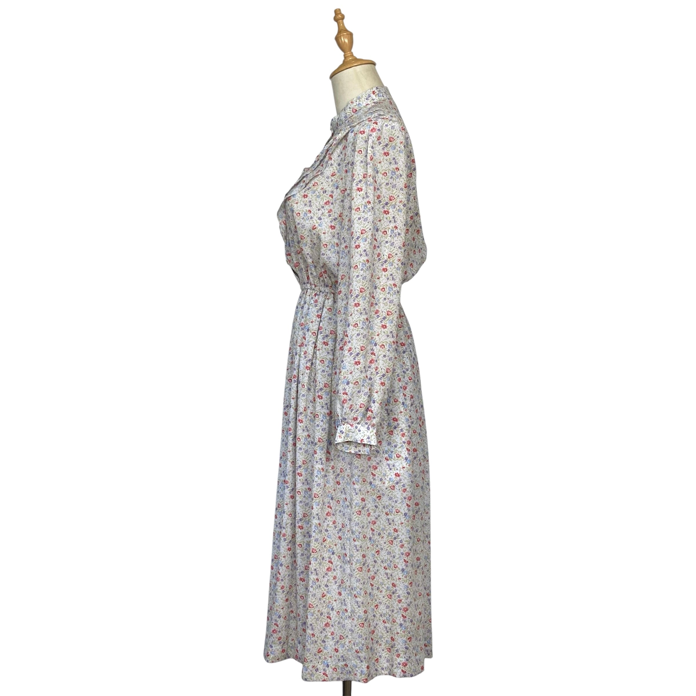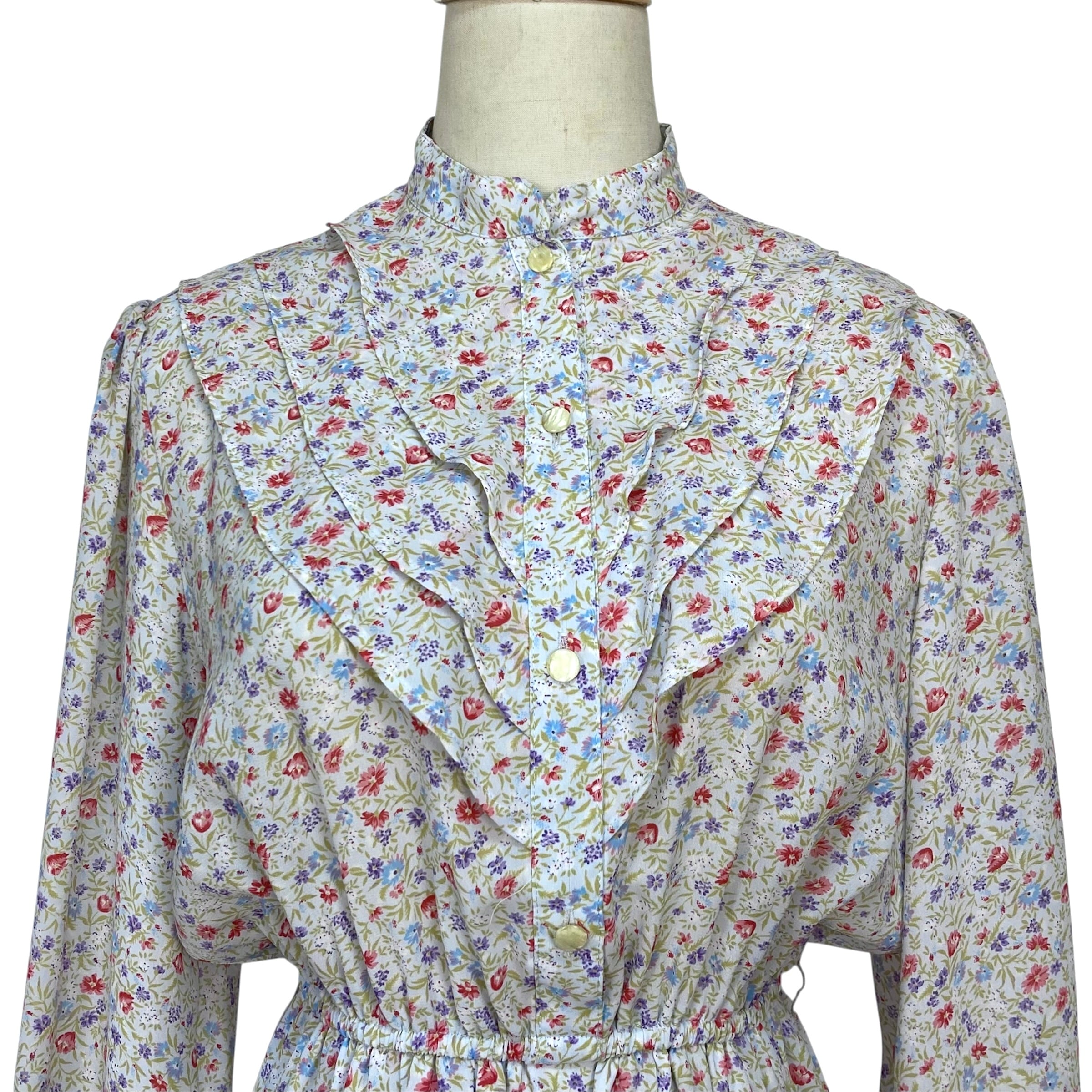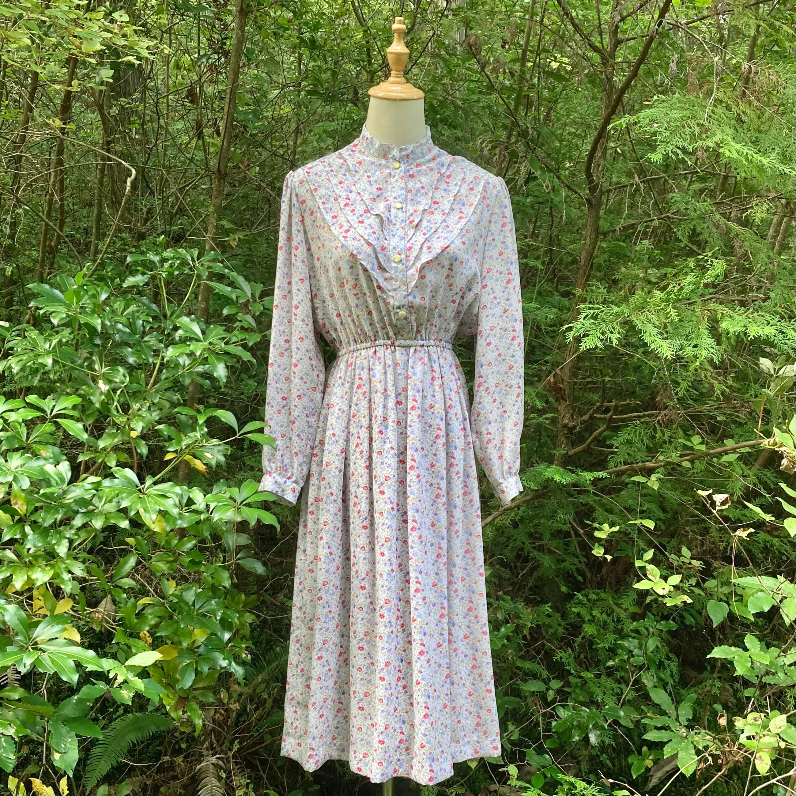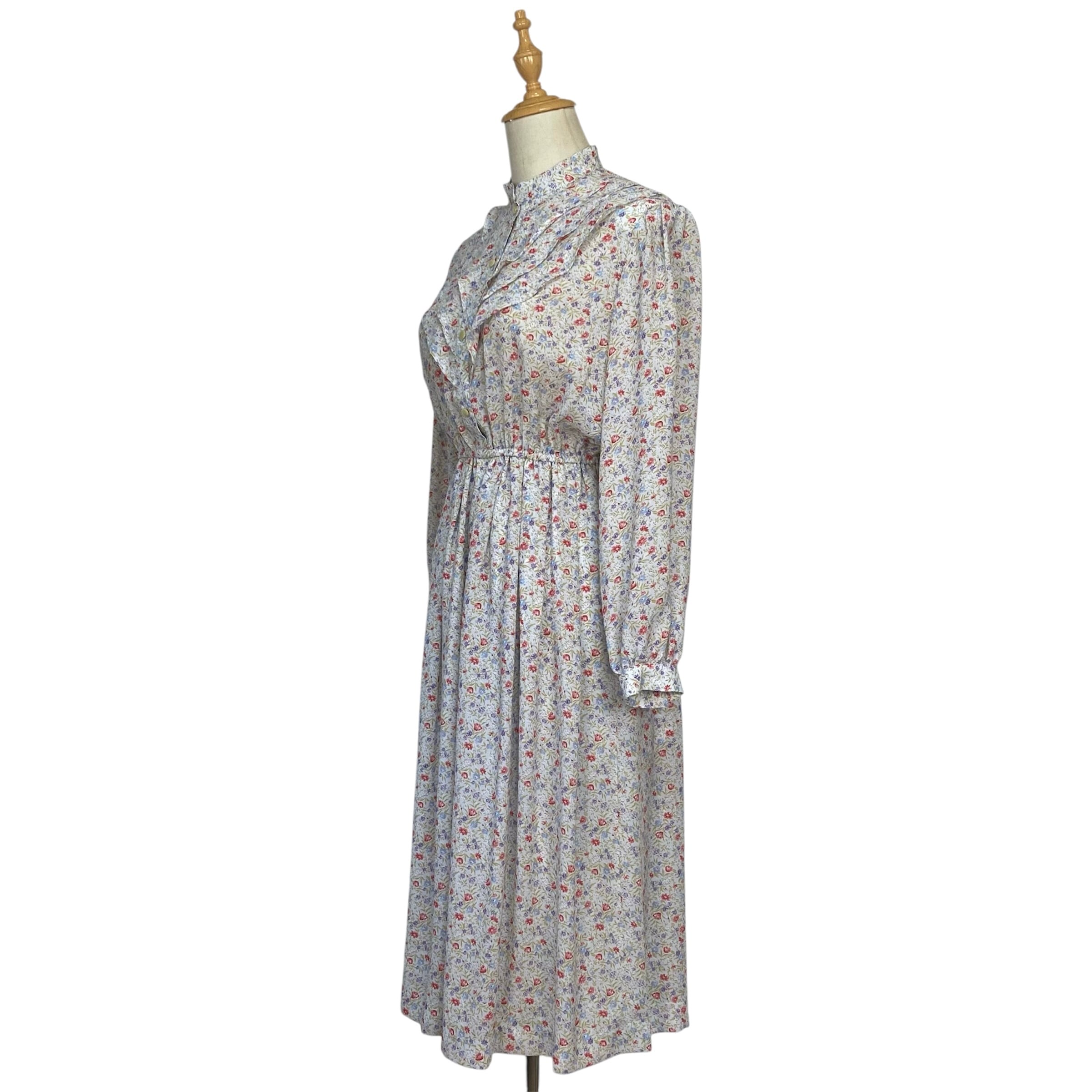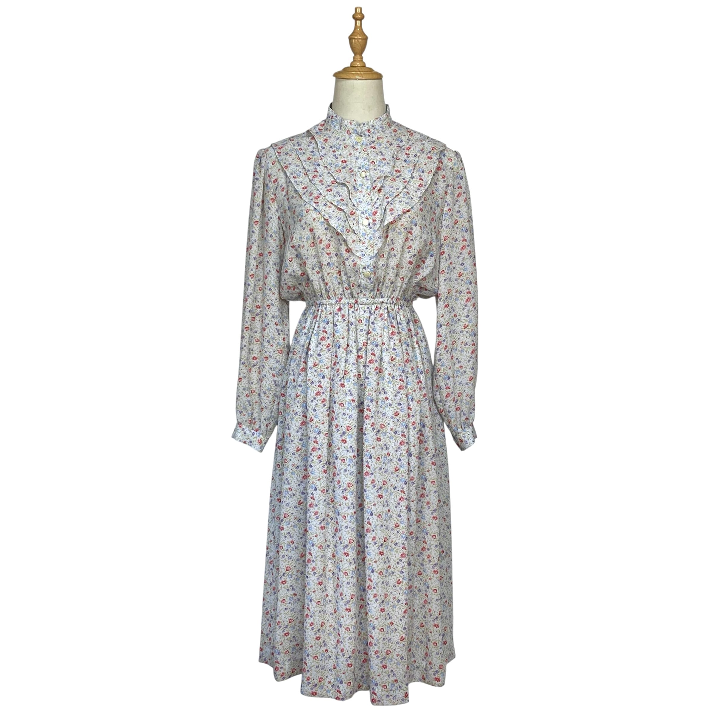 スタンドカラー、フロントにティアードデザインのゆるやかなフリルの総柄レトロワンピース