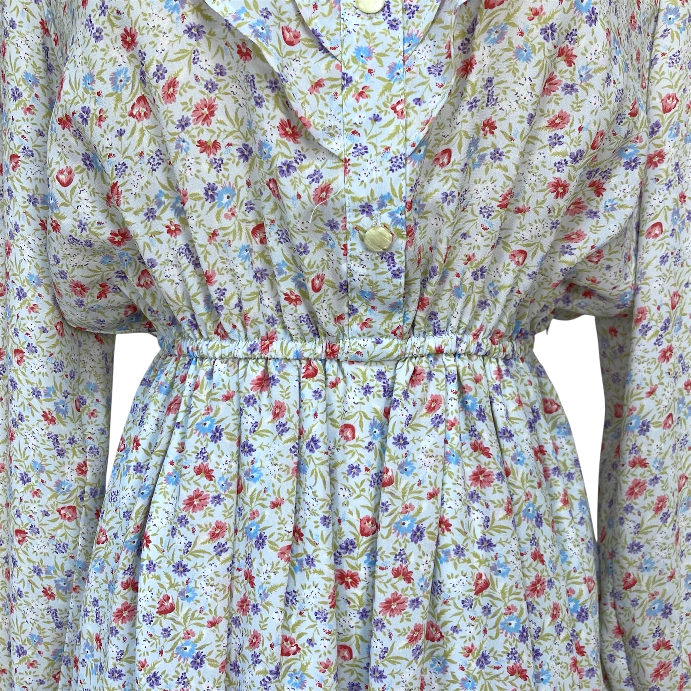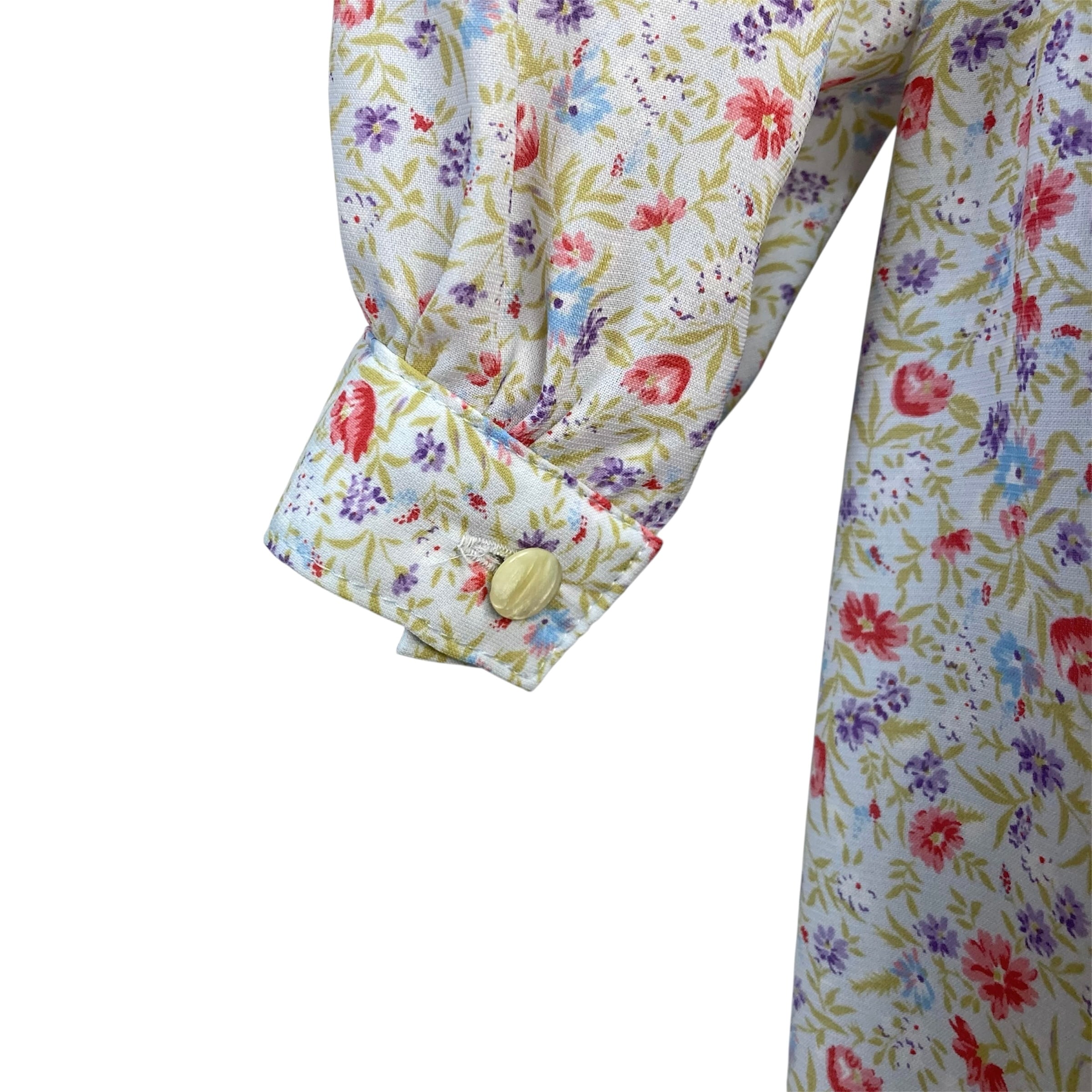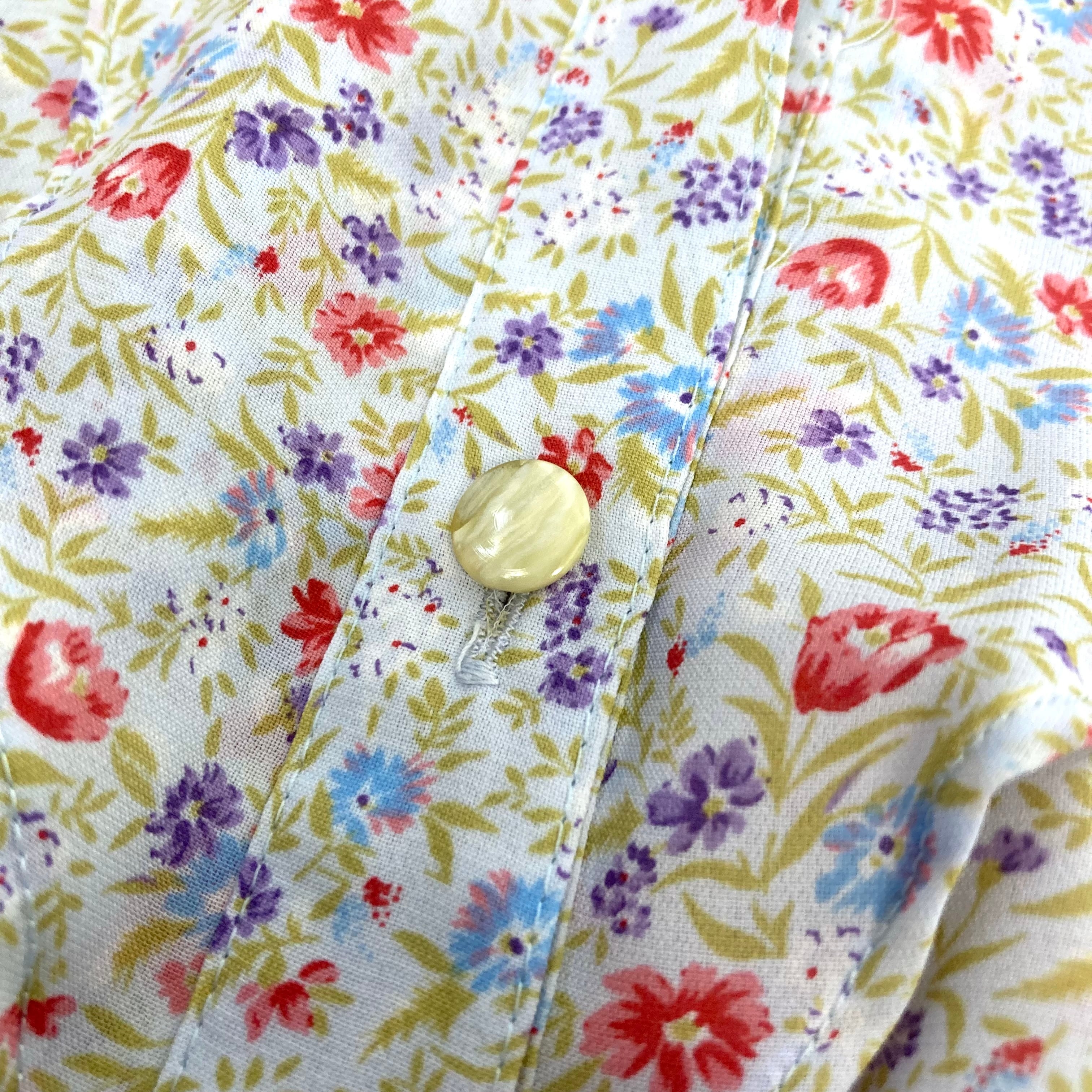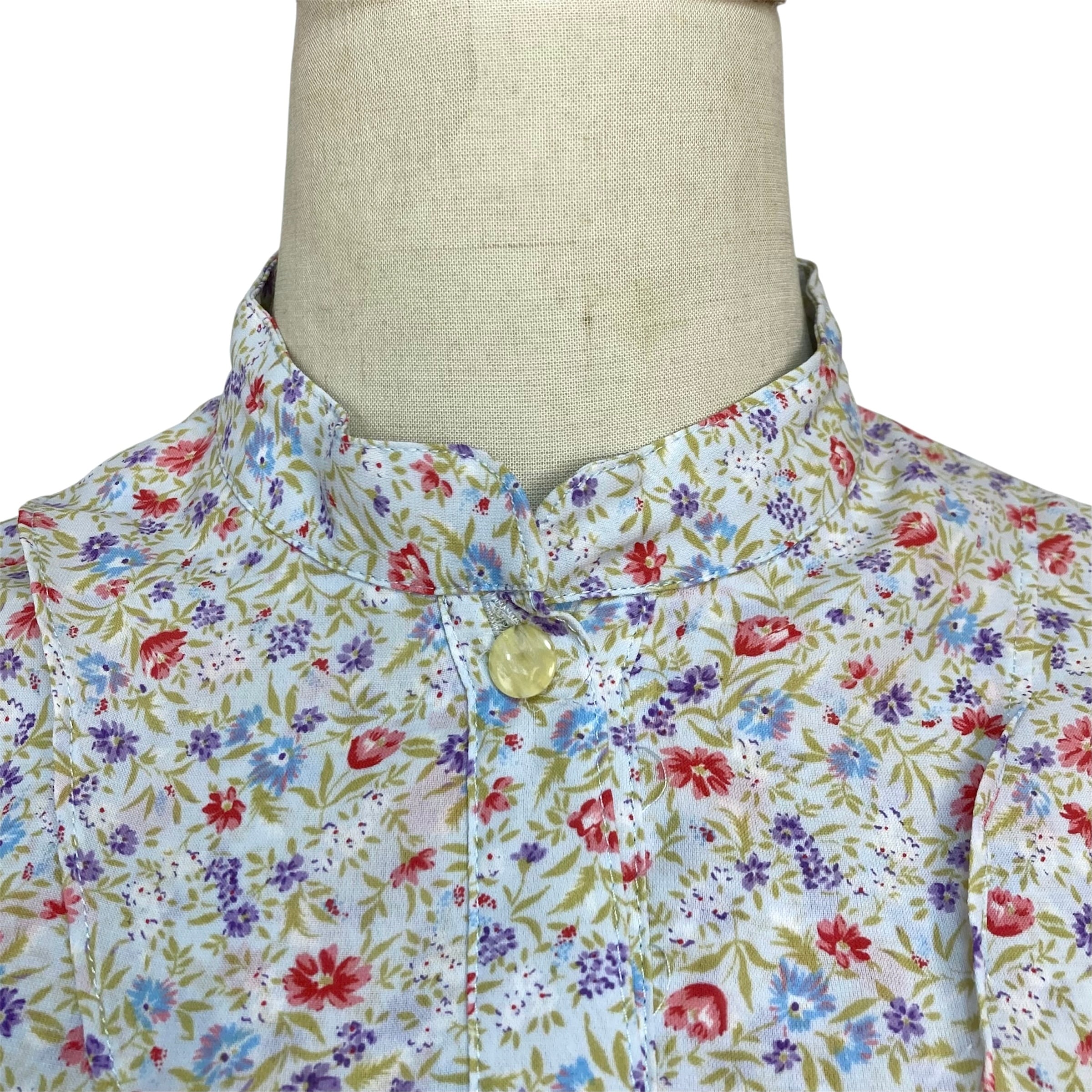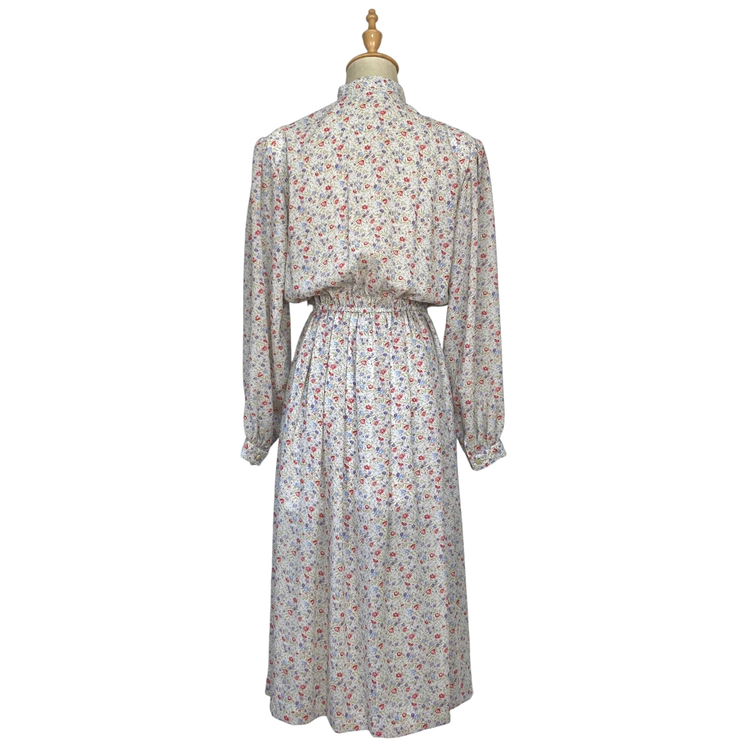 スタンドカラー、フロントにティアードデザインのゆるやかなフリルの総柄レトロワンピース