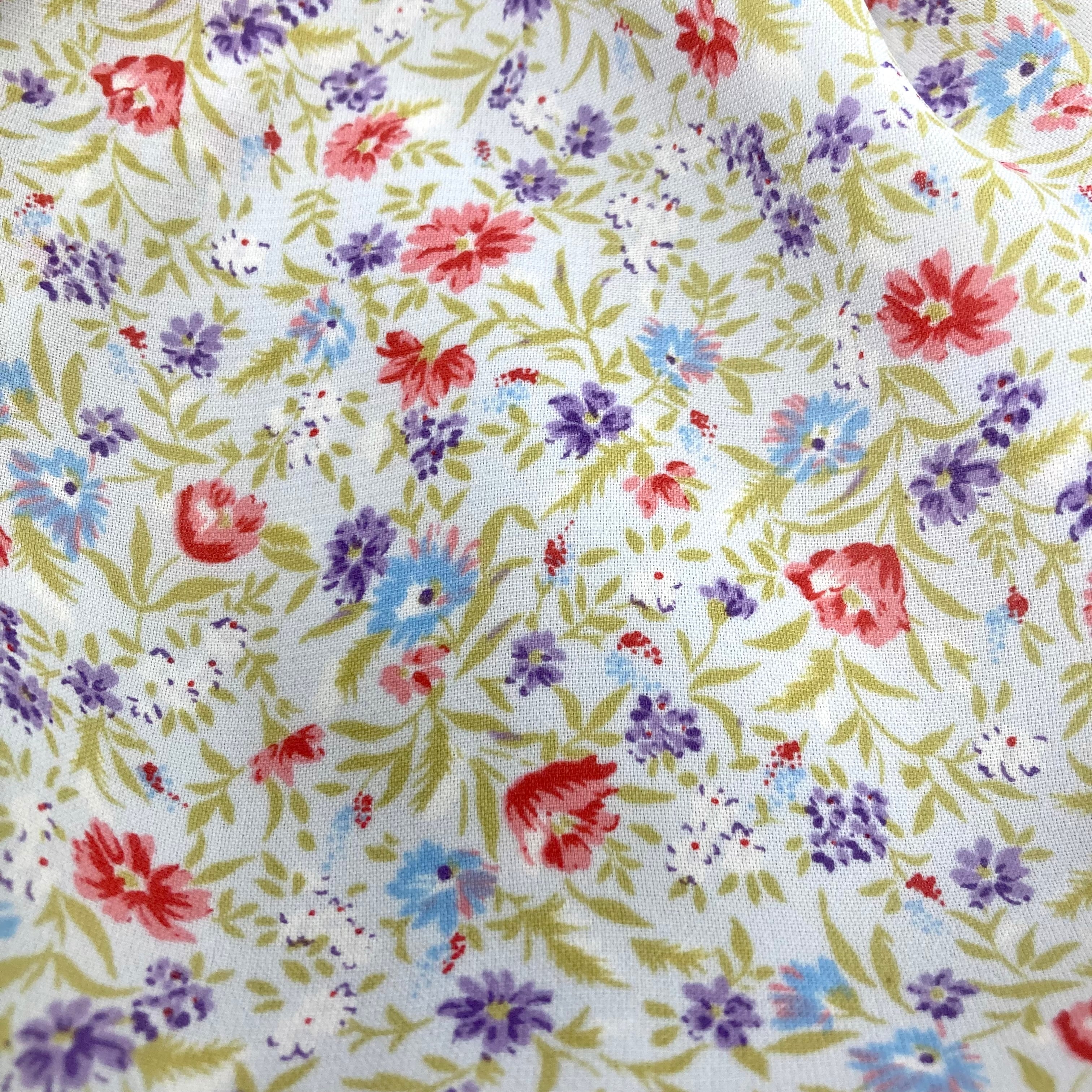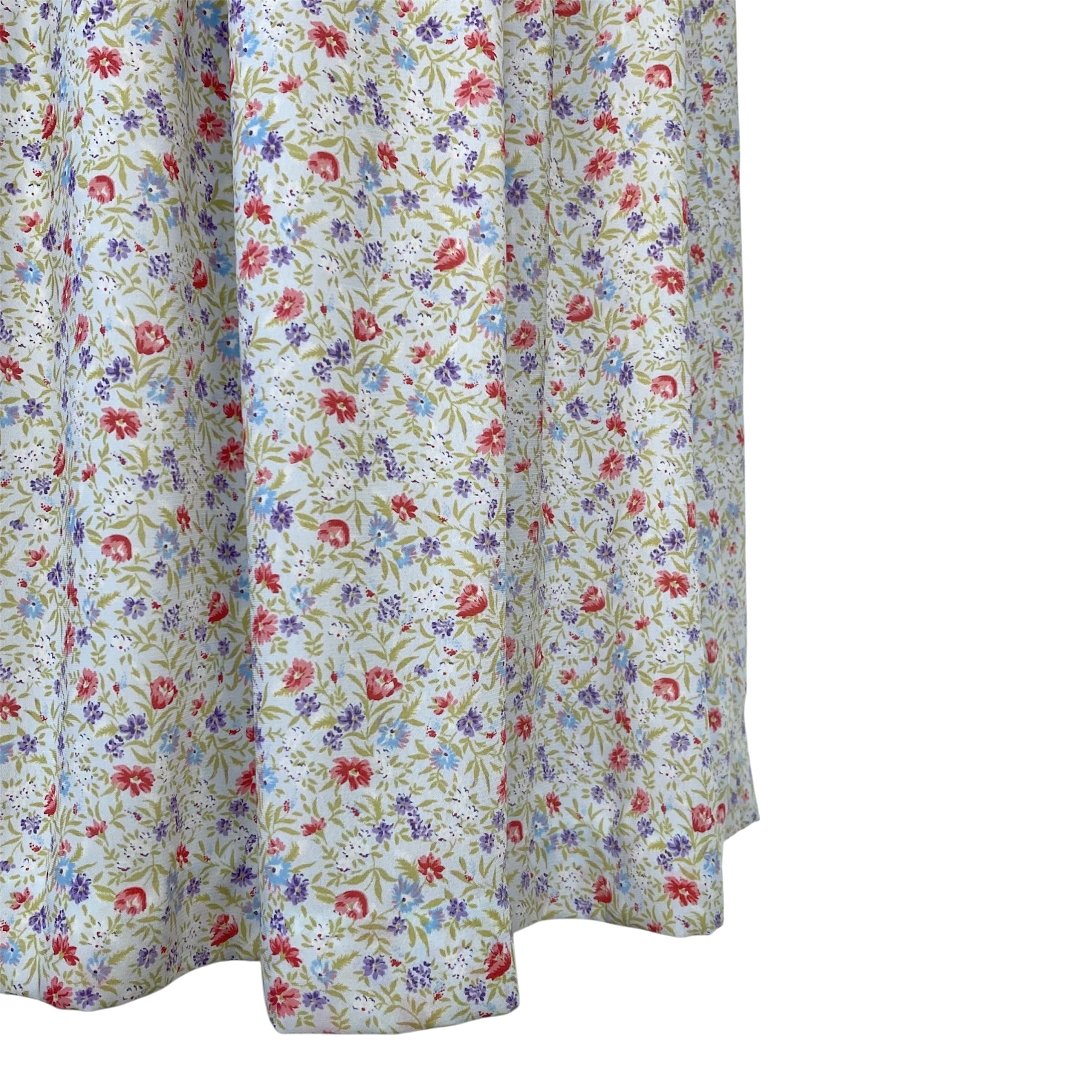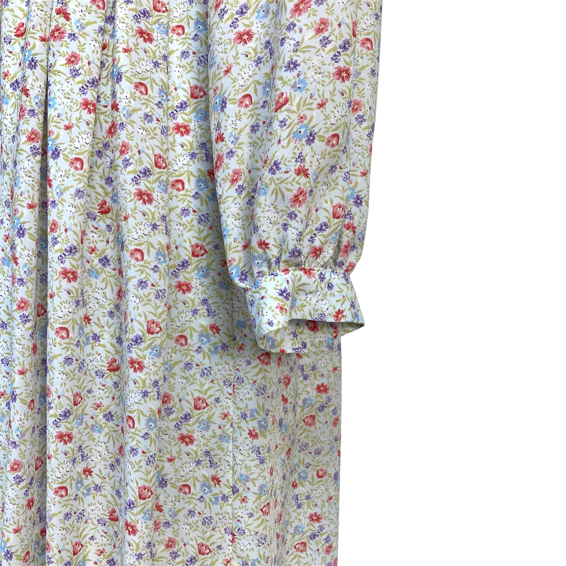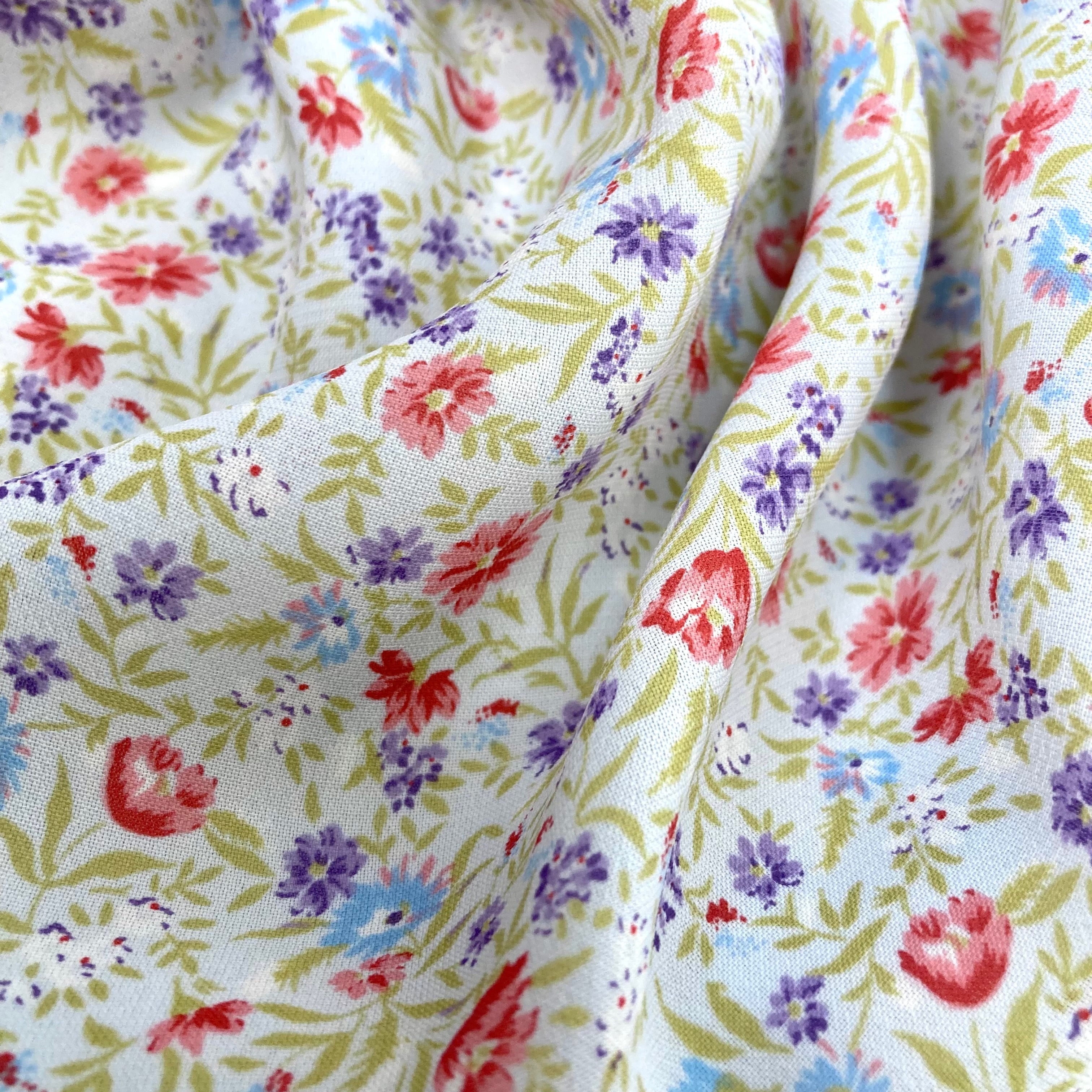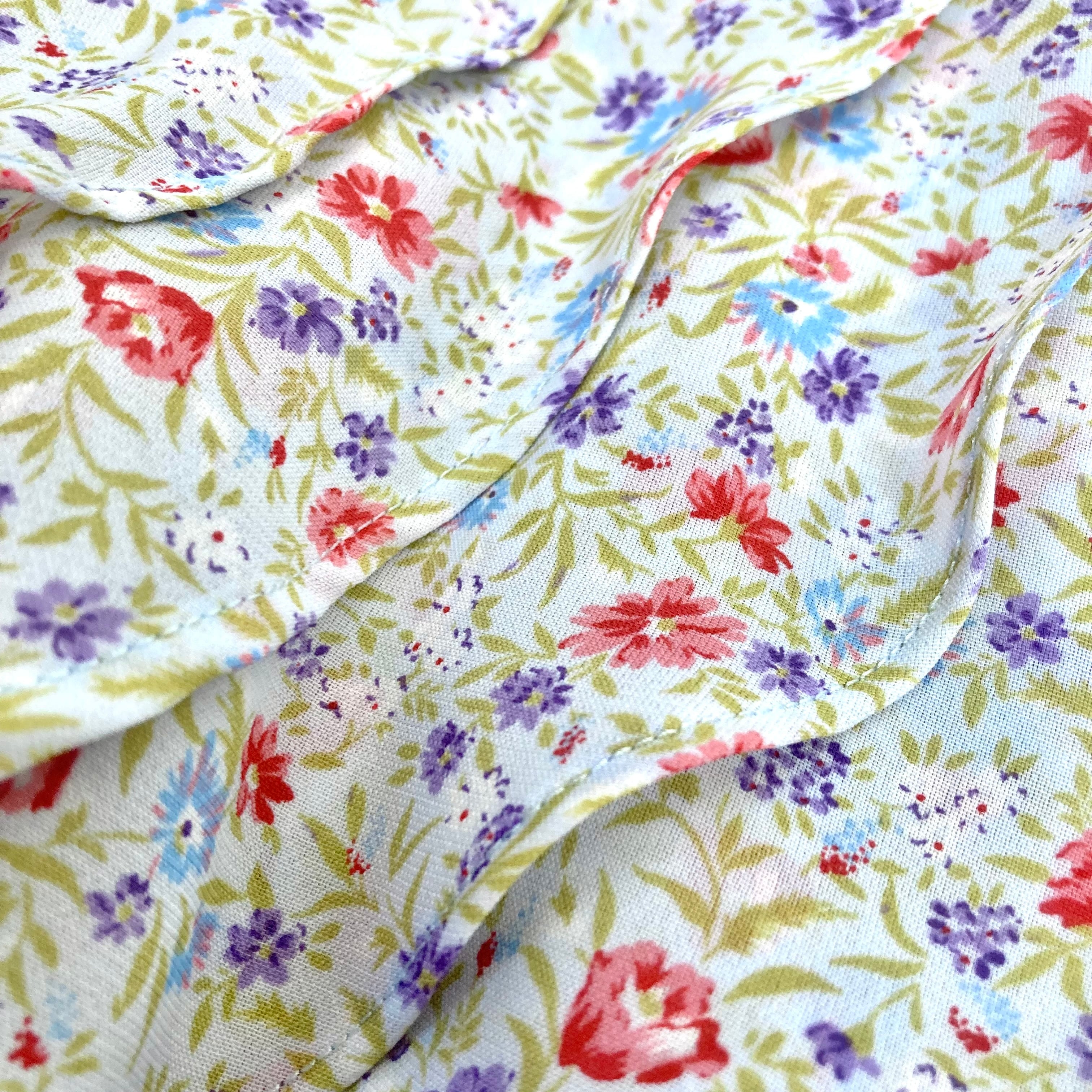 ごく淡い灰みがかった水色に色とりどりの花と植物柄の透け感あるテキスタイル