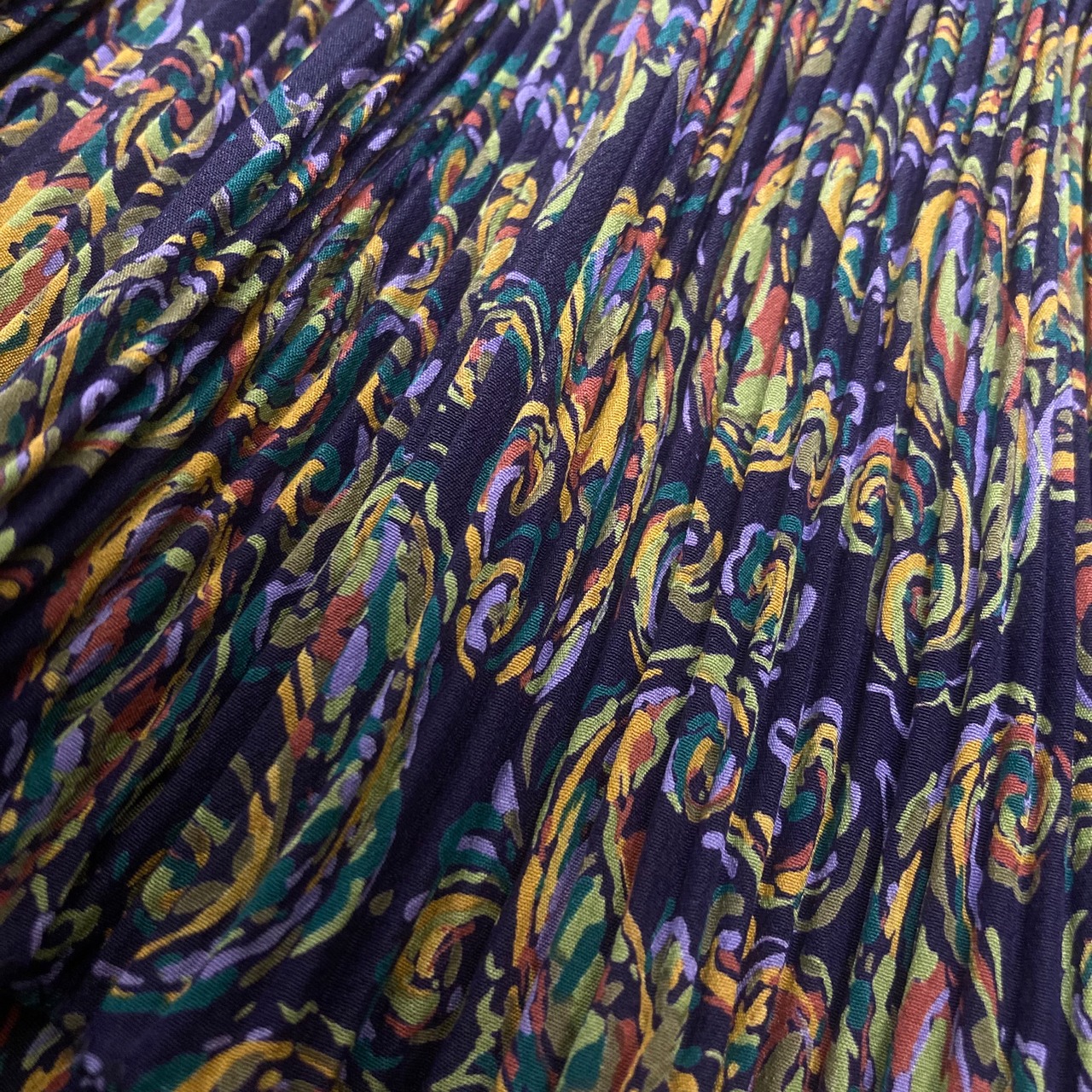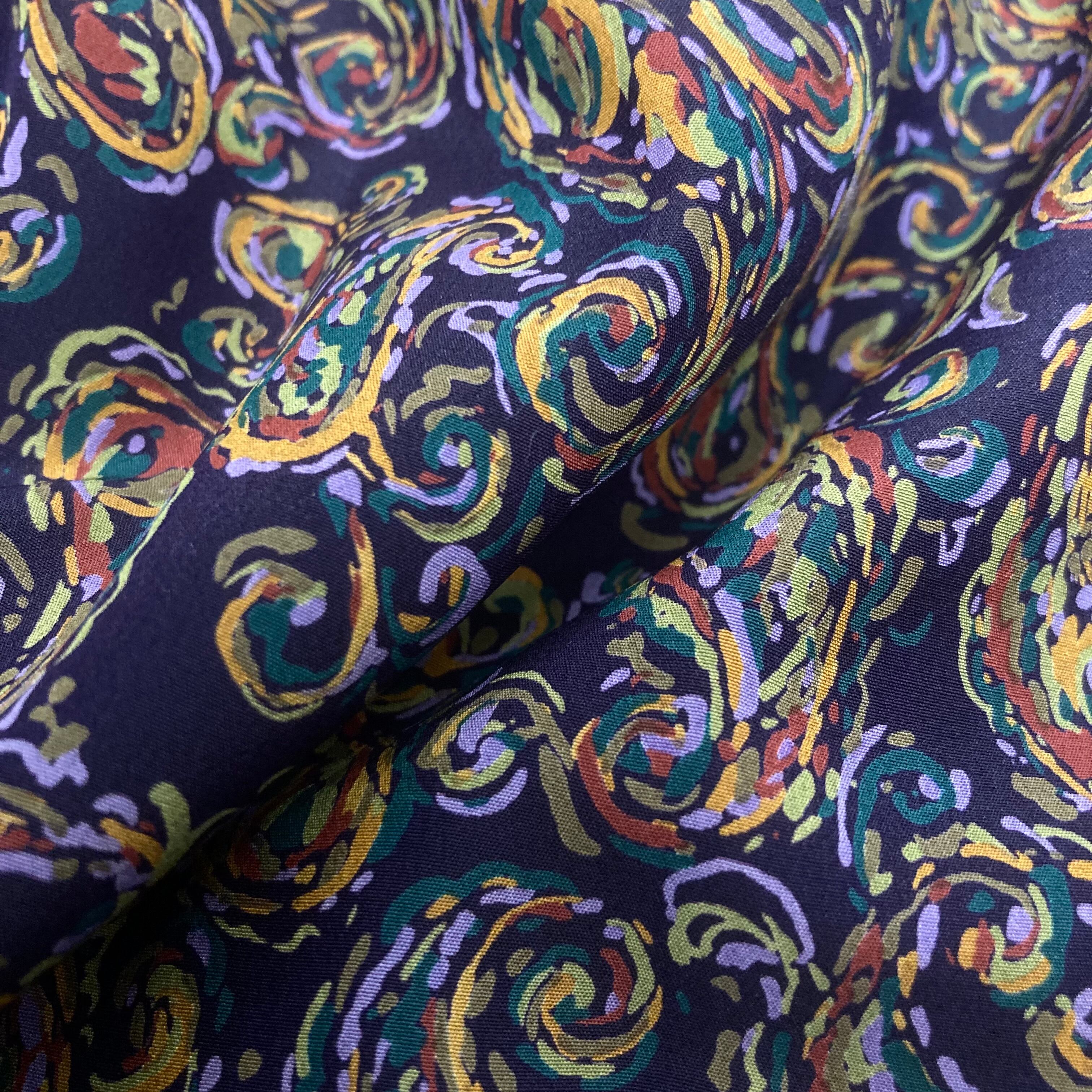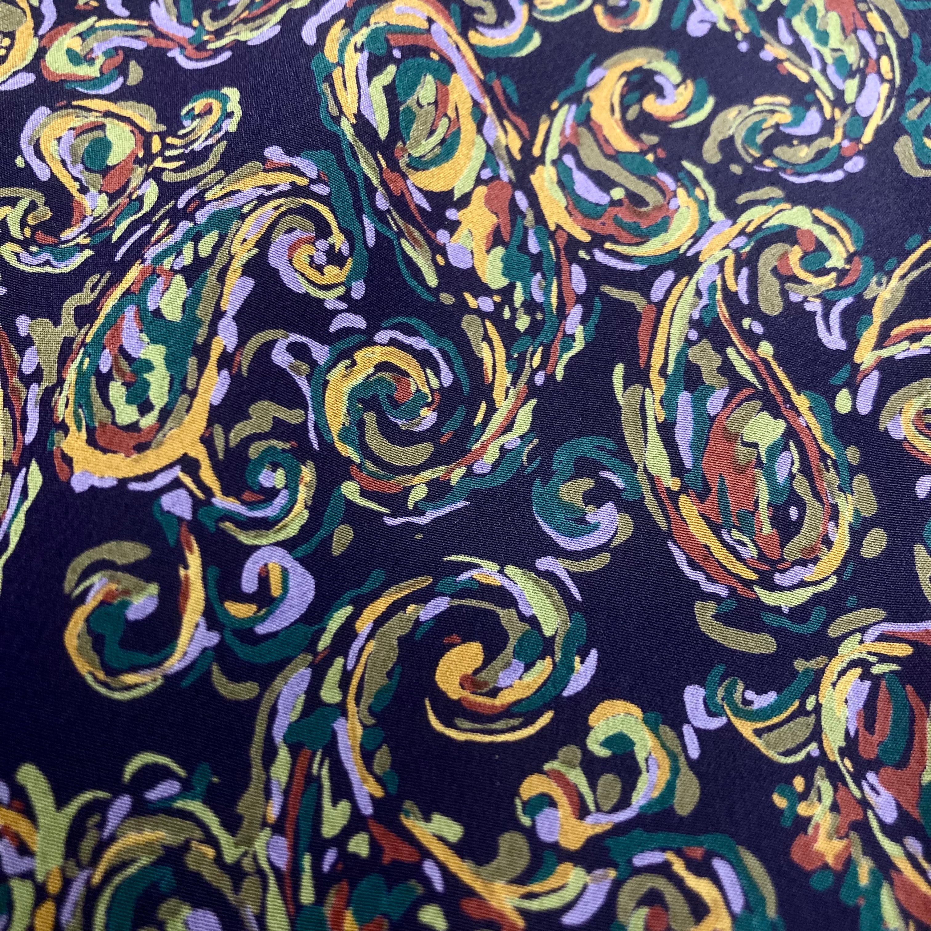 濃い紫色地にゴッホの筆致のような渦巻くペイズリー柄が特徴のテキスタイル