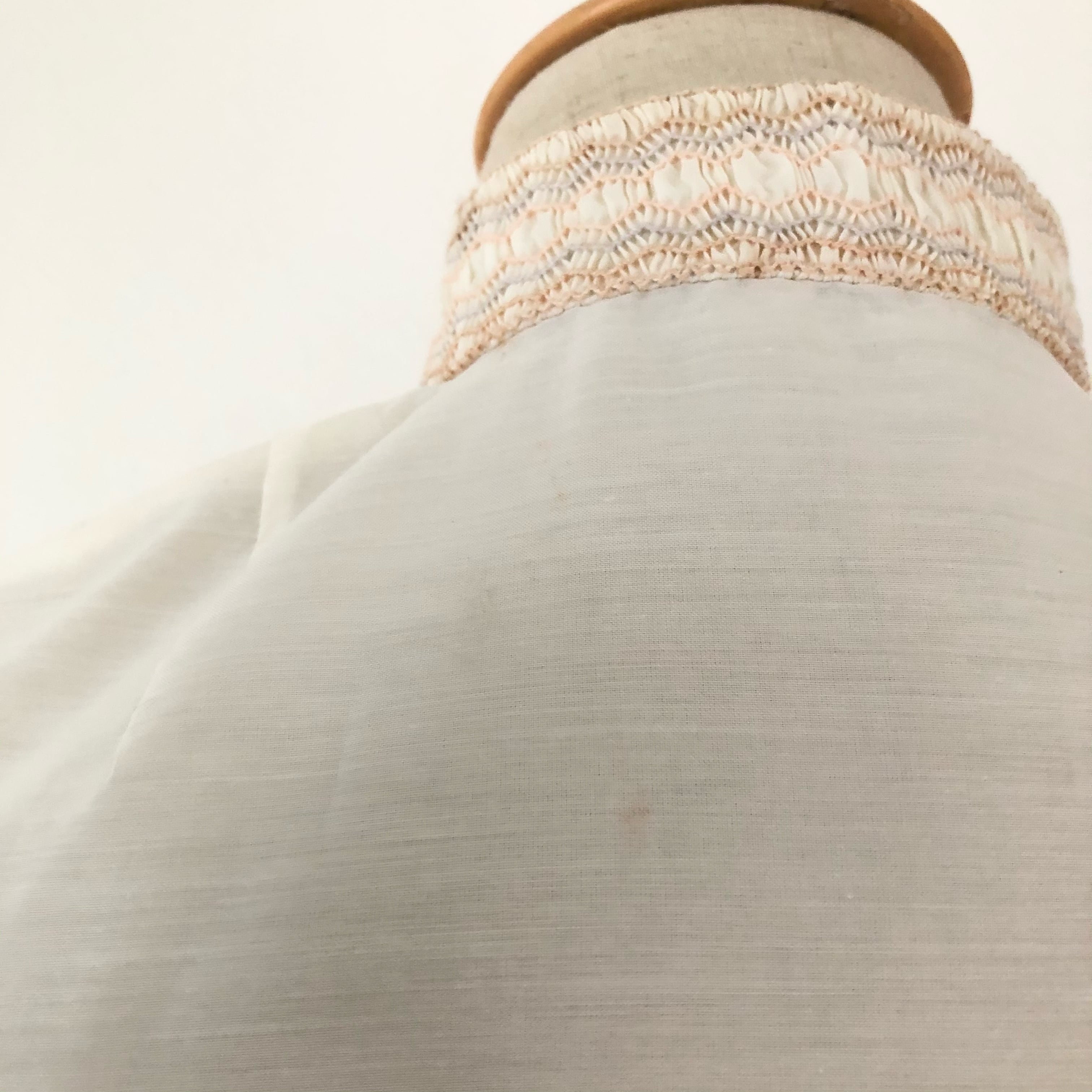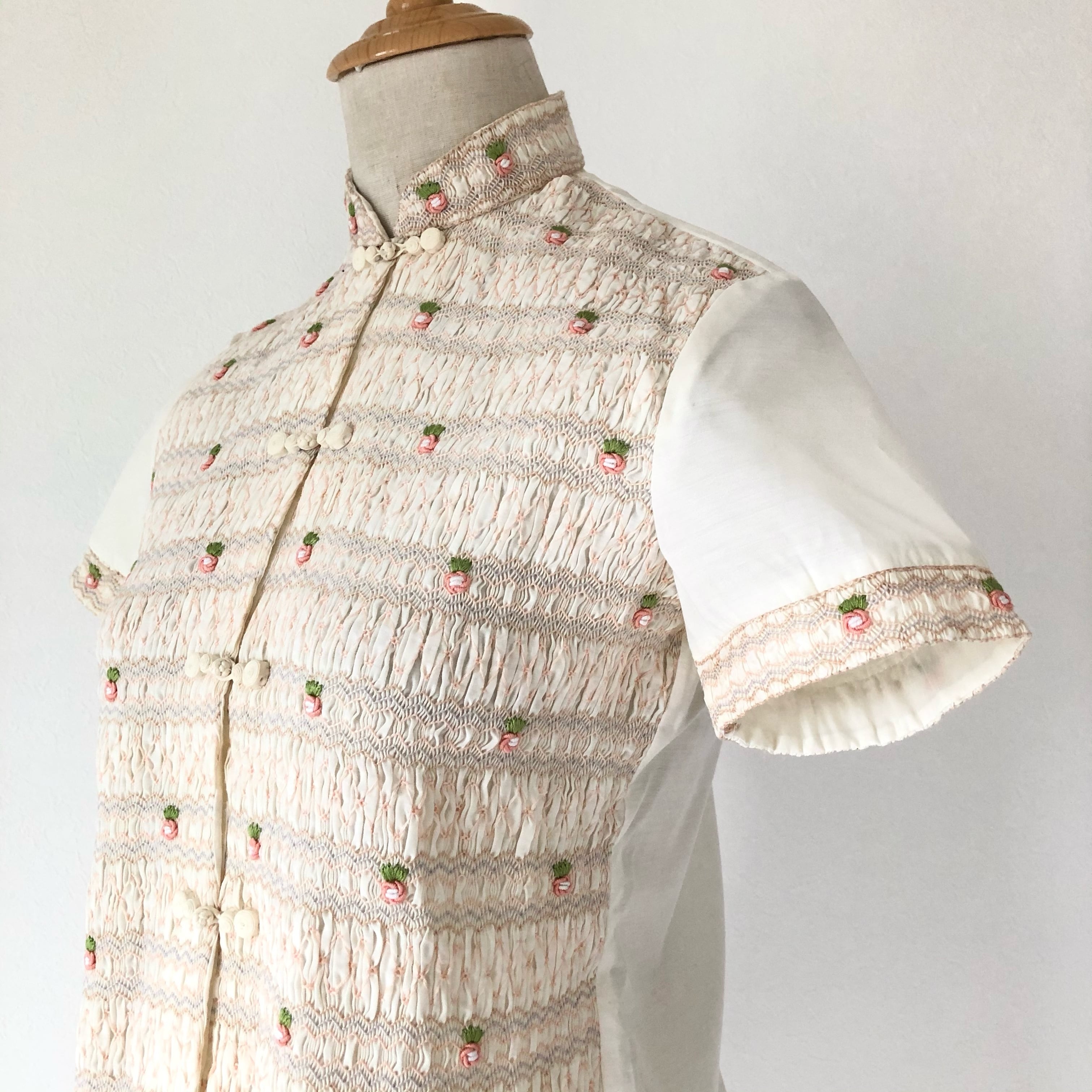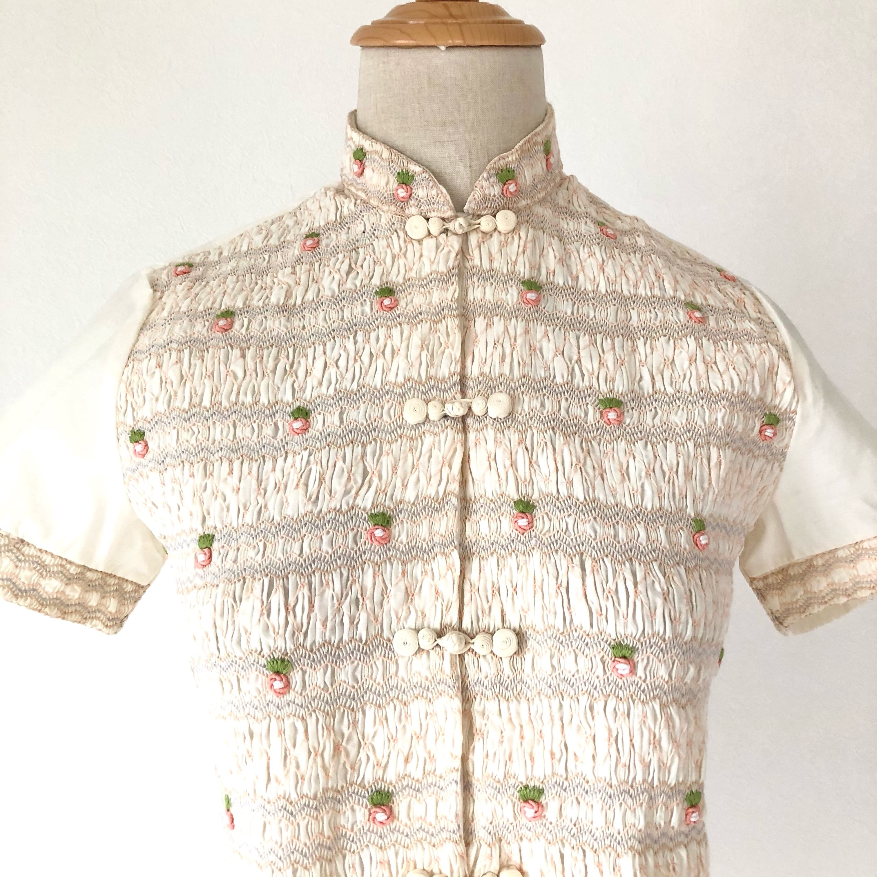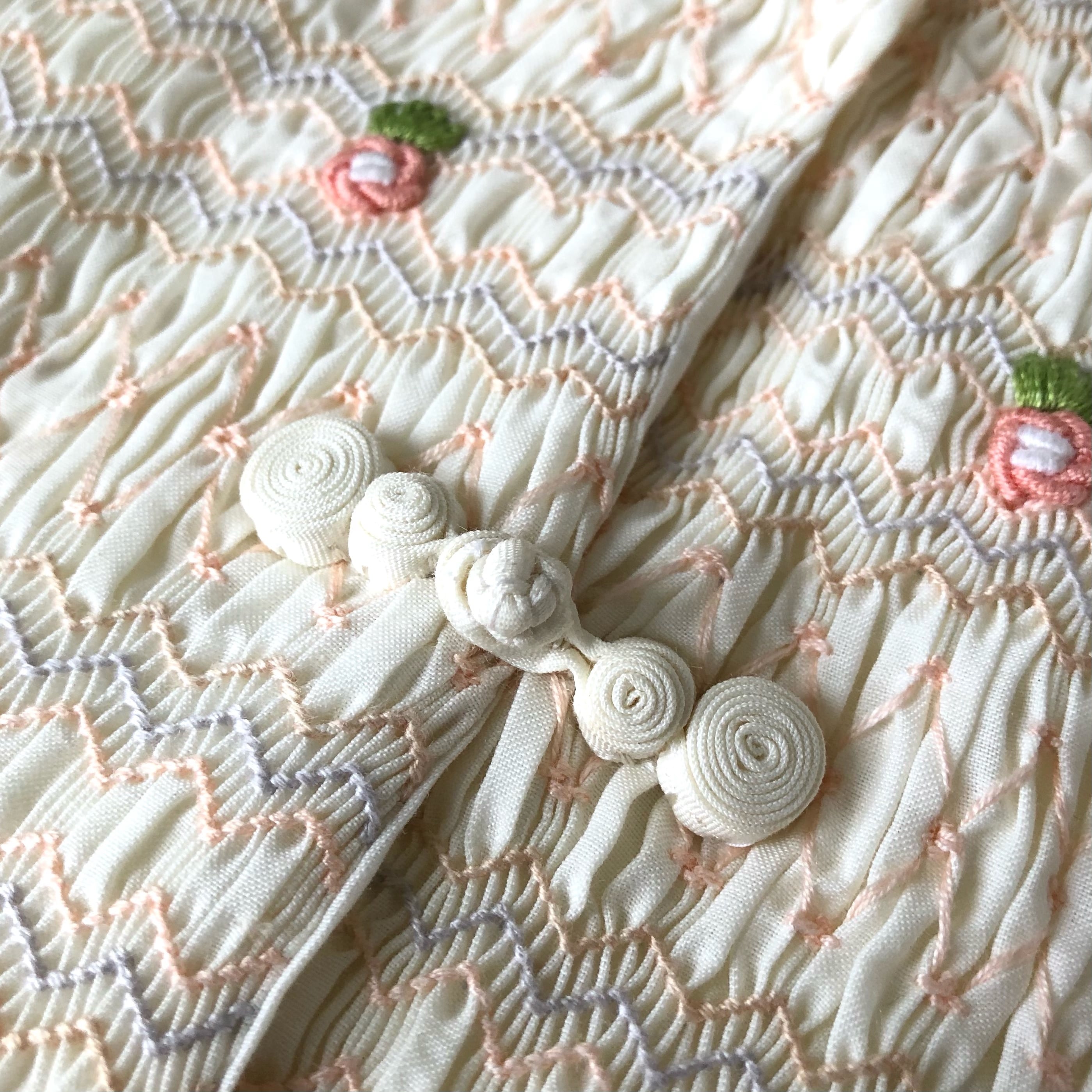 ベージュ地にシャーリングと淡いピンク基調の刺繍のあるテキスタイル