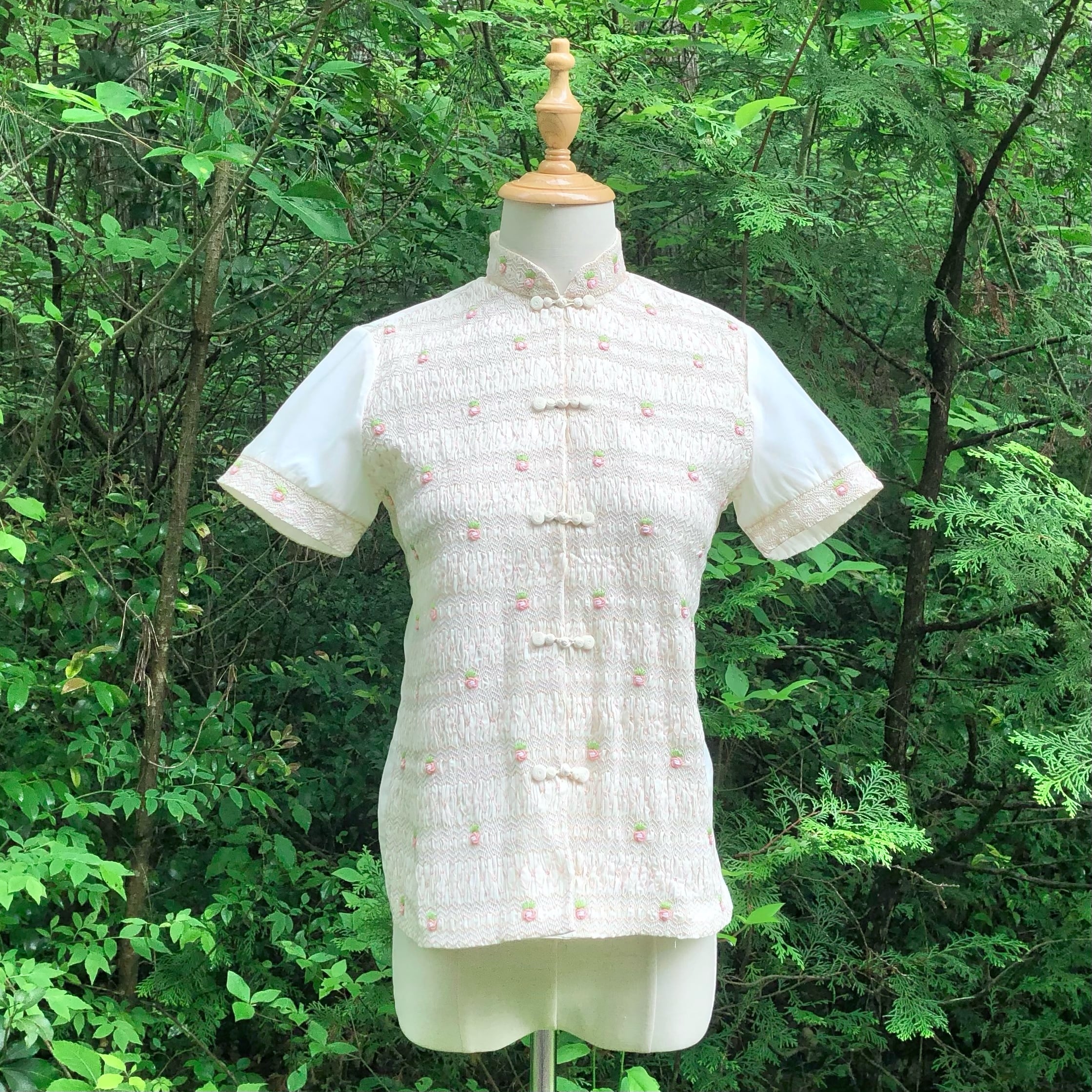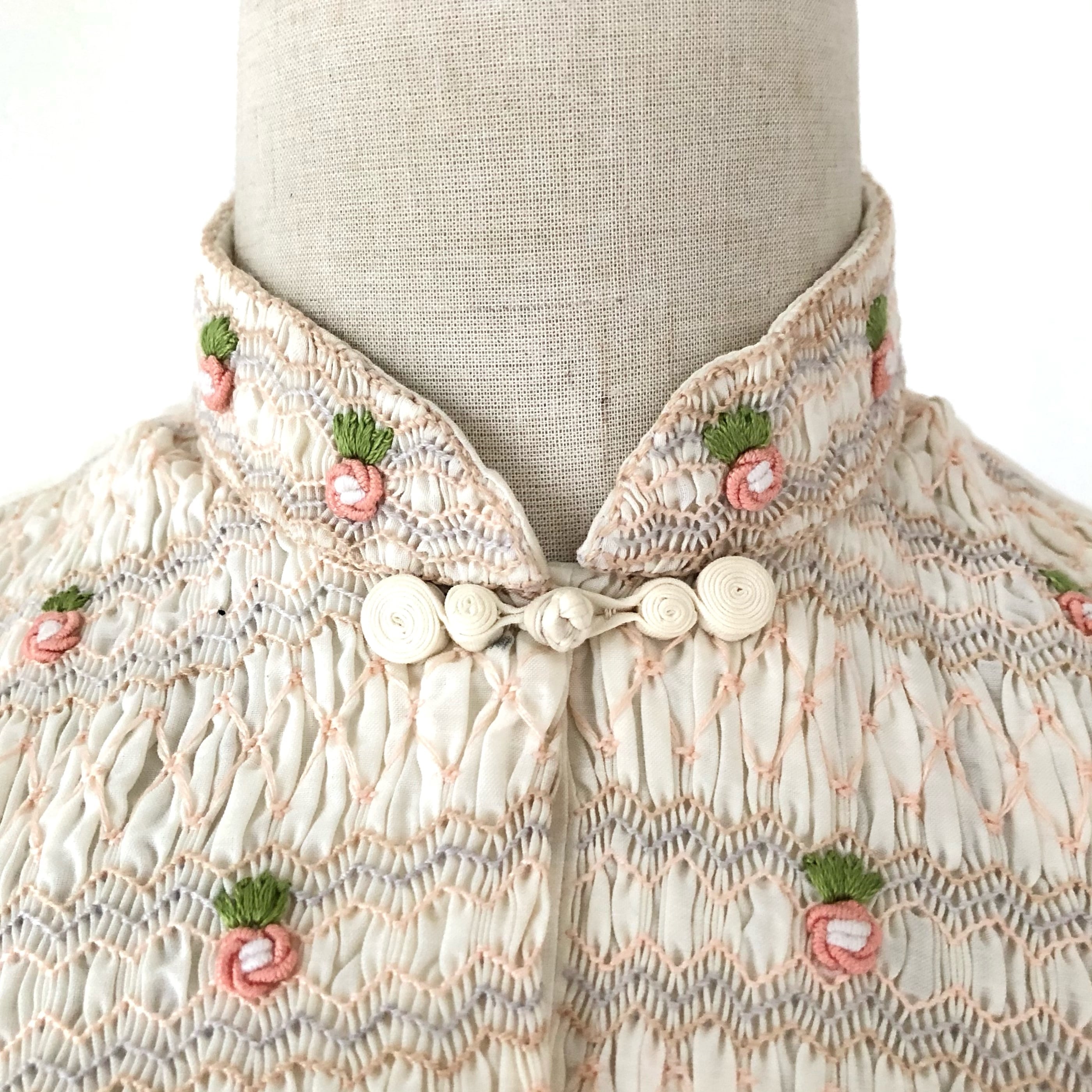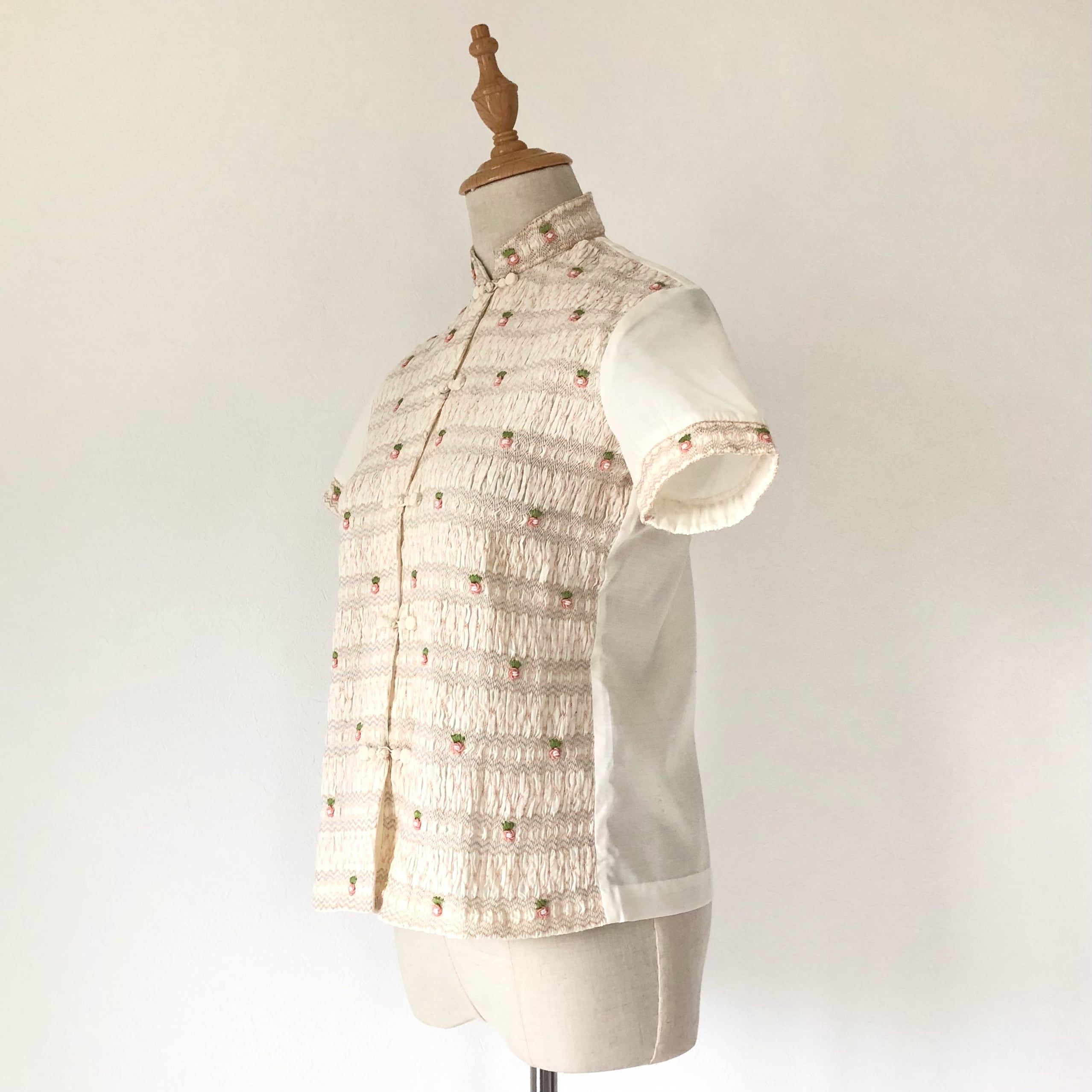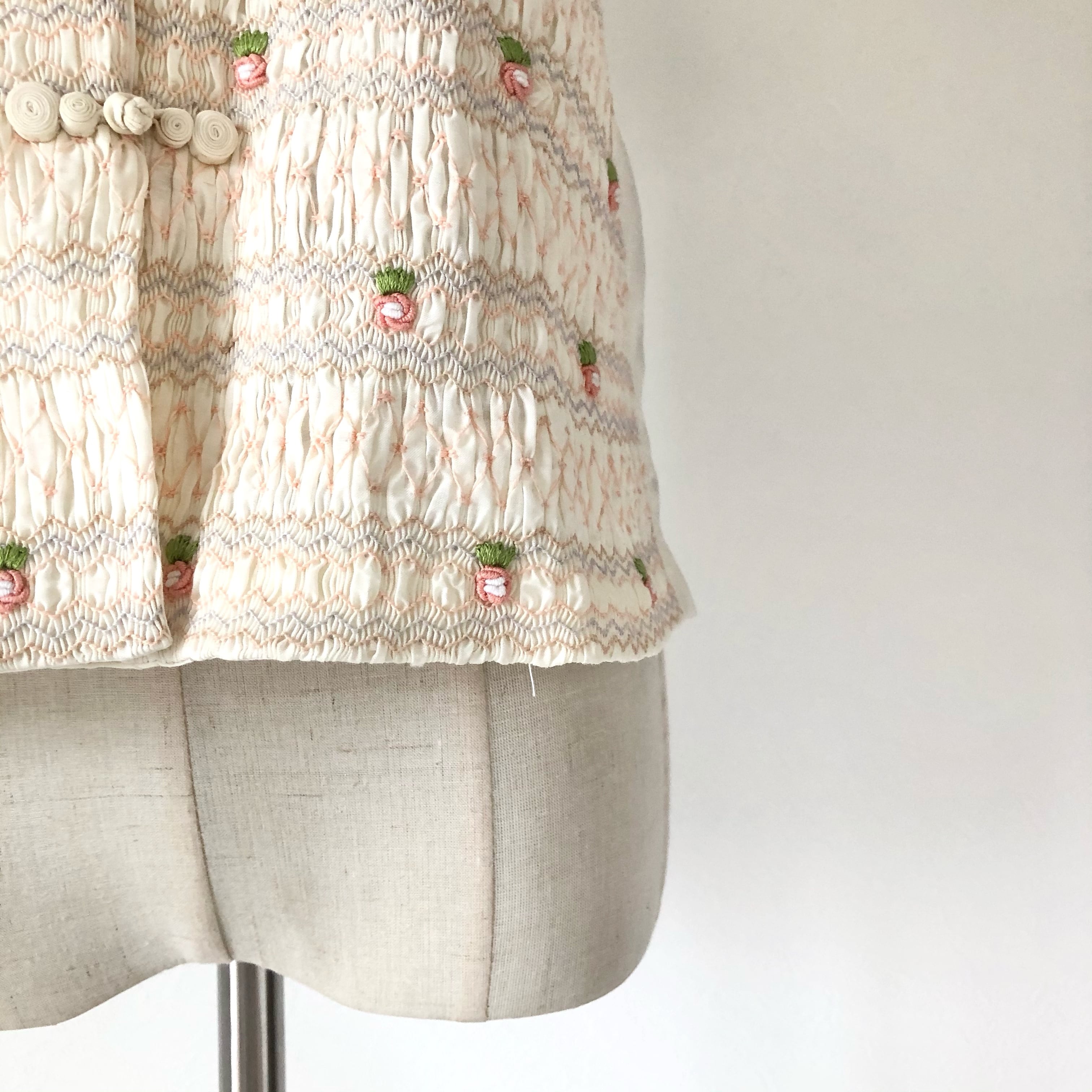 ベージュ地にシャーリングと淡いピンク基調の刺繍のあるテキスタイル