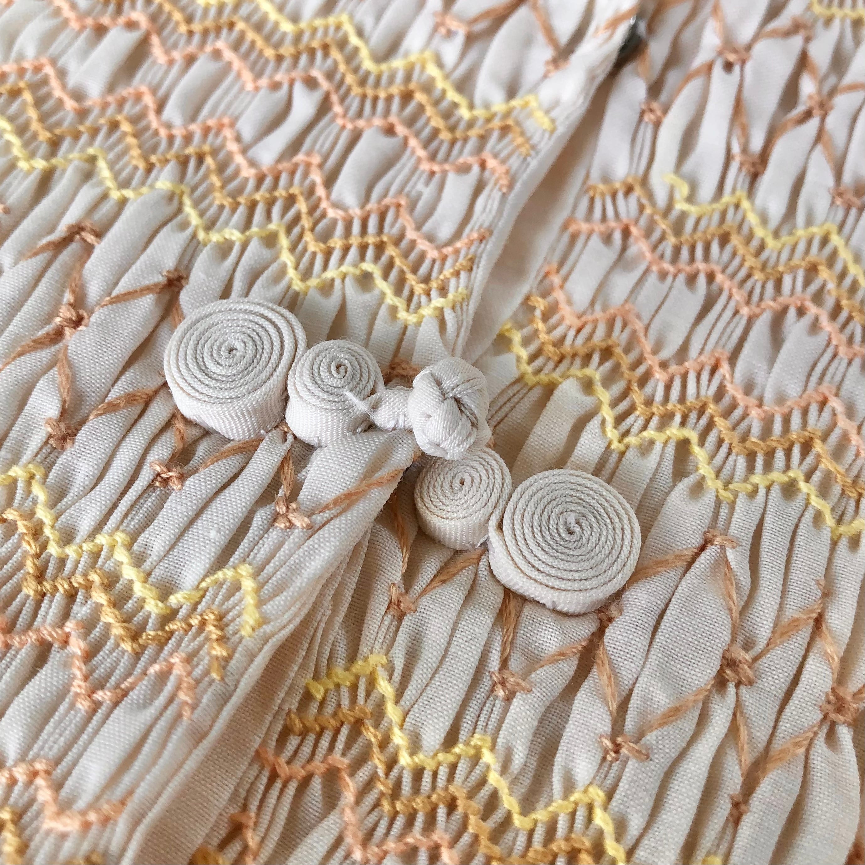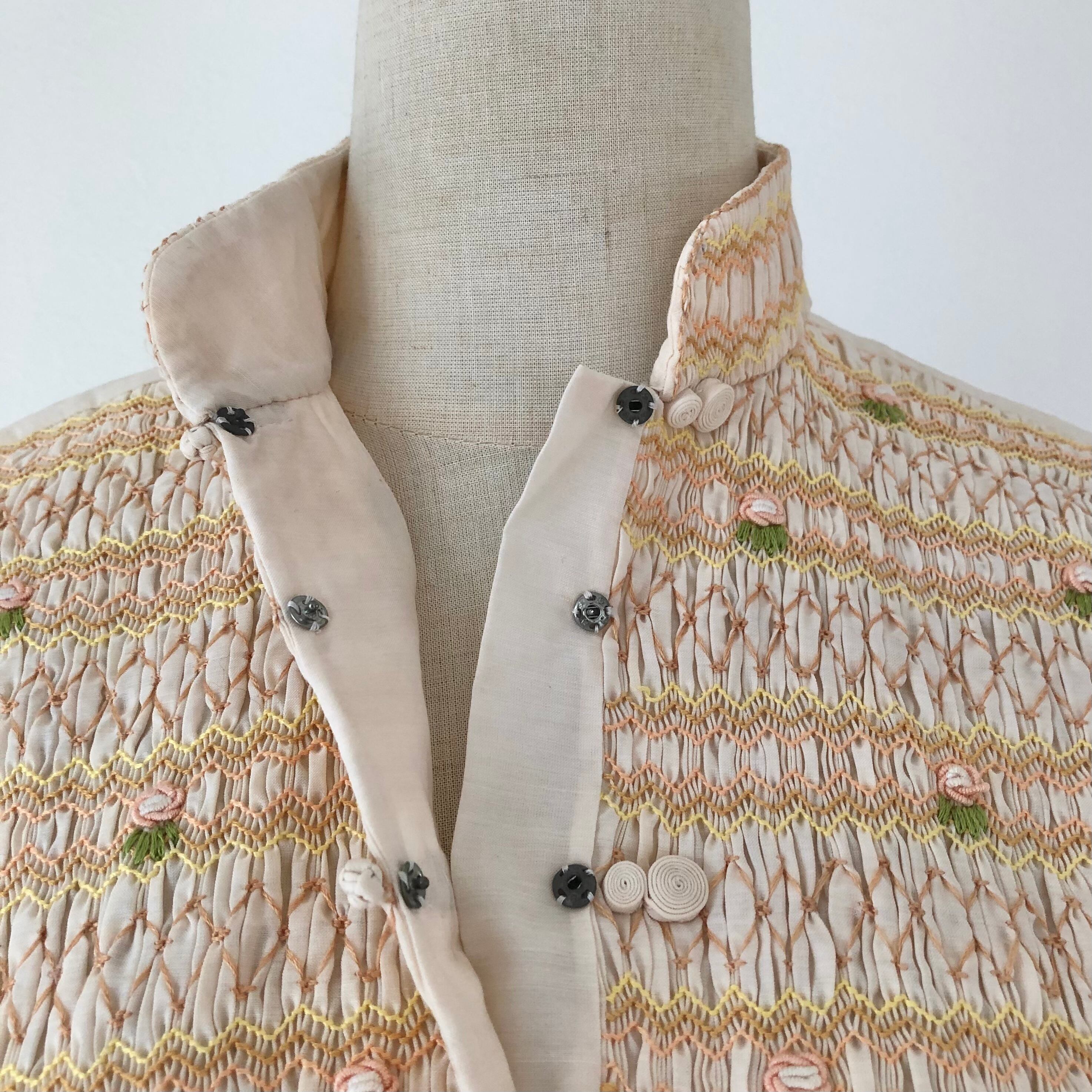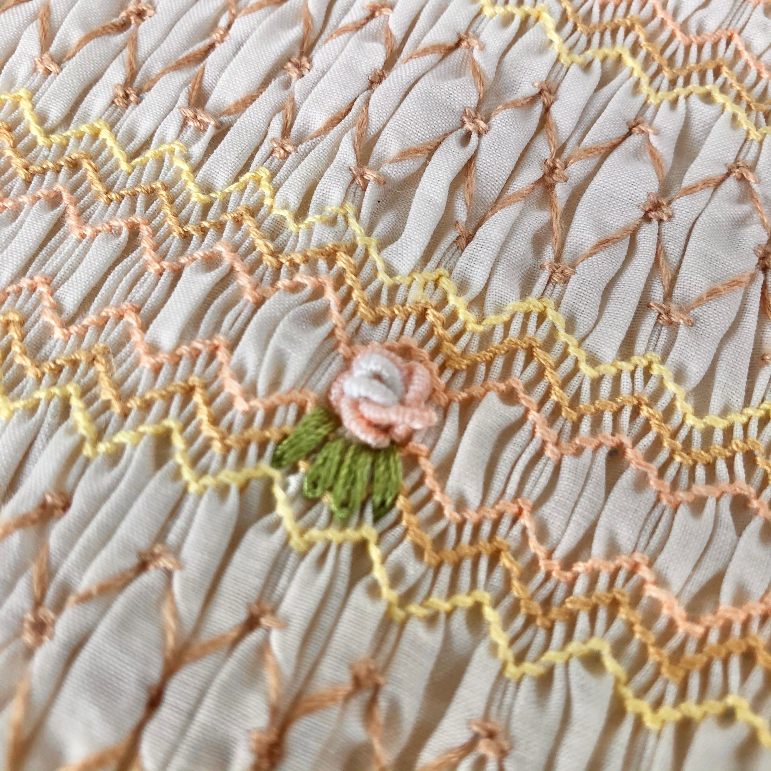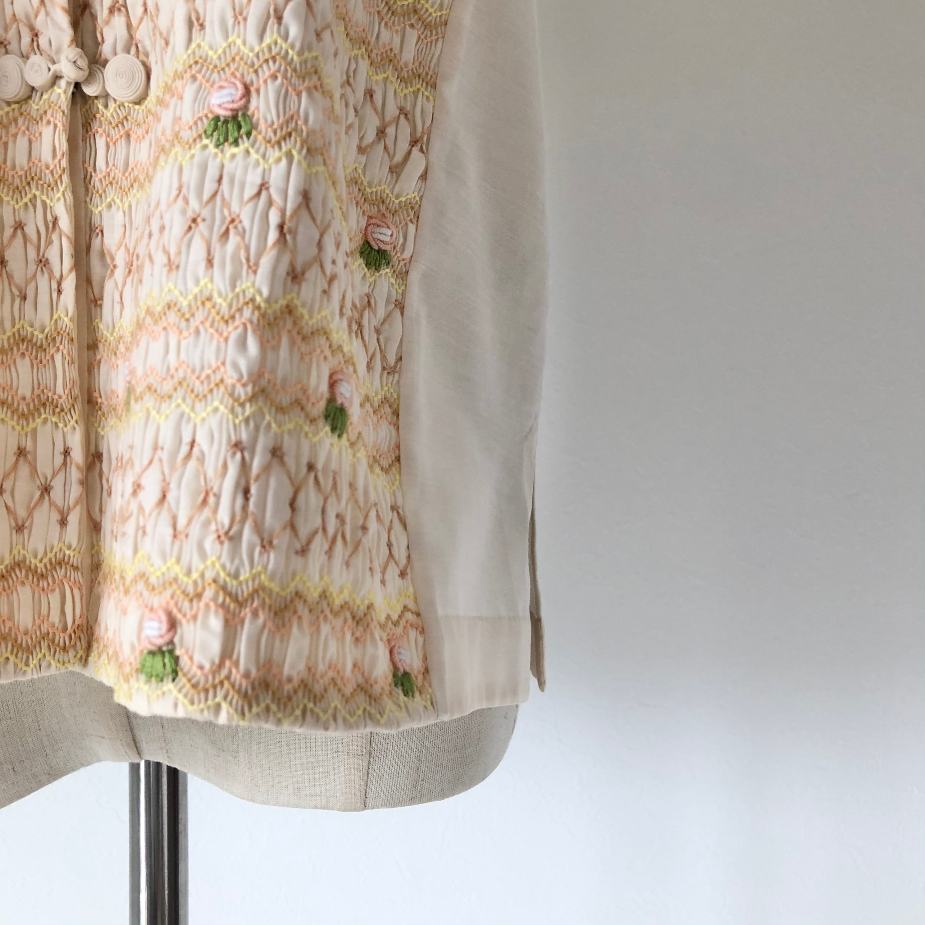 ベージュ地にシャーリングと淡いピンク基調の刺繍のあるテキスタイル
