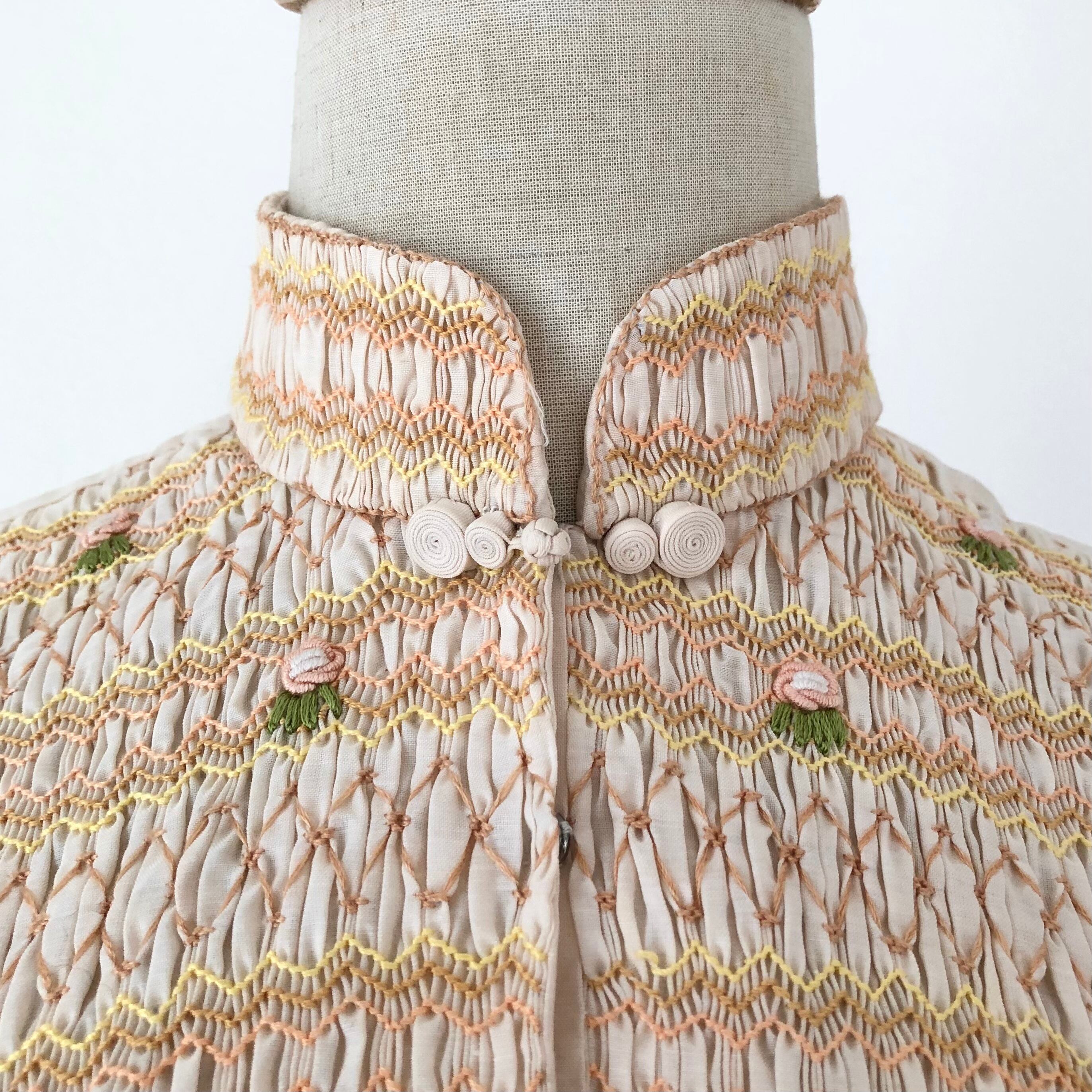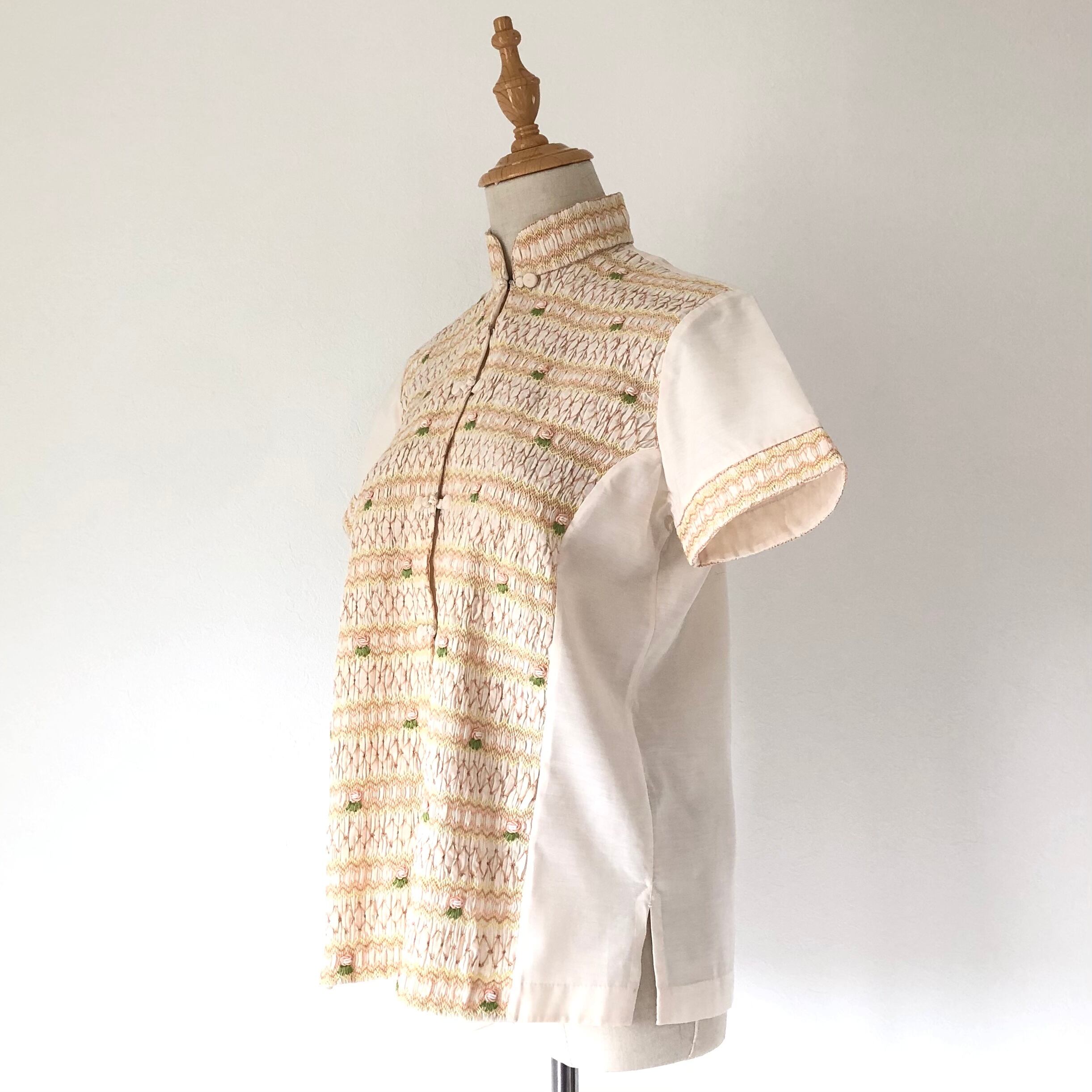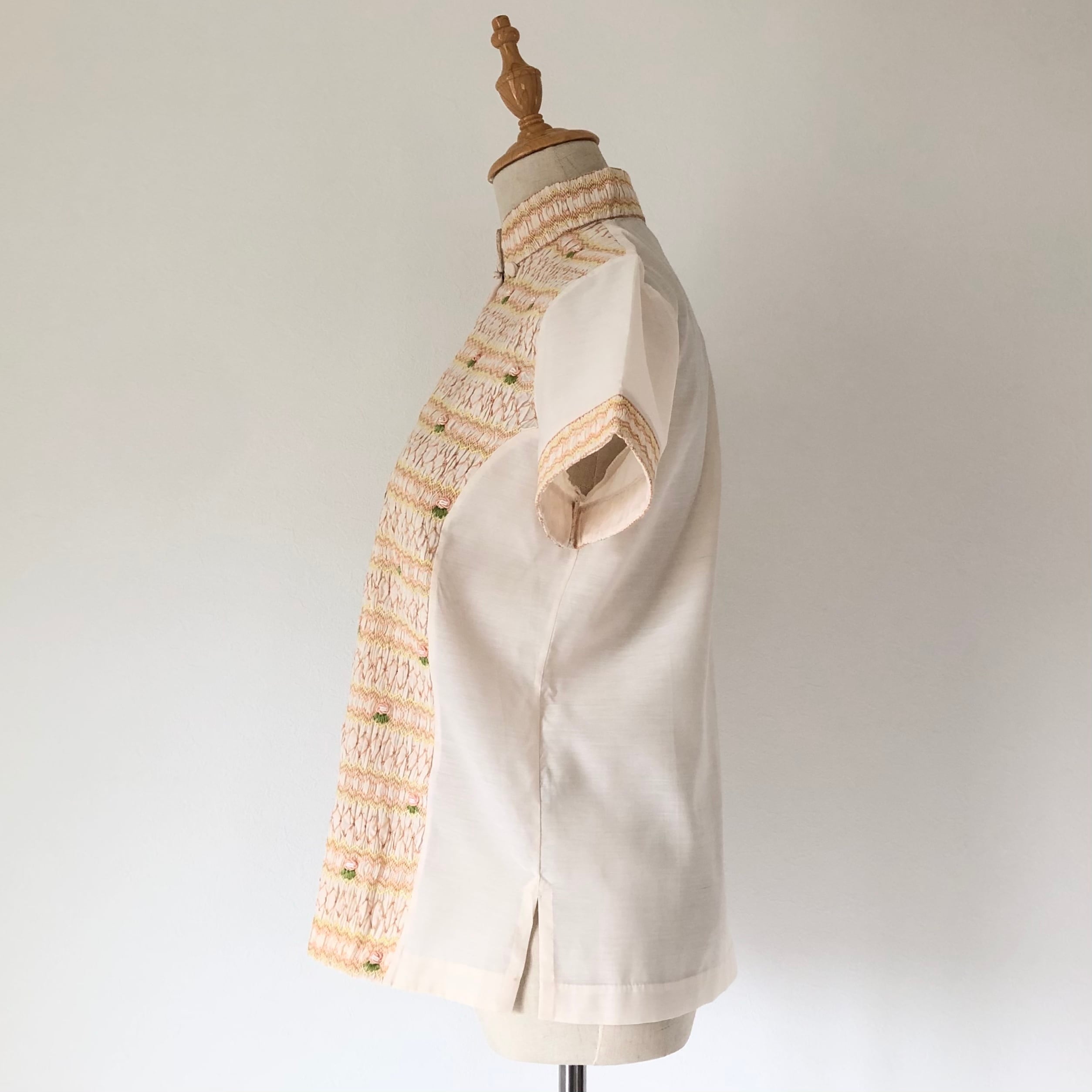ベージュ地にシャーリングと淡いピンク基調の刺繍のあるテキスタイル