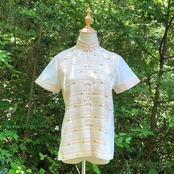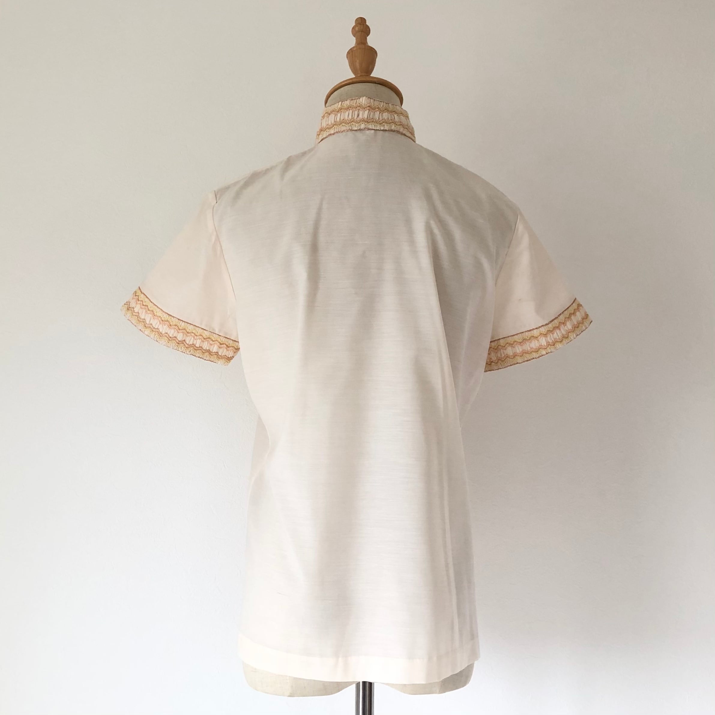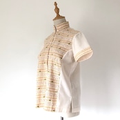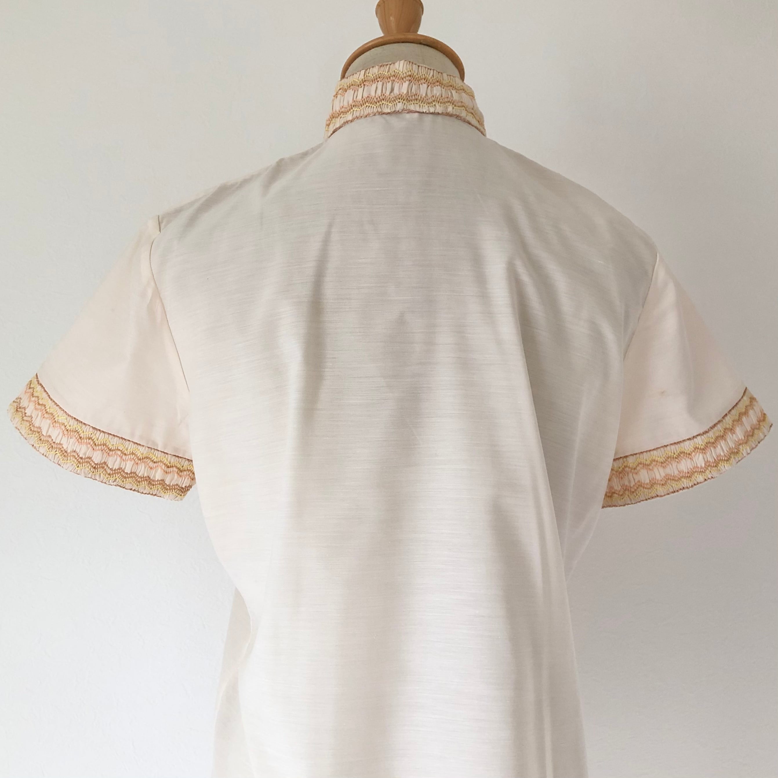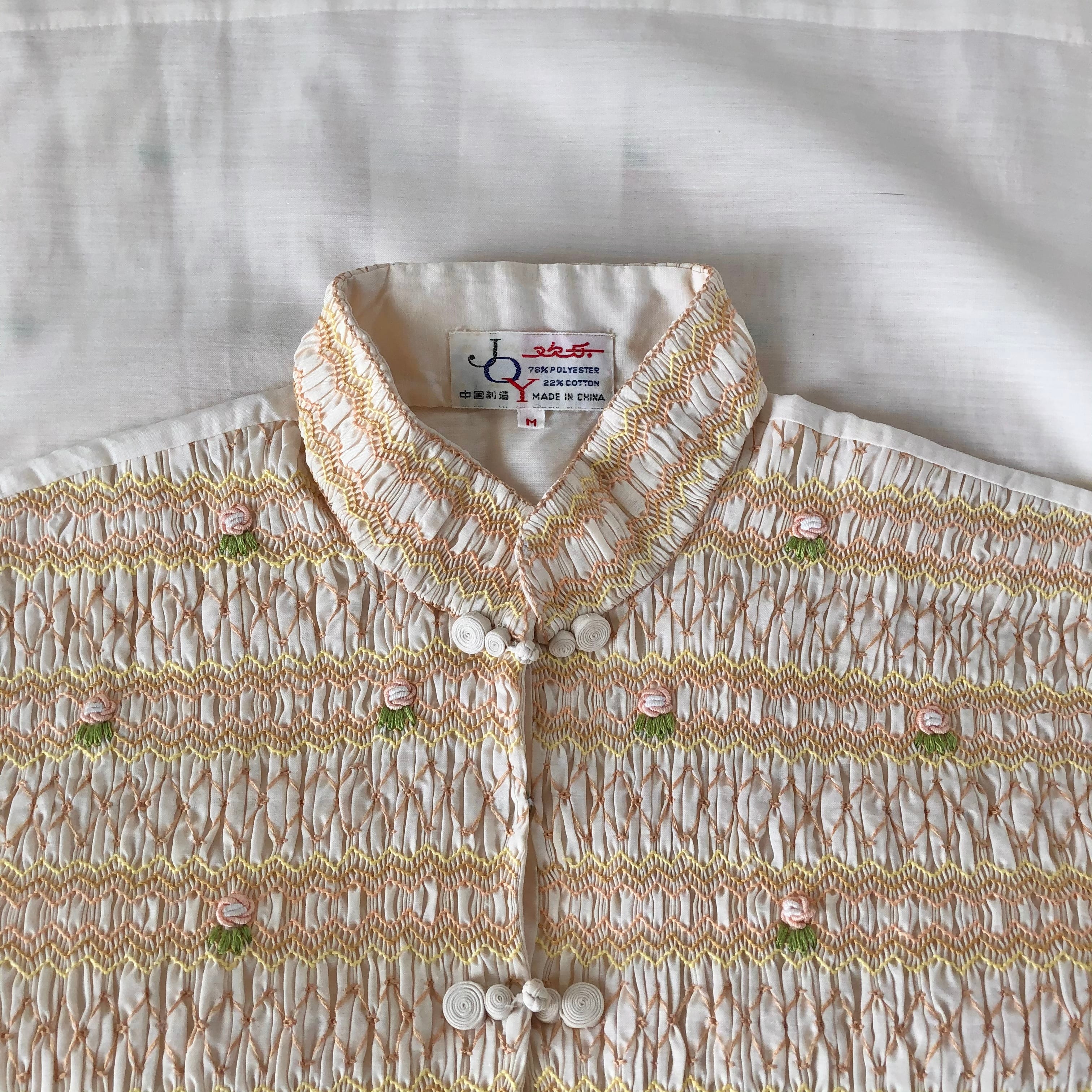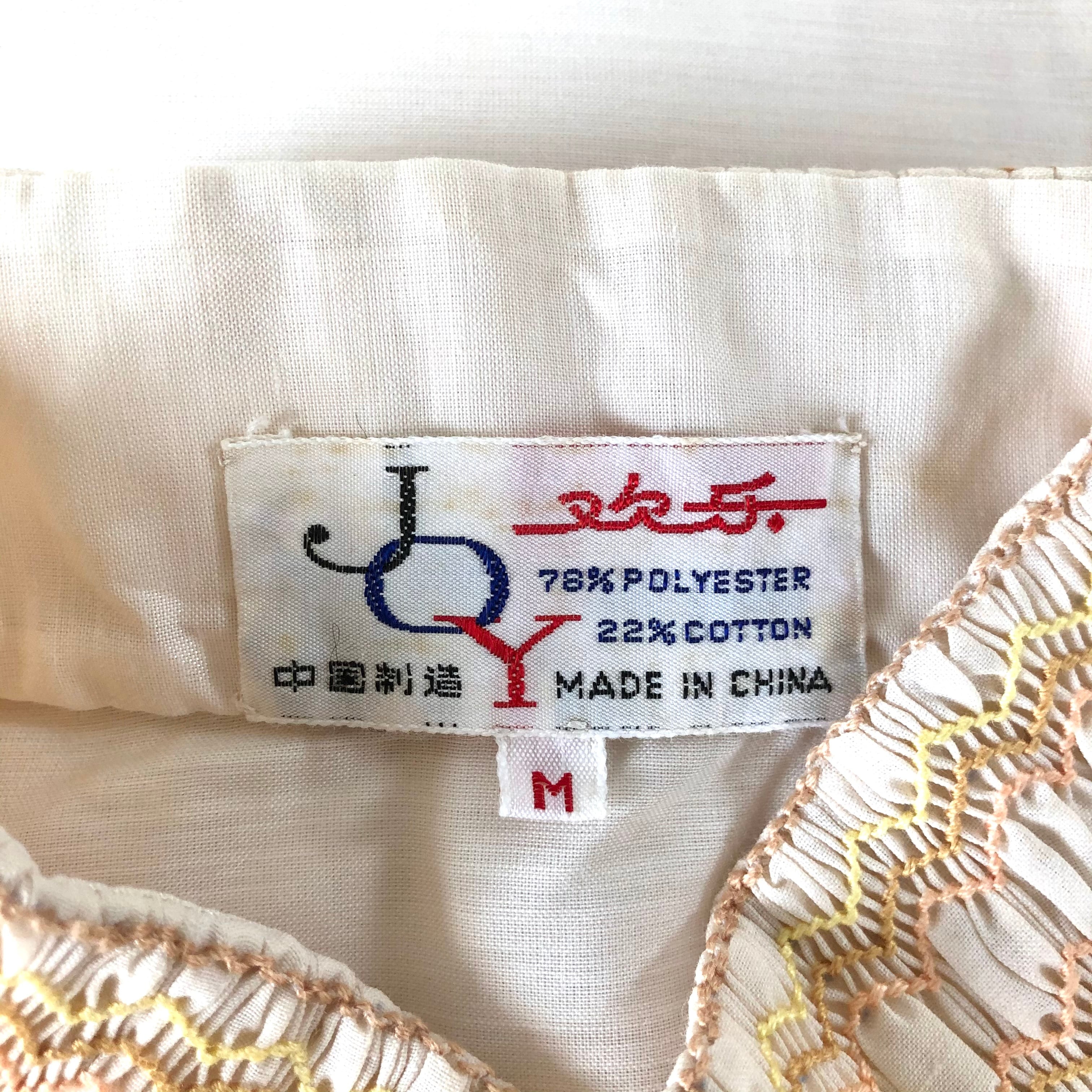 ベージュ地にシャーリングと淡いピンク基調の刺繍のあるテキスタイル