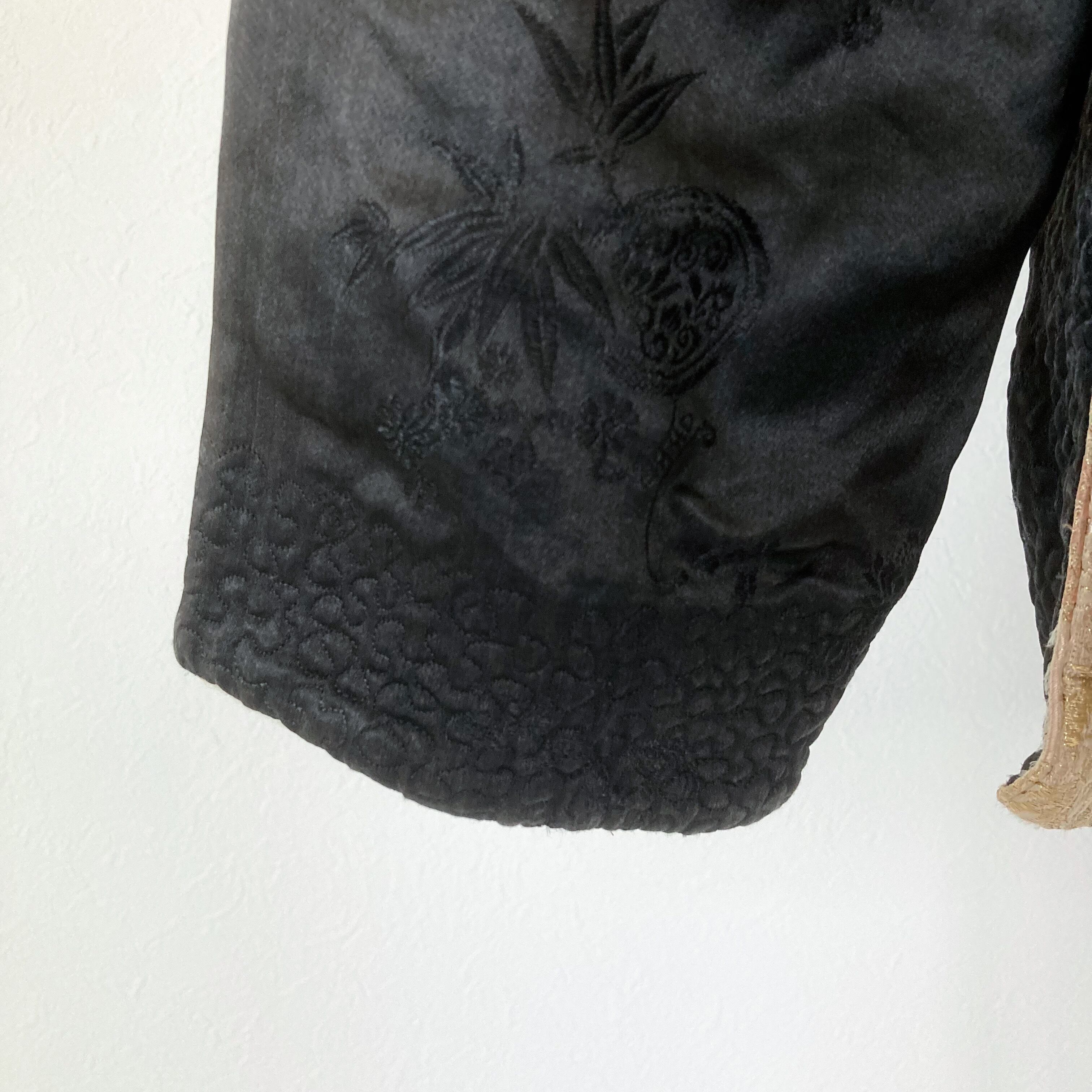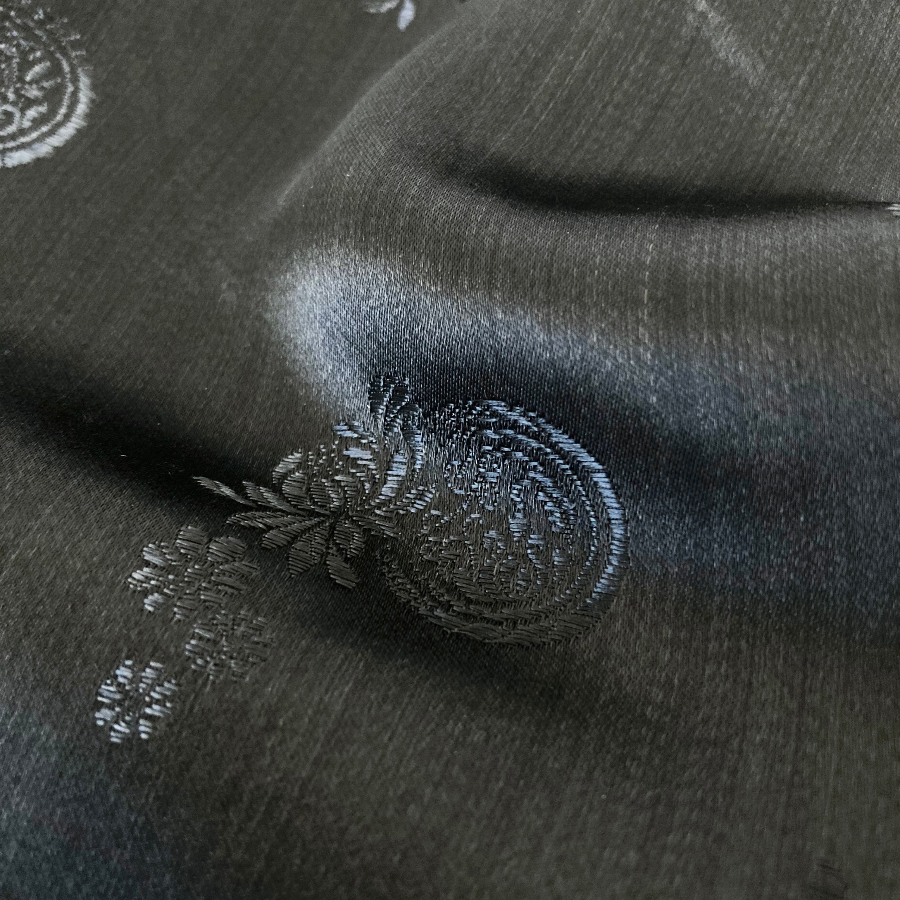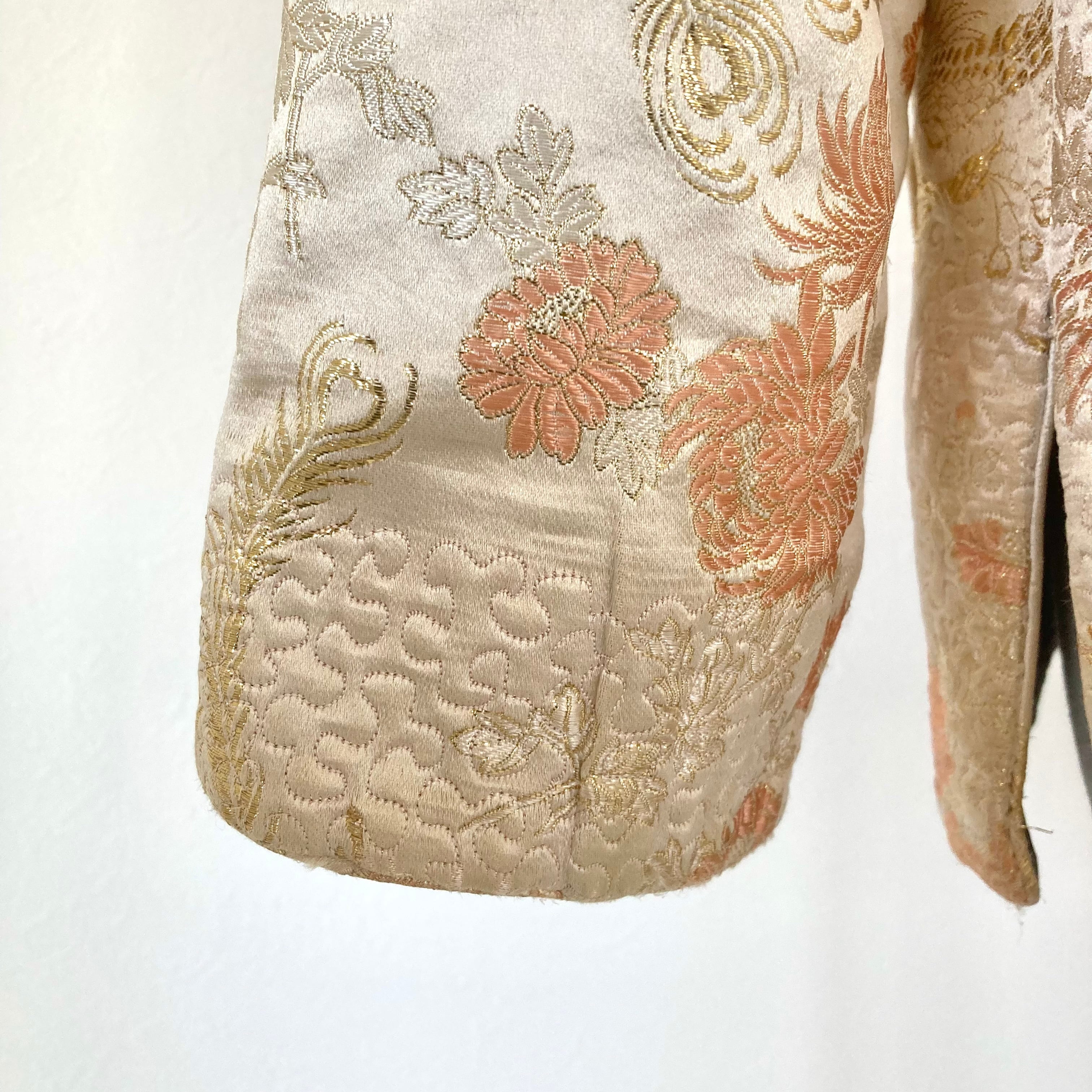 ホワイトゴールド地にオリエンタルな花柄、金色刺繍の孔雀、黒地には雷紋とオリエンタルな花柄のツヤ感あるテキスタイル