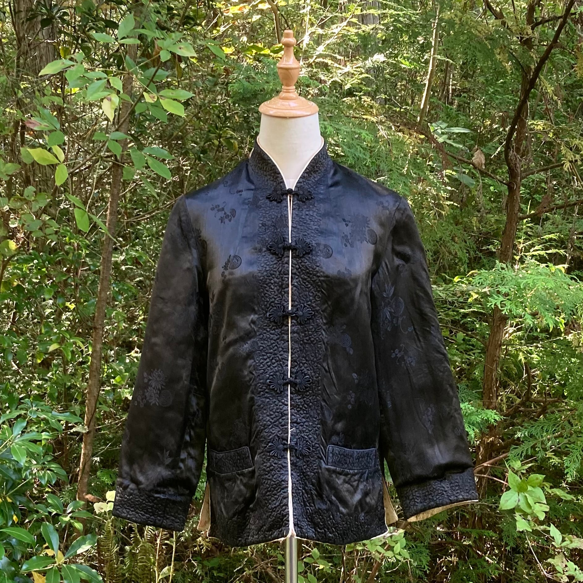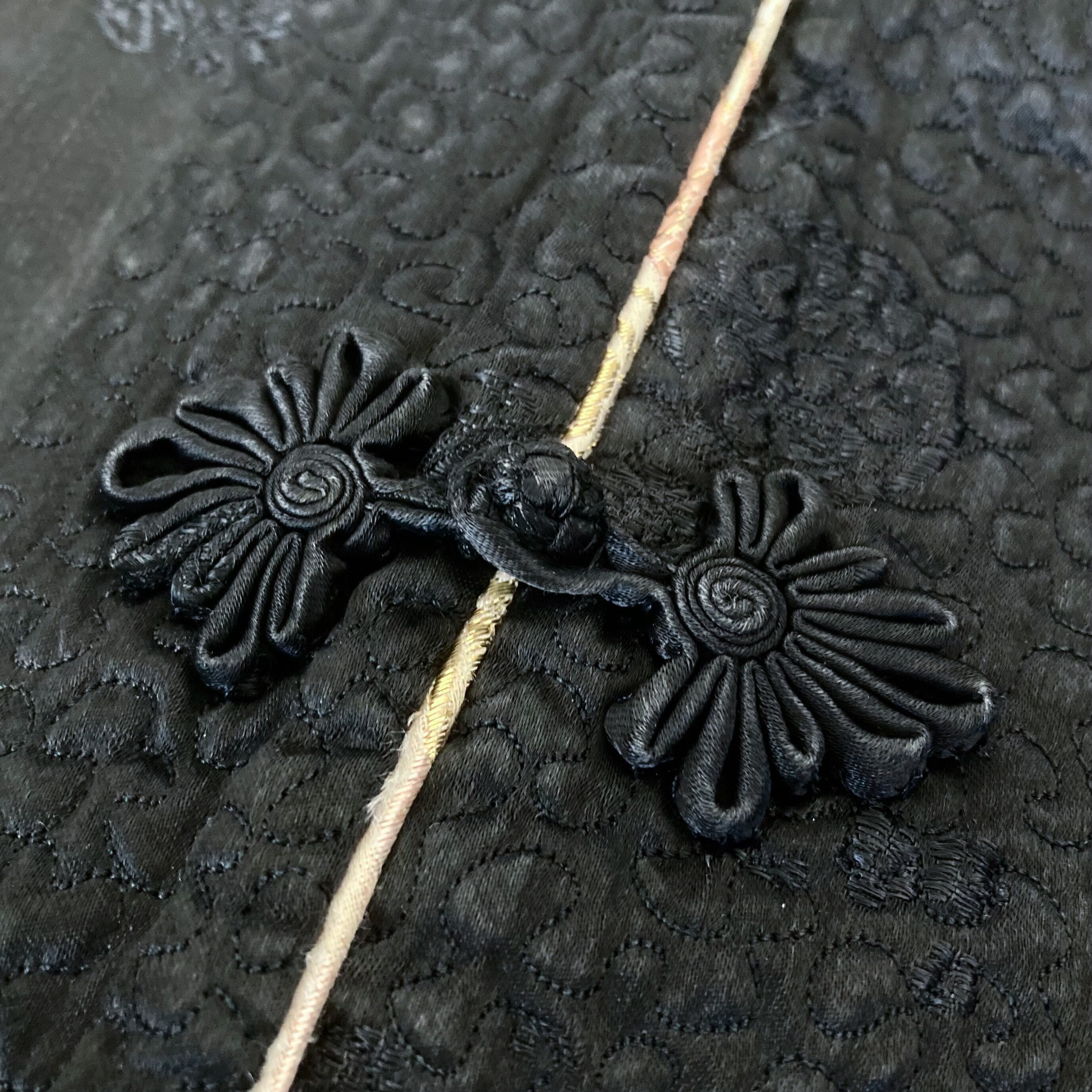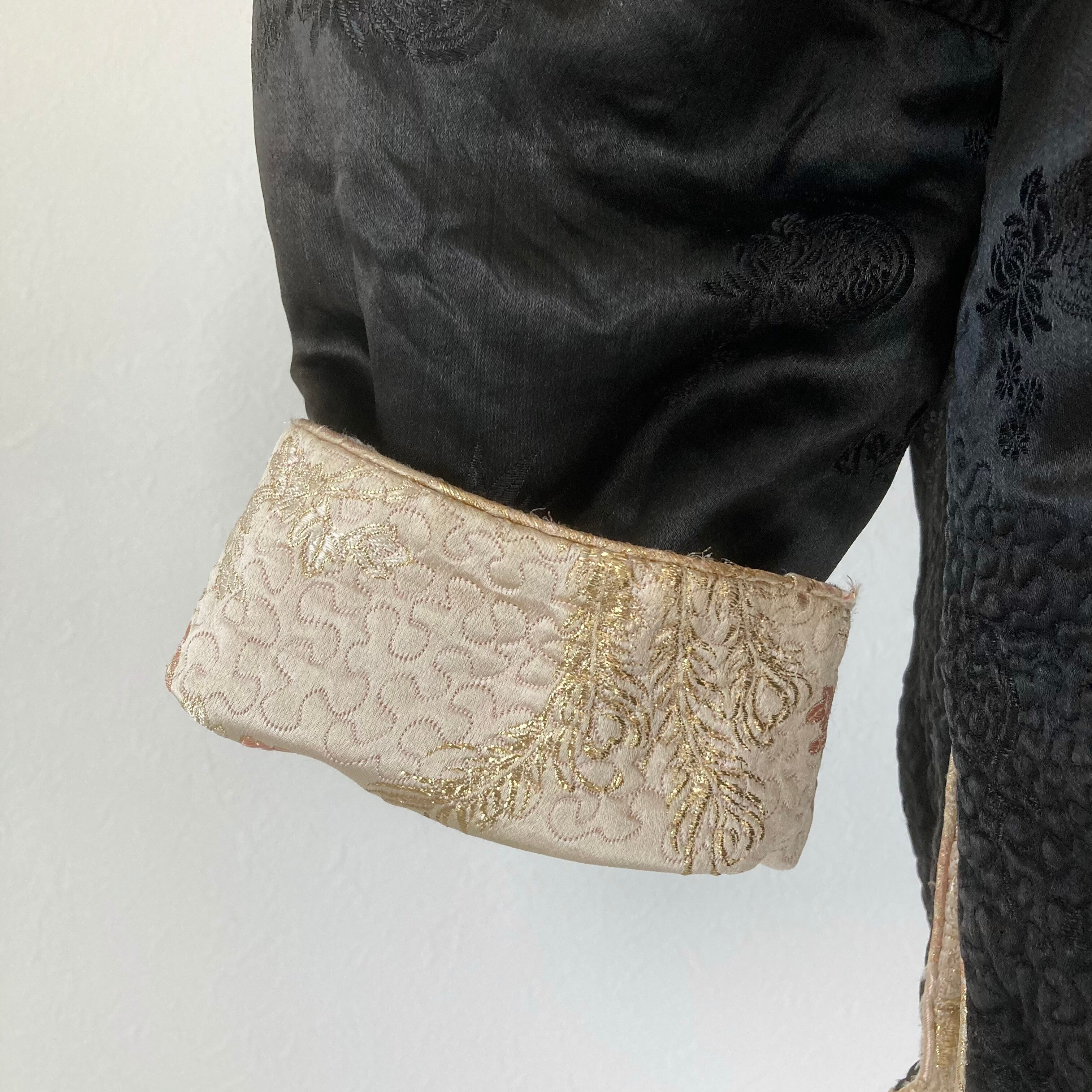 ホワイトゴールド地にオリエンタルな花柄、金色刺繍の孔雀、黒地には雷紋とオリエンタルな花柄のツヤ感あるテキスタイル