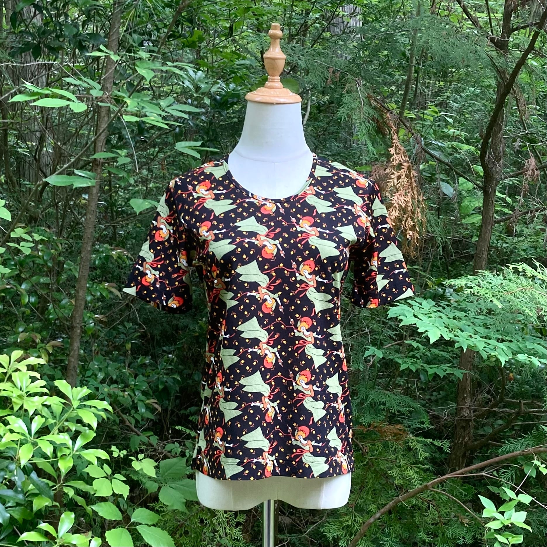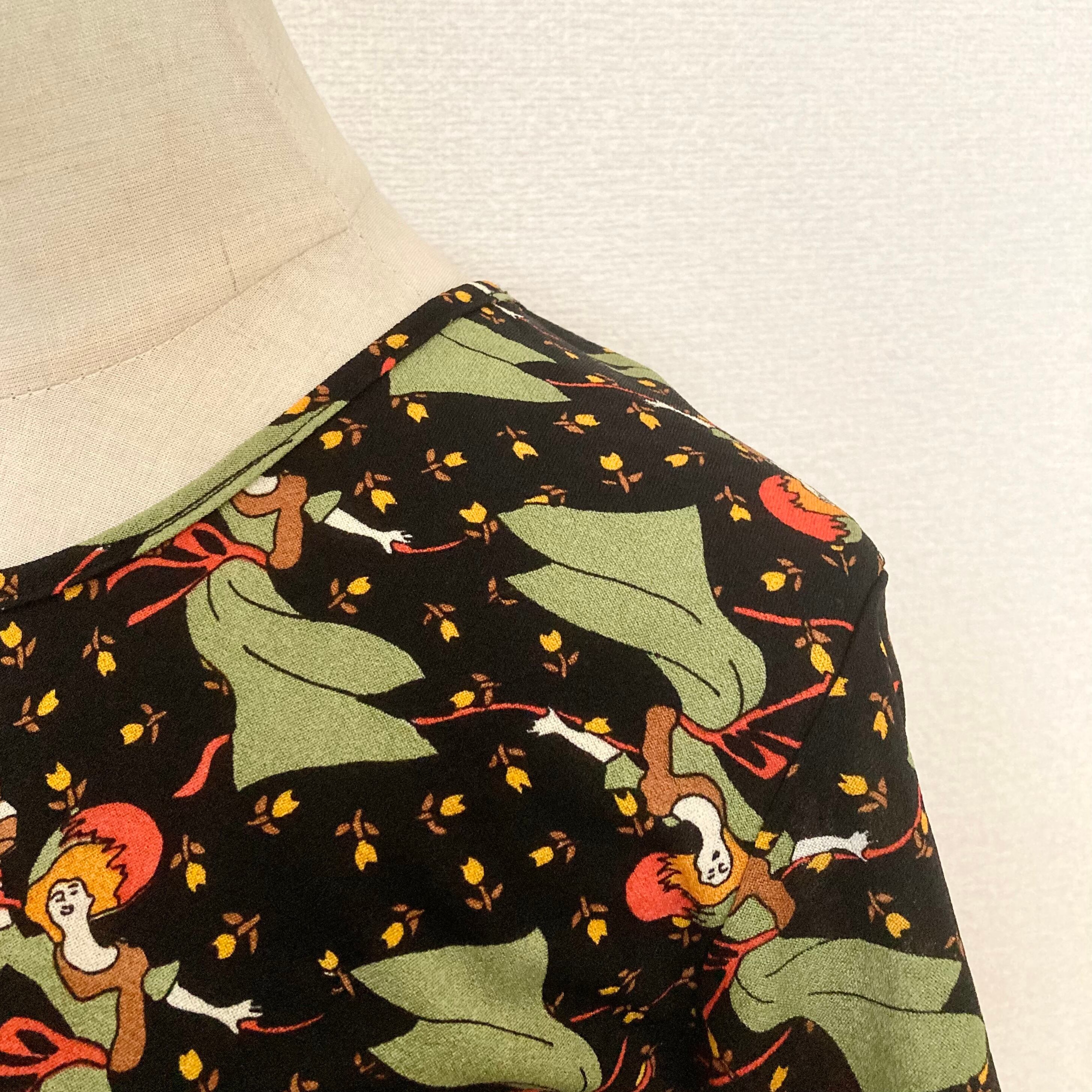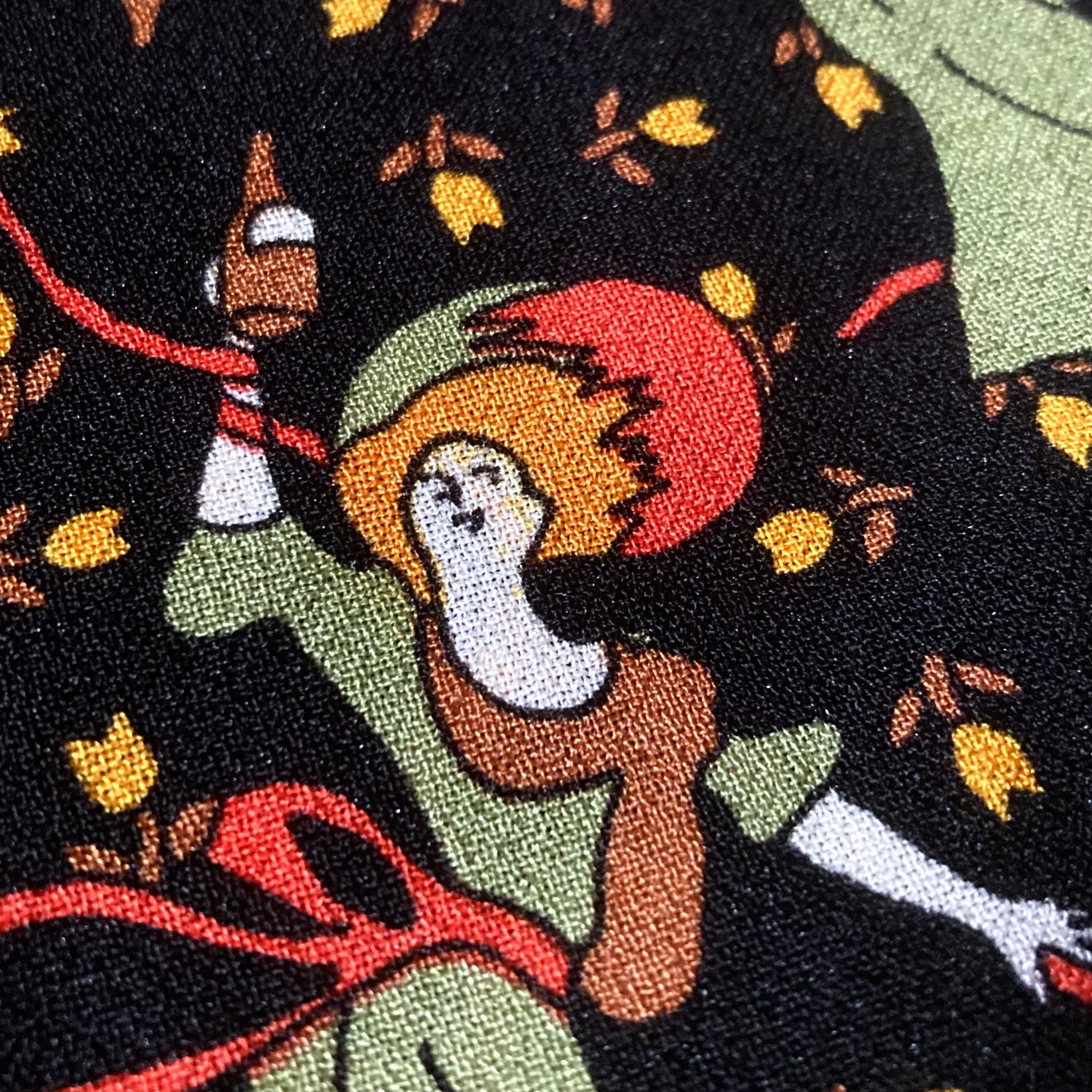黒地に陽気な女性が描かれたやや透け感あるテキスタイル