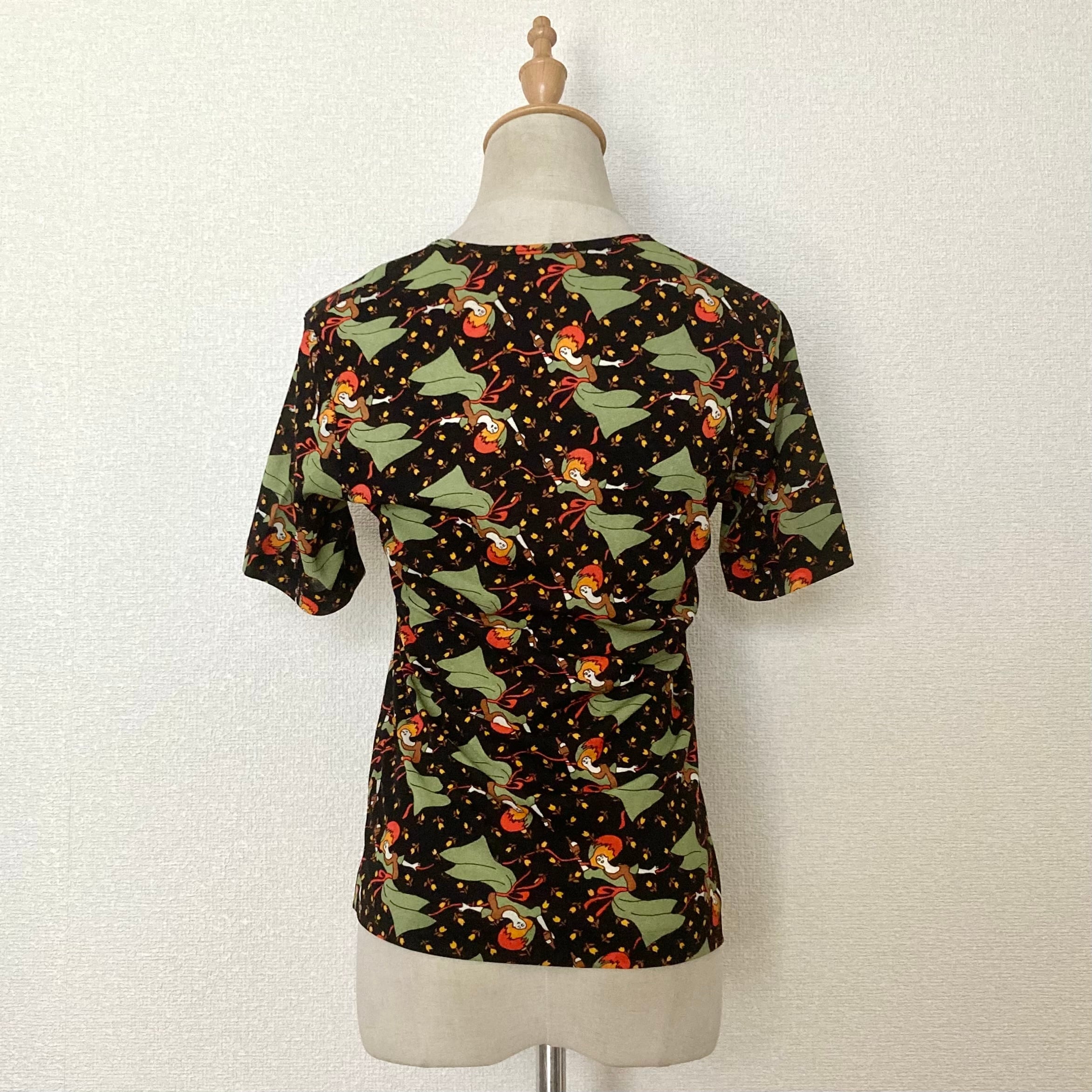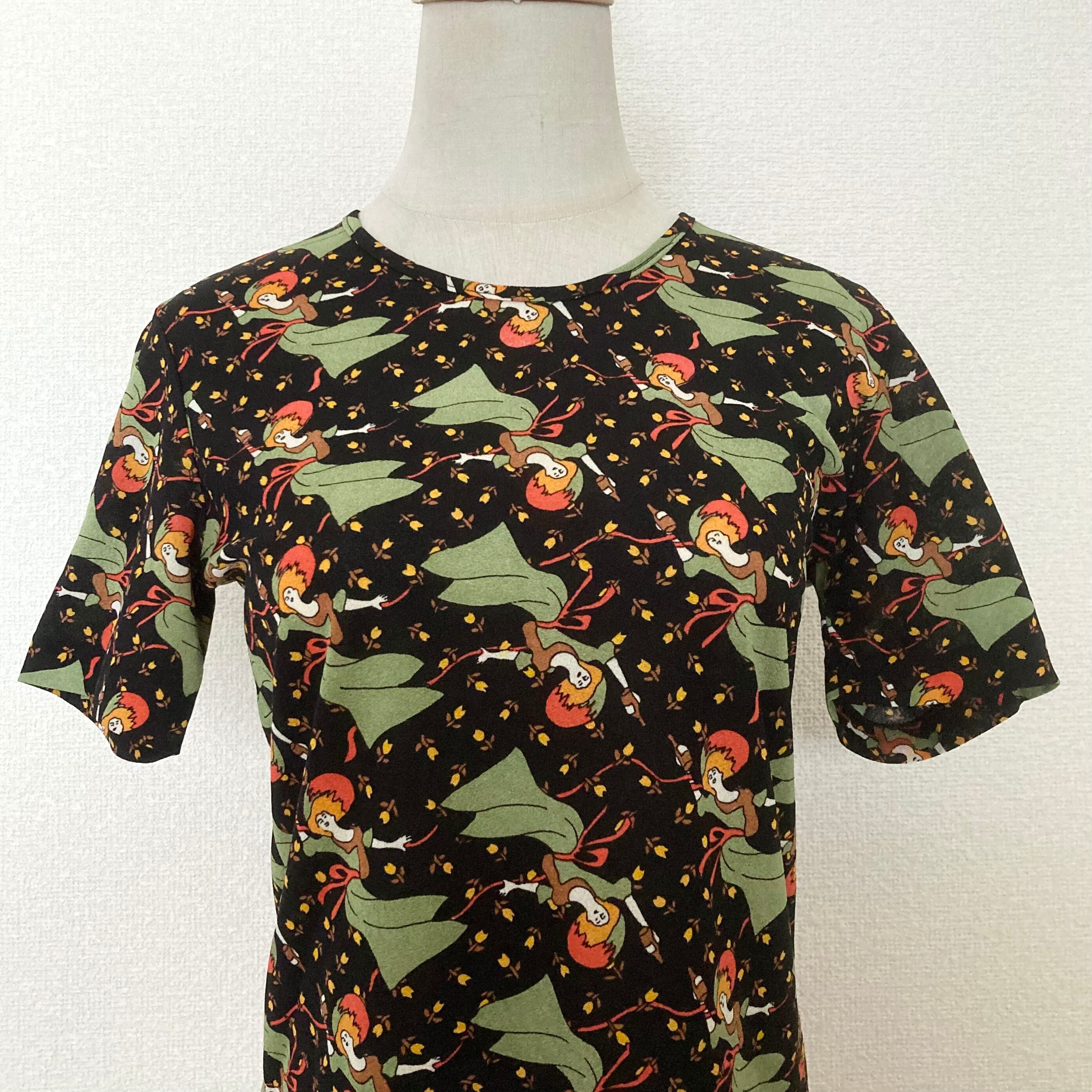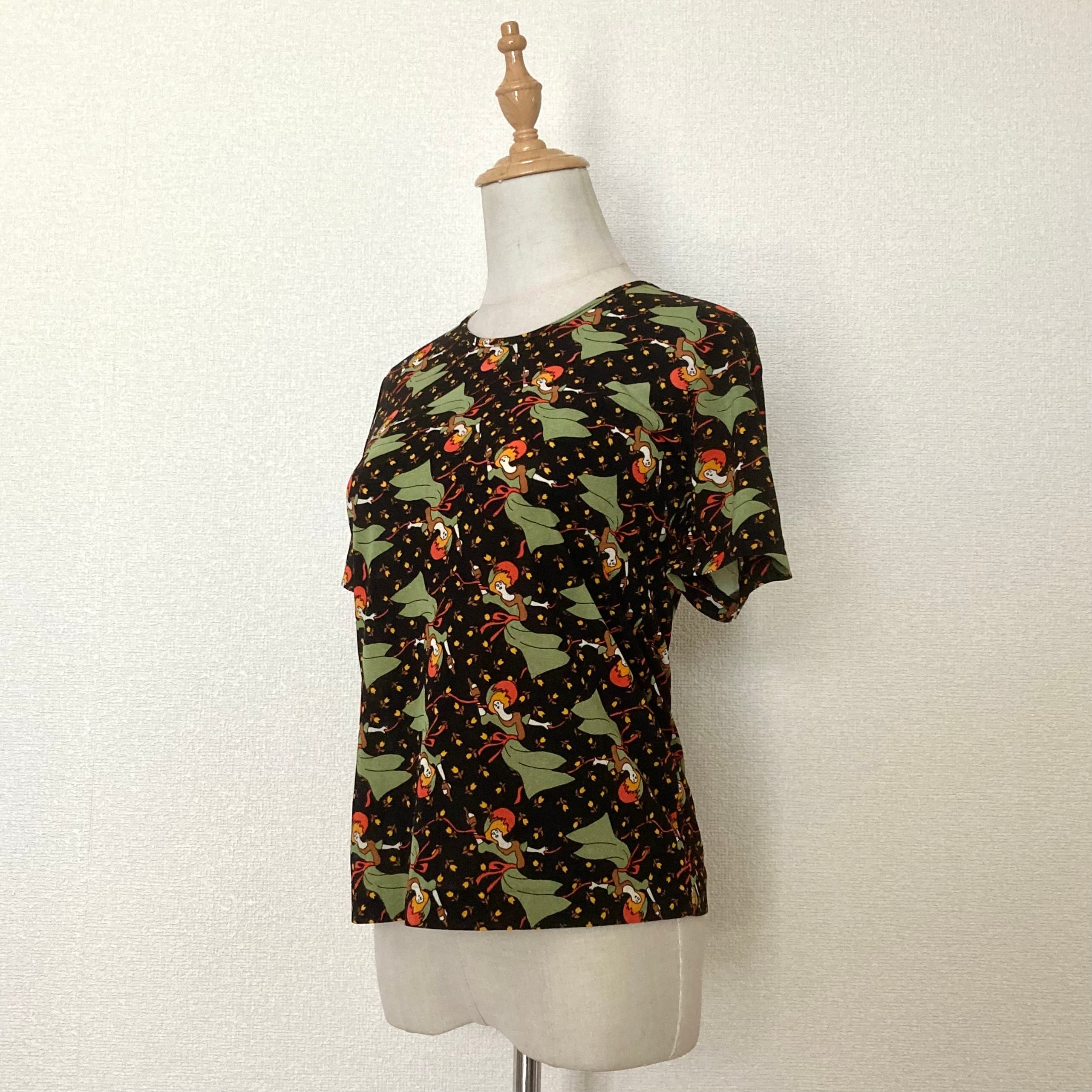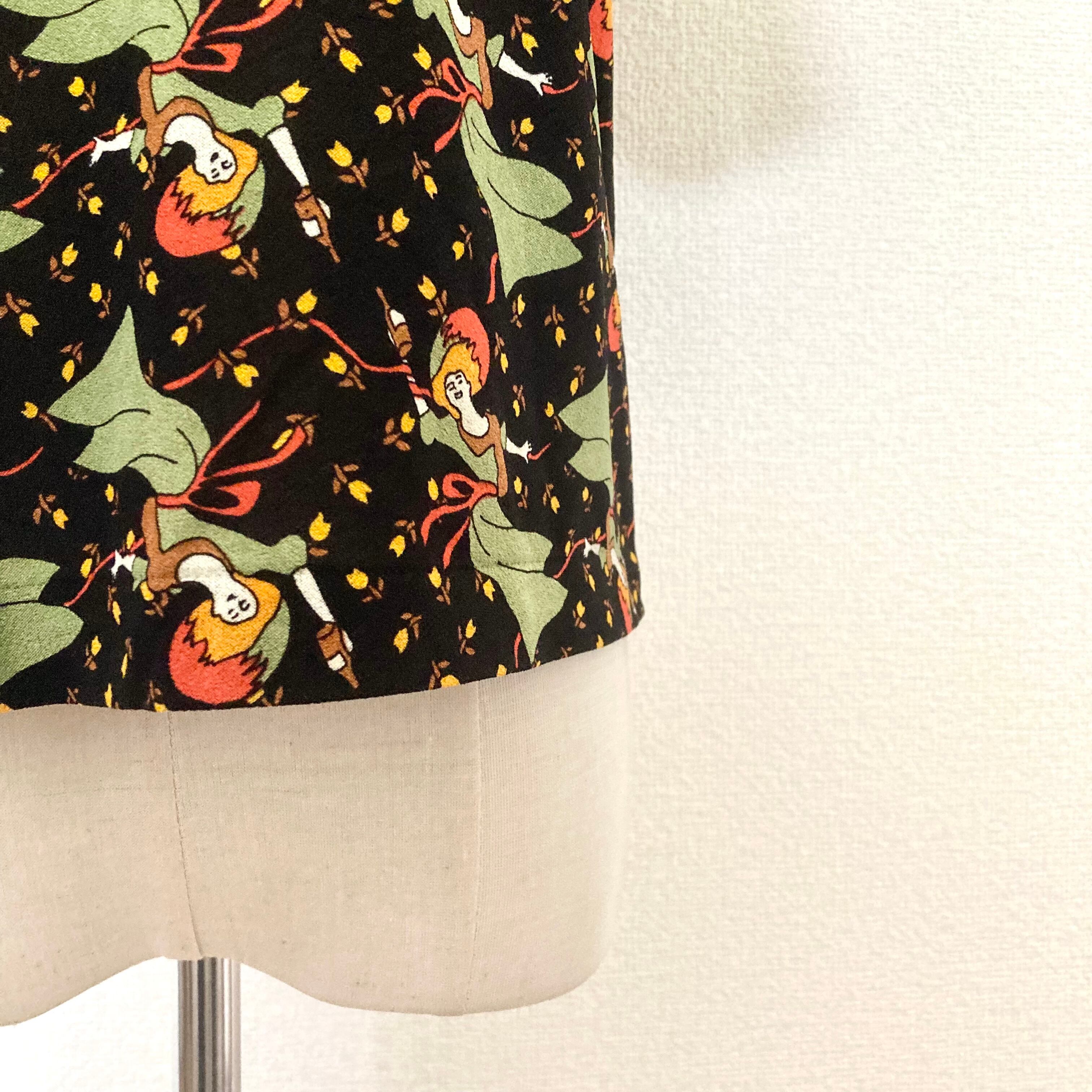 黒地に陽気な女性が描かれたやや透け感あるテキスタイル