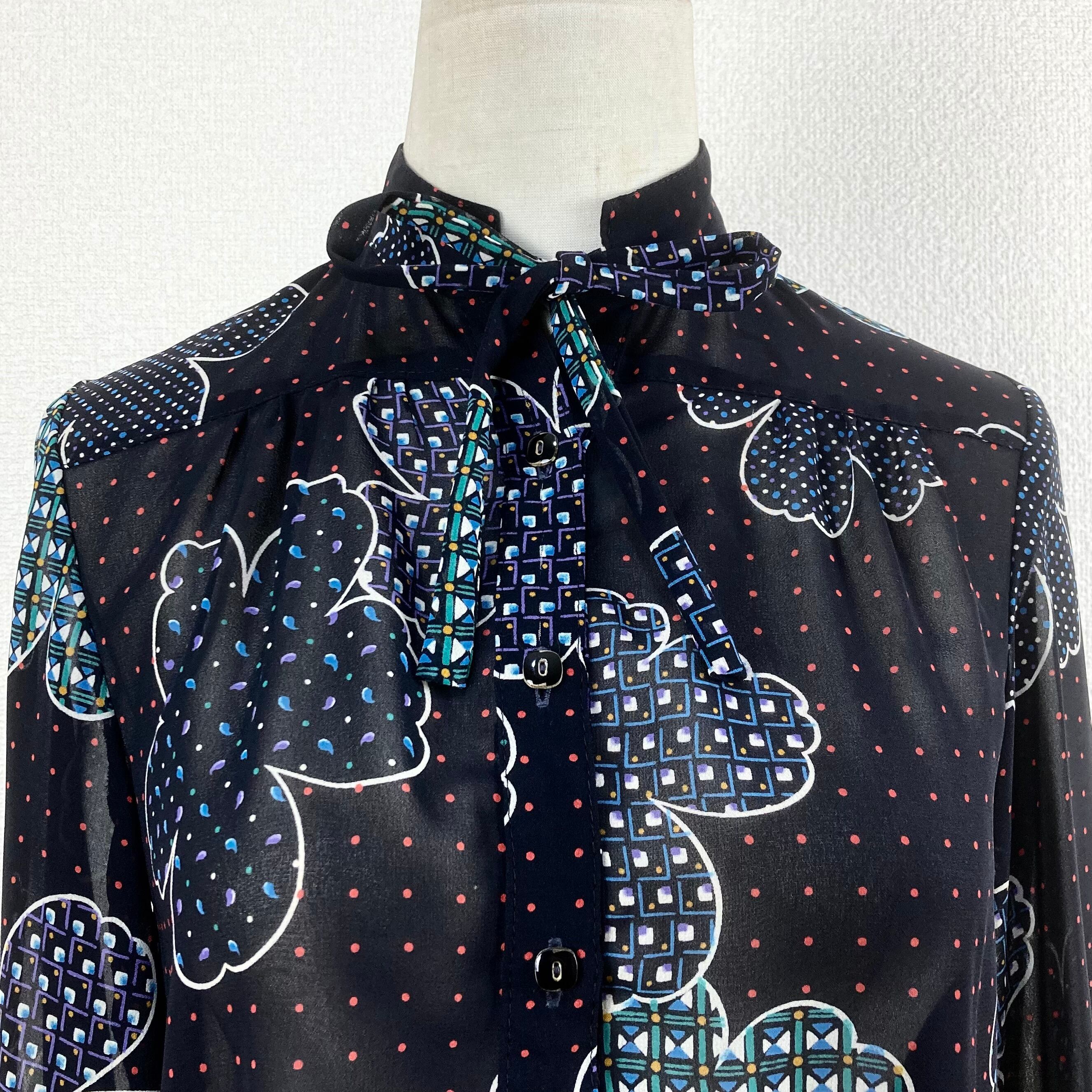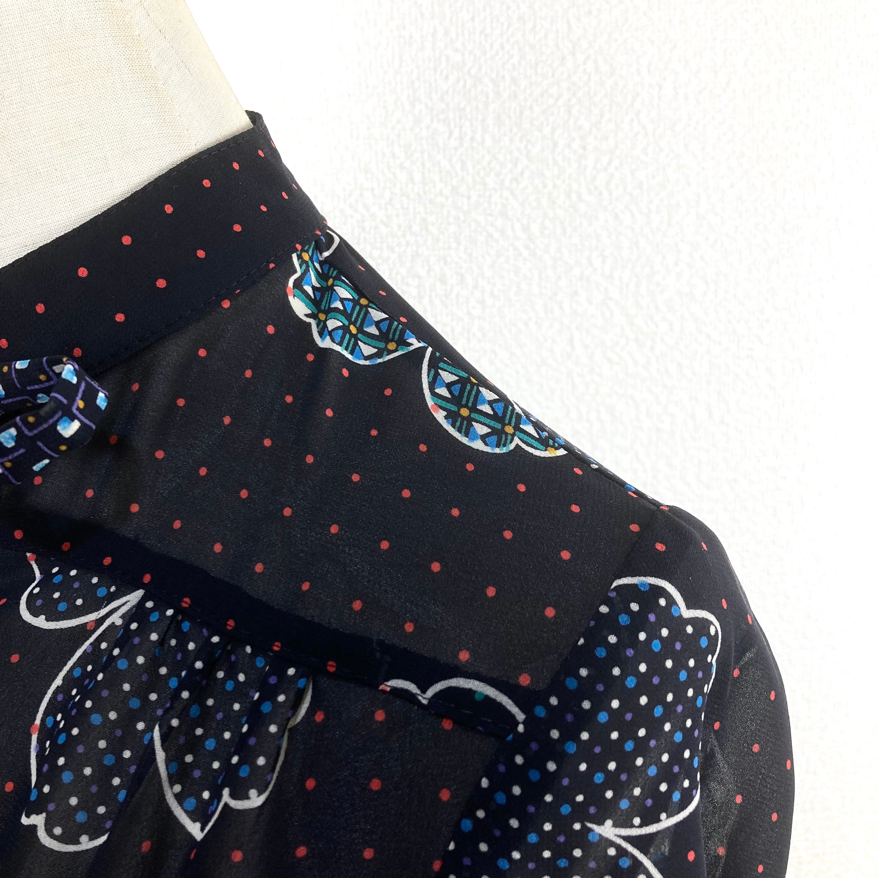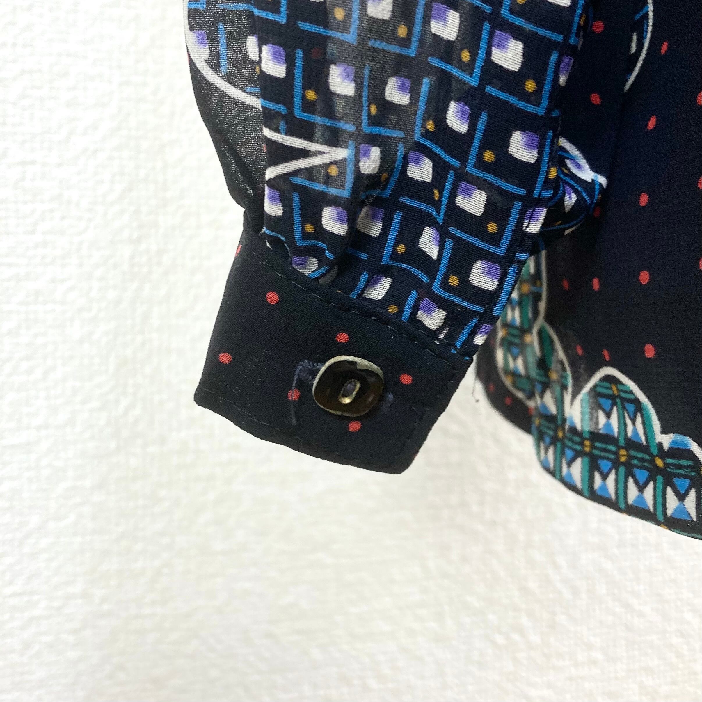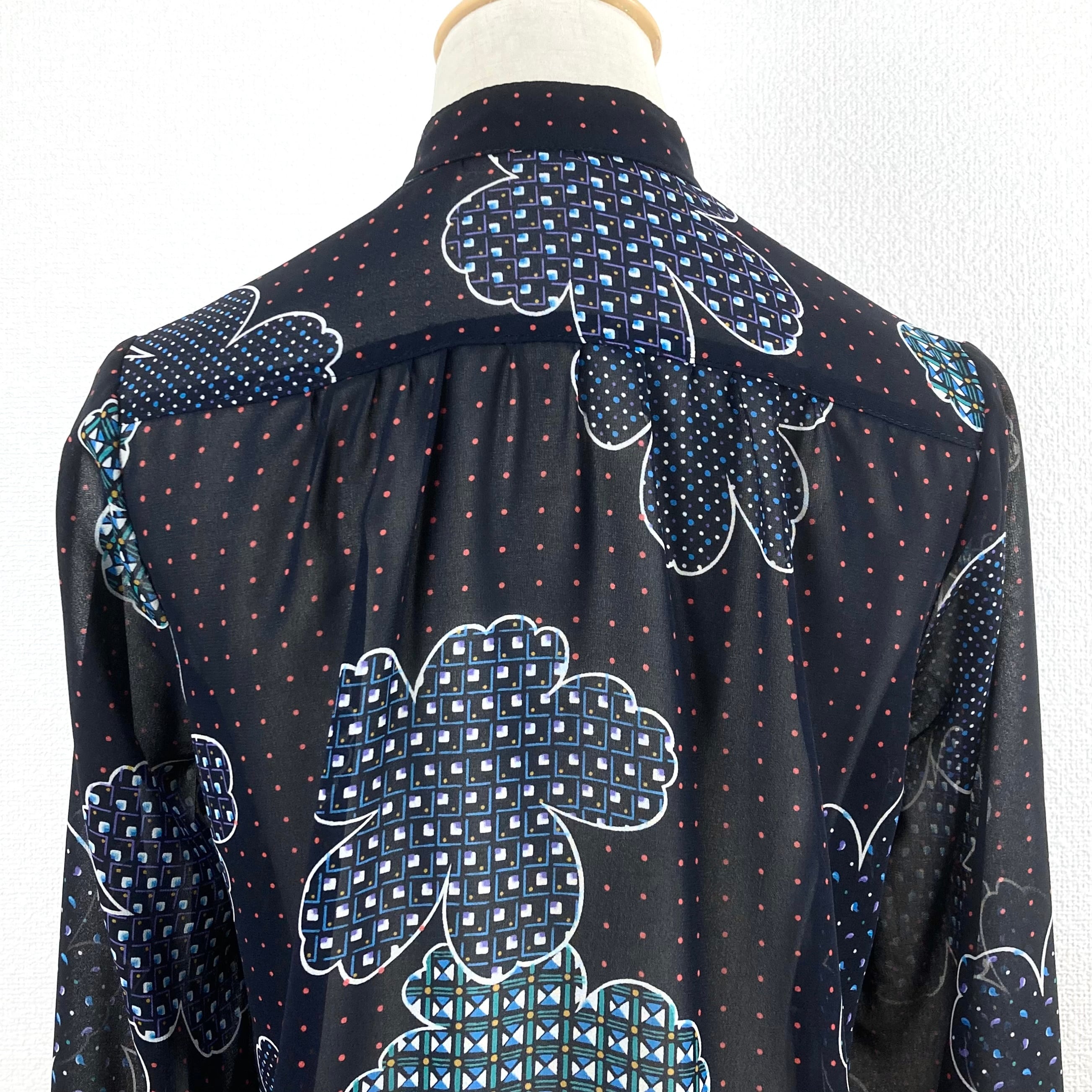 動きのある曲線と静かに並ぶ水玉模様と幾何学模様が印象的なレトロ柄ブラウス