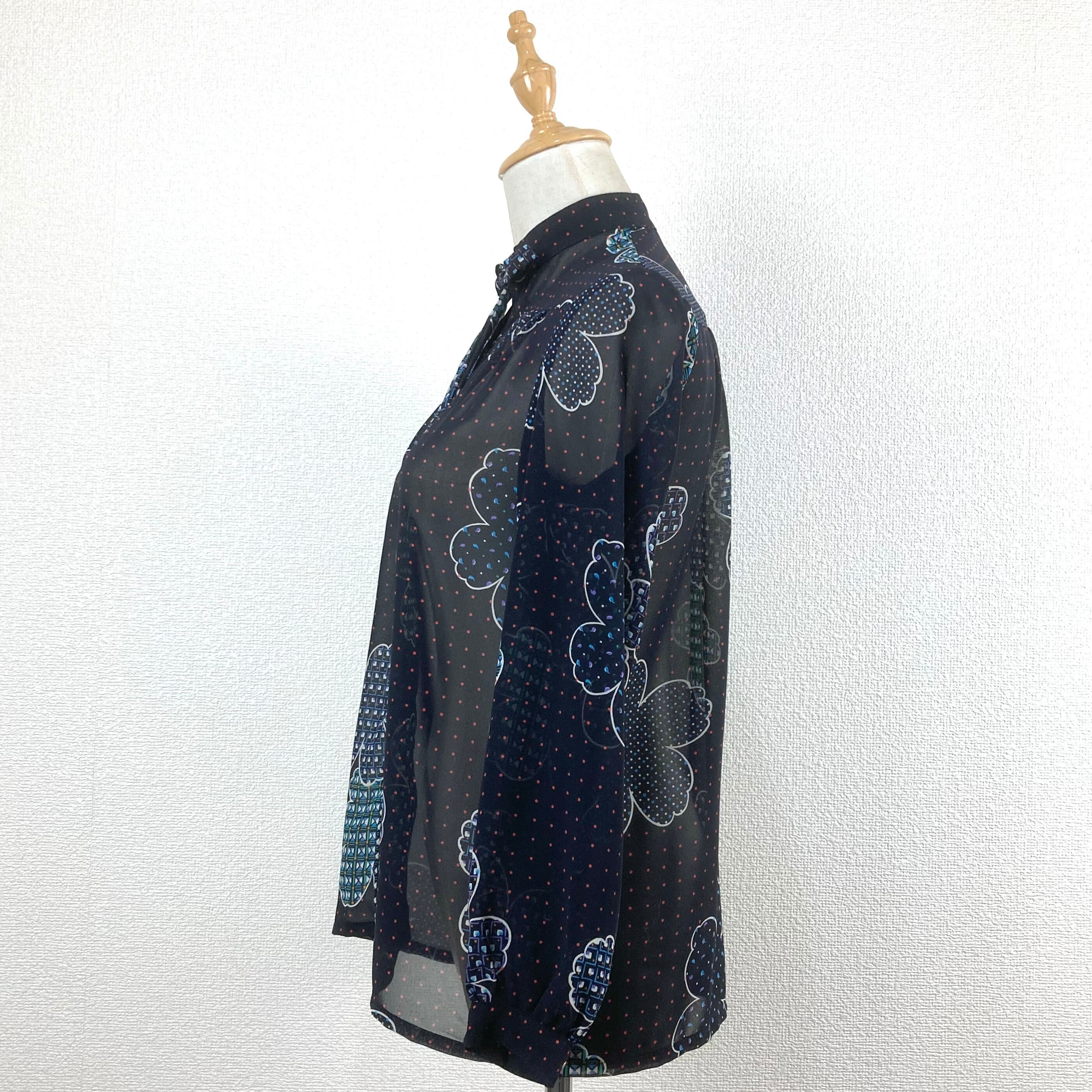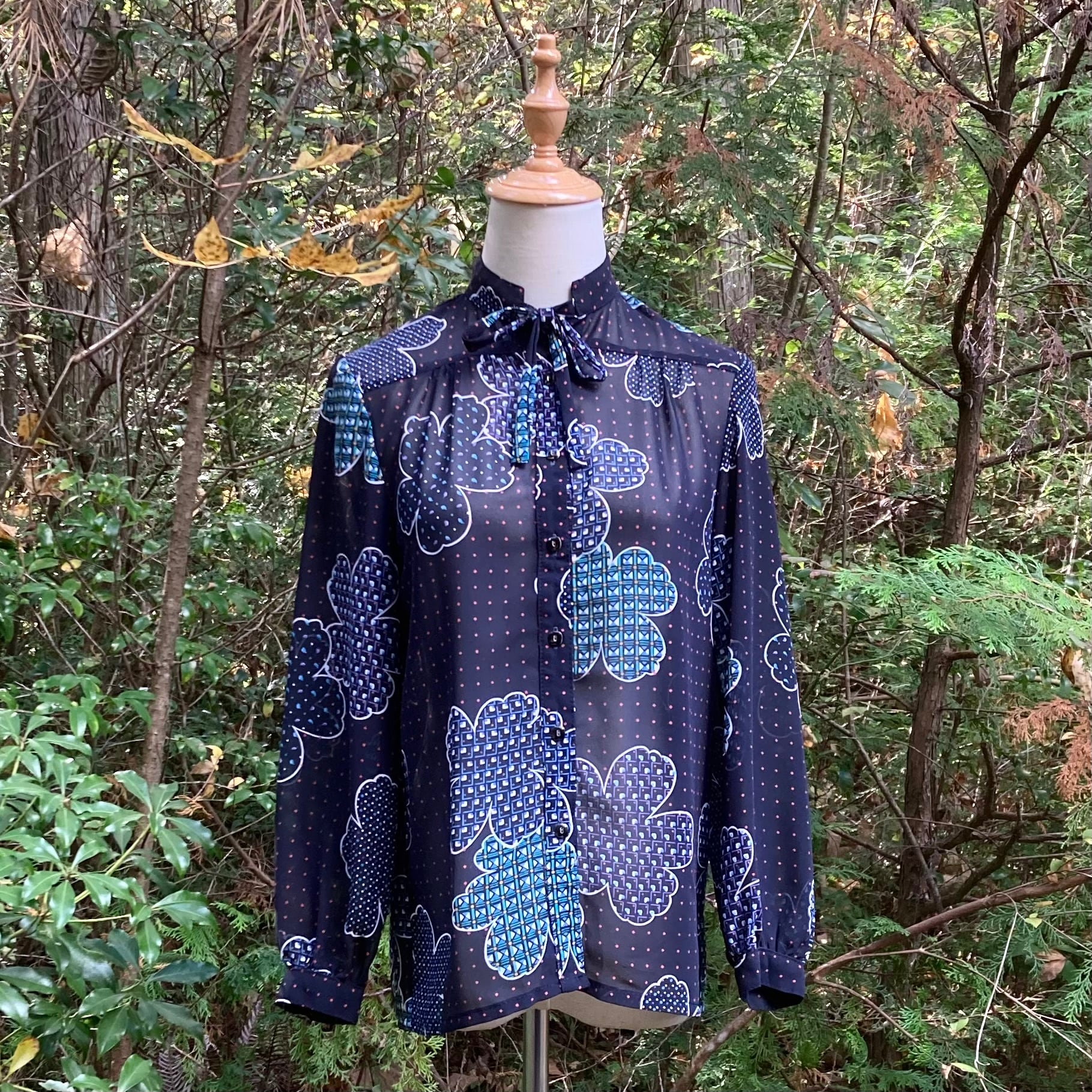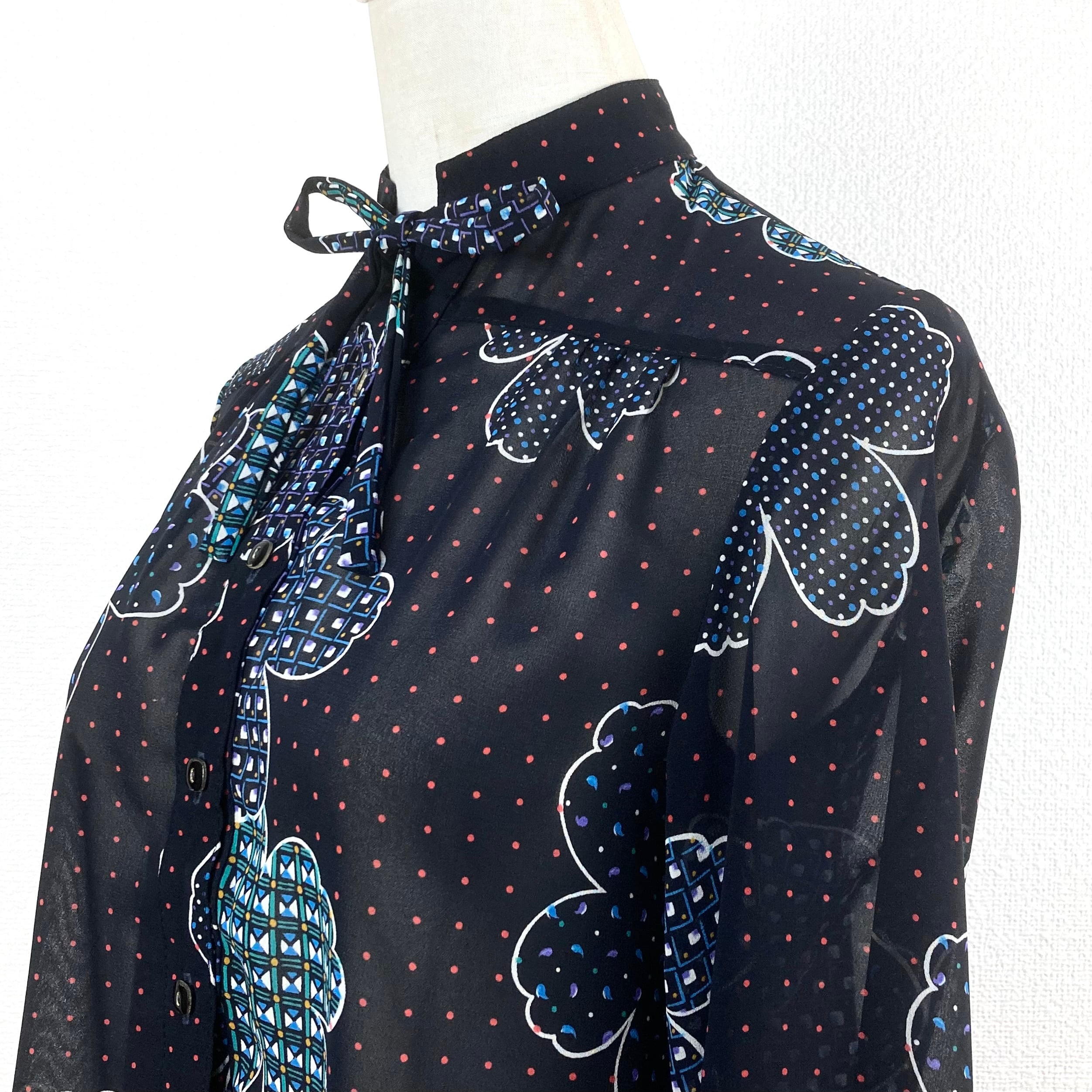 動きのある曲線と静かに並ぶ水玉模様と幾何学模様が印象的なレトロ柄ブラウス