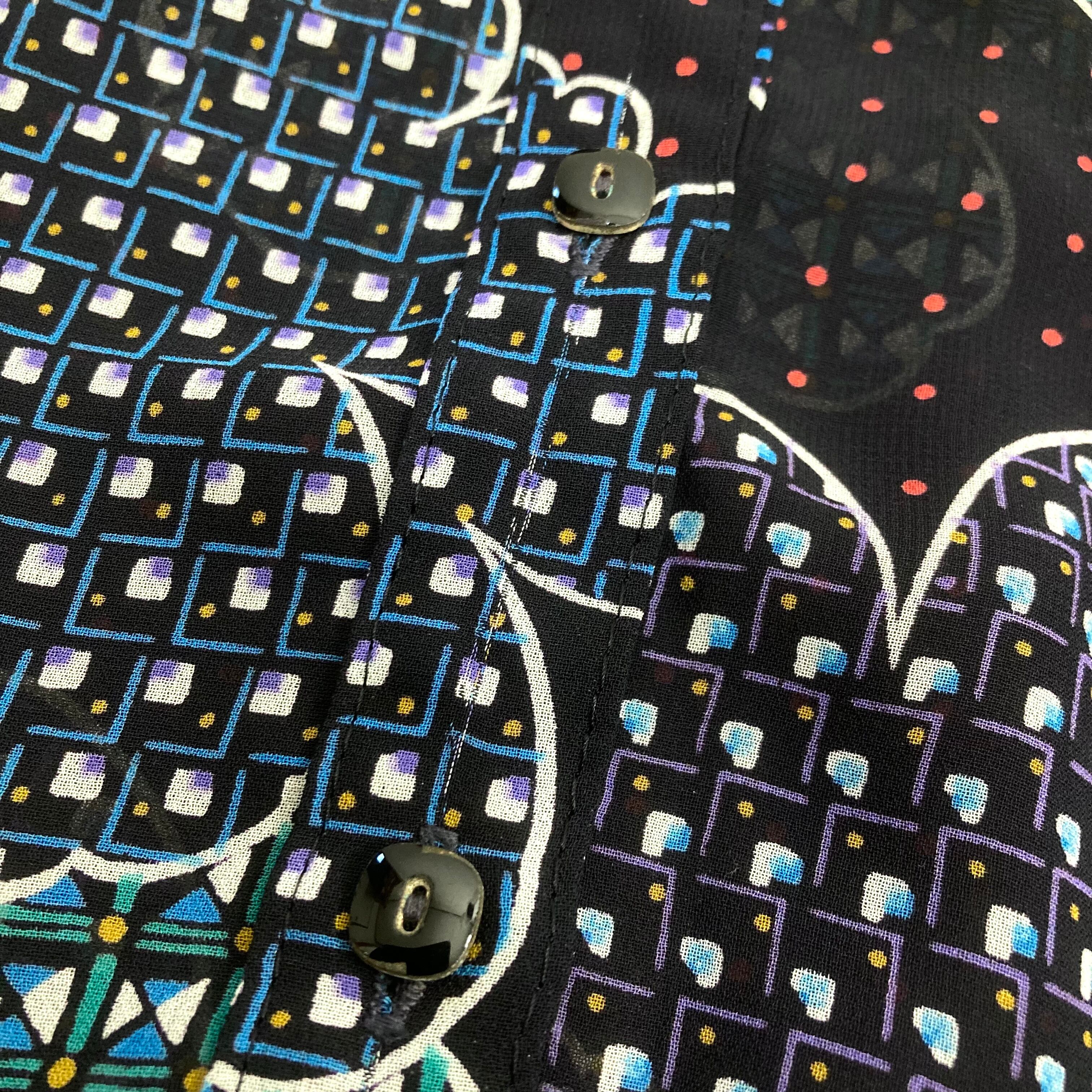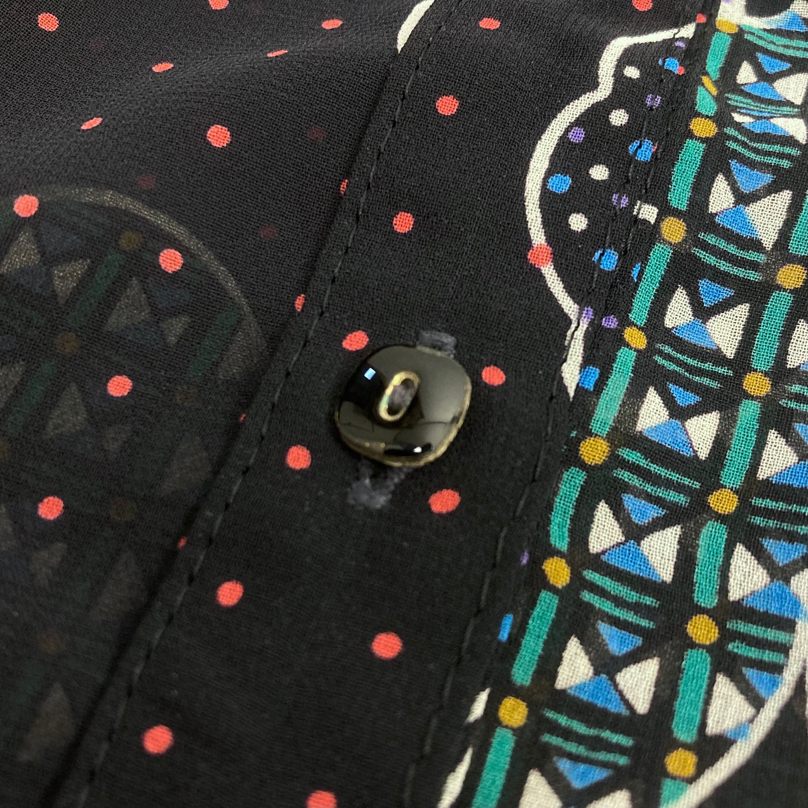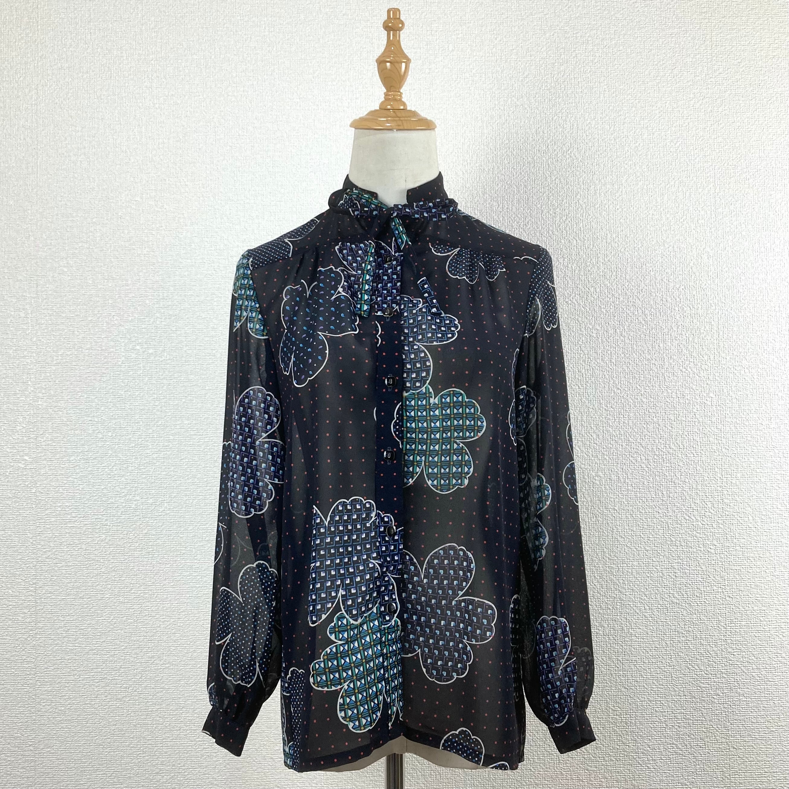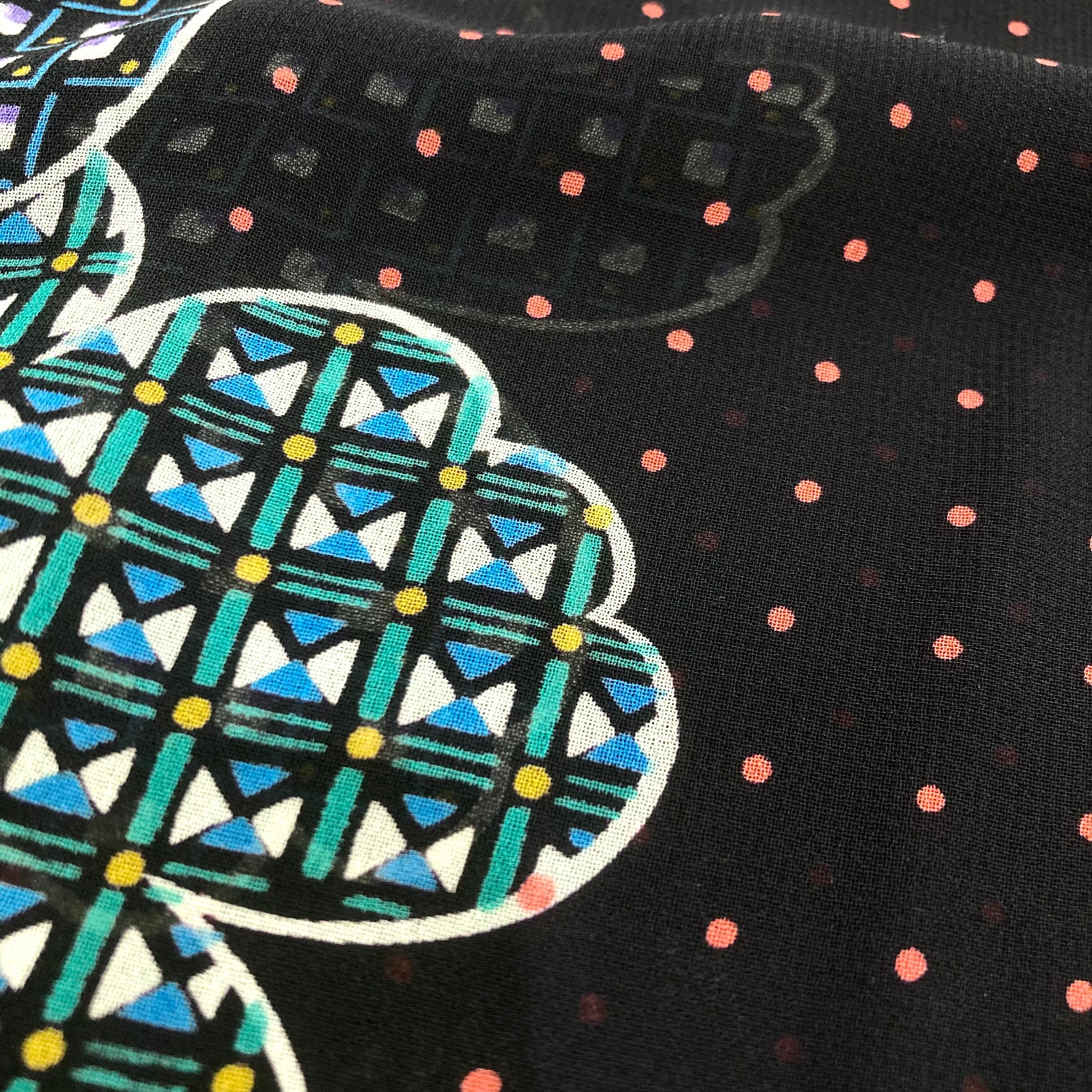動きのある曲線と静かに並ぶ水玉模様と幾何学模様が印象的なレトロ柄ブラウス