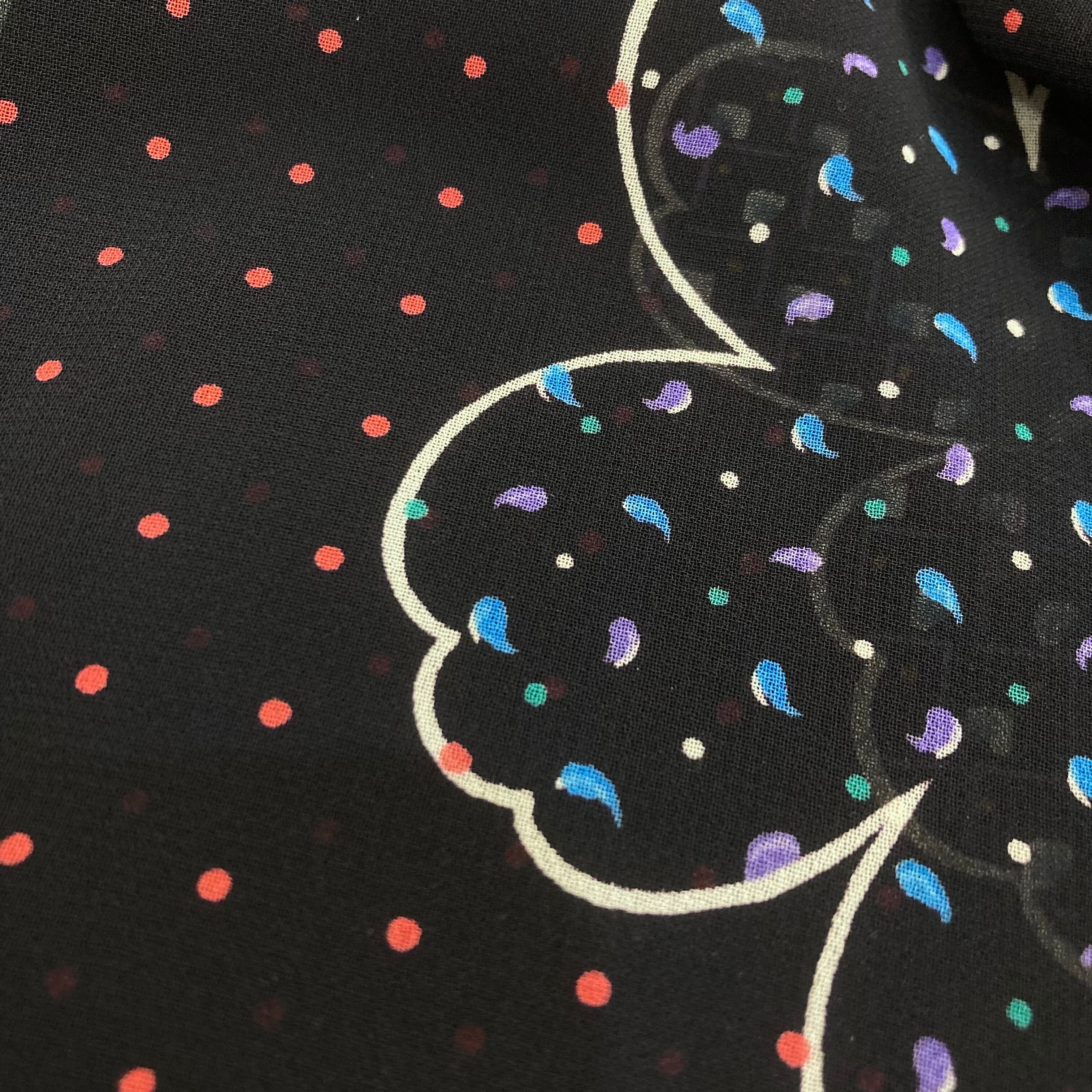 黒地に赤い水玉模様、内側に幾何学模様や水玉のテクスチャを張り込んだような白く象った大きな花がプリントされた透け感あるテキスタイル