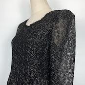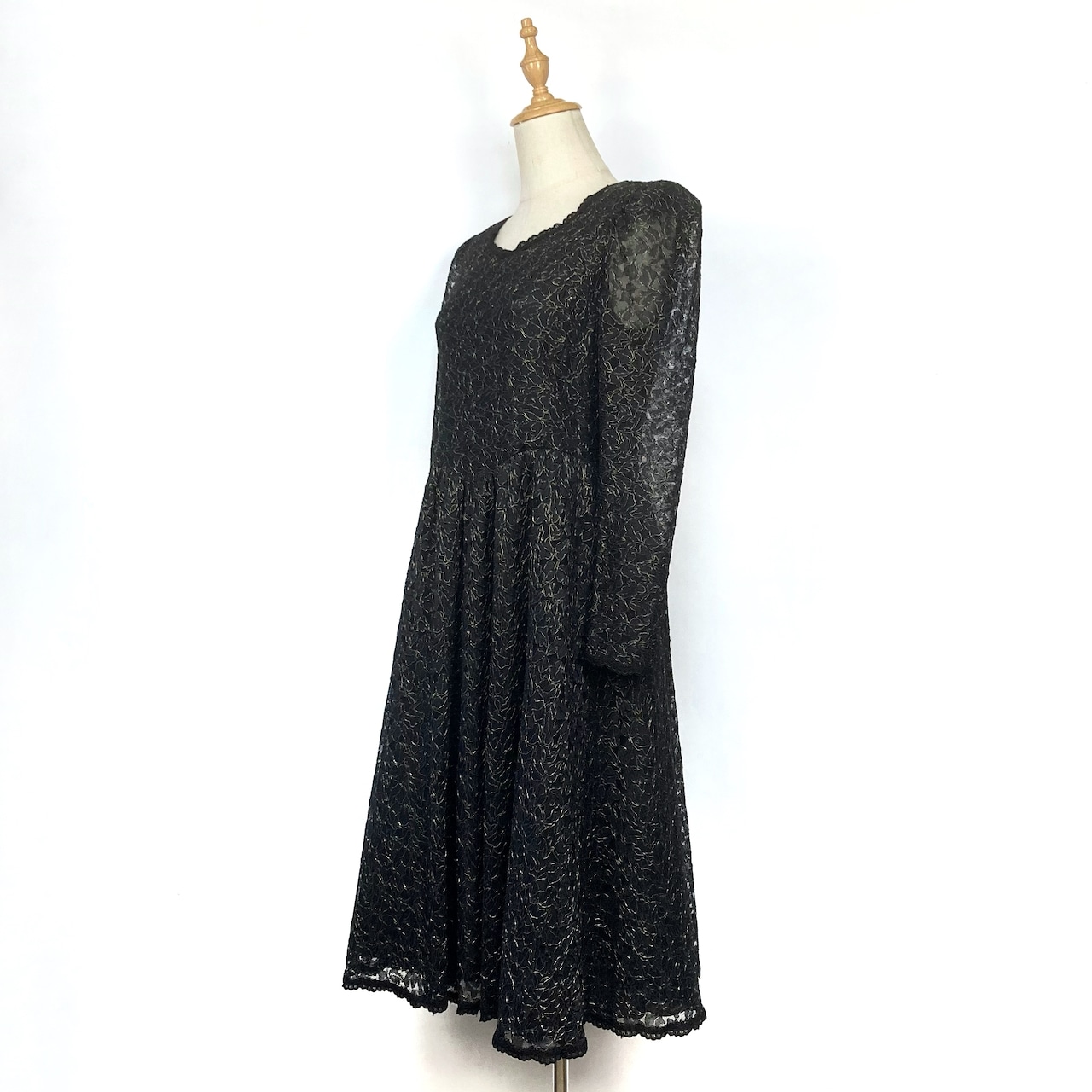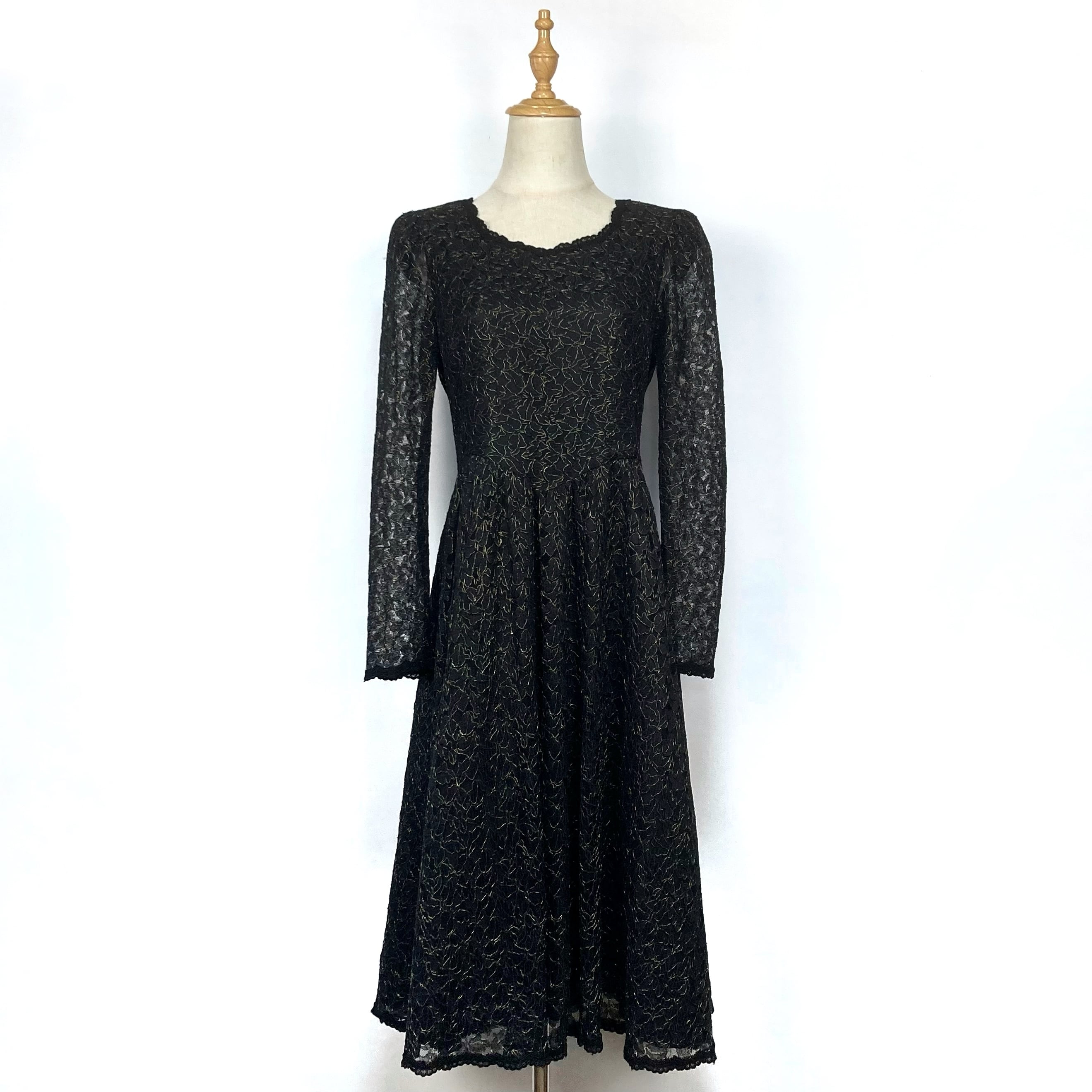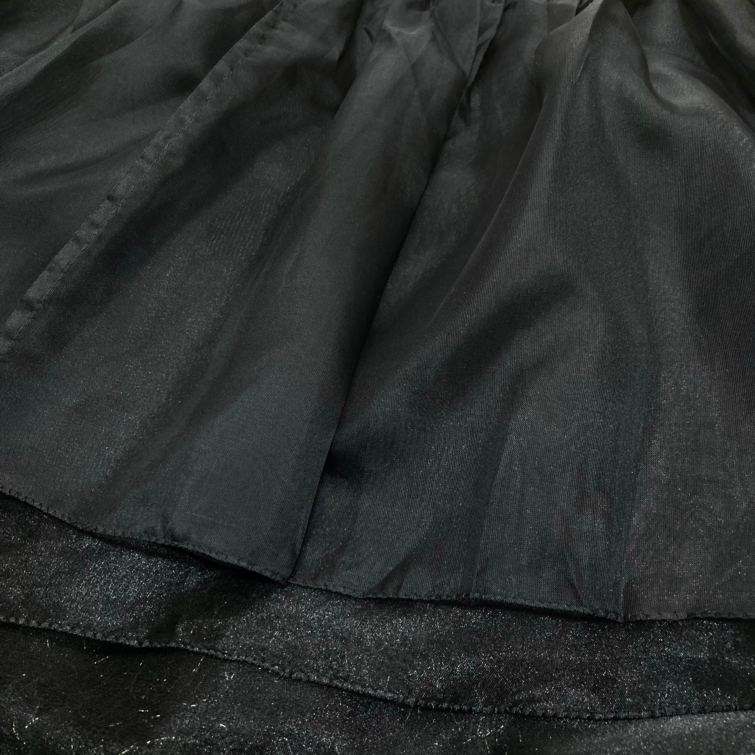衿と袖口、裾にスカラップ、ウエストをゆるいV字切り替えにしたボリュームあるスカートのデザインブラックドレス