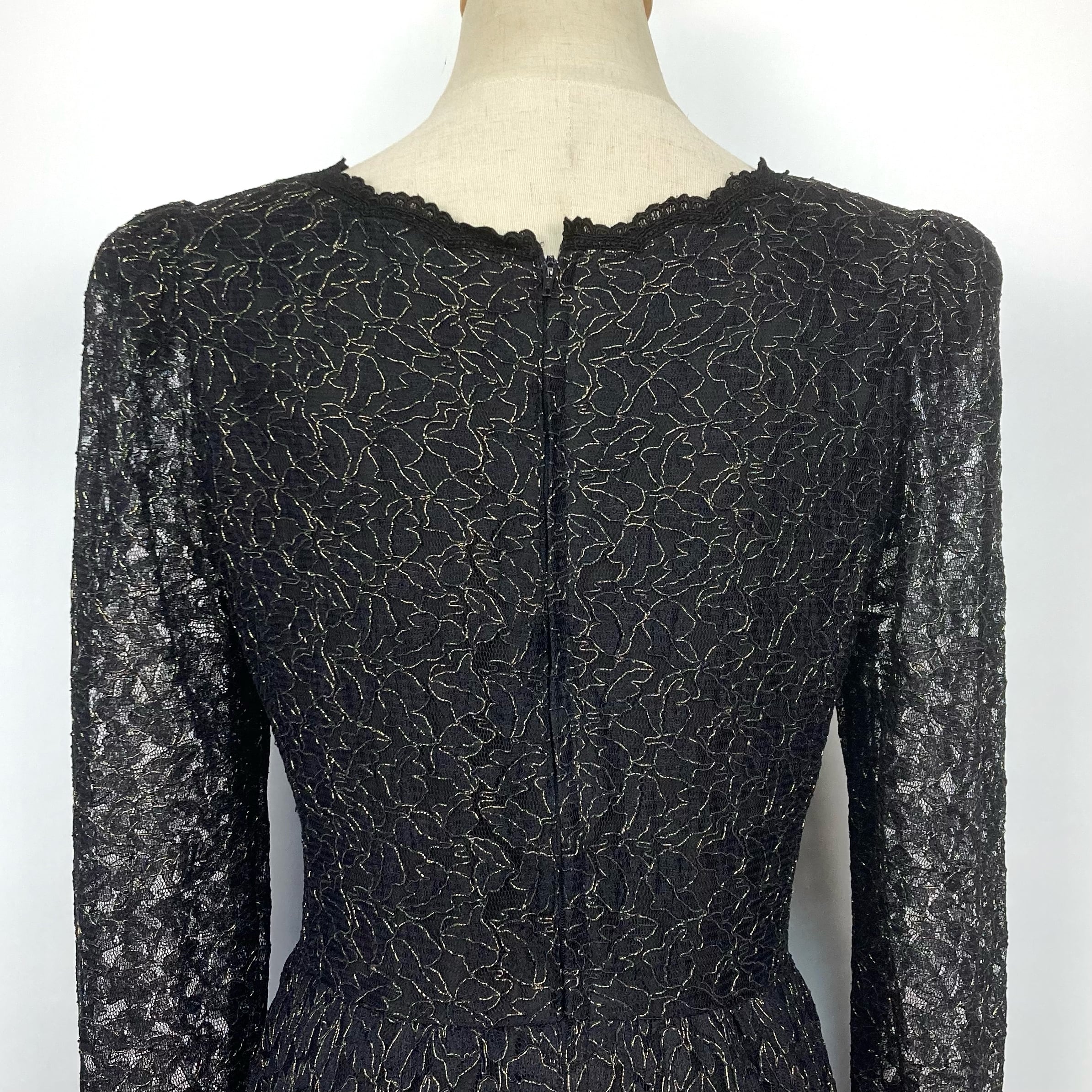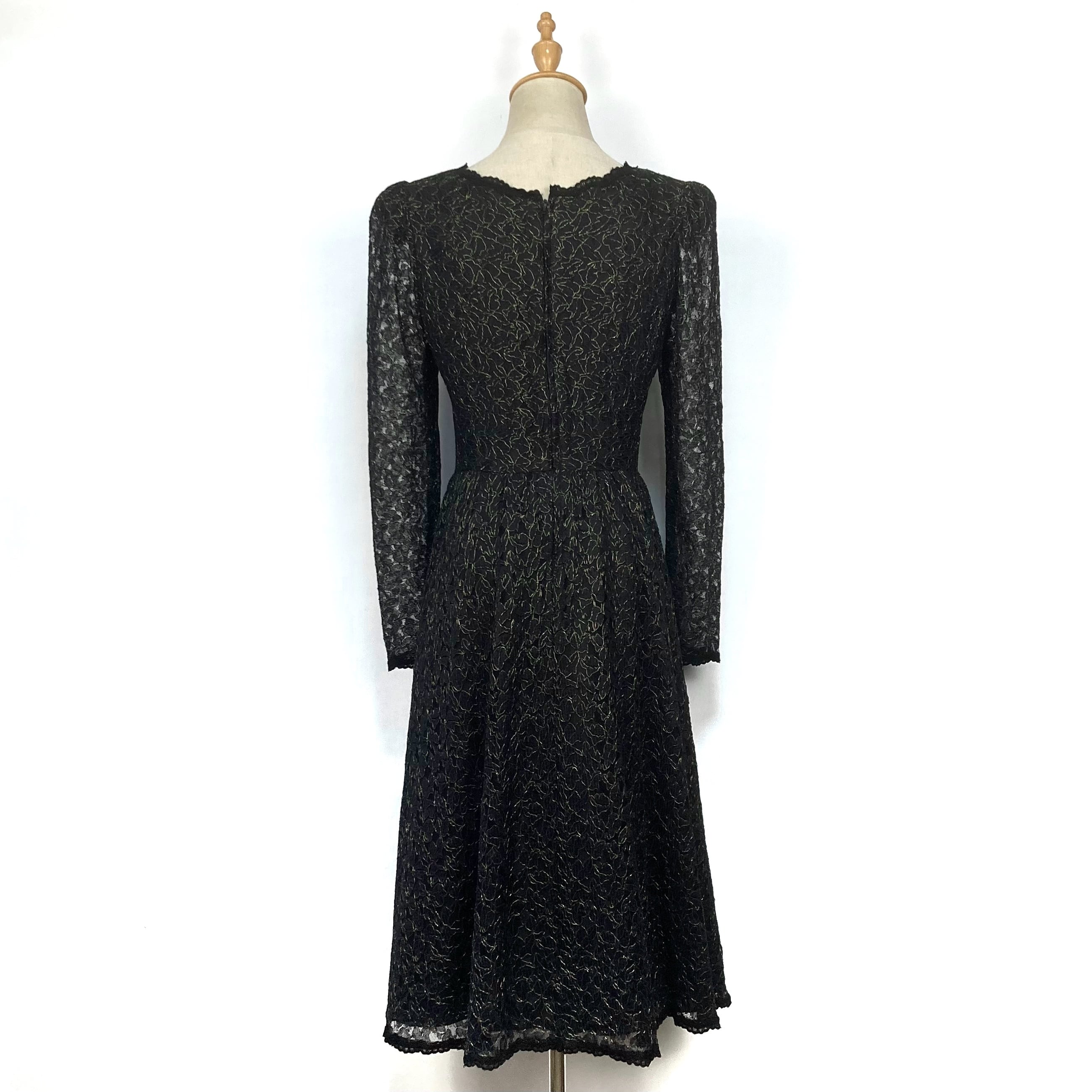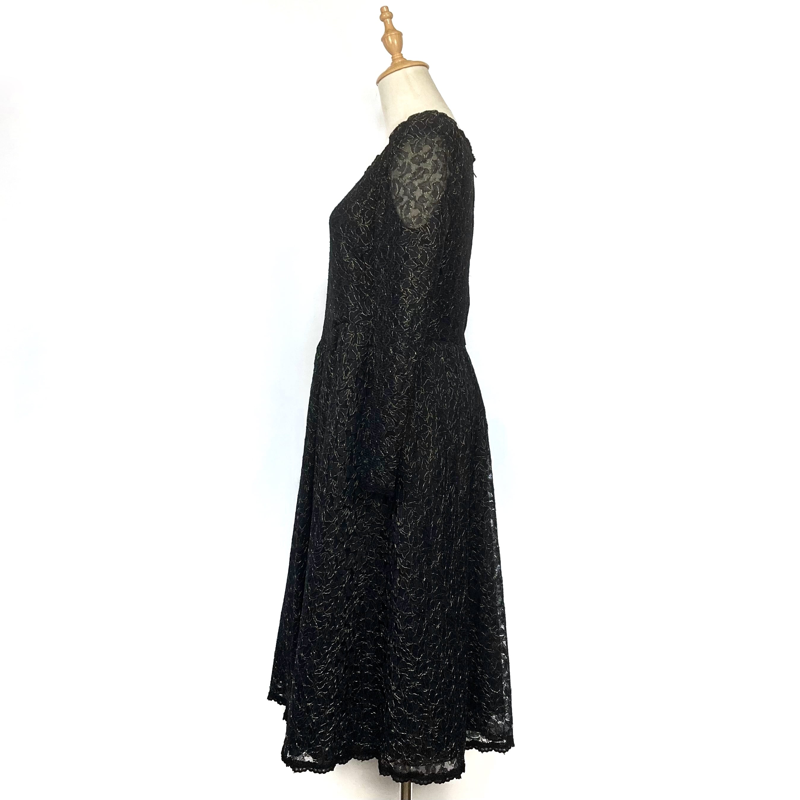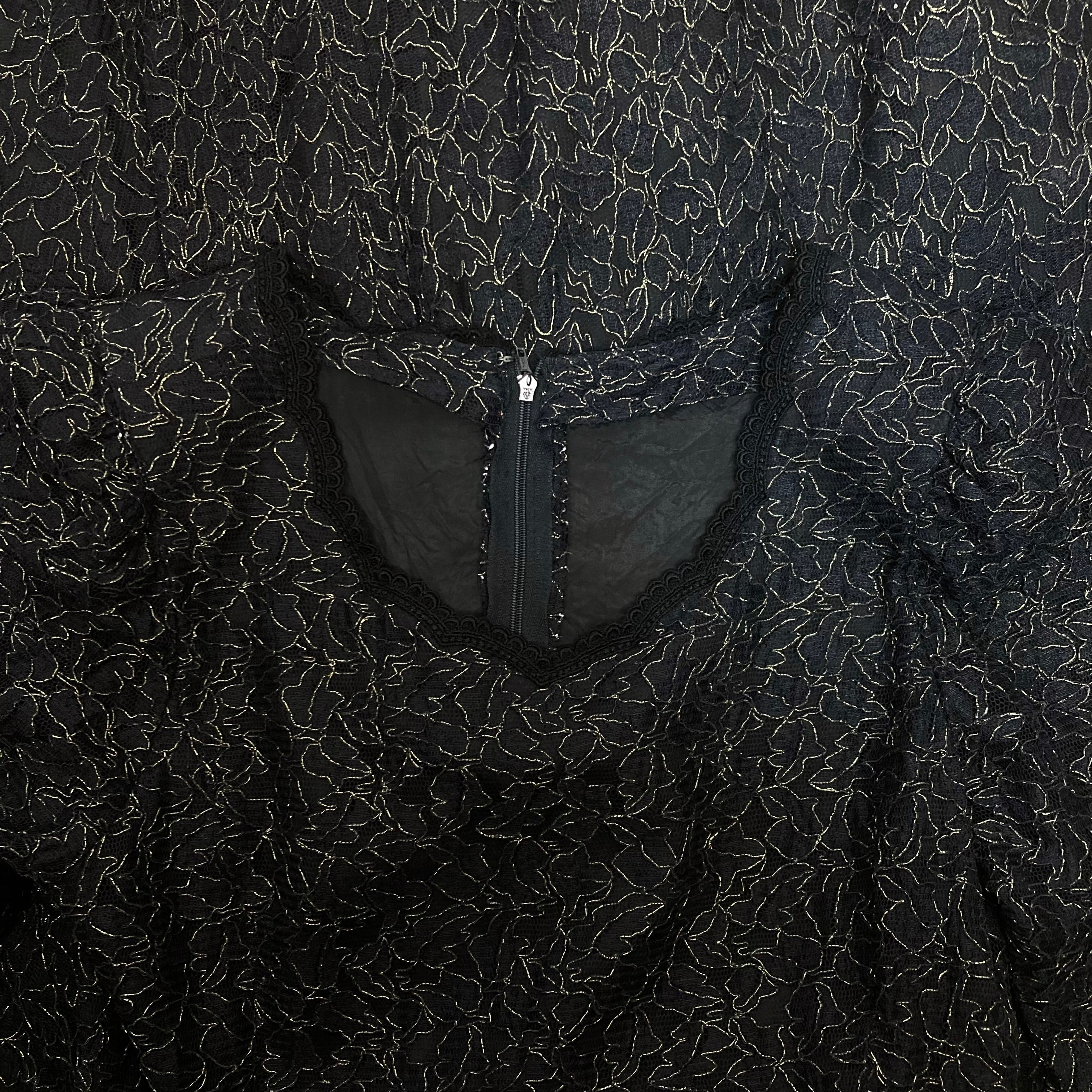 衿と袖口、裾にスカラップ、ウエストをゆるいV字切り替えにしたボリュームあるスカートのデザインブラックドレス