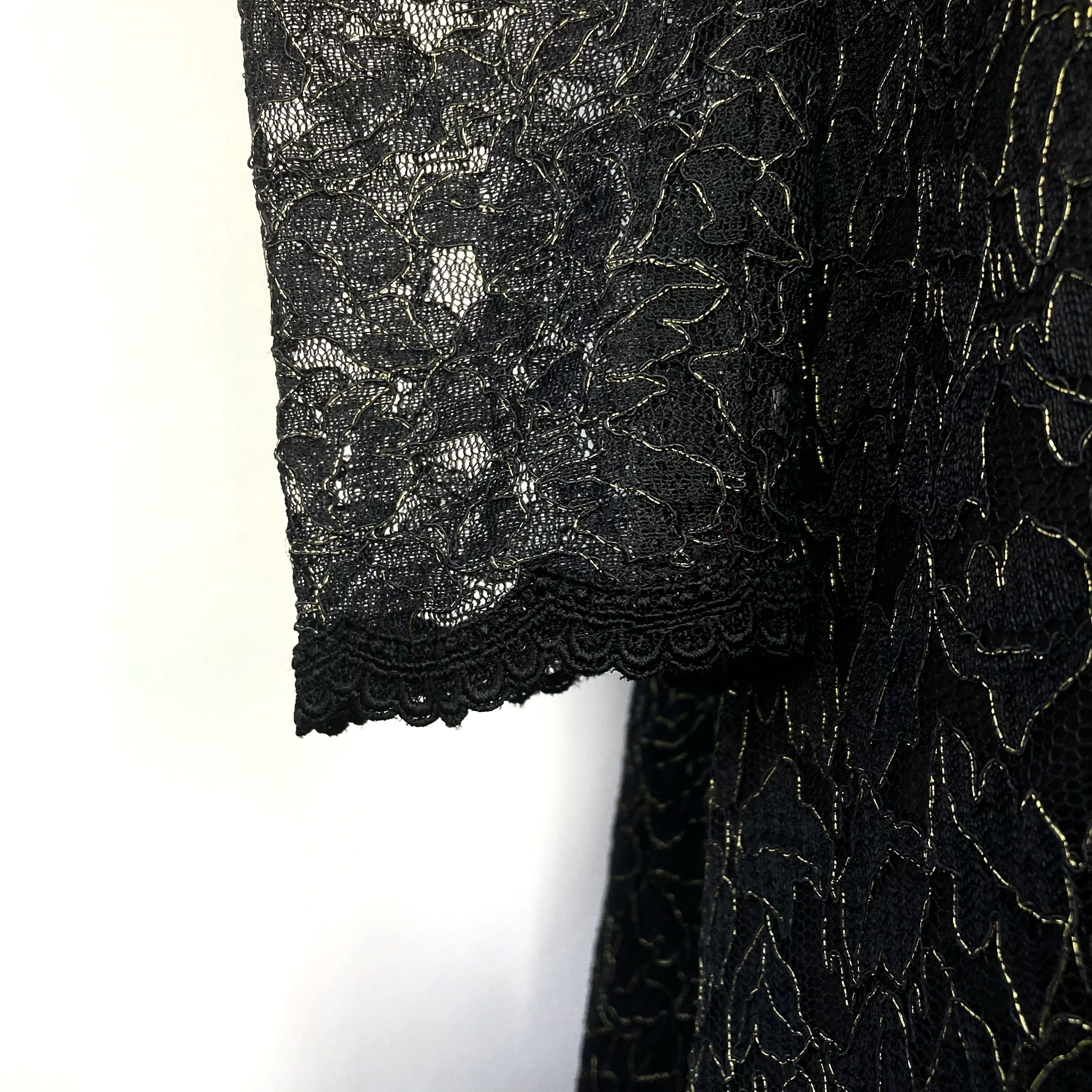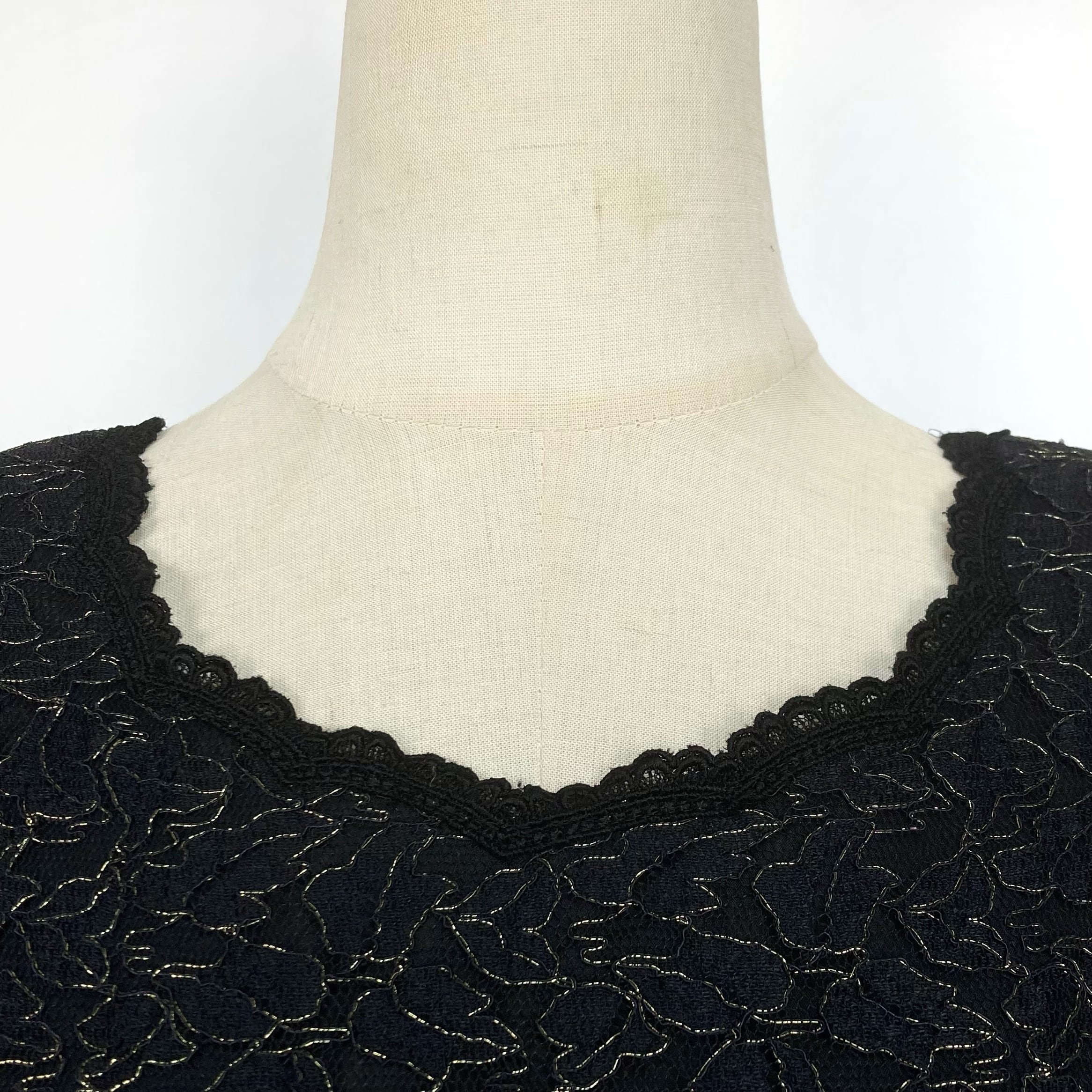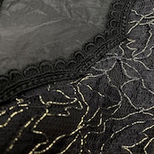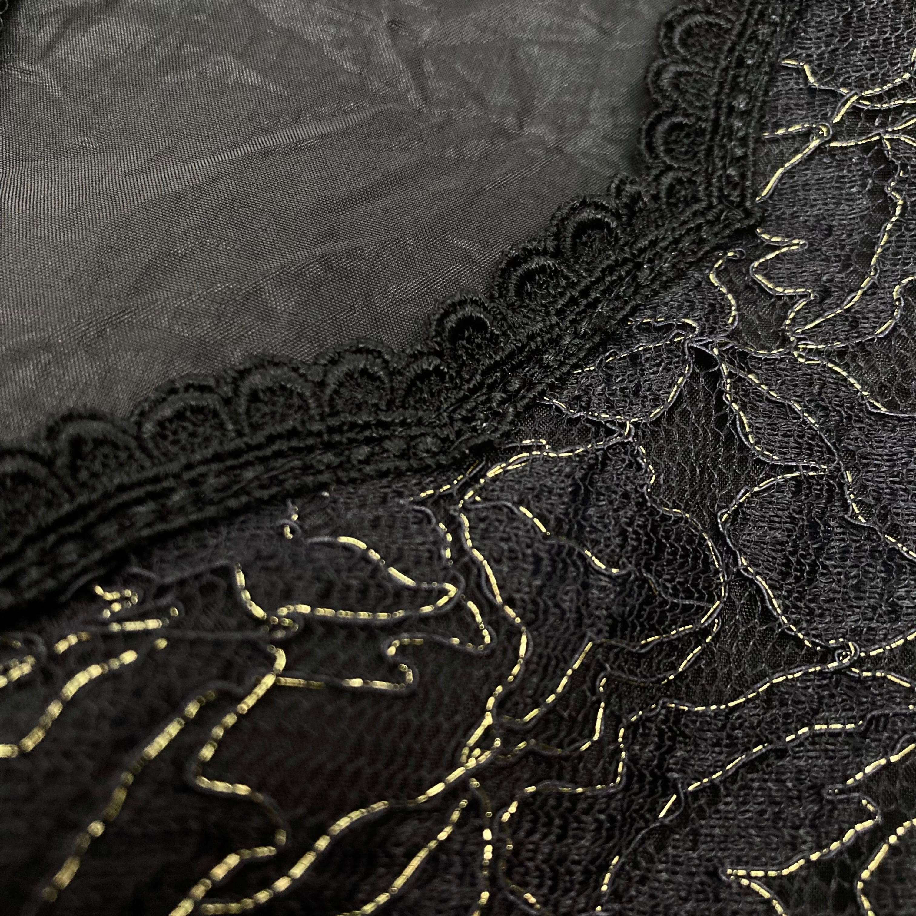 金のラメ糸で縁取られた不定形柄からなる黒いレースのテキスタイル