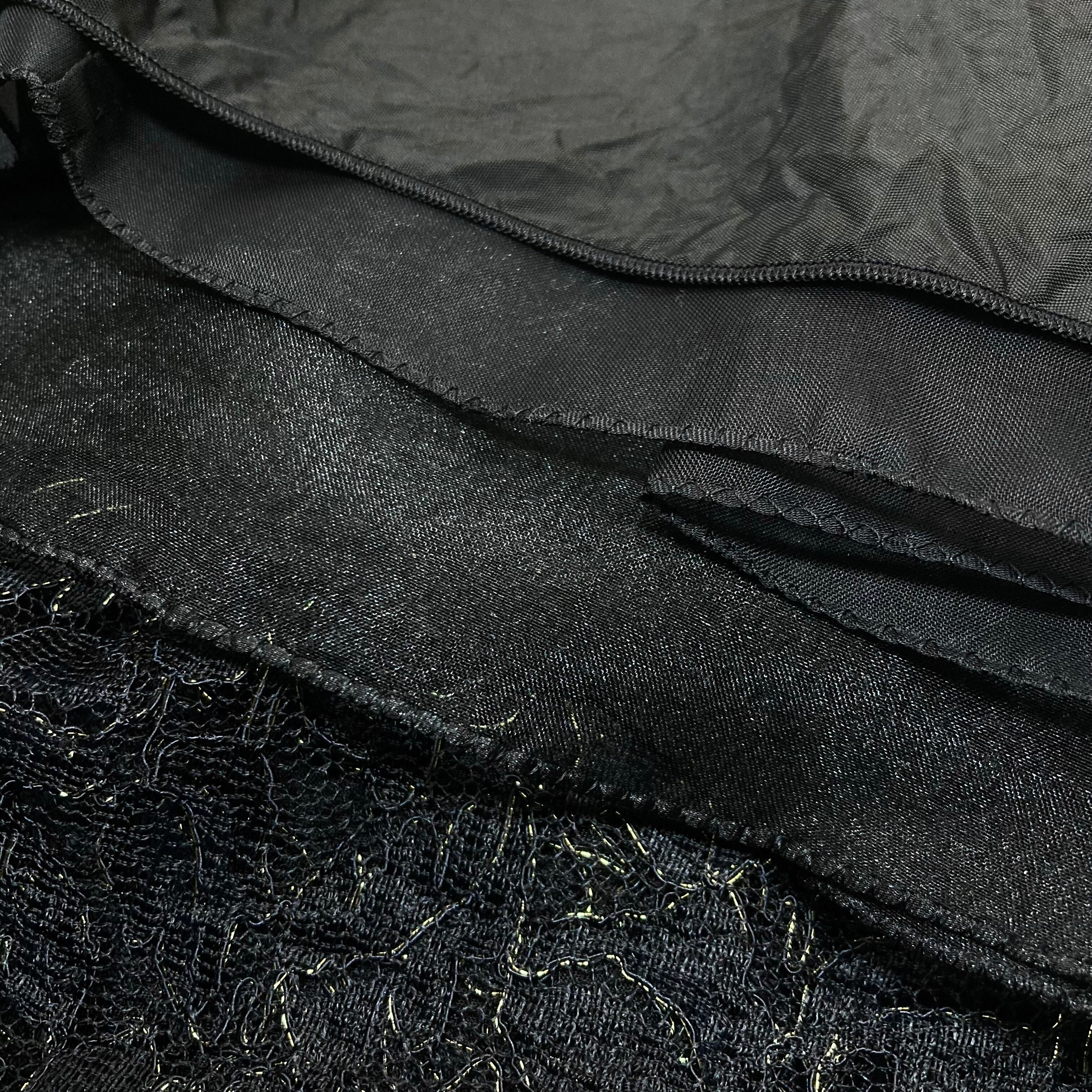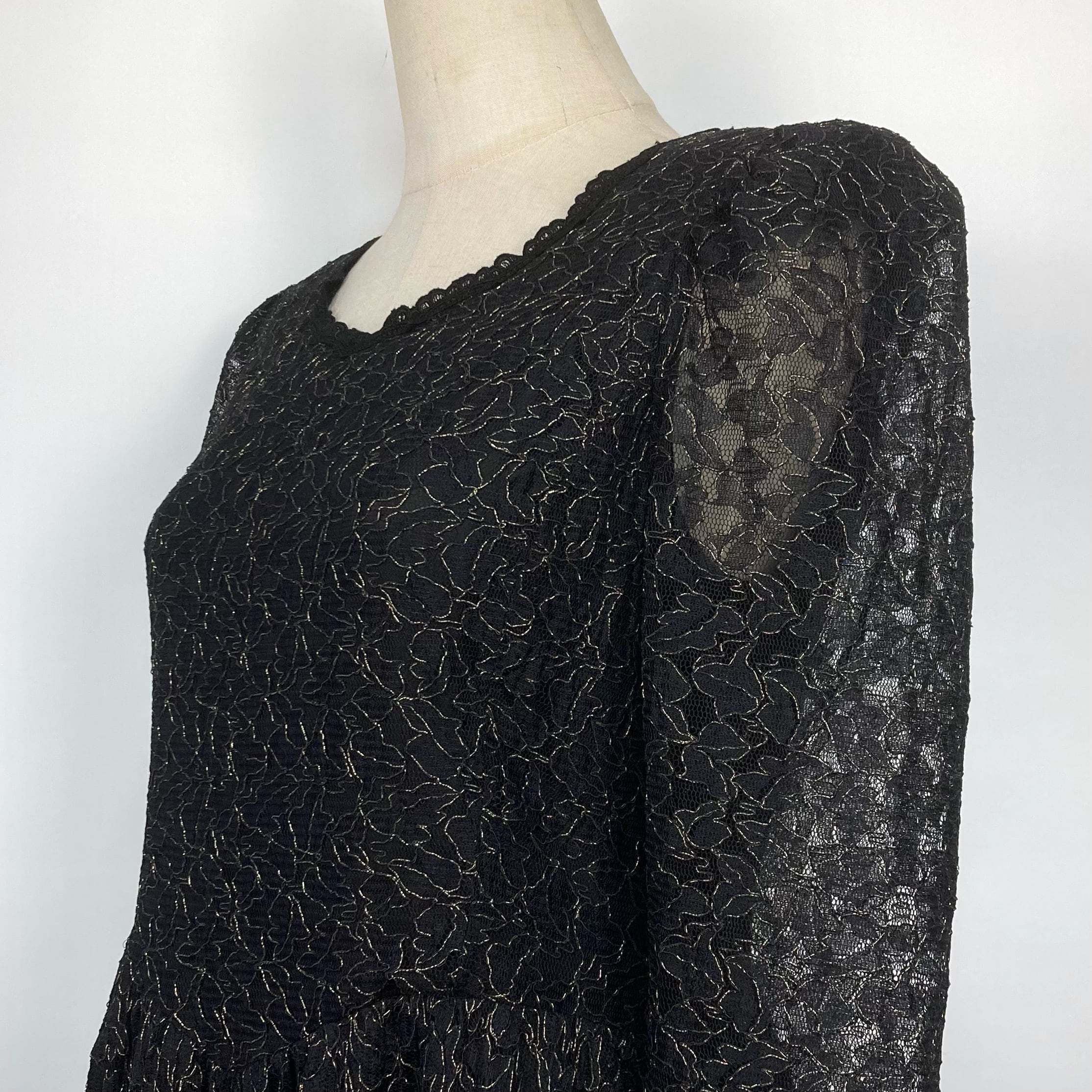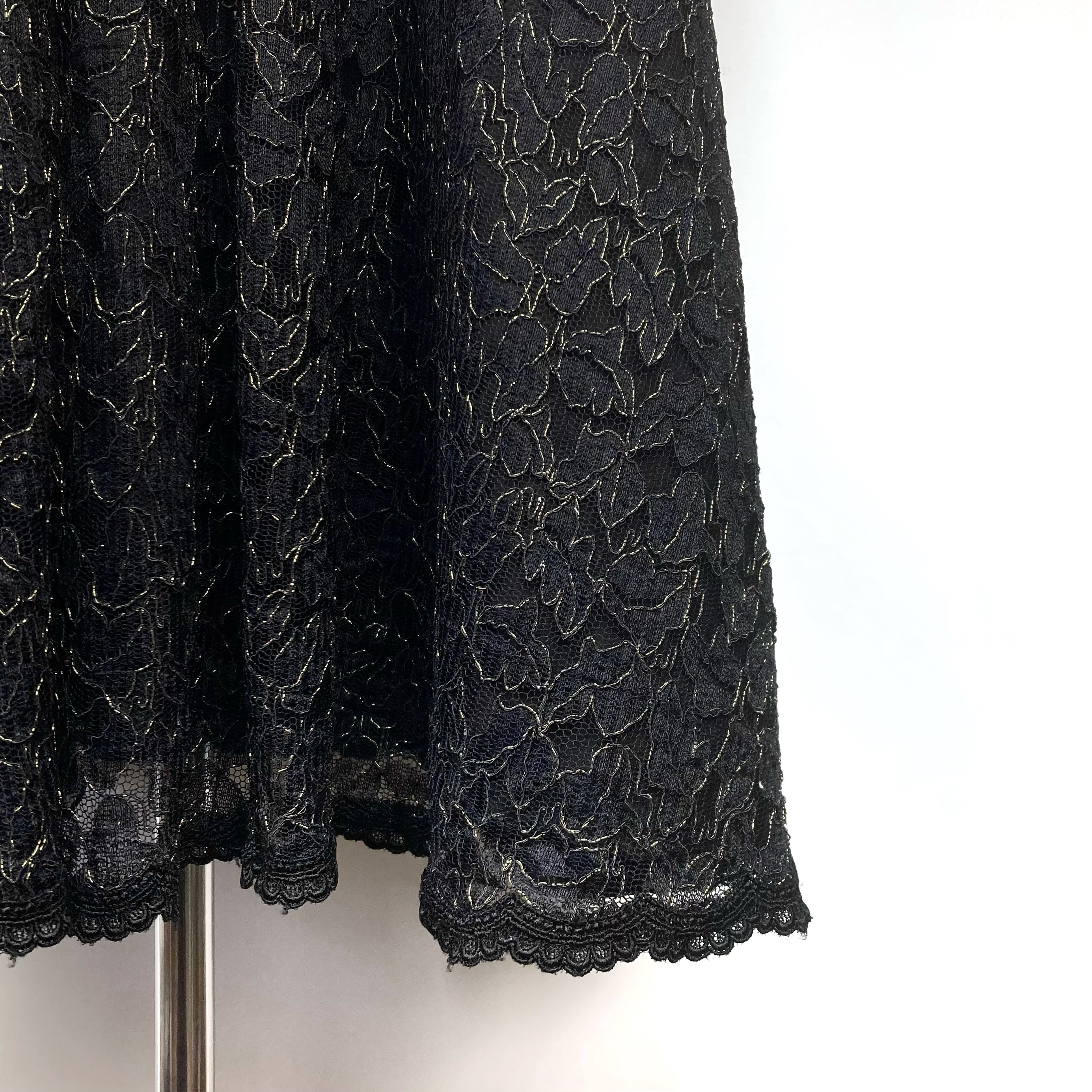 金のラメ糸で縁取られた不定形柄からなる黒いレースのテキスタイル