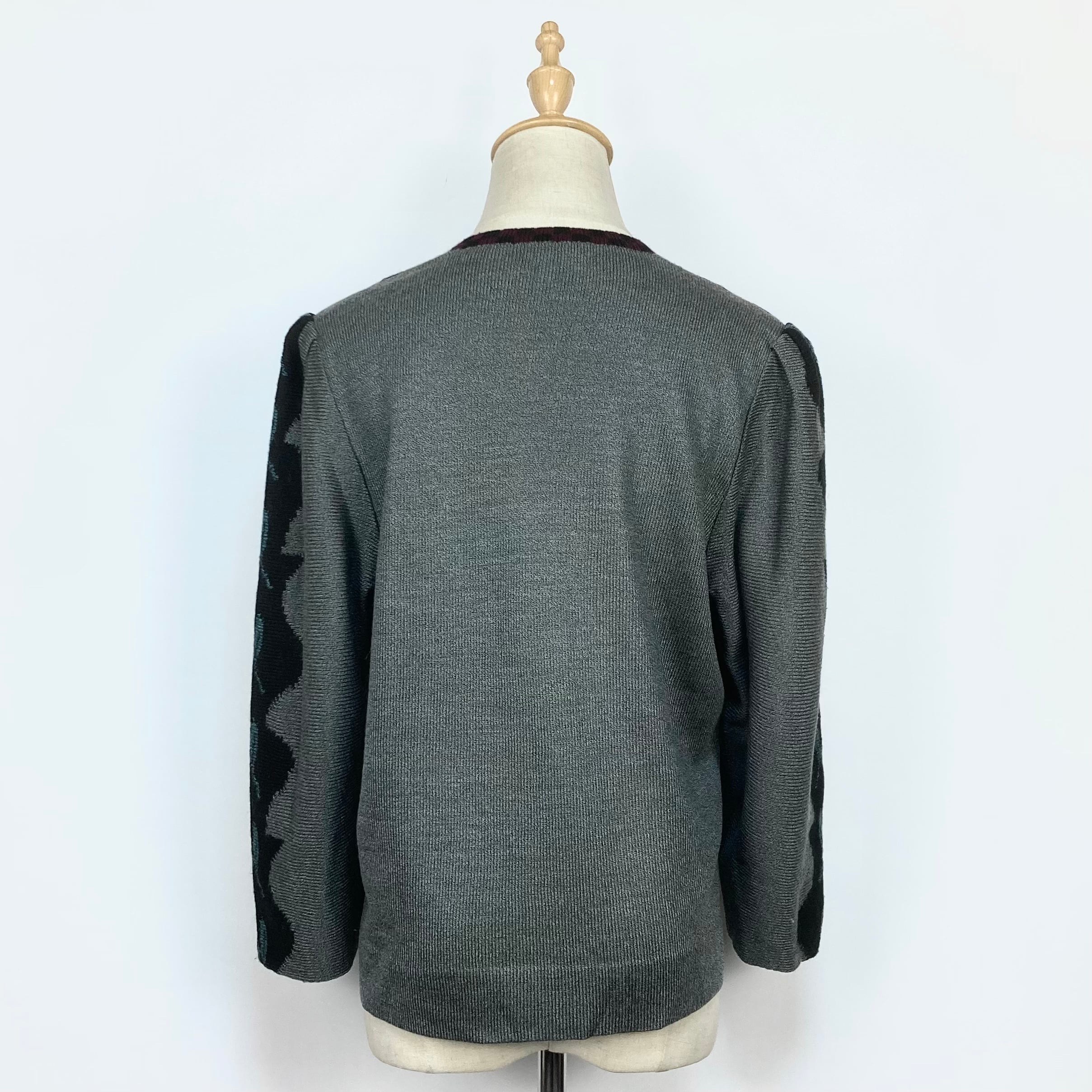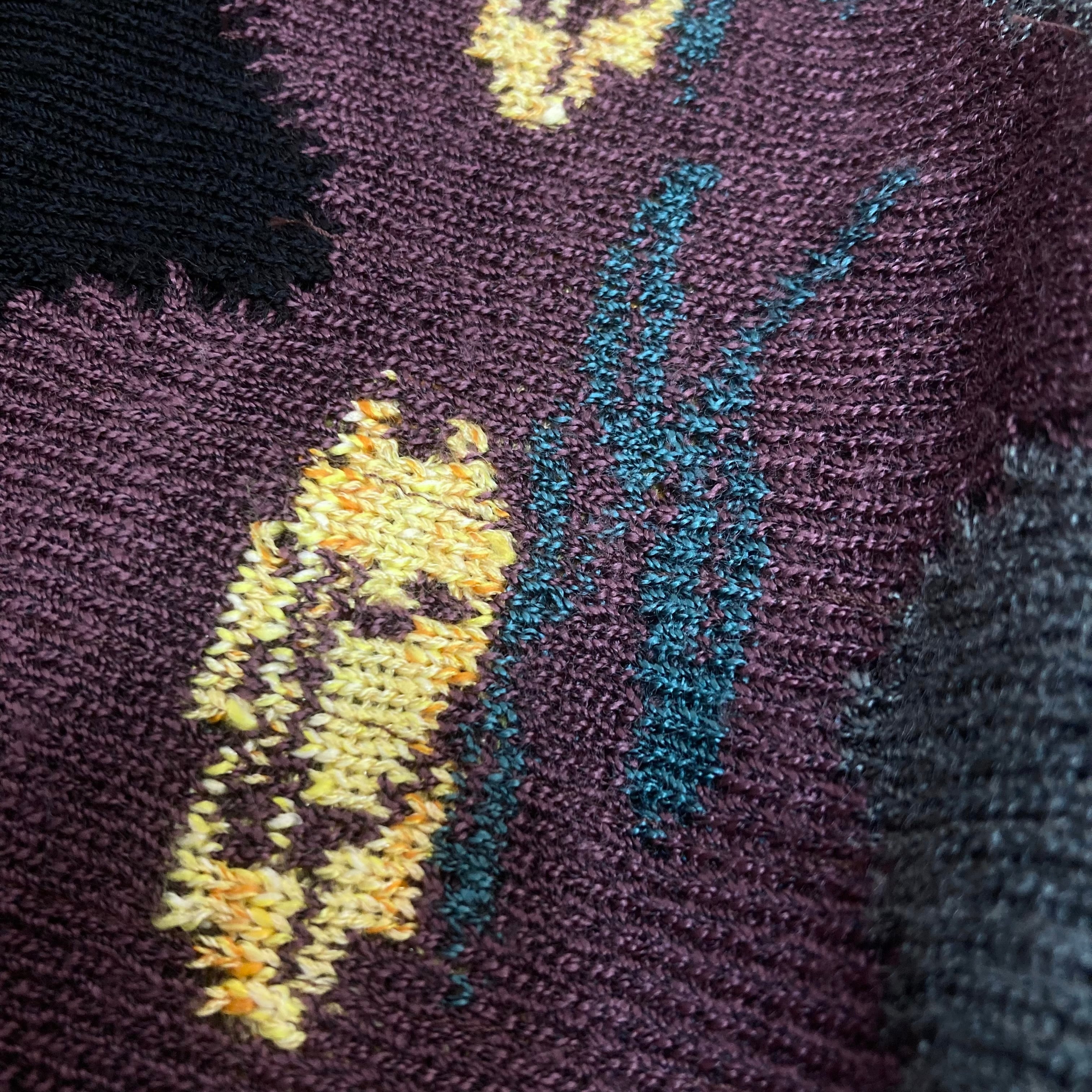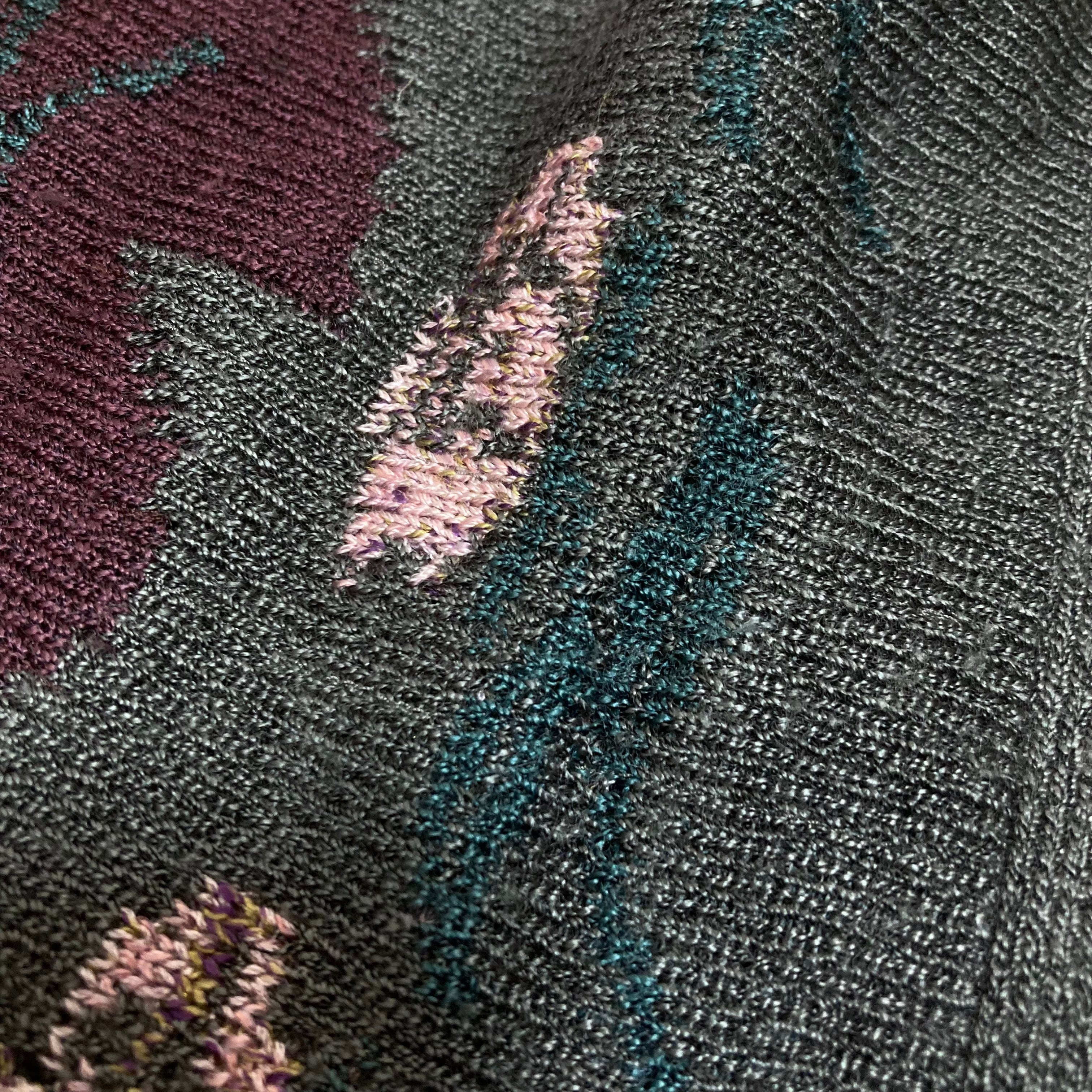 灰色地に3色の薔薇柄と波模様が編み込まれたテキスタイル