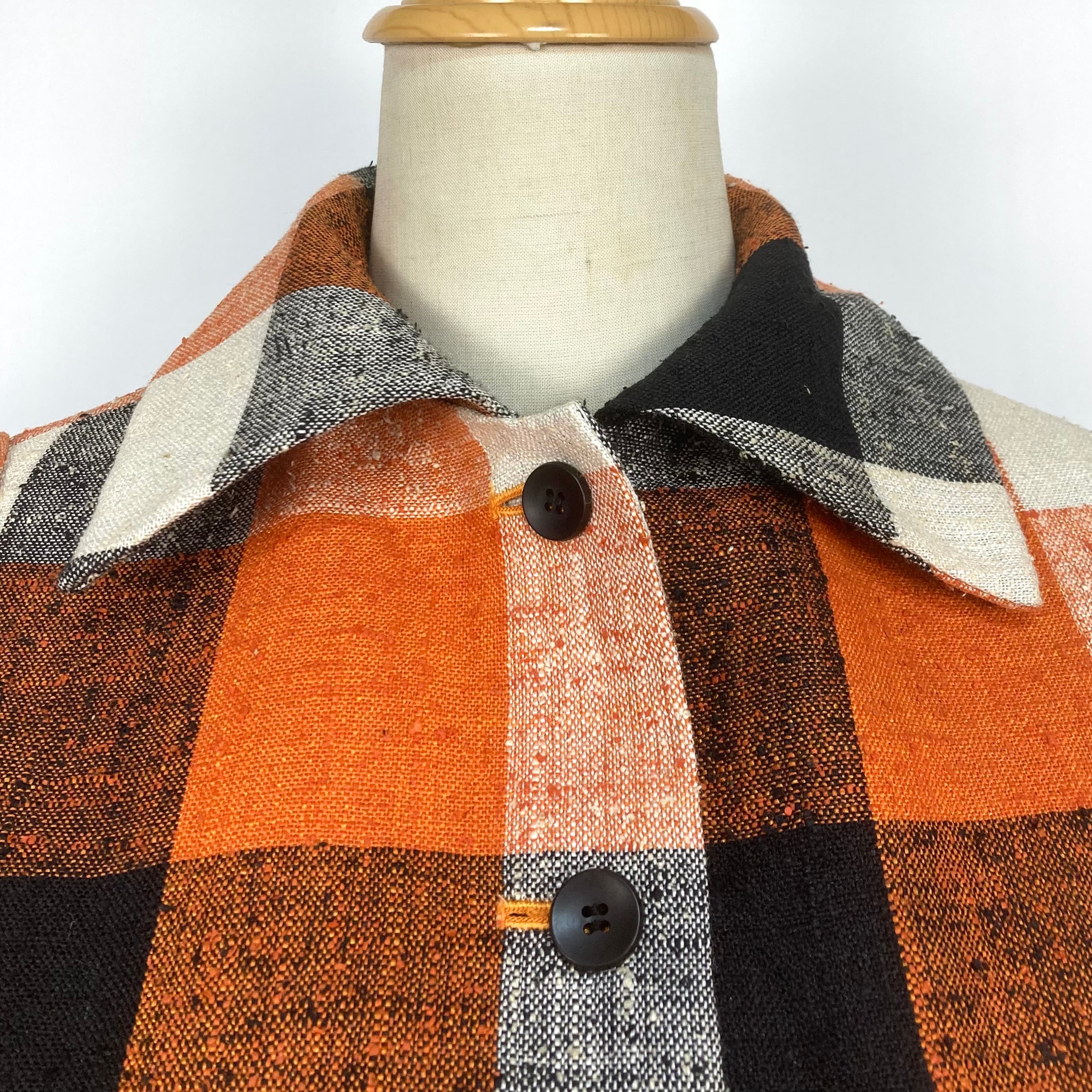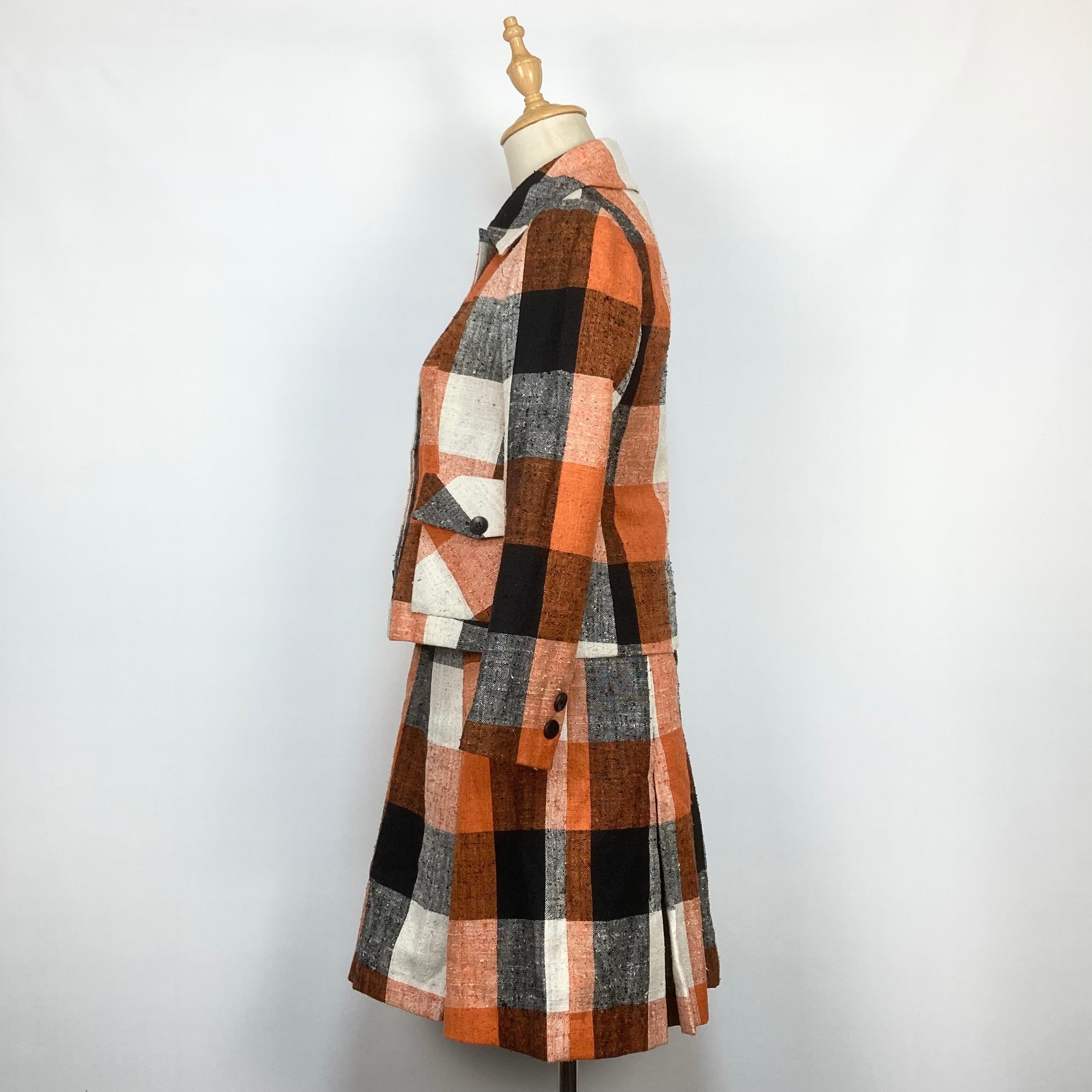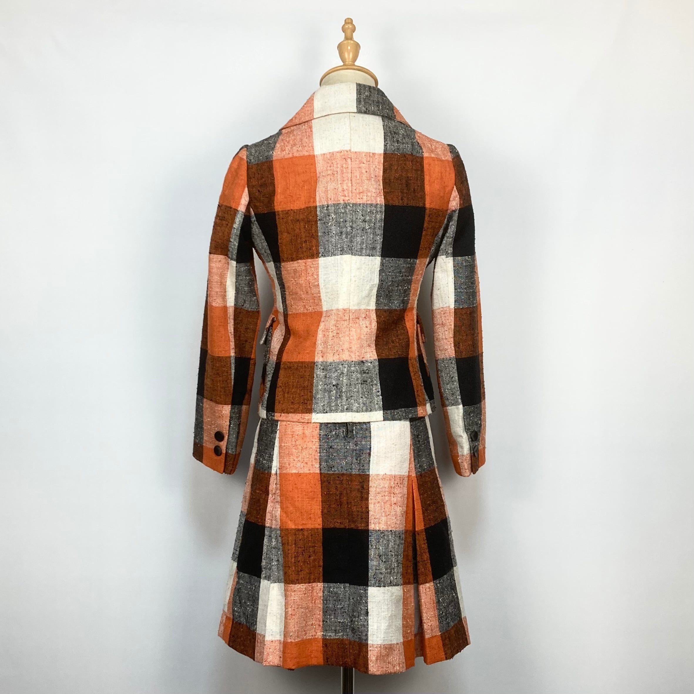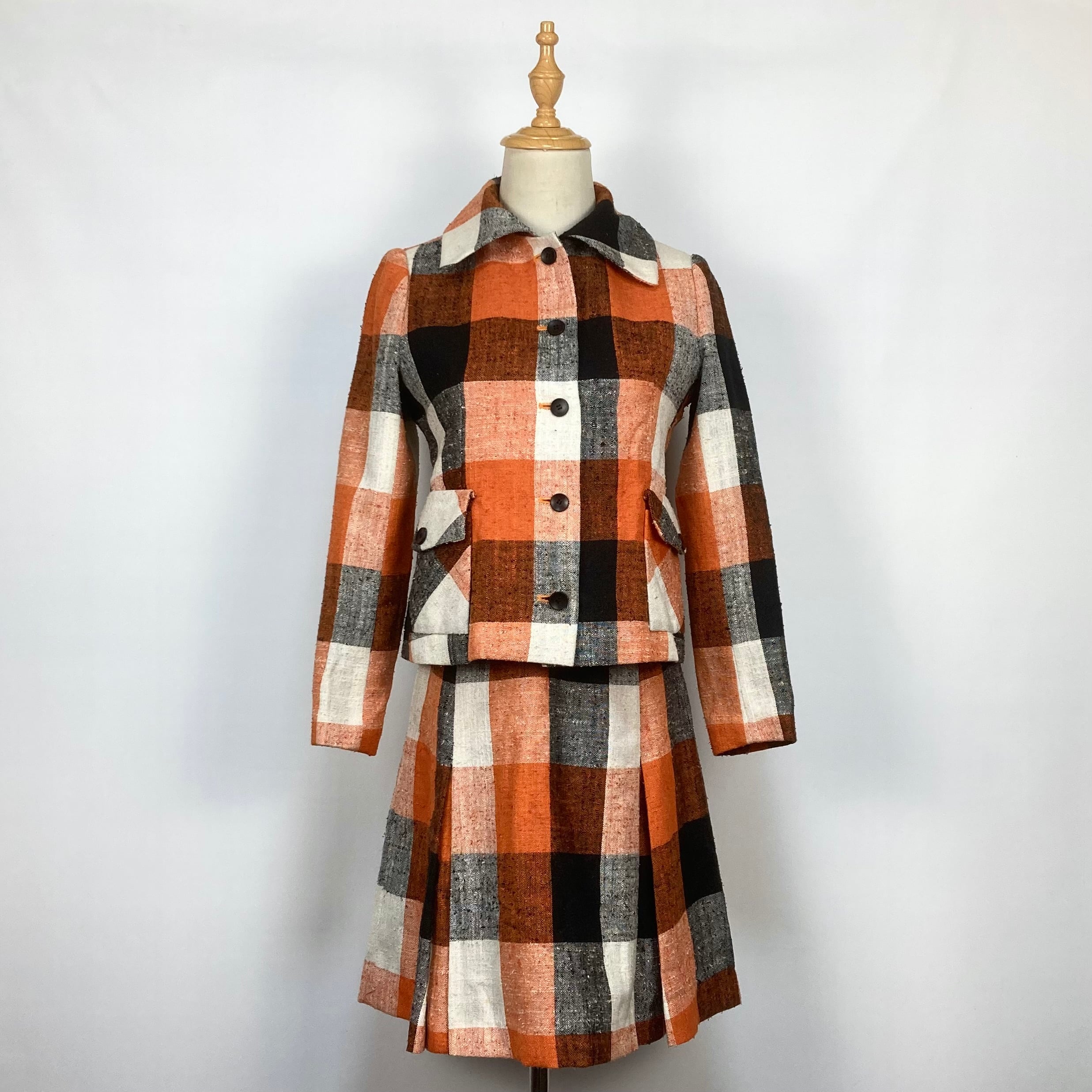 大きな衿、フラップ付きパッチポケットのジャケットとラグラン袖のカットソーとチェックスカートの異素材のコンビネーションワンピースからなるセットアップ