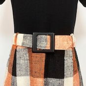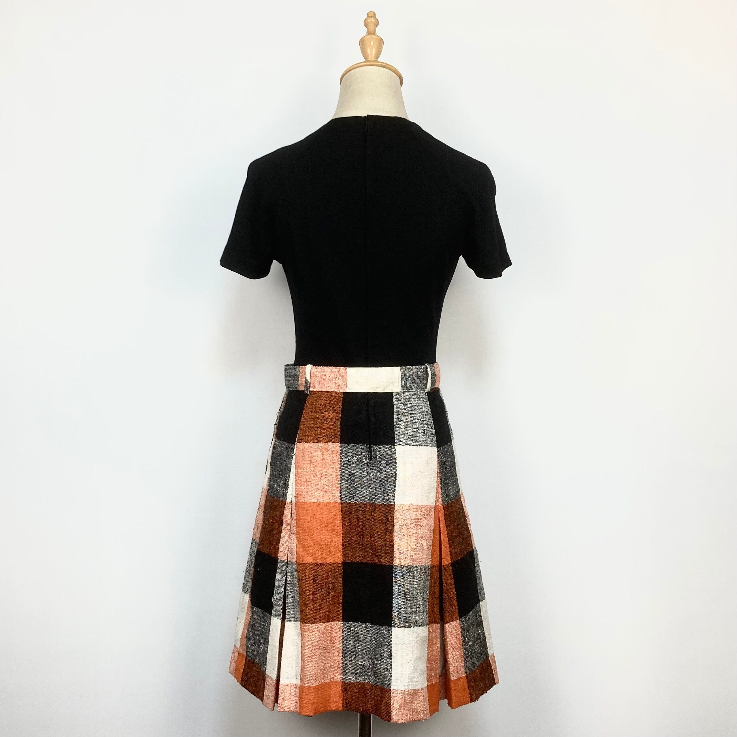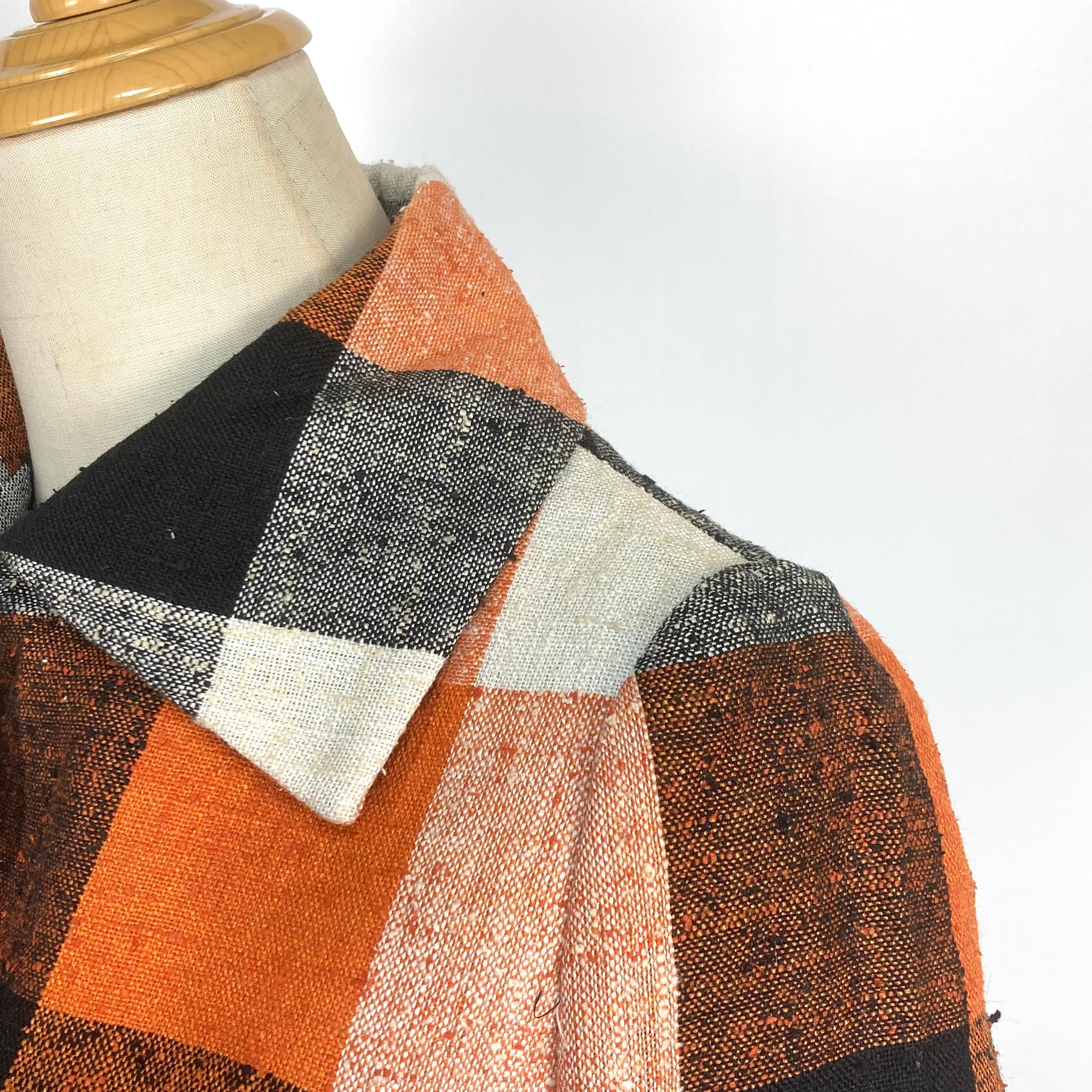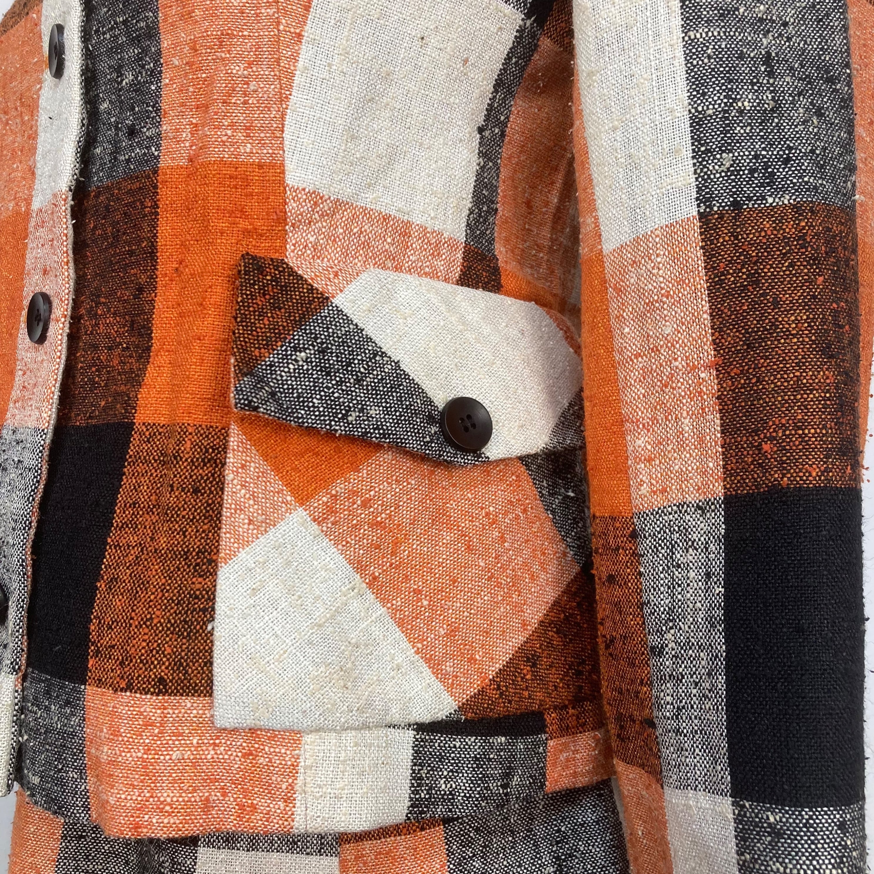 大きな衿、フラップ付きパッチポケットのジャケットとラグラン袖のカットソーとチェックスカートの異素材のコンビネーションワンピースからなるセットアップ