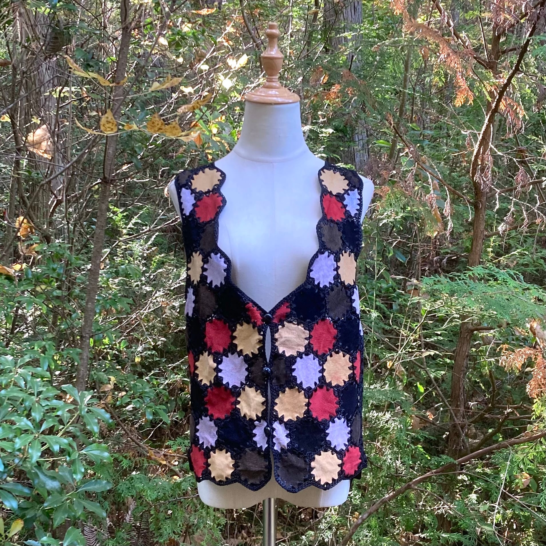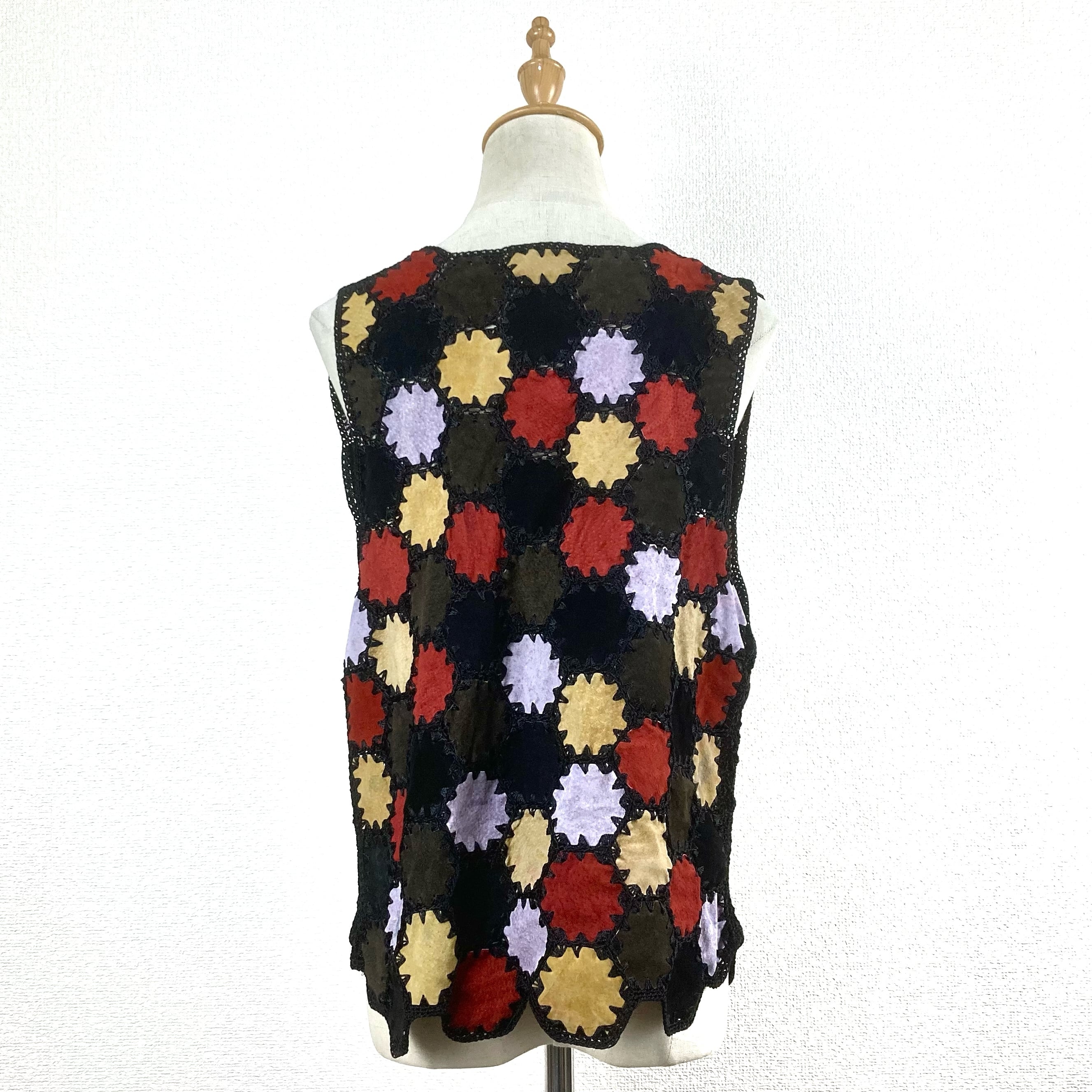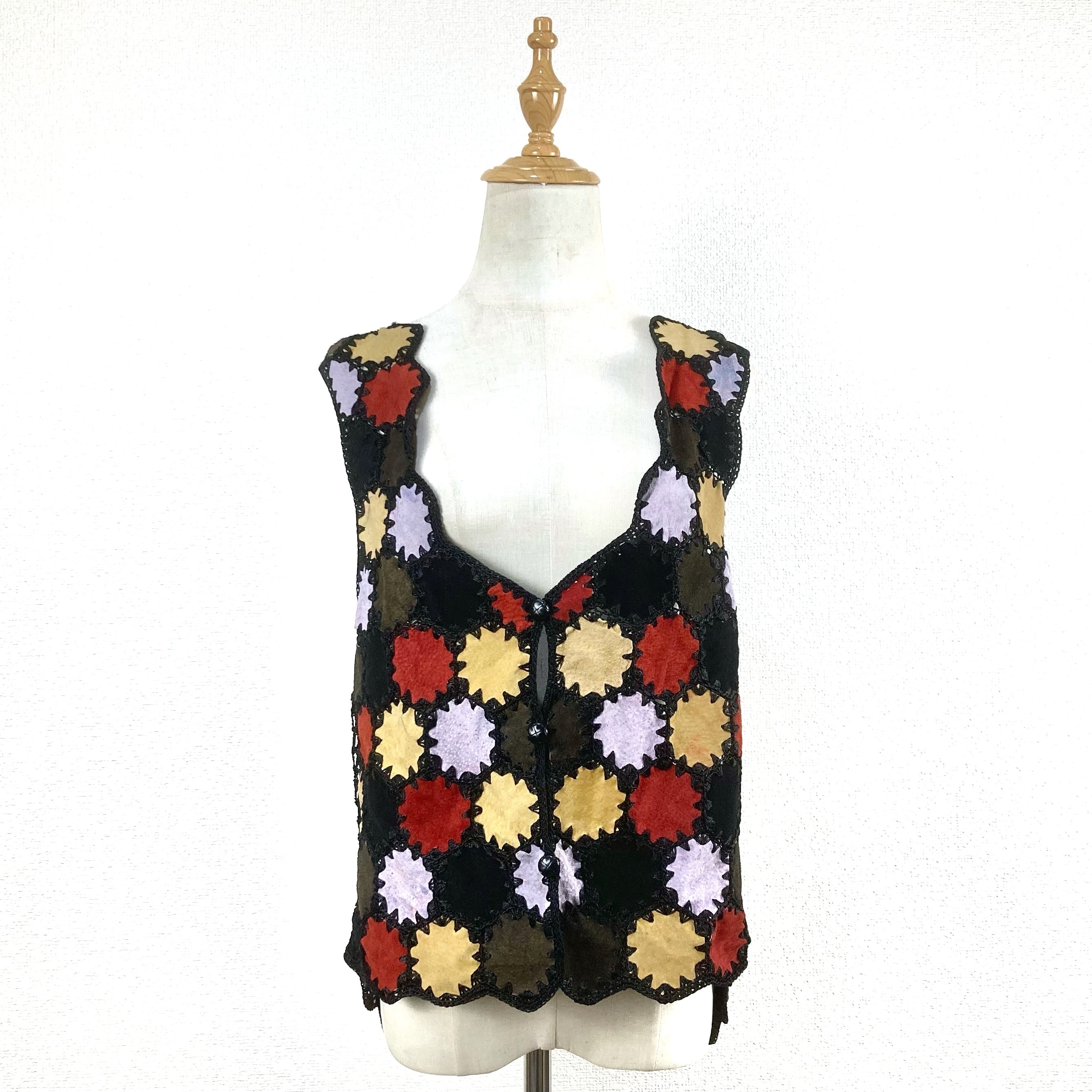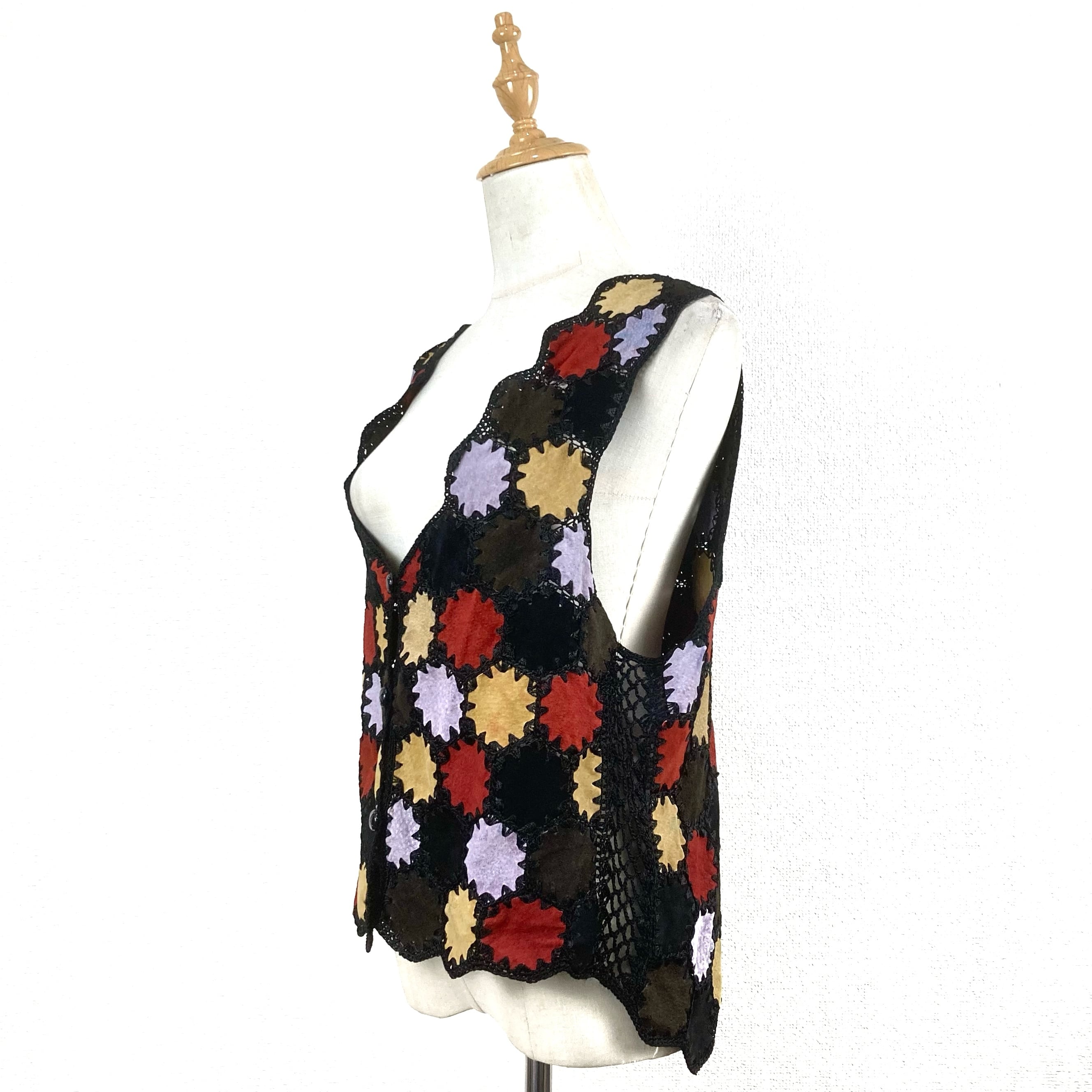 レザー風ボタンにサイドは透かし編みのデザインベスト