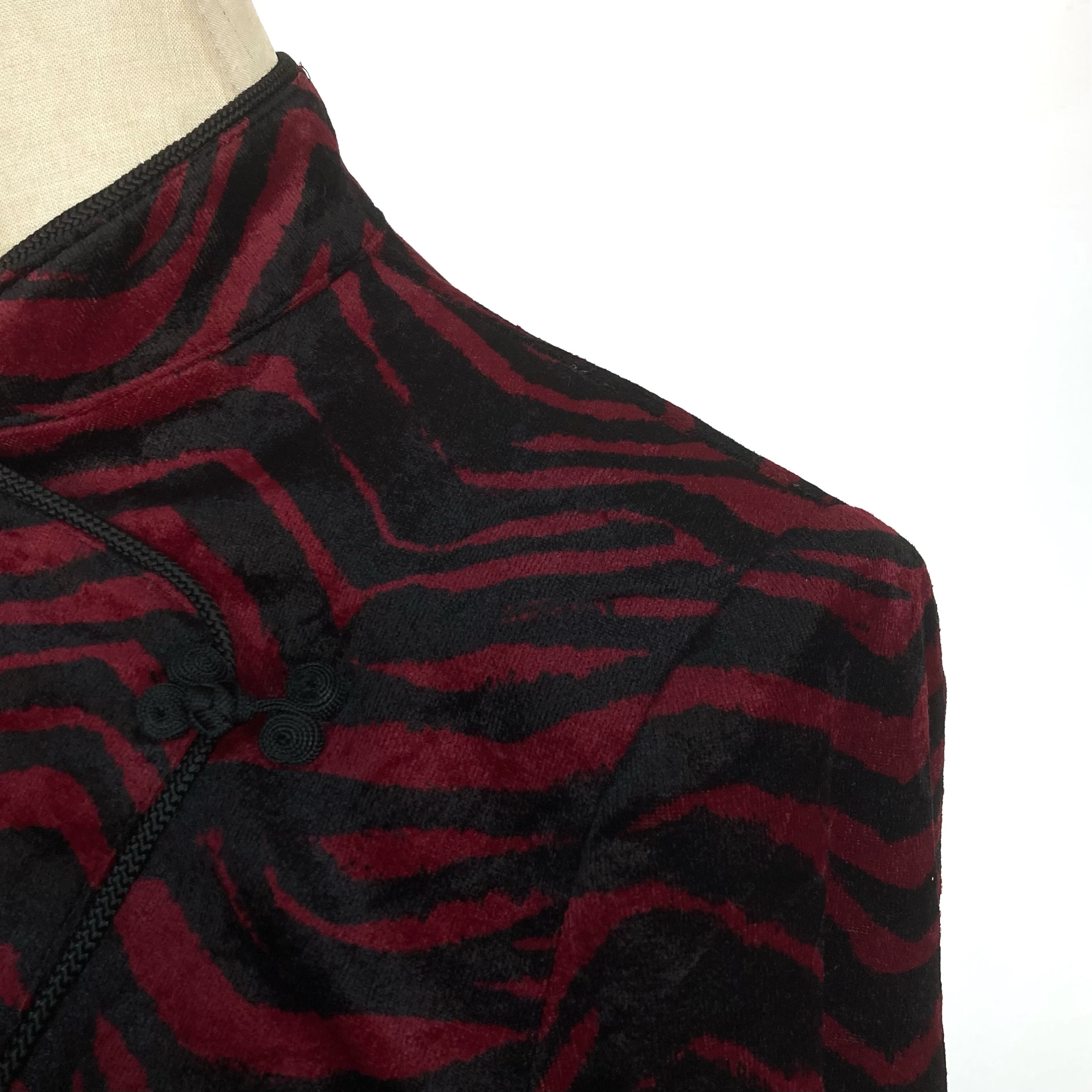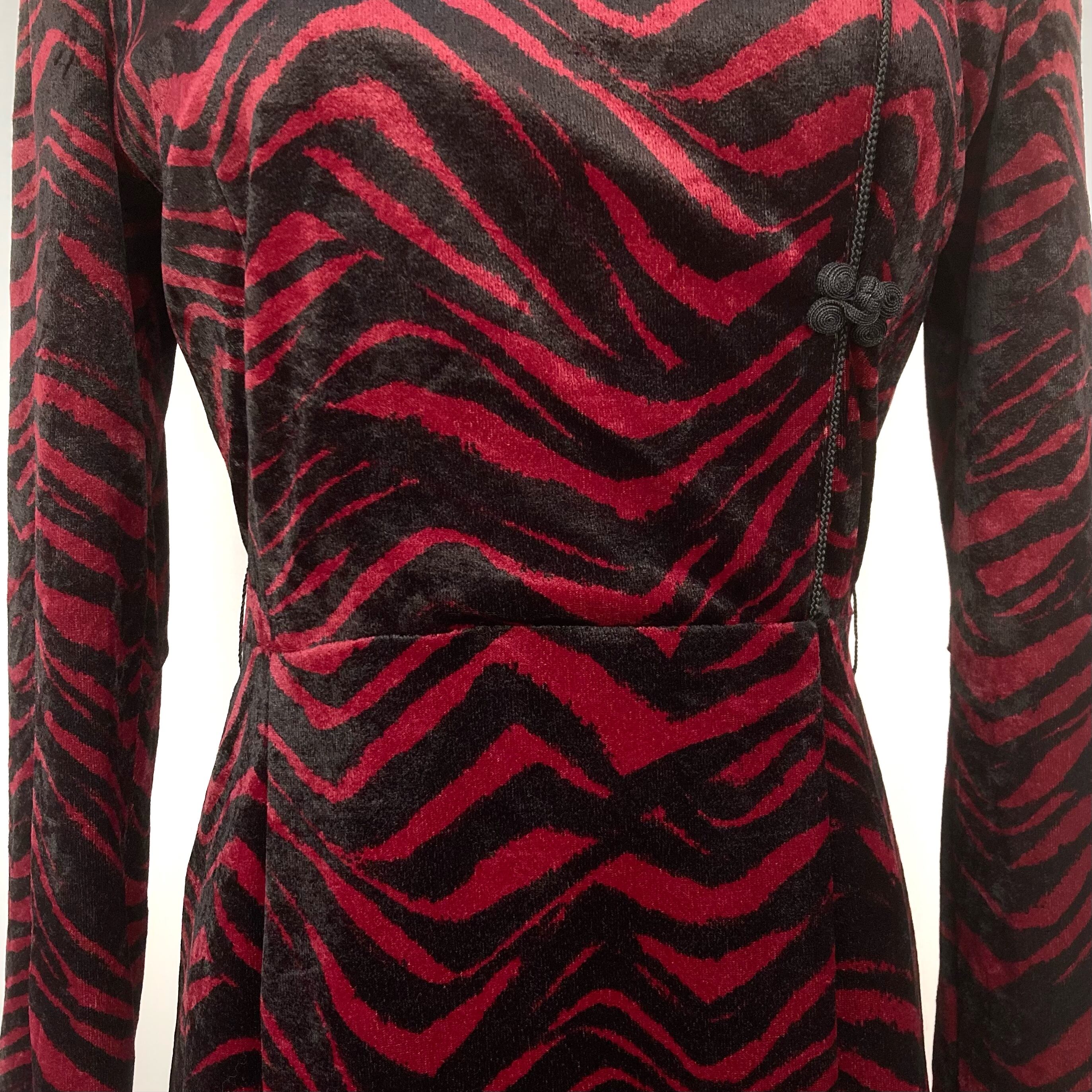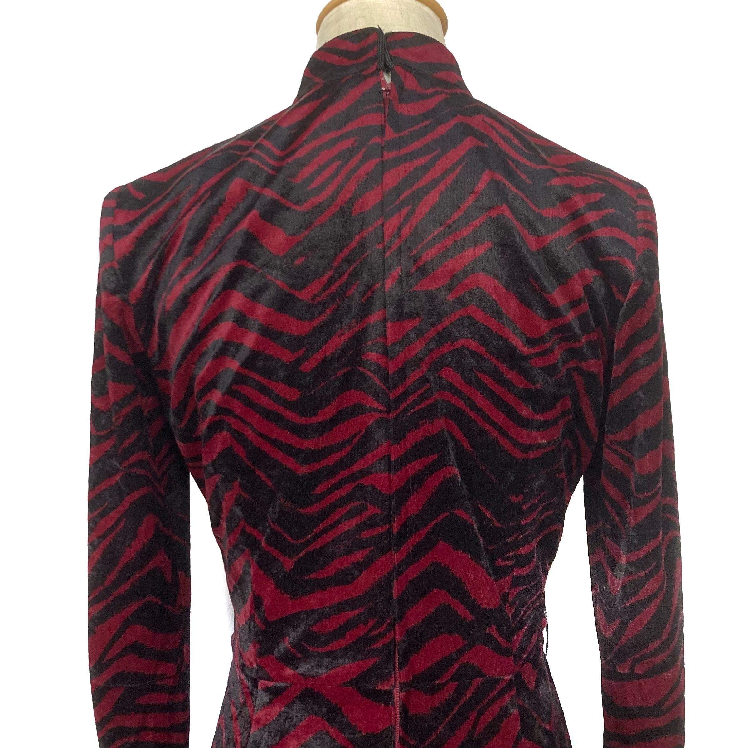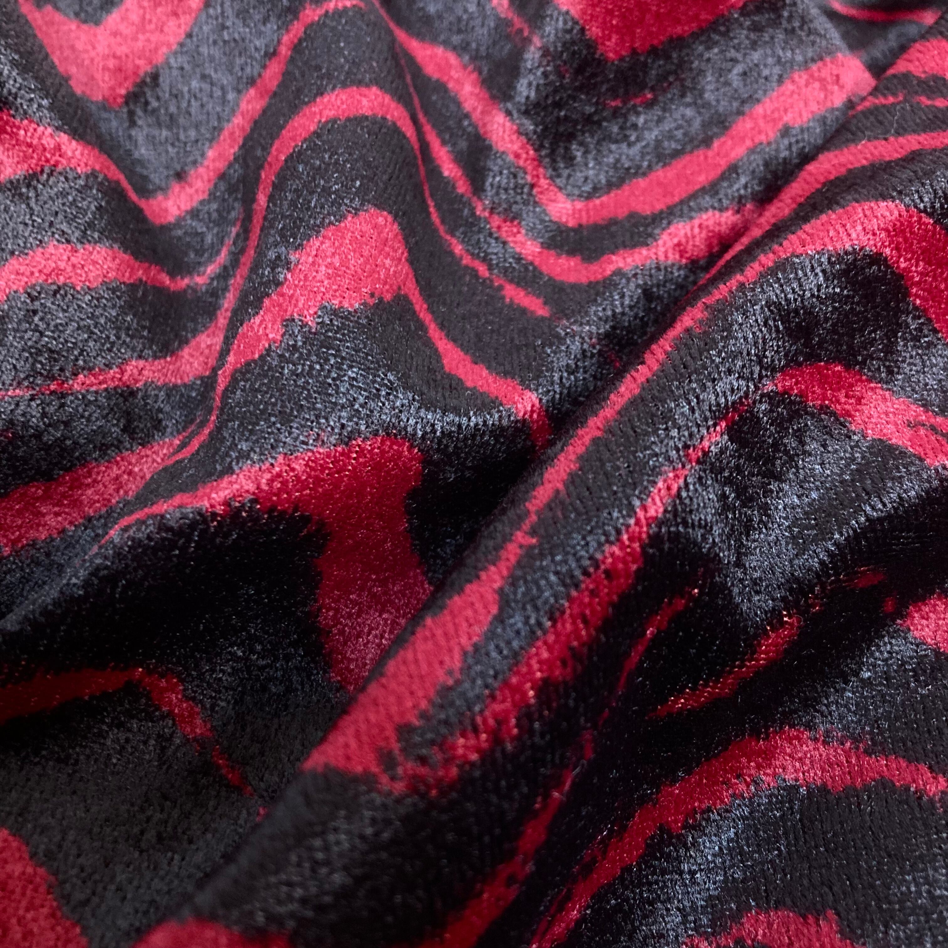 深く赤いベロア地に黒色のゼブラ柄のテキスタイル