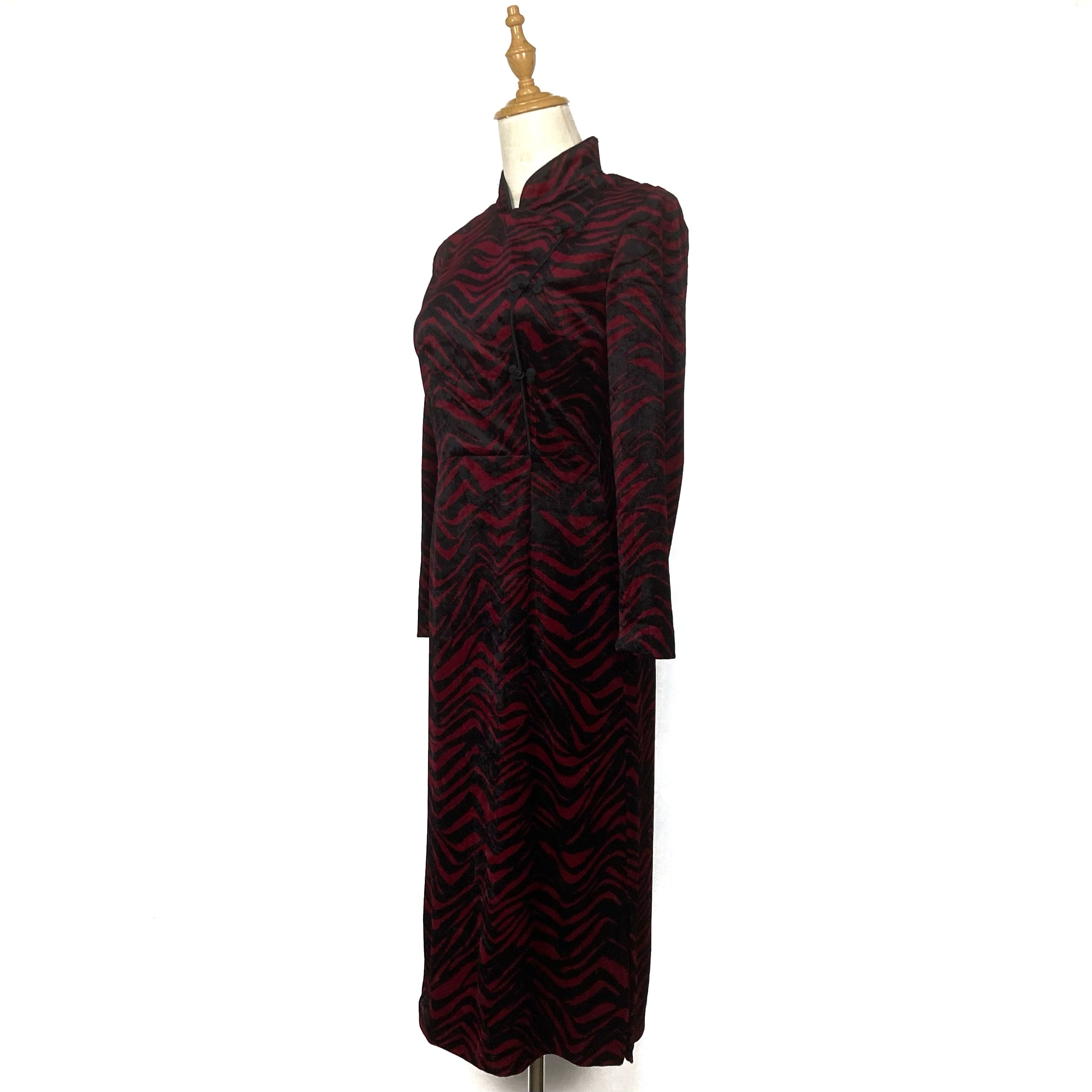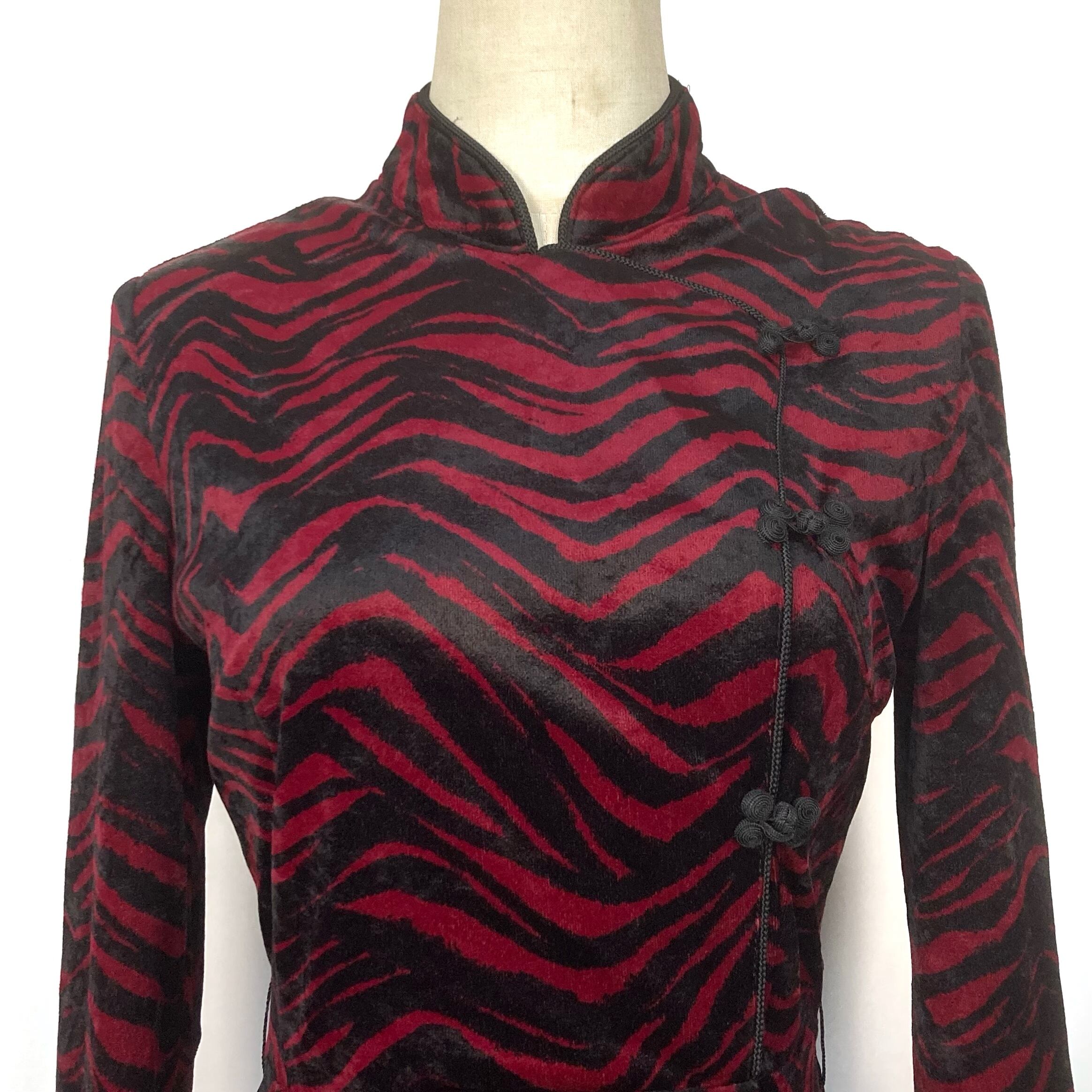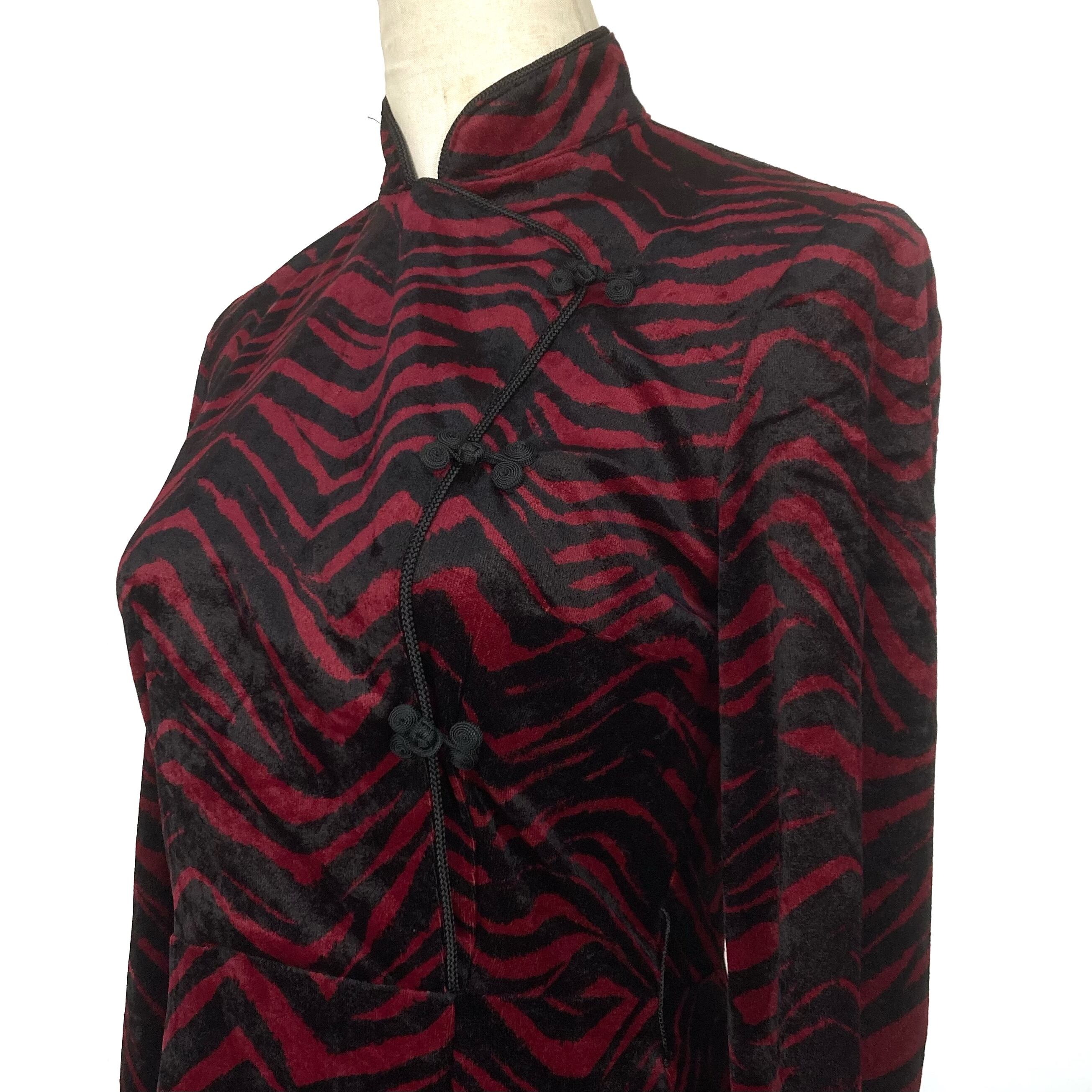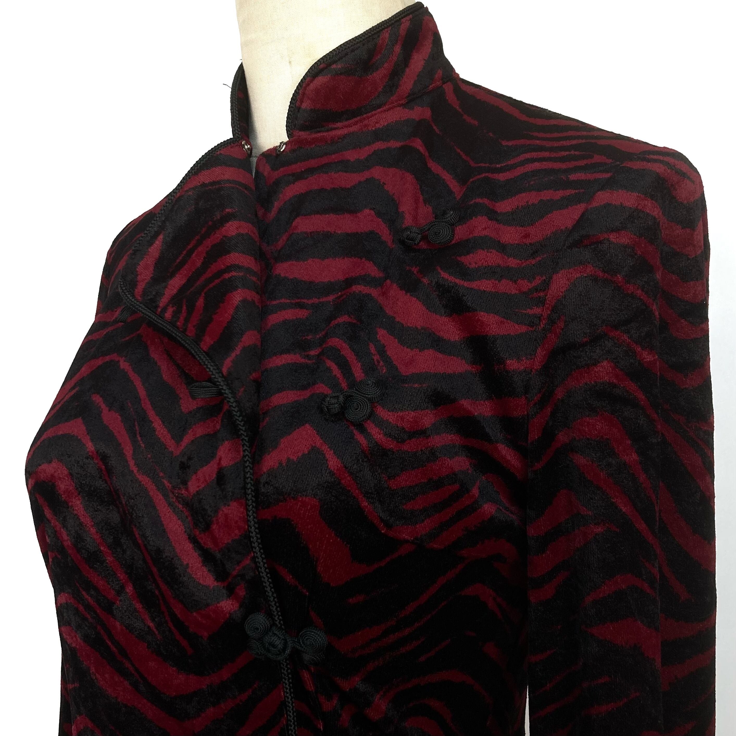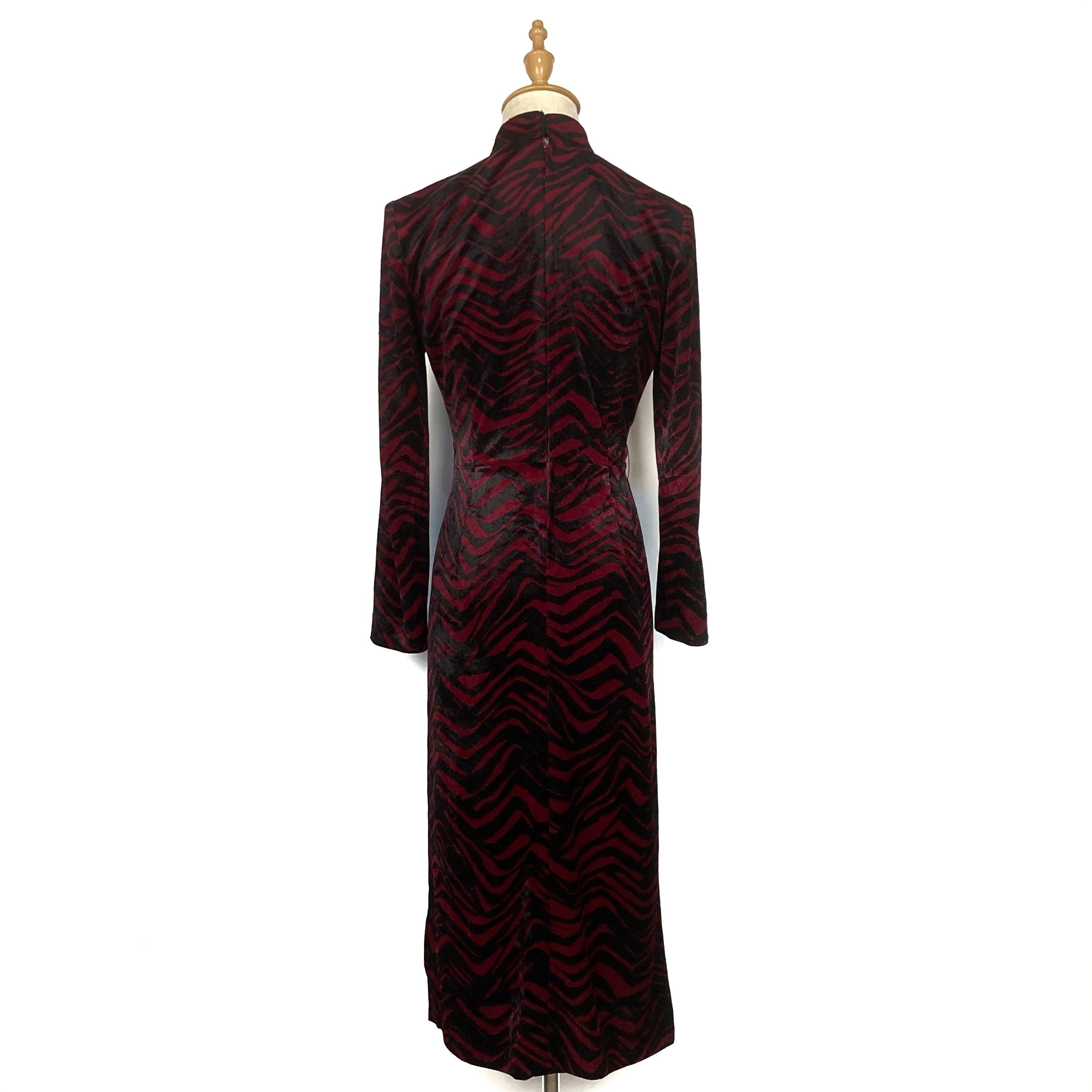 深く赤いベロア地に黒色のゼブラ柄のテキスタイル